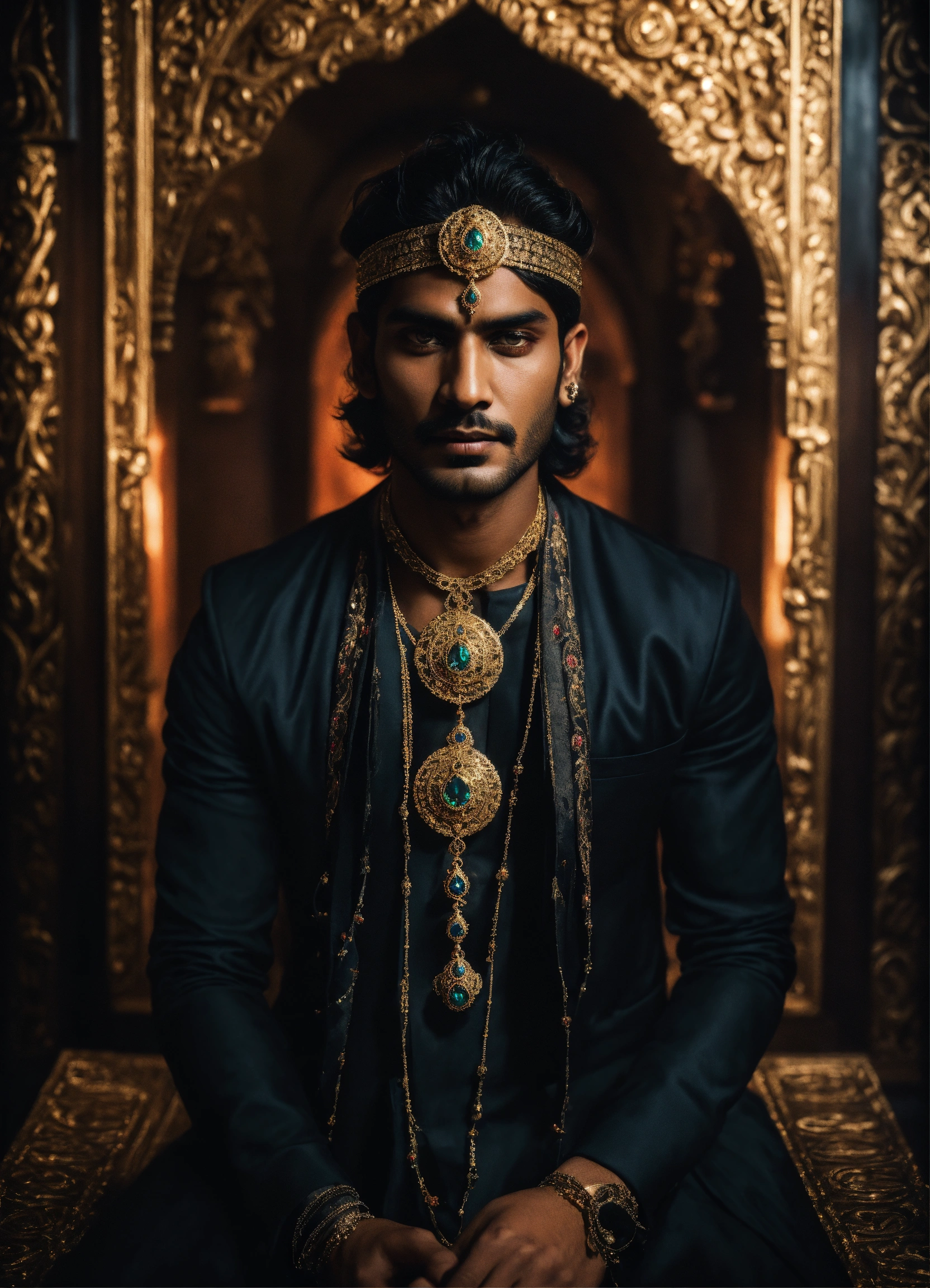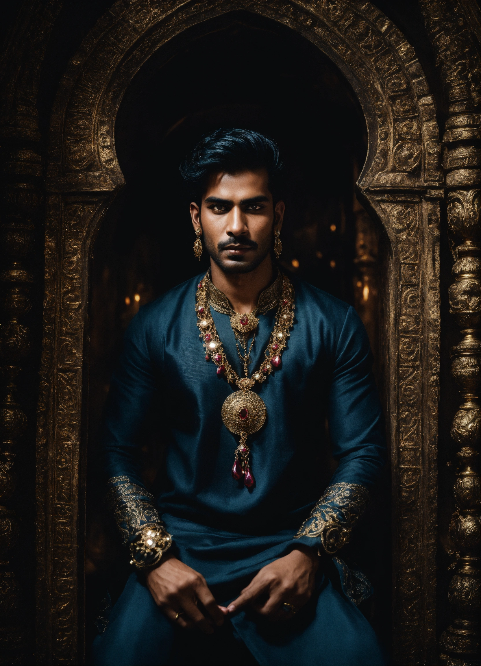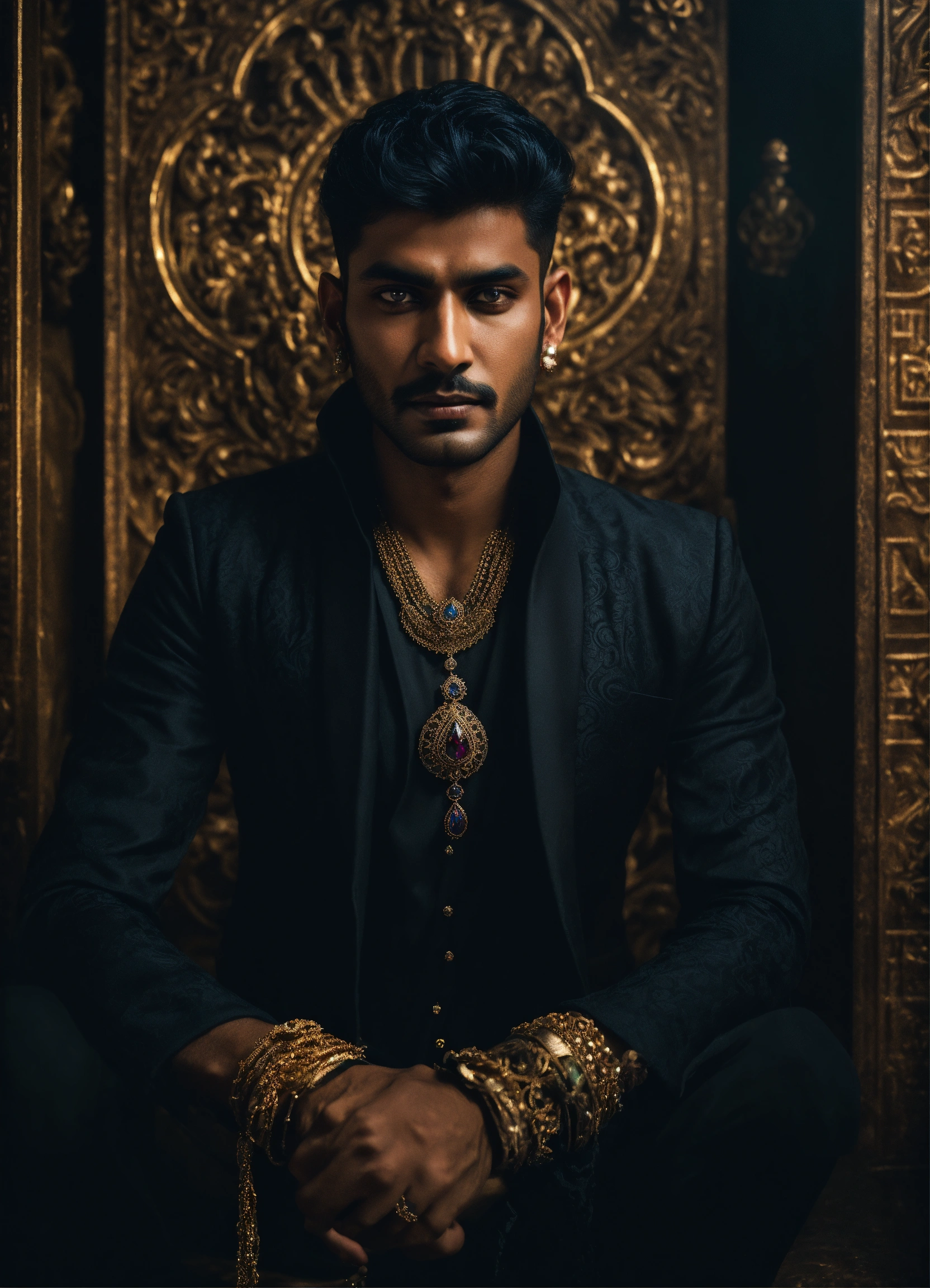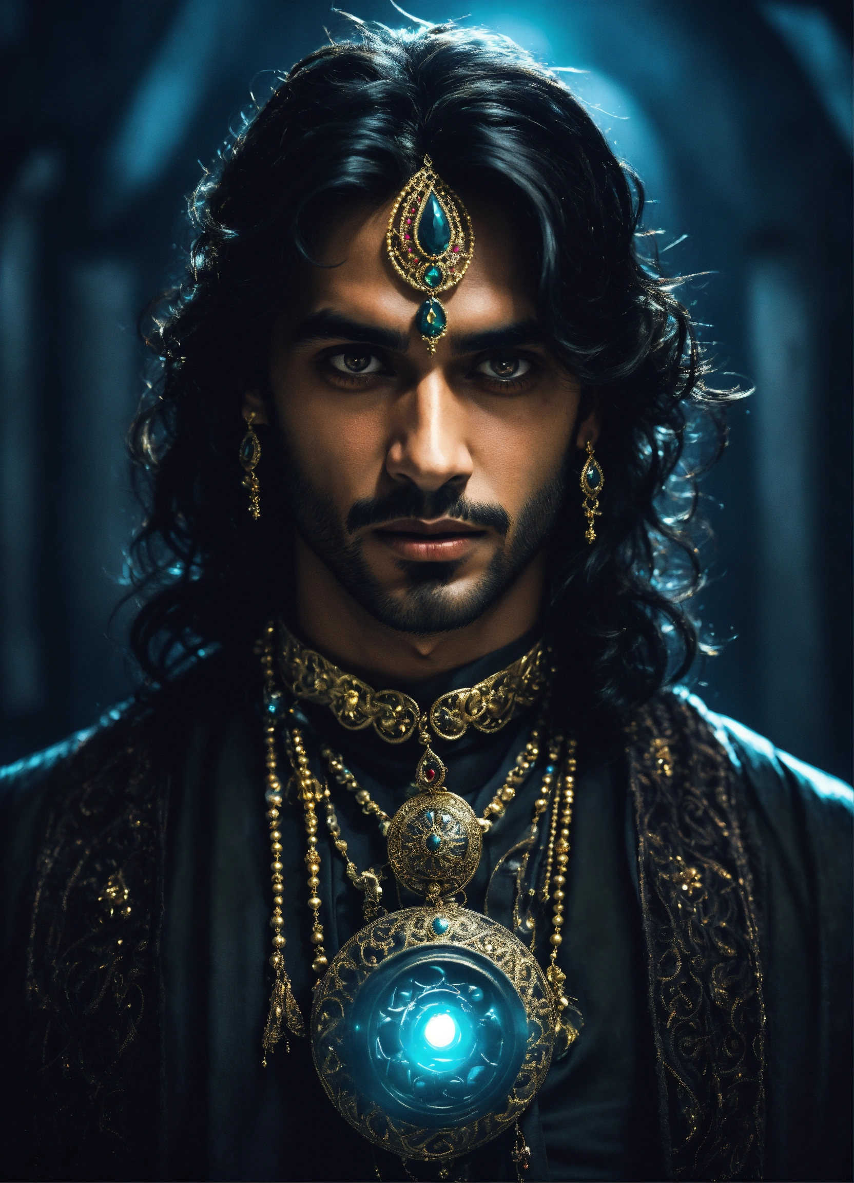 Dark and cinematic fantasy portrait of a young and handsome indian sinister sorcerer with gleaming hypnotic eyes hypnotising the viewer, dressed in dark mysterious clothes and wearing ornate jewellery in a secret occult chamber.
