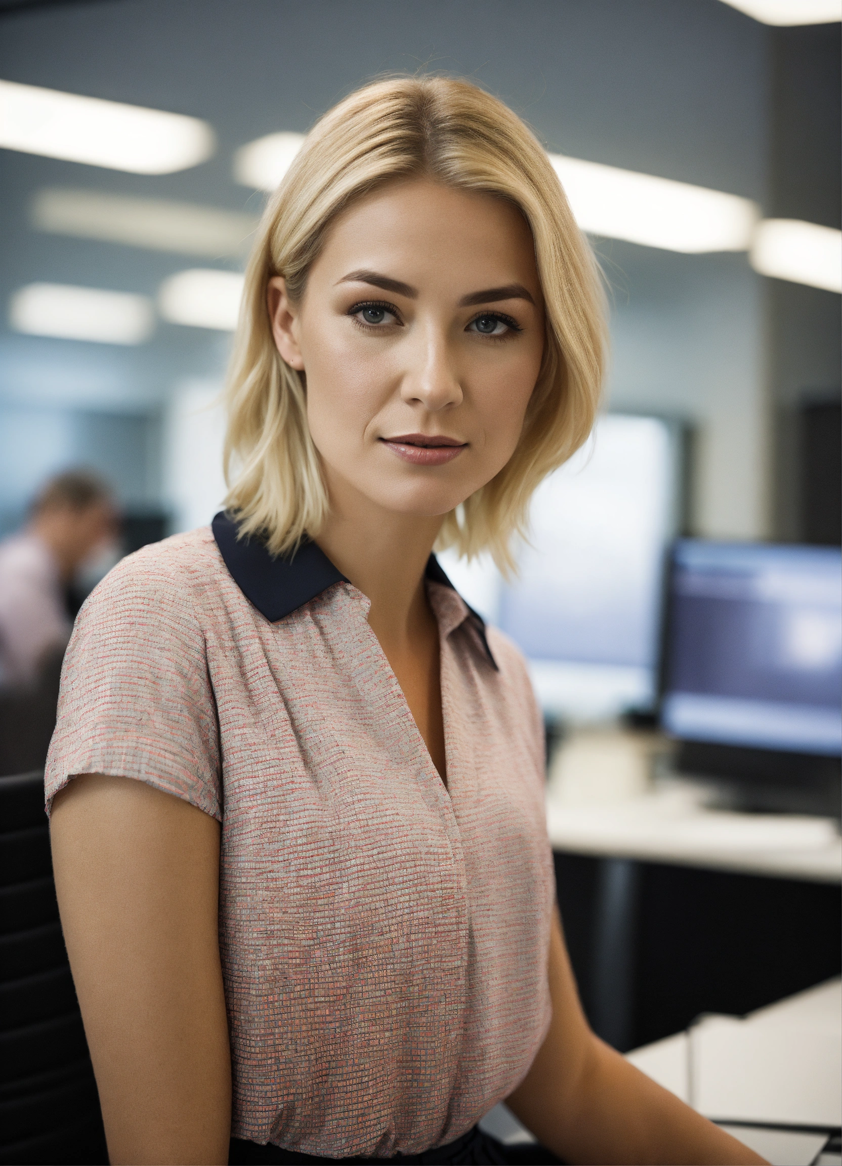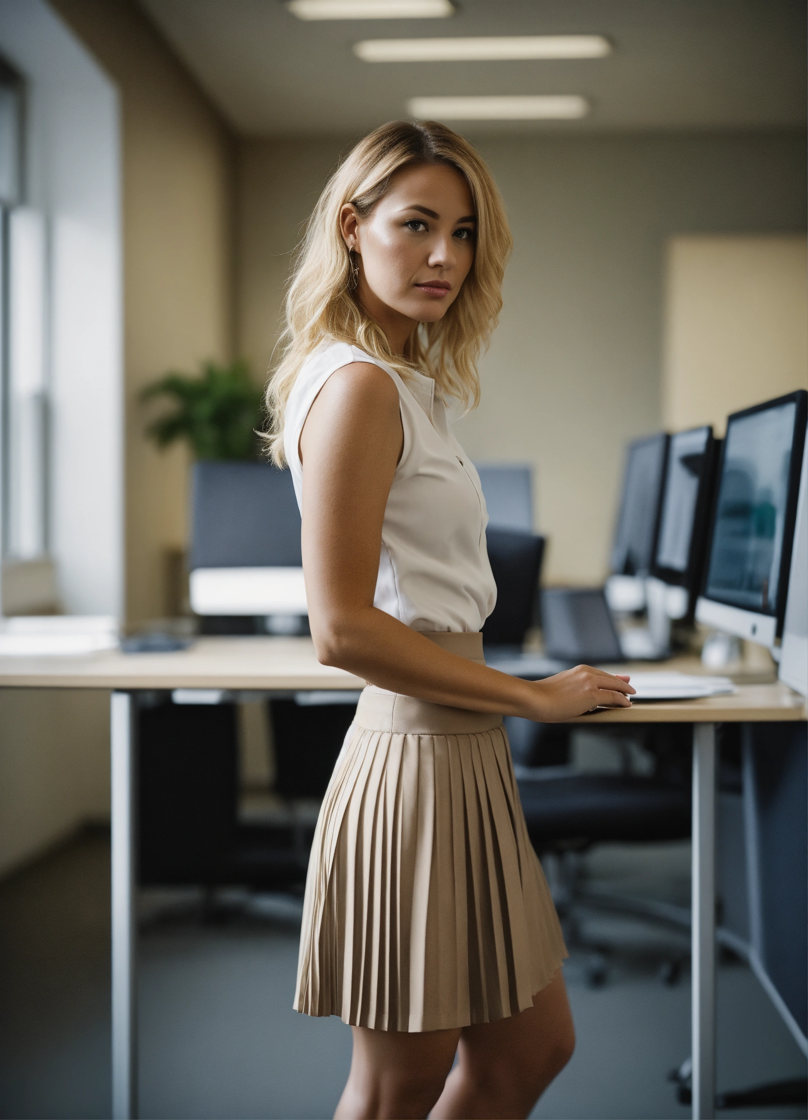 A blonde women in her 30s in a modern office, wearing a pleated skirt, bending over, portrait. documentary