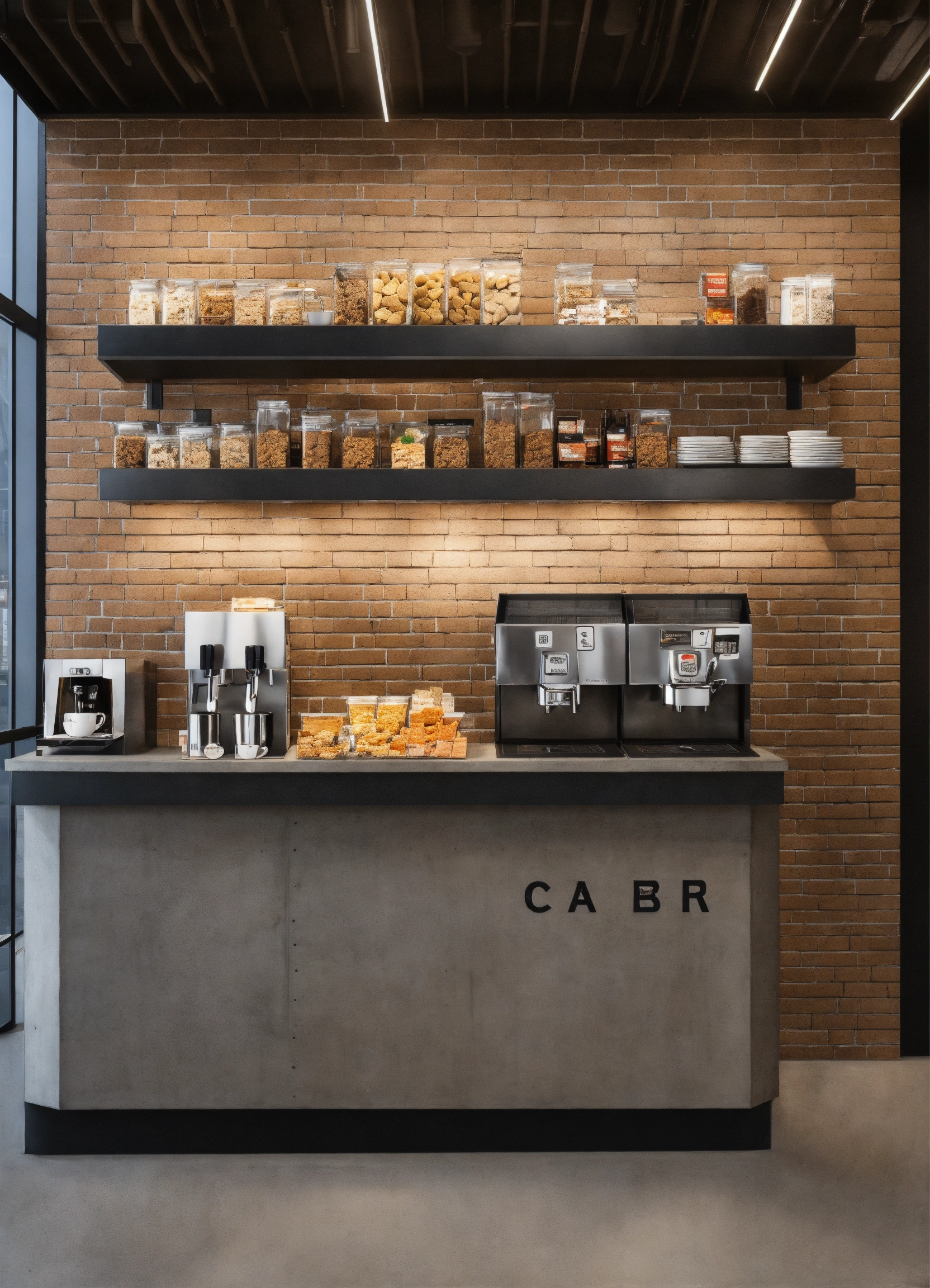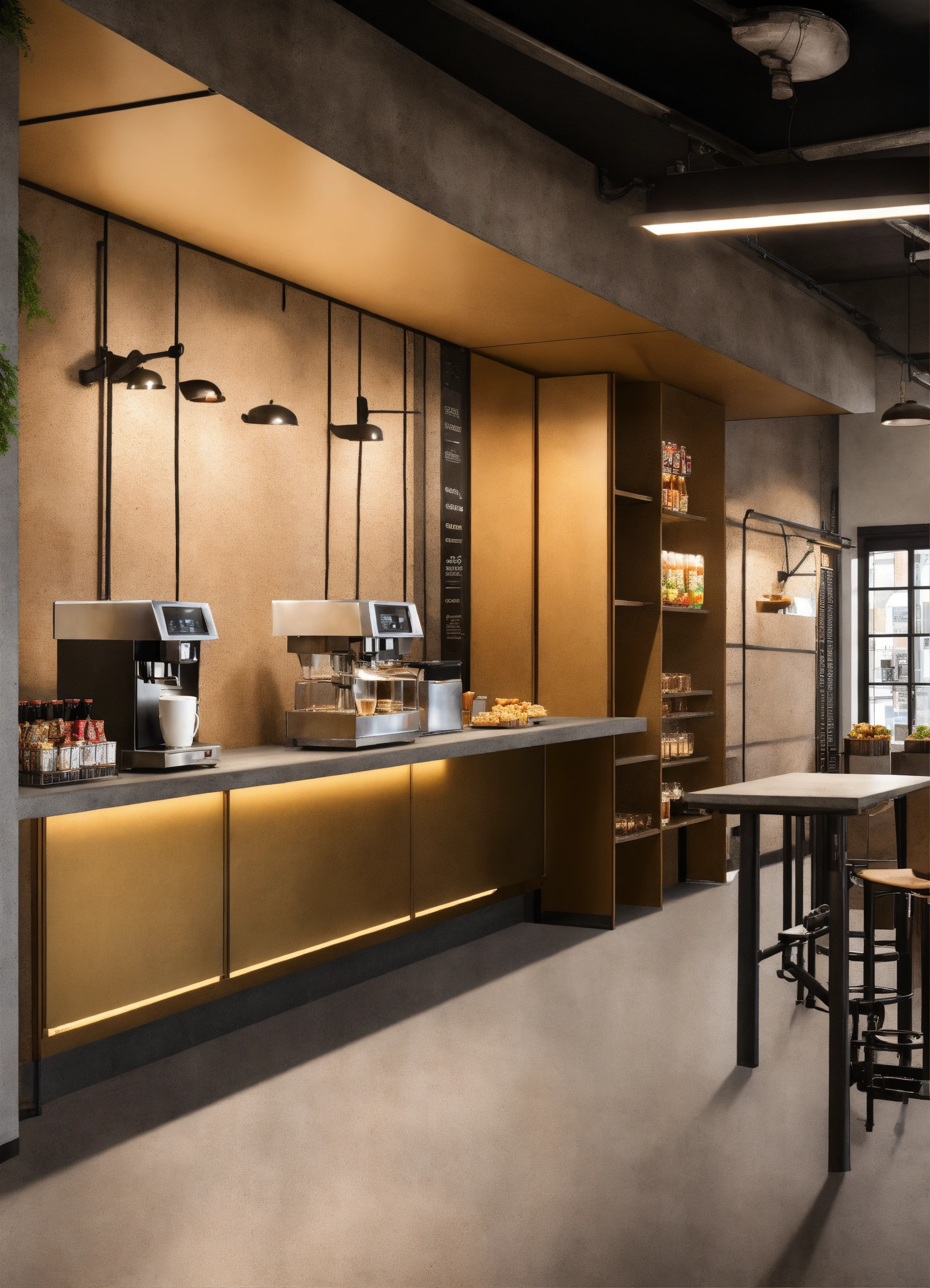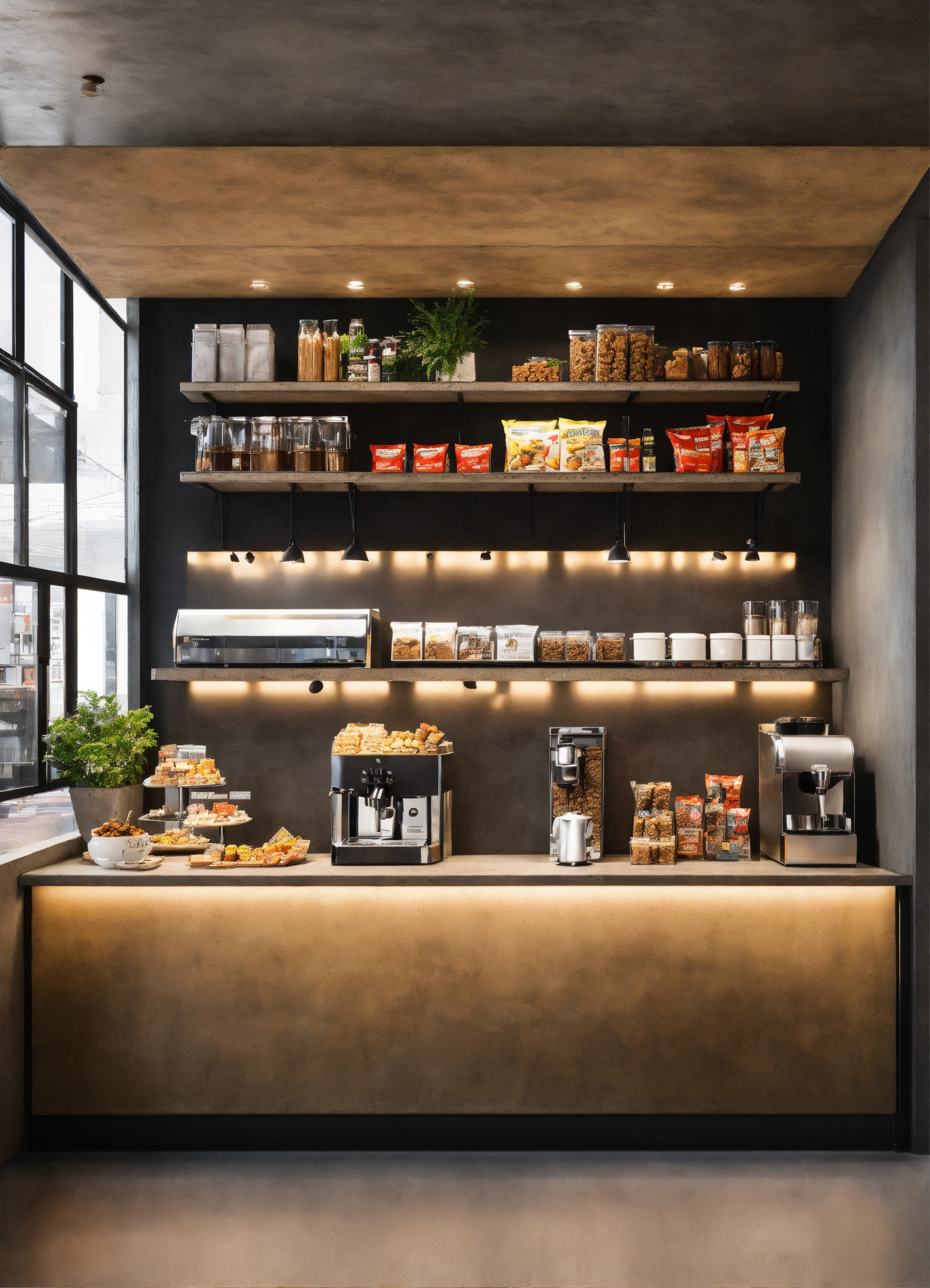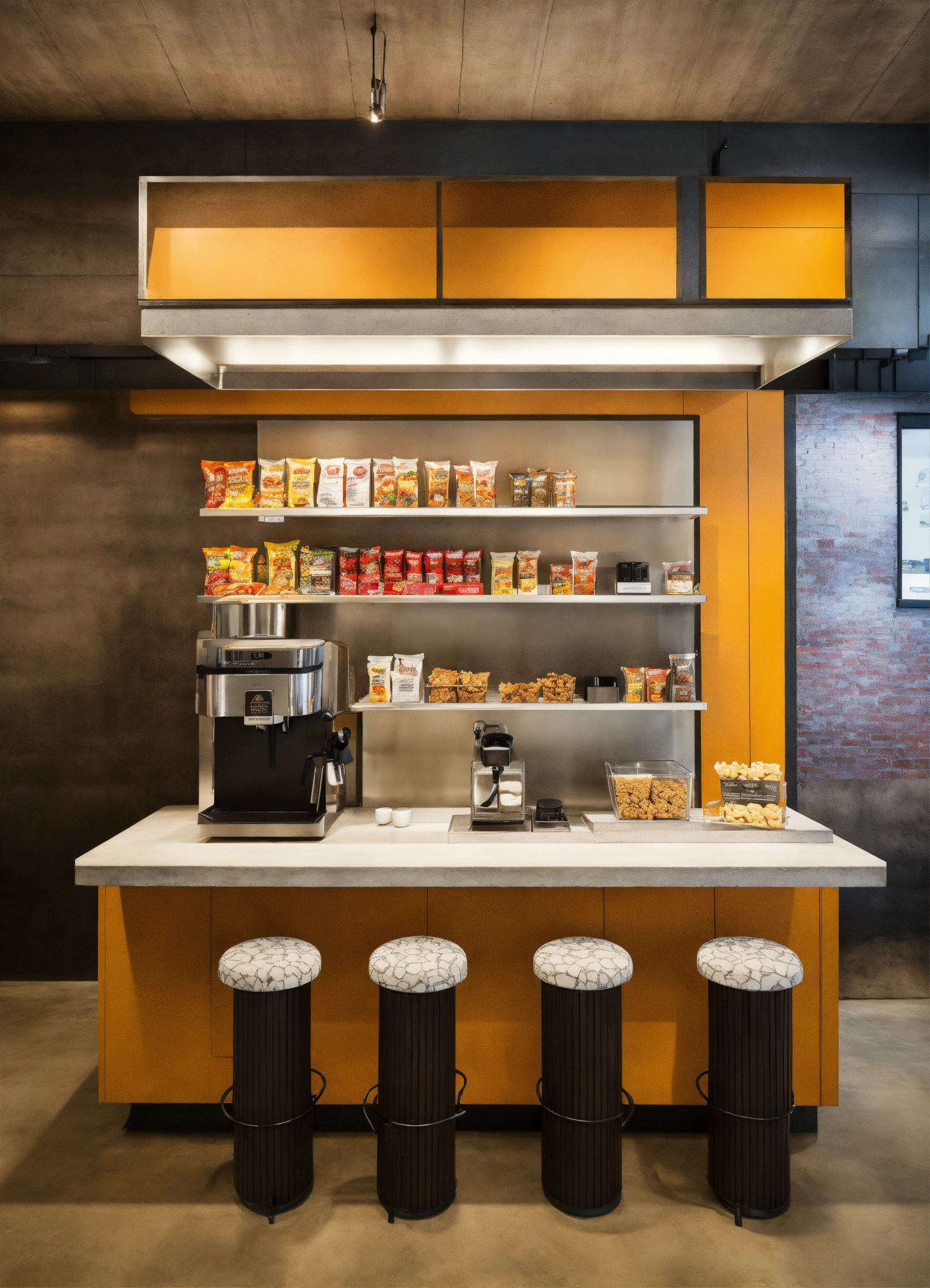 A self serve breakroom snack bar with snacks on an easy to reach shelf for employees to take from as they need. modern design, cafe interior, industrial effect, ultra-realistic, show all details of cafe bar and celling show espresso machine, concrete celling, cafe will be in car show room, architectural design