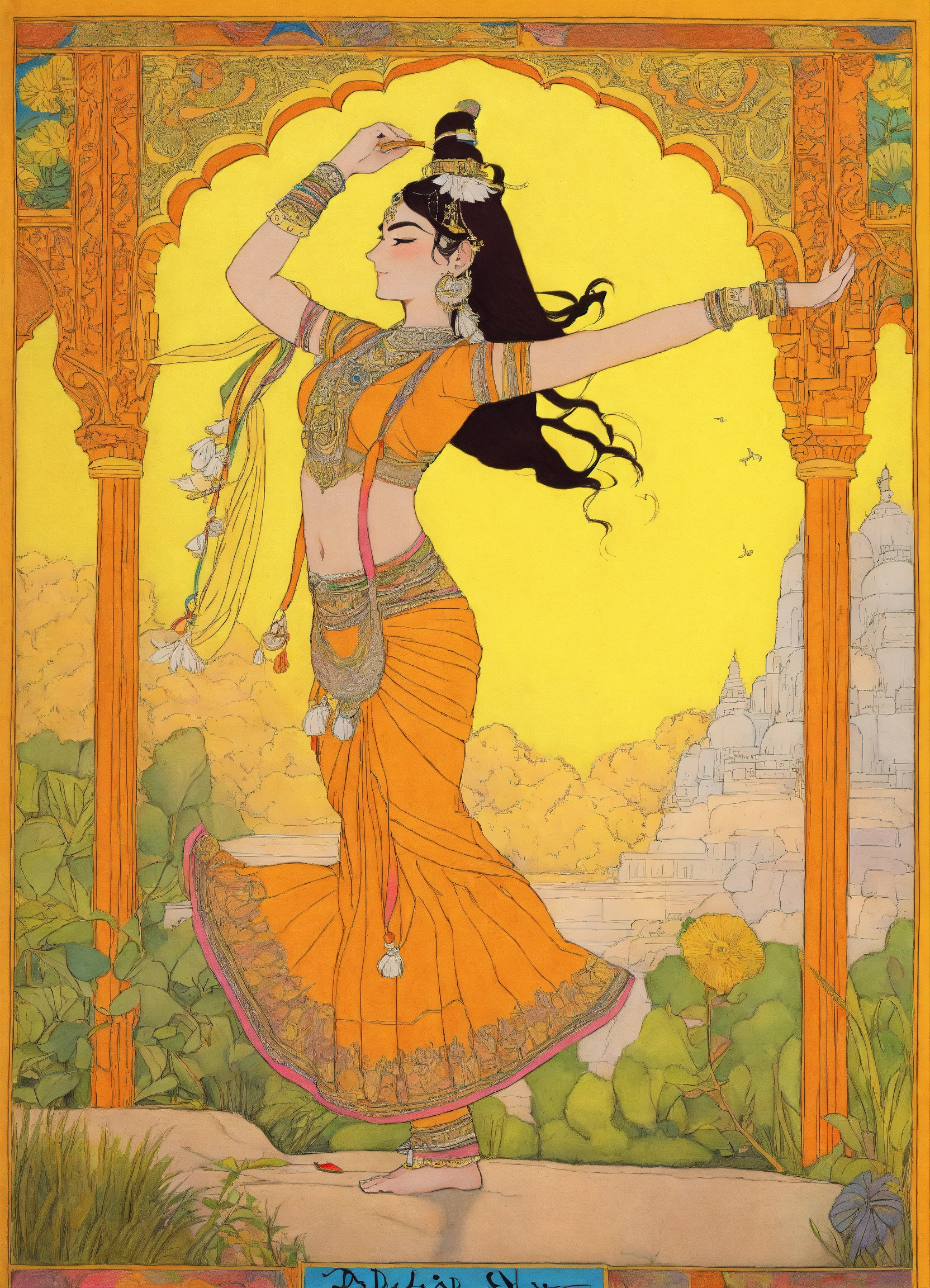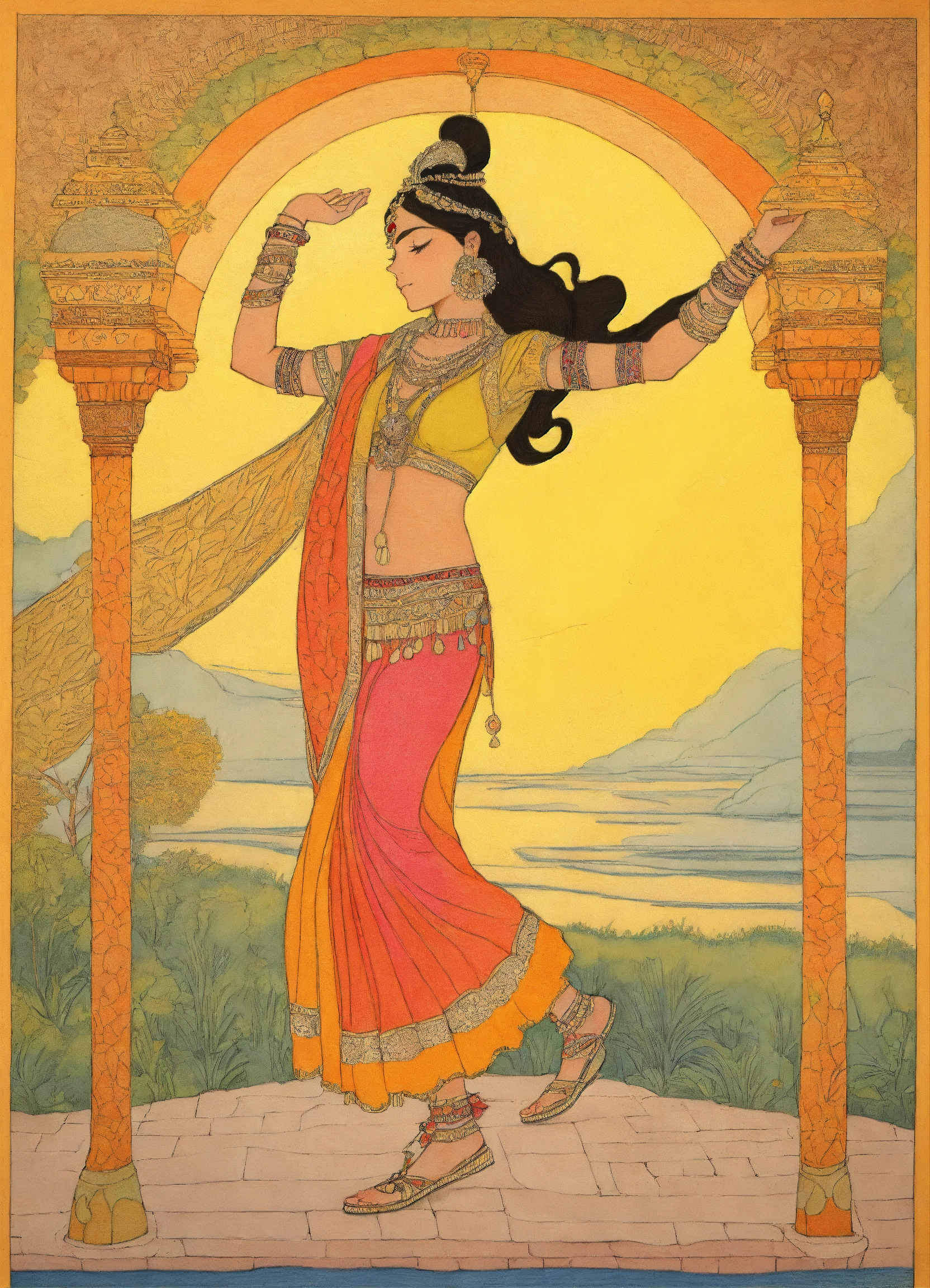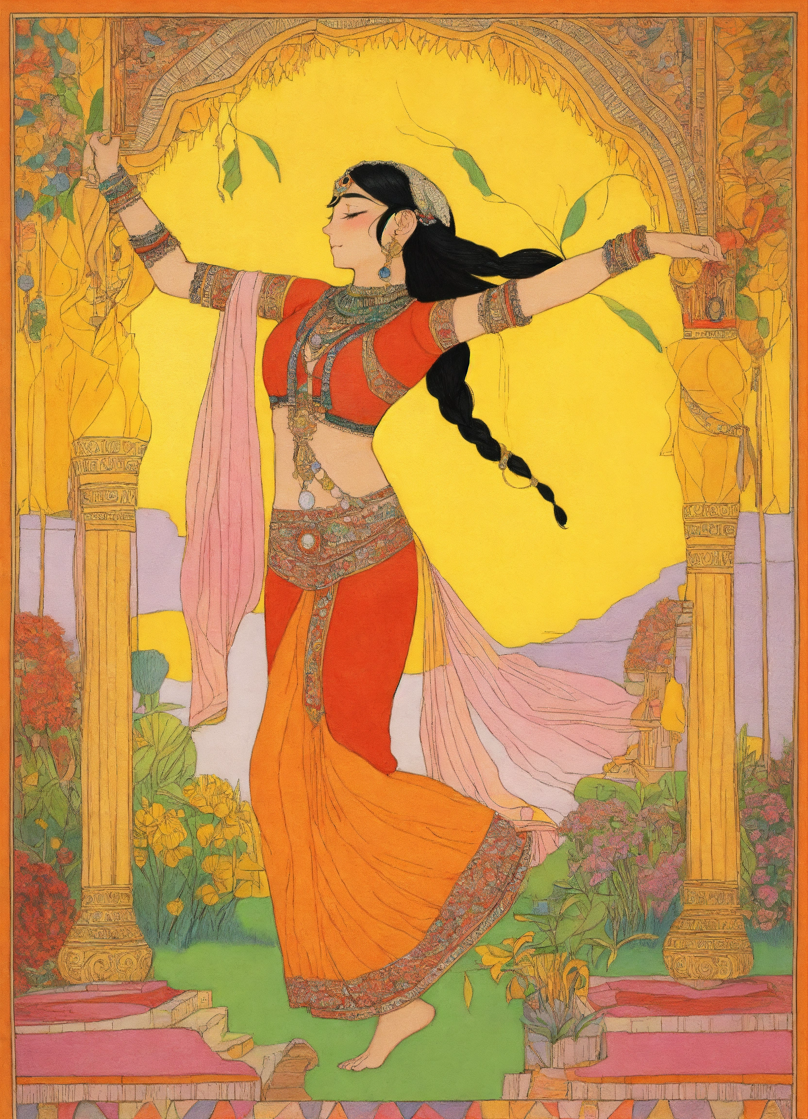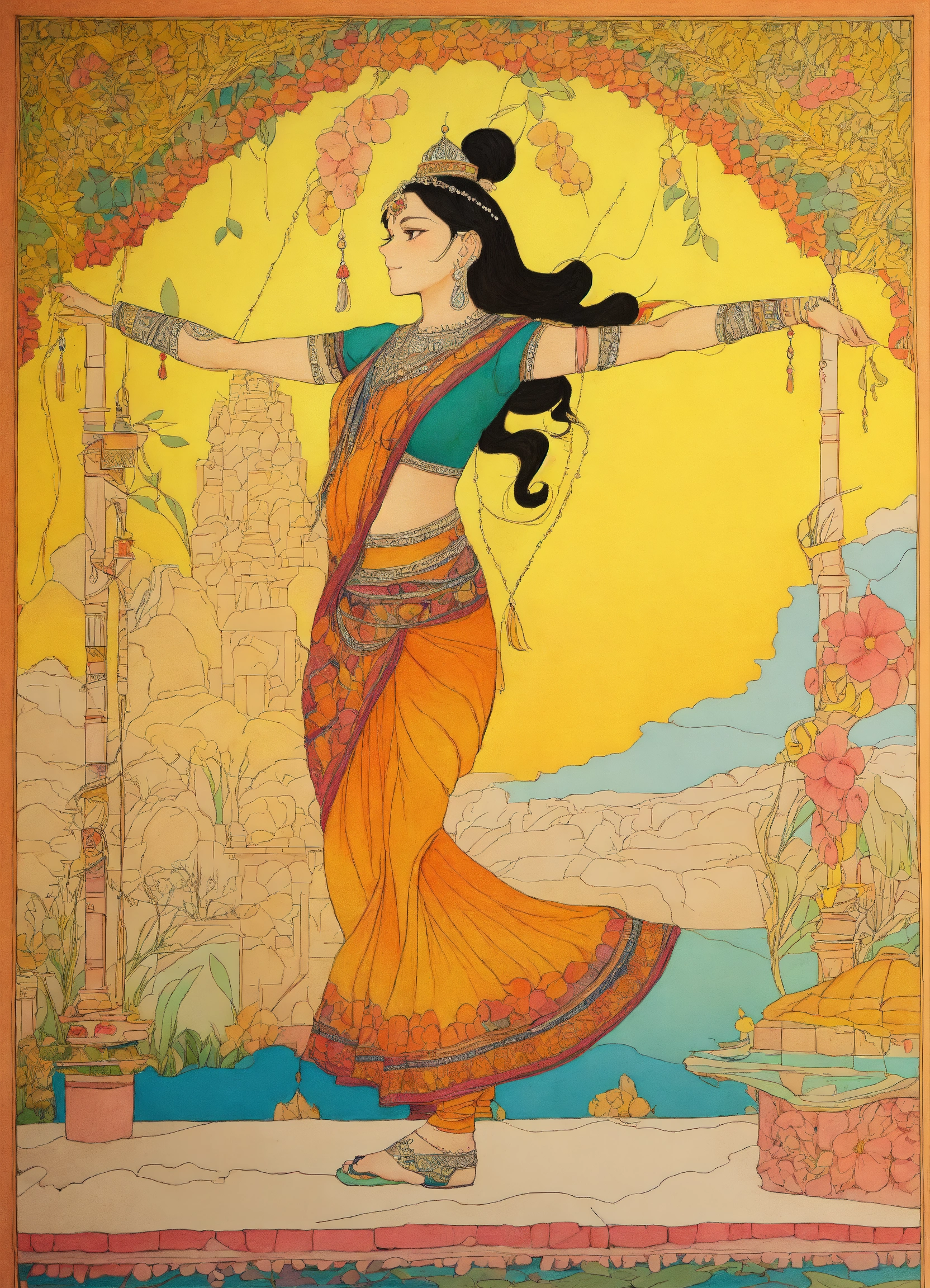 Indian drawing the dance of nature. line drawing, clean clear lines, coloring book style, bright colors, intricate details, elegant, discreete, serene, peaceful, fine detail, pastel pencils, winsor mccay style