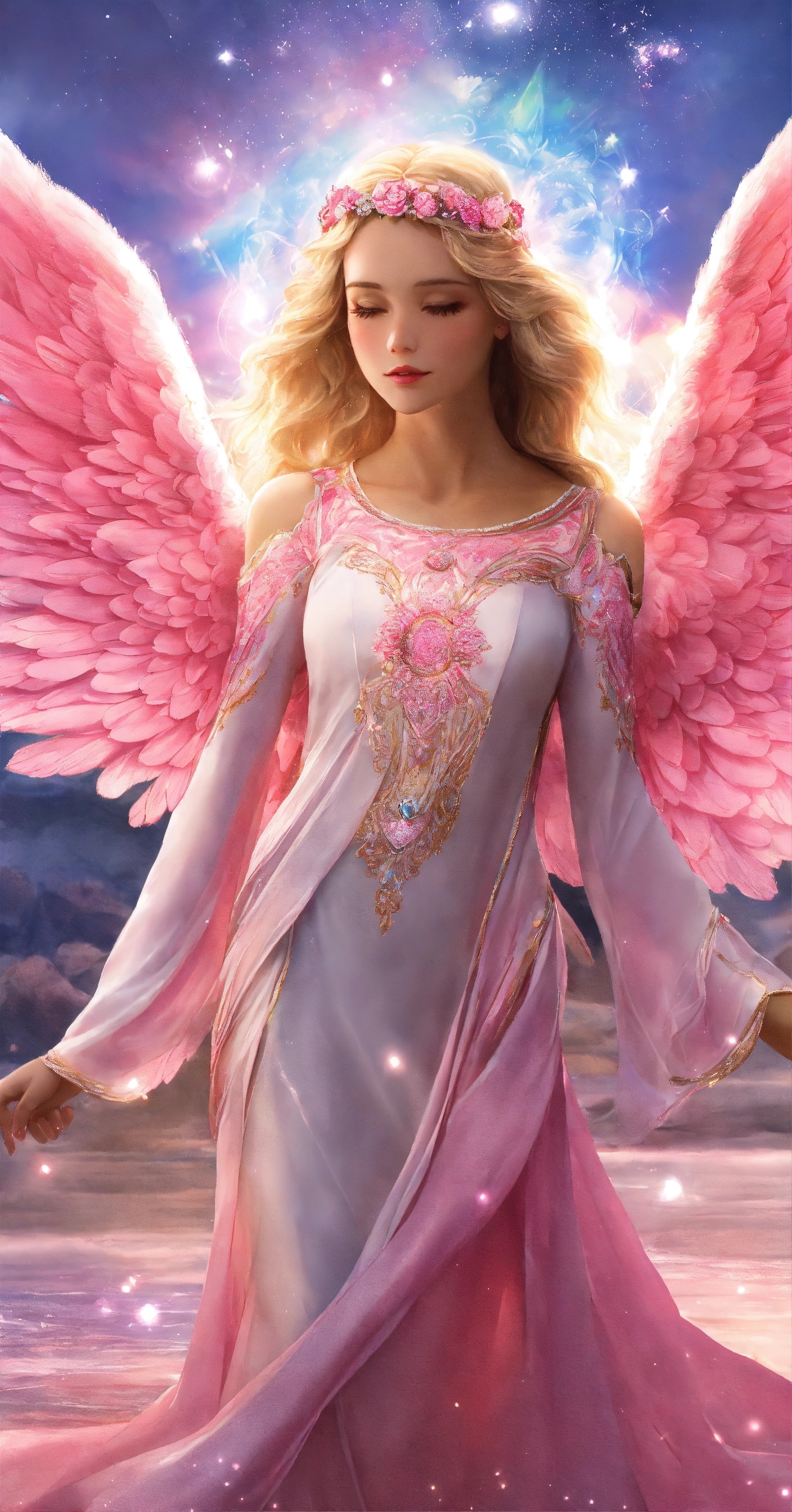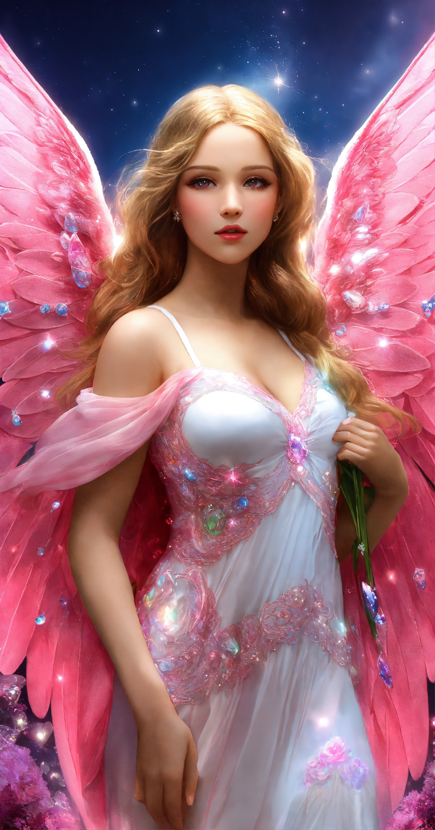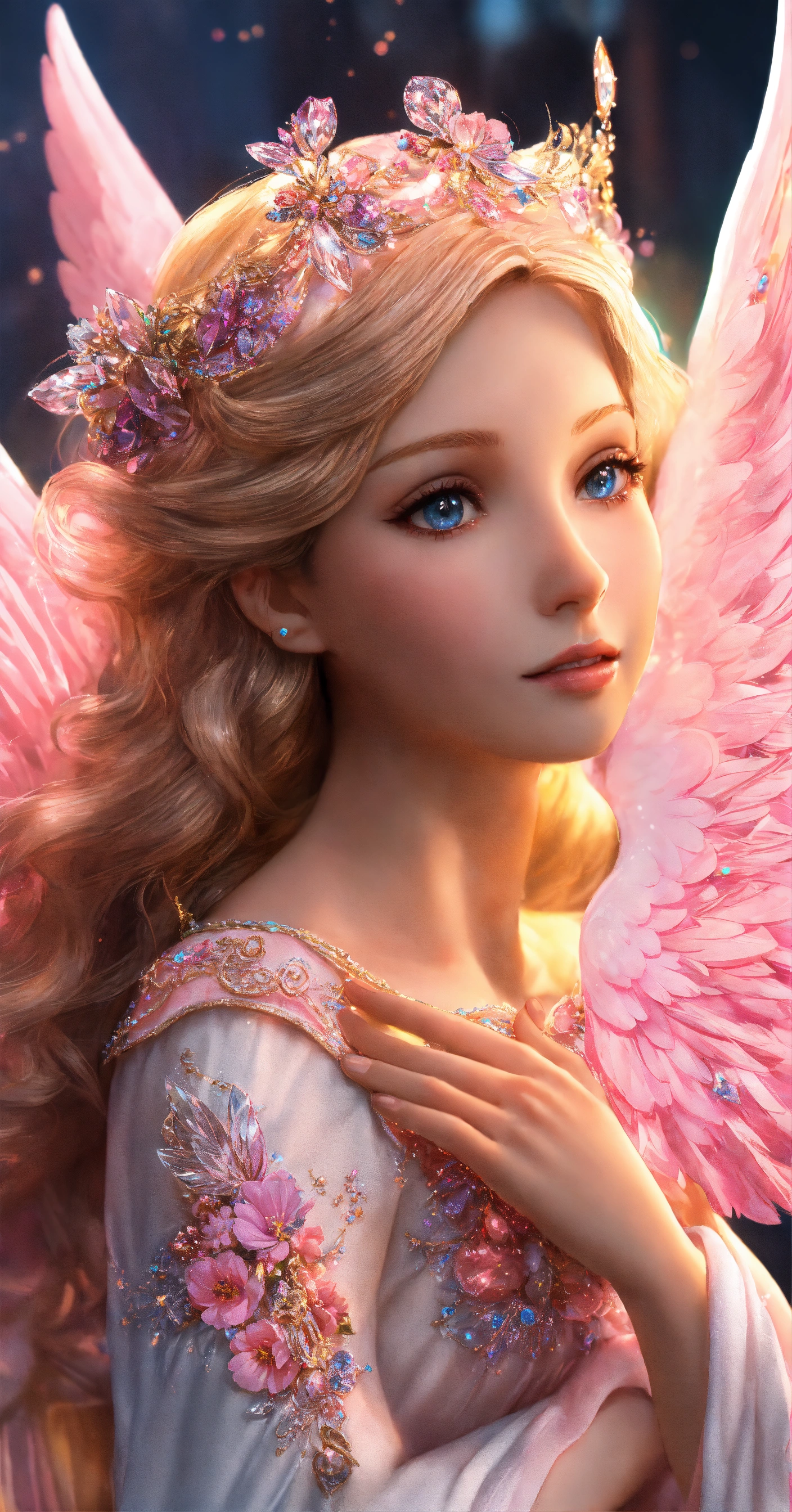1guardian angel, beautiful and perfect 25-year-old woman hugging a 7-year-old angel girl with angel wings. guardian angel woman with a beautiful and perfect little angel with defined and detailed pink angel wings. wings are pink with silver sparkles. beautiful and detailed faces. very clear eyes with a deep and penetrating look. blonde hair detailed with pink decorations such as fuchsia tulip flowers and iridescent gems and crystals. white tunic-type dress with pink details and luminous sparkles. the angel woman opens her luminous wings and protects the angel girl. around there are tulip gardens and a stream of beautiful and very natural crystal clear water. the sky is divine and beautiful with colorful clouds and a radiant sun and very powerful immersive pink mandalas are forming. realism. masterpiece. digital art, hd, high quality. high resolution hd. 8k.
