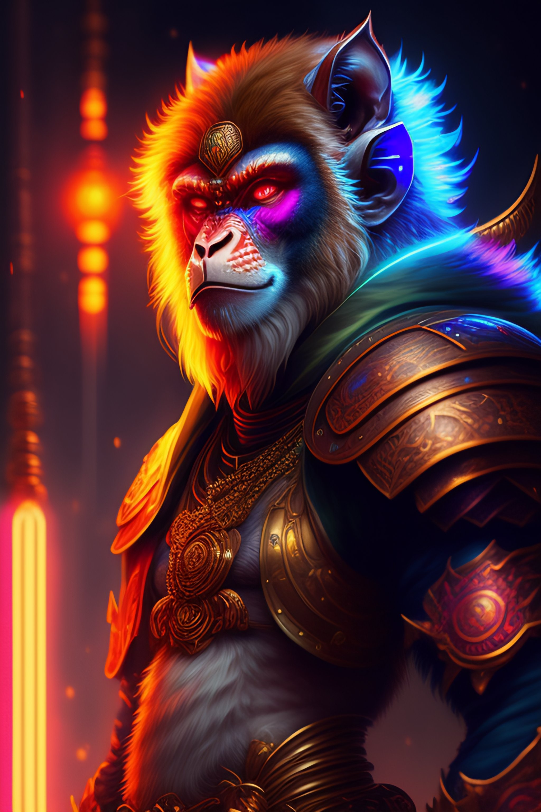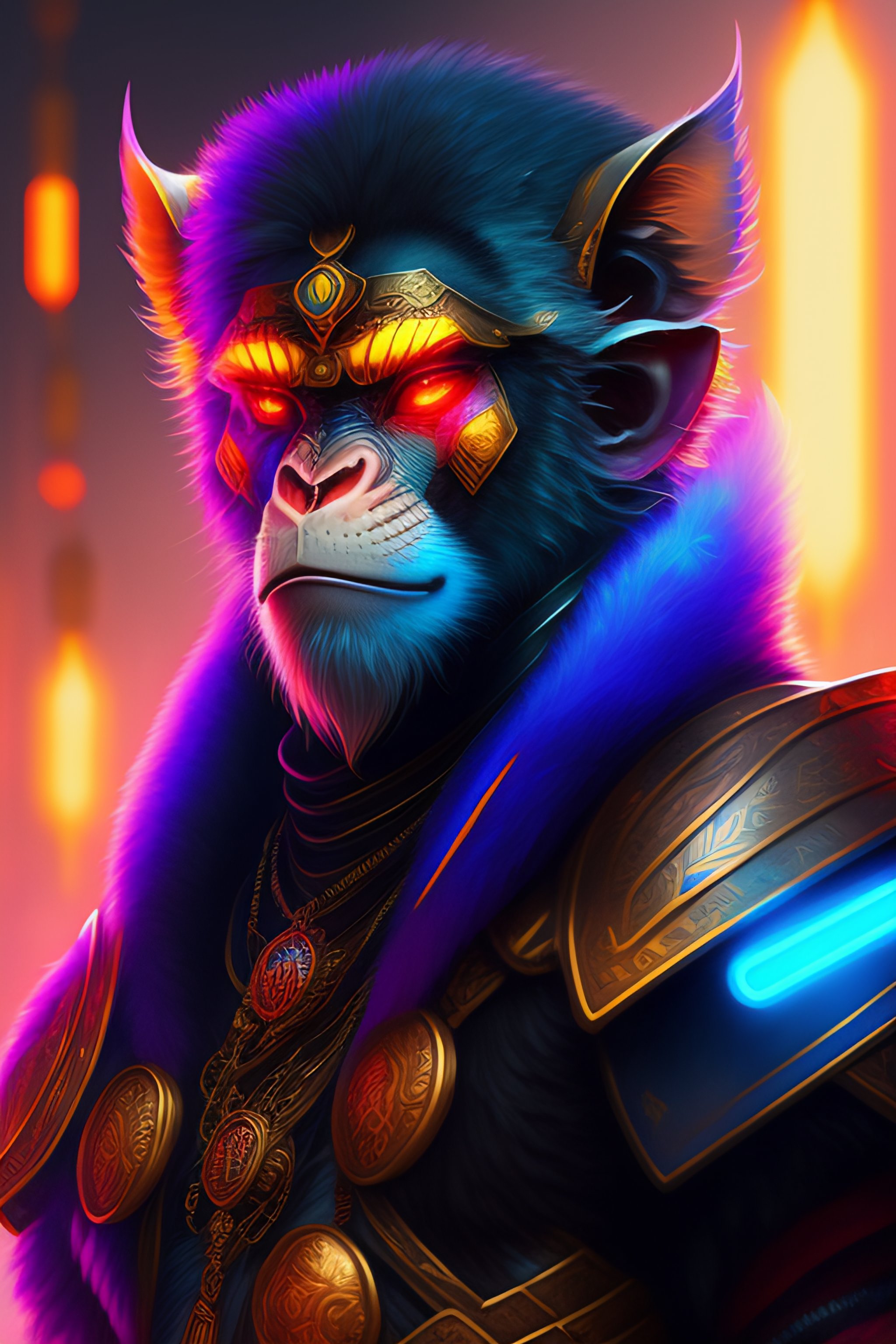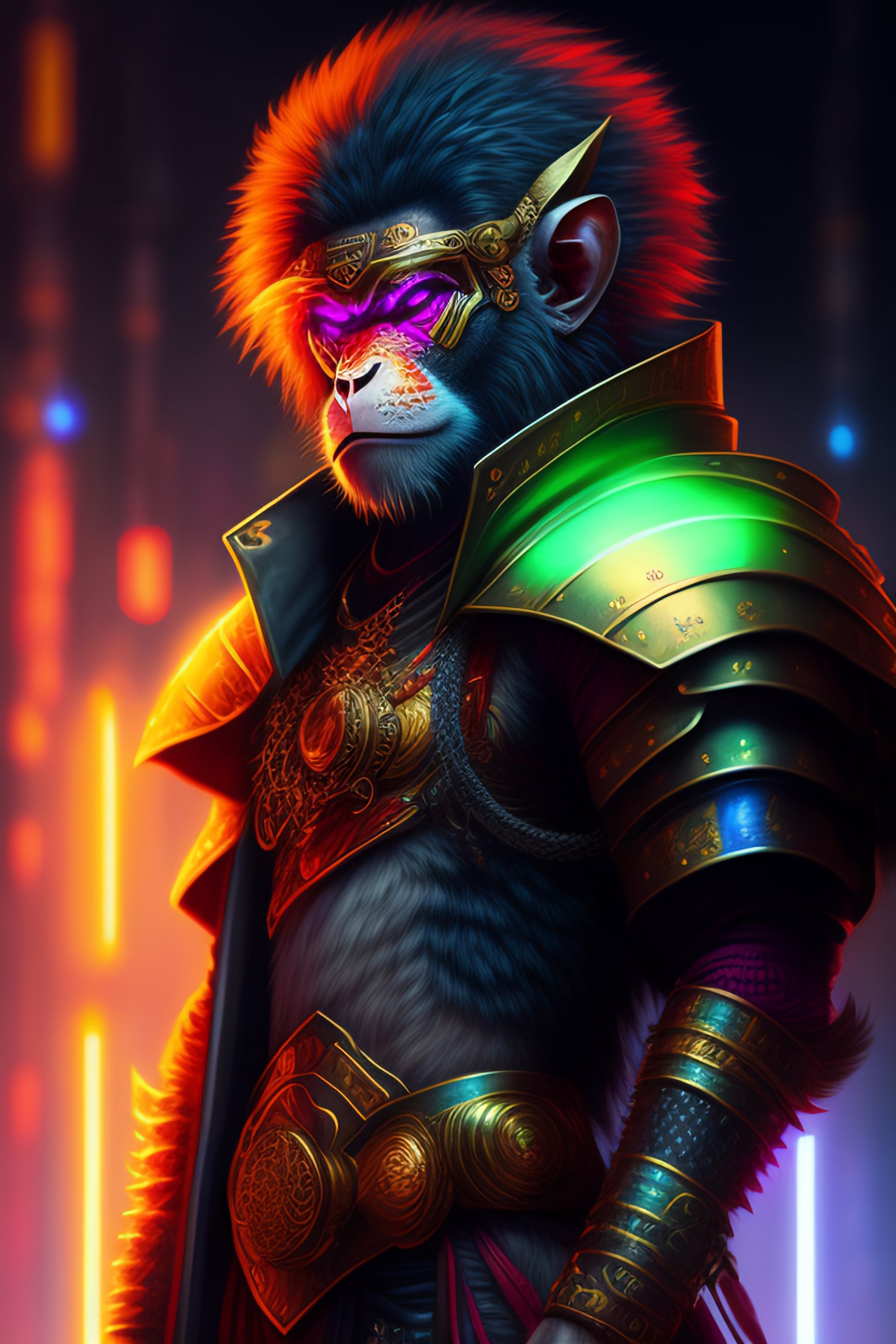 A mechanical monkey‘s portrait of sun wukong, wearing cyberpunk armor, neon, d & d, fantasy, intricate, badass, highly detailed, digital painting