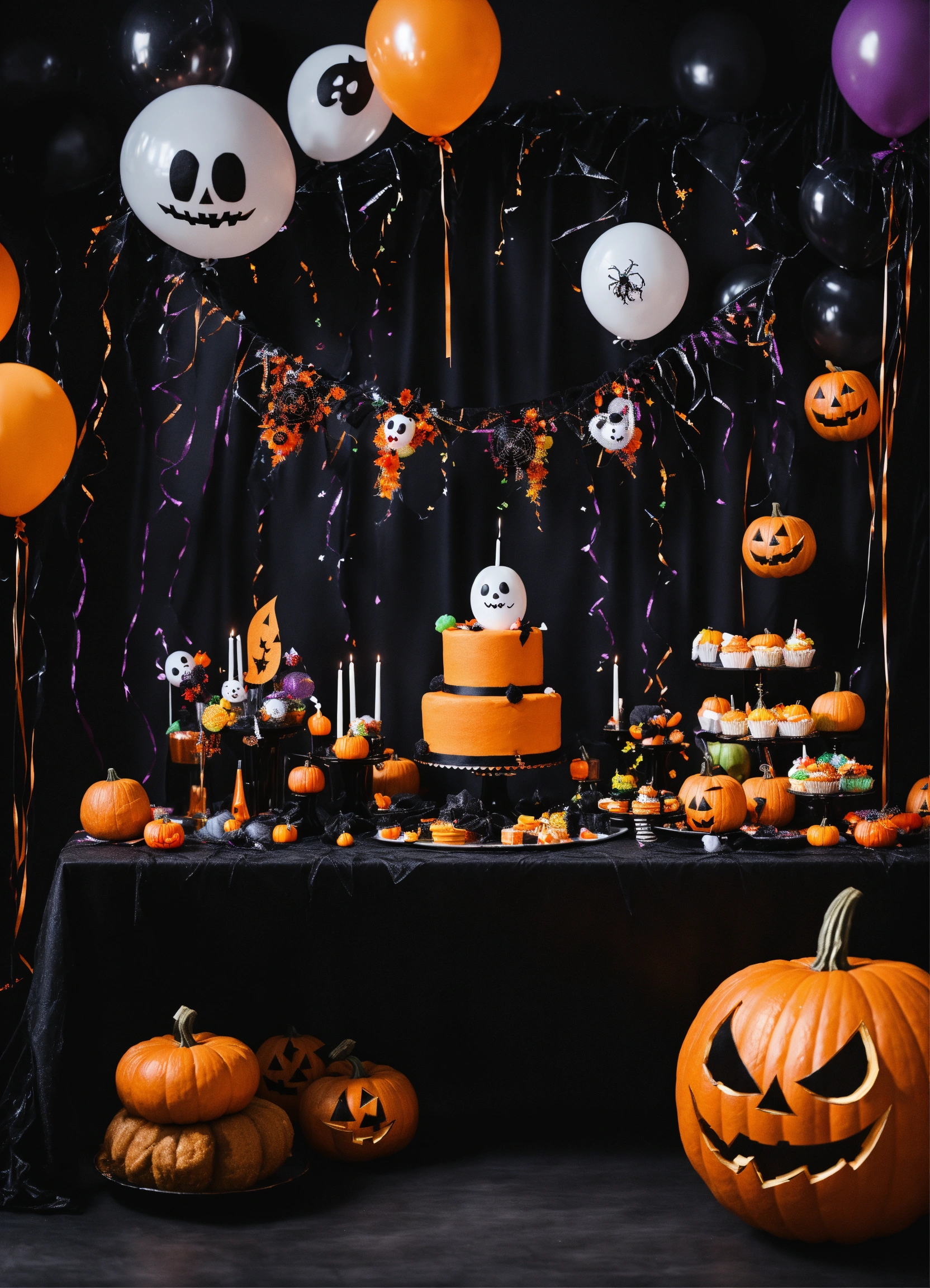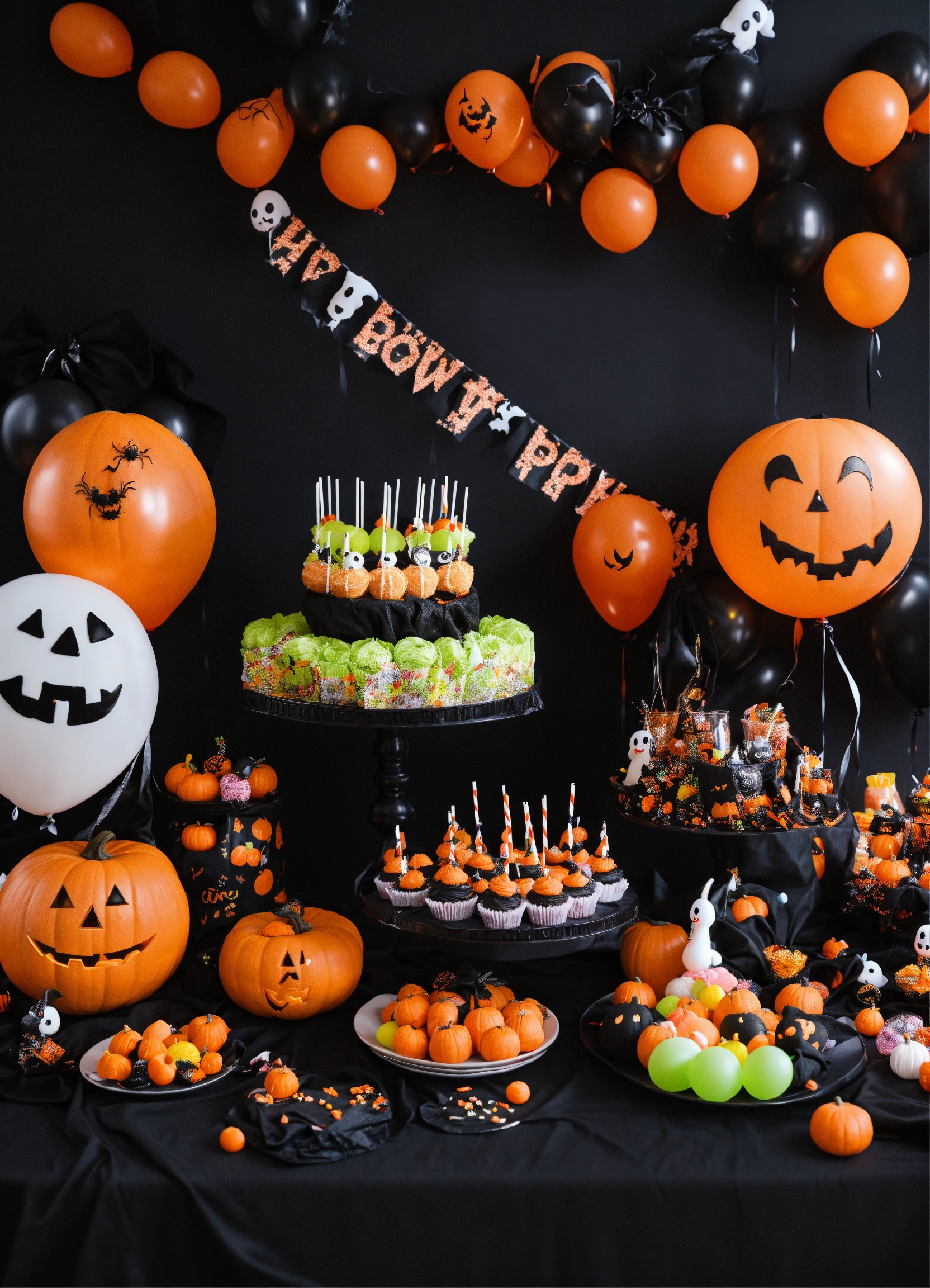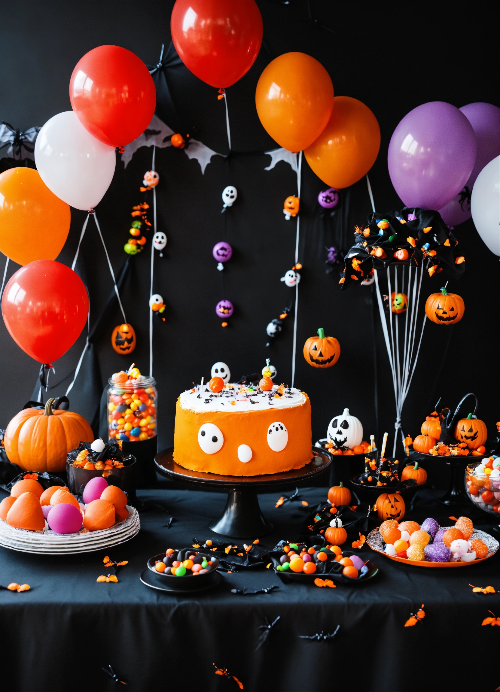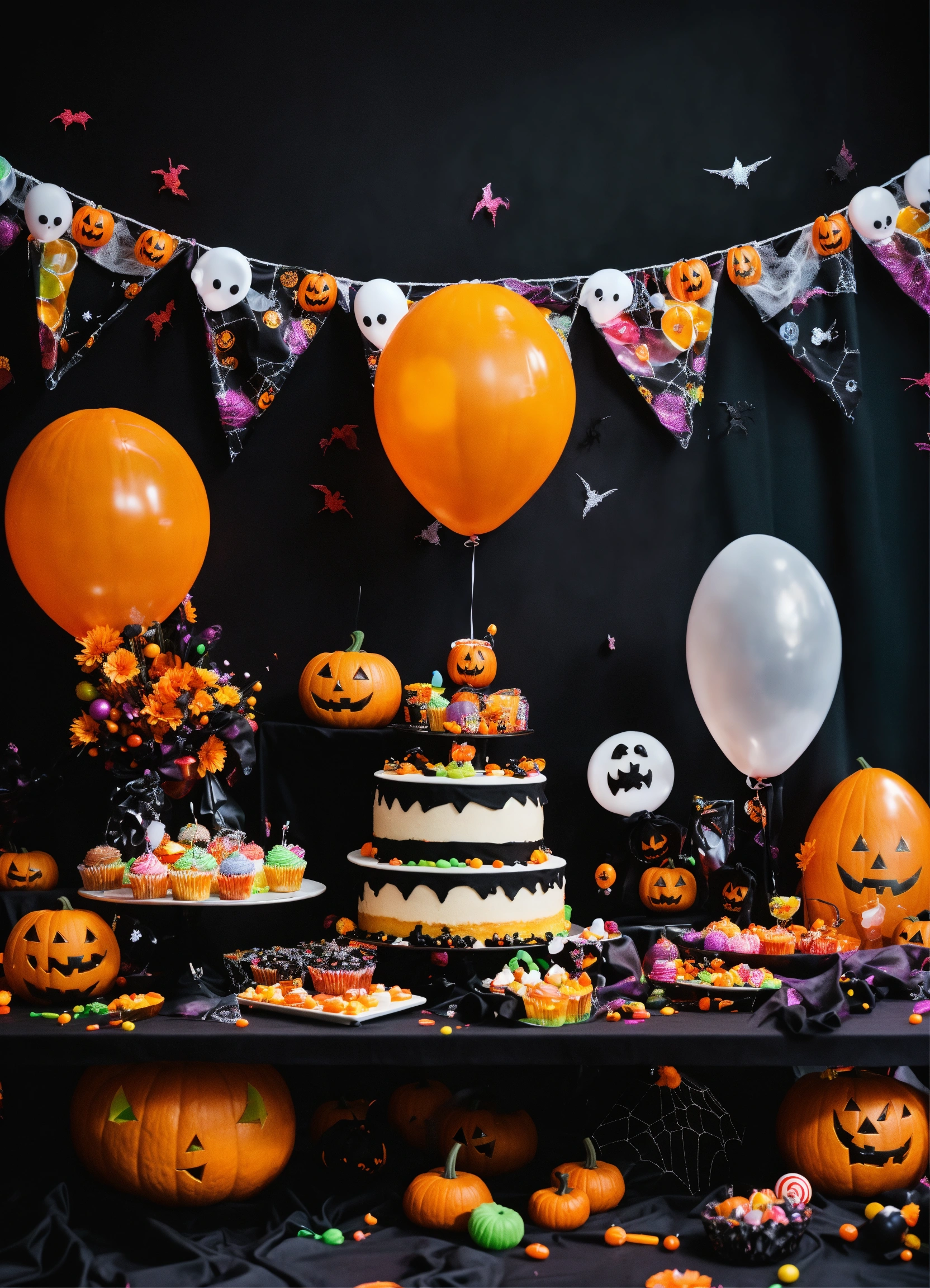 A big table whit a black fabric, whit a funny and cute hallowen decoration for kids, in a black background, cute ghosts, many candys, ballons, fruis, cakes spider webs, photo 4k