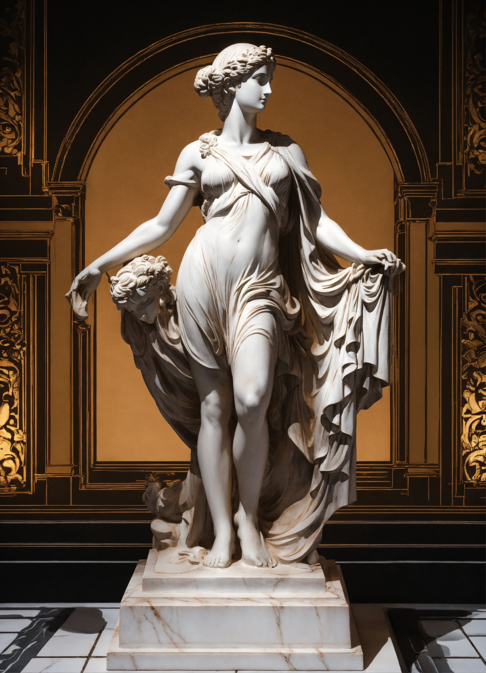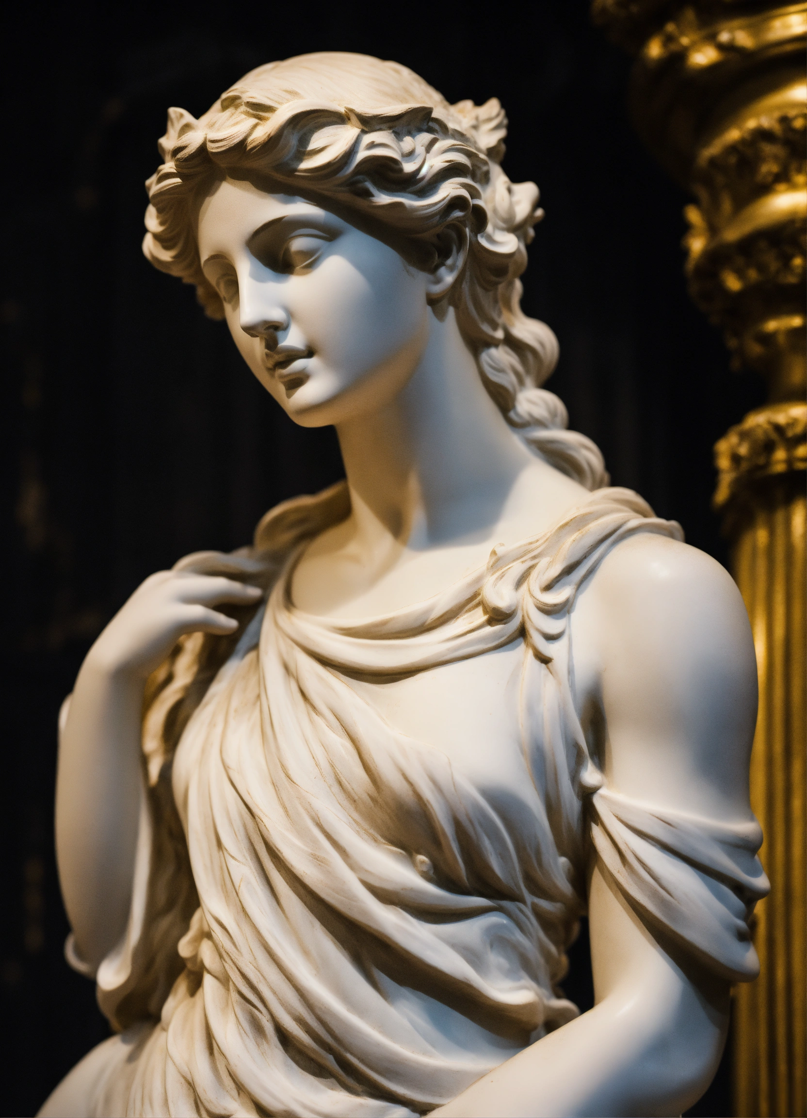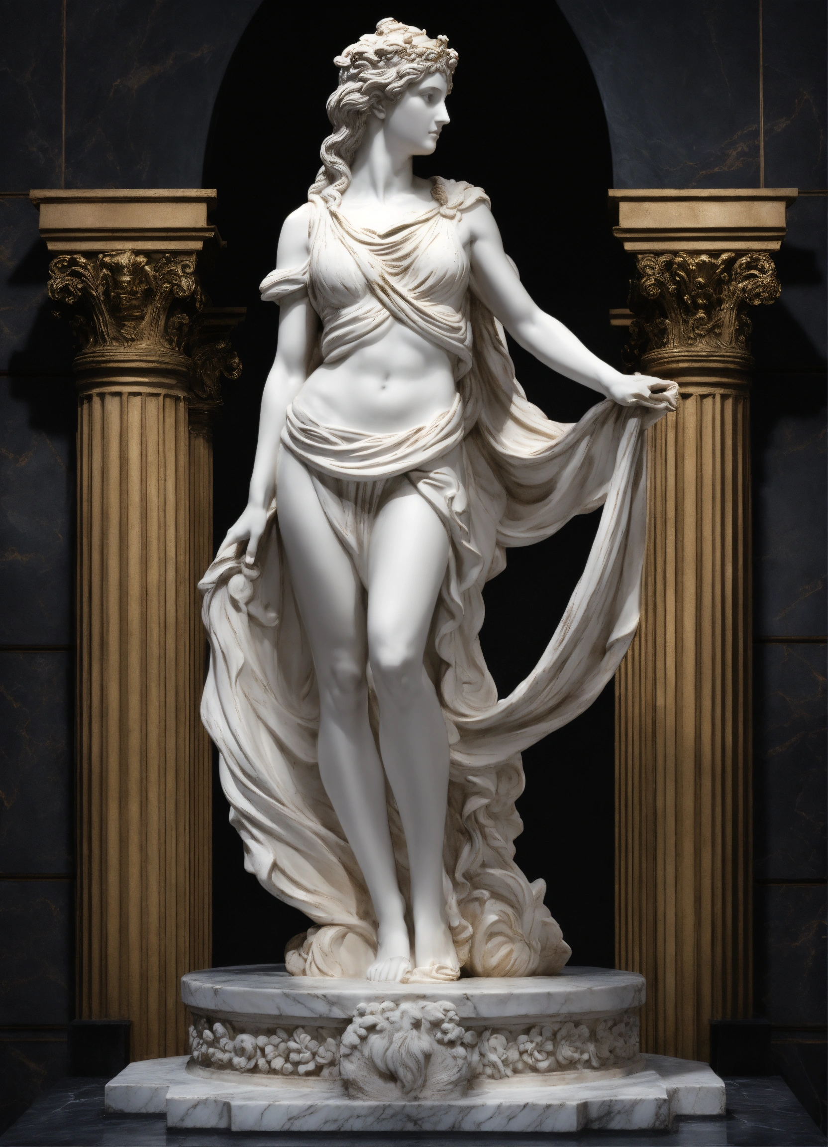 A statue from a death greek goddess statue with a wavey middel parting hair out of white marbel with a black backround standing on a podest animeted style comic