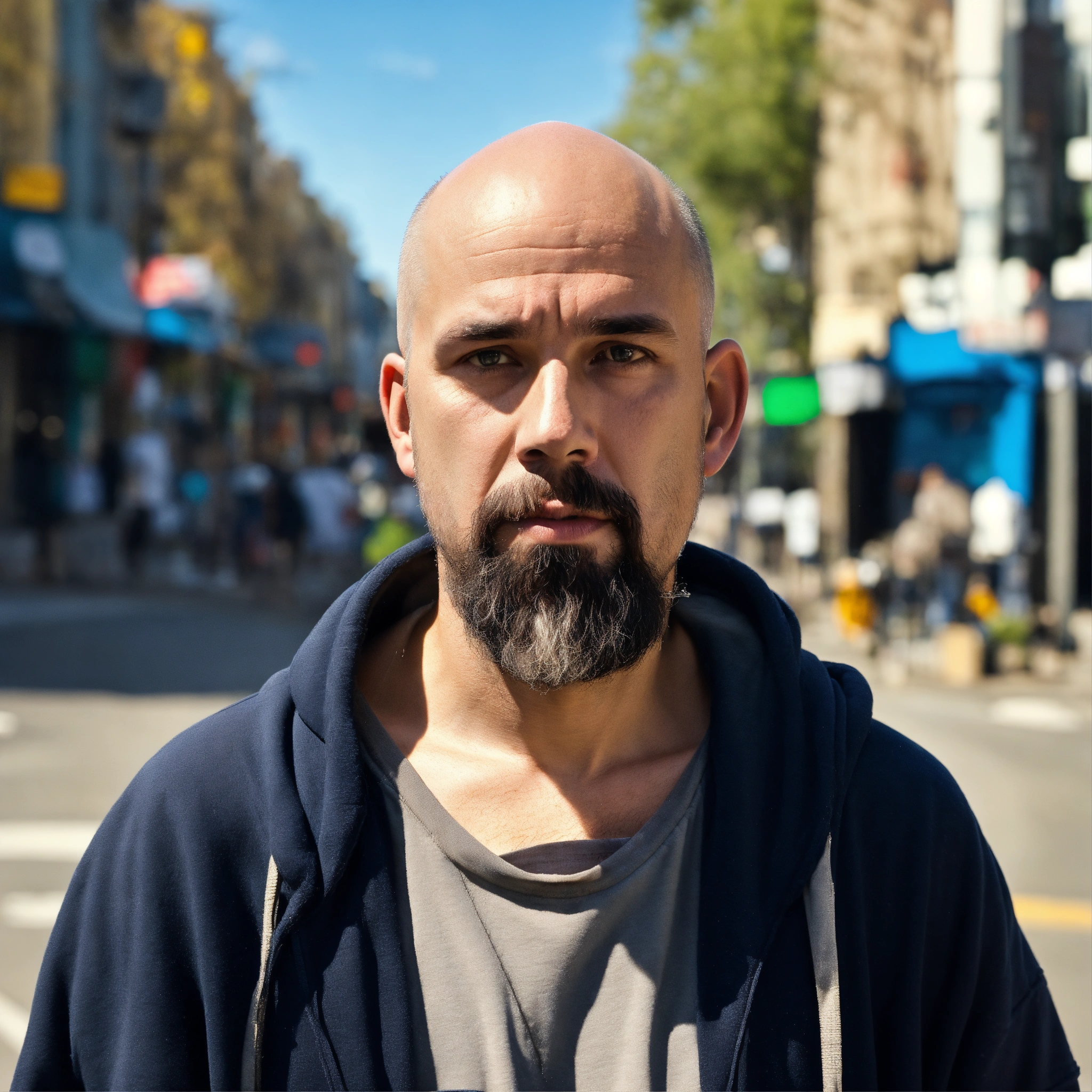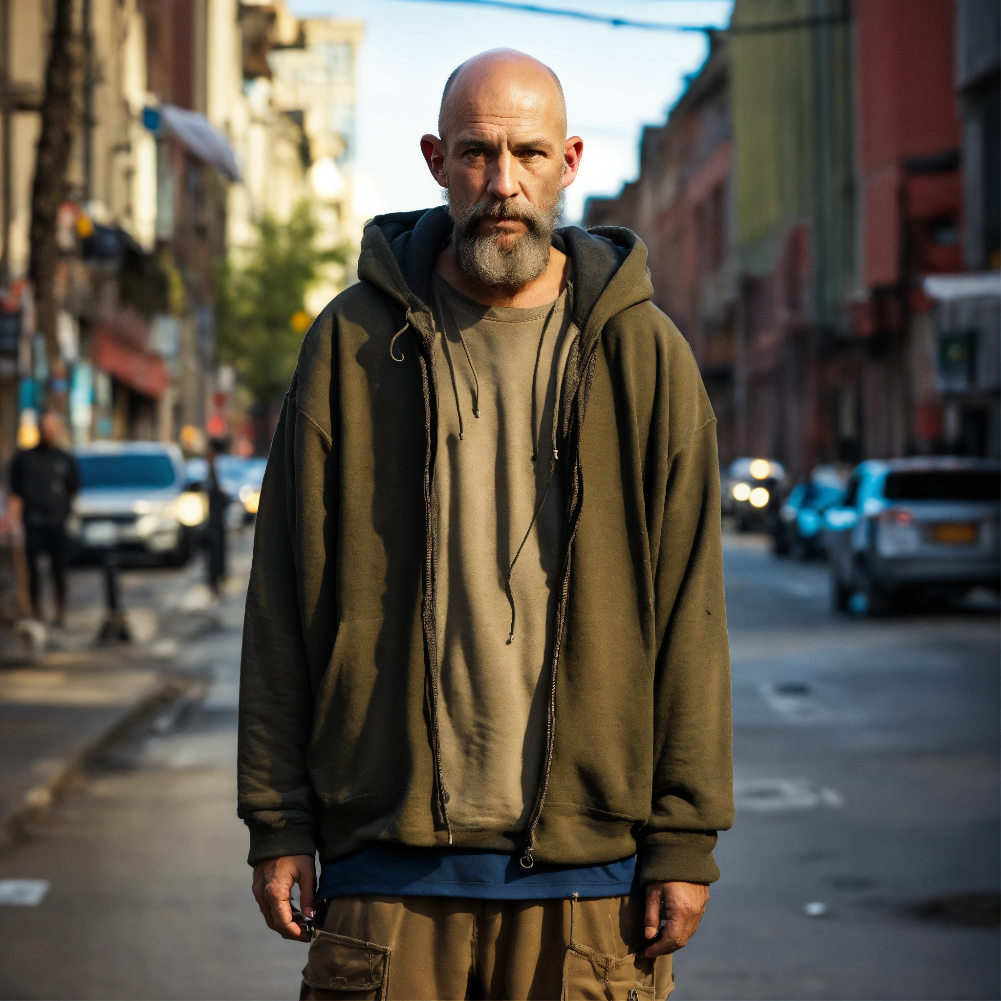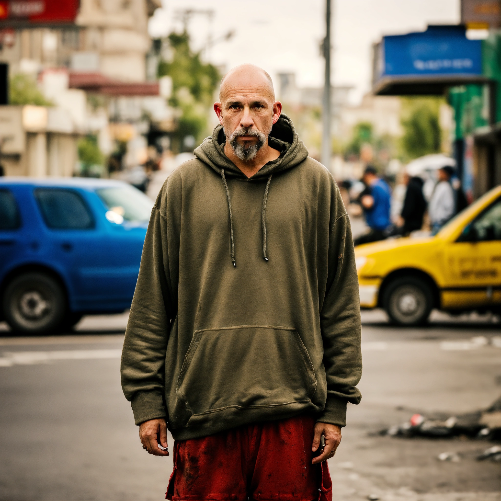 A huge bald homeless man, small goatee, large ears, wearing dirty shorts and a hoodie, standing in the street