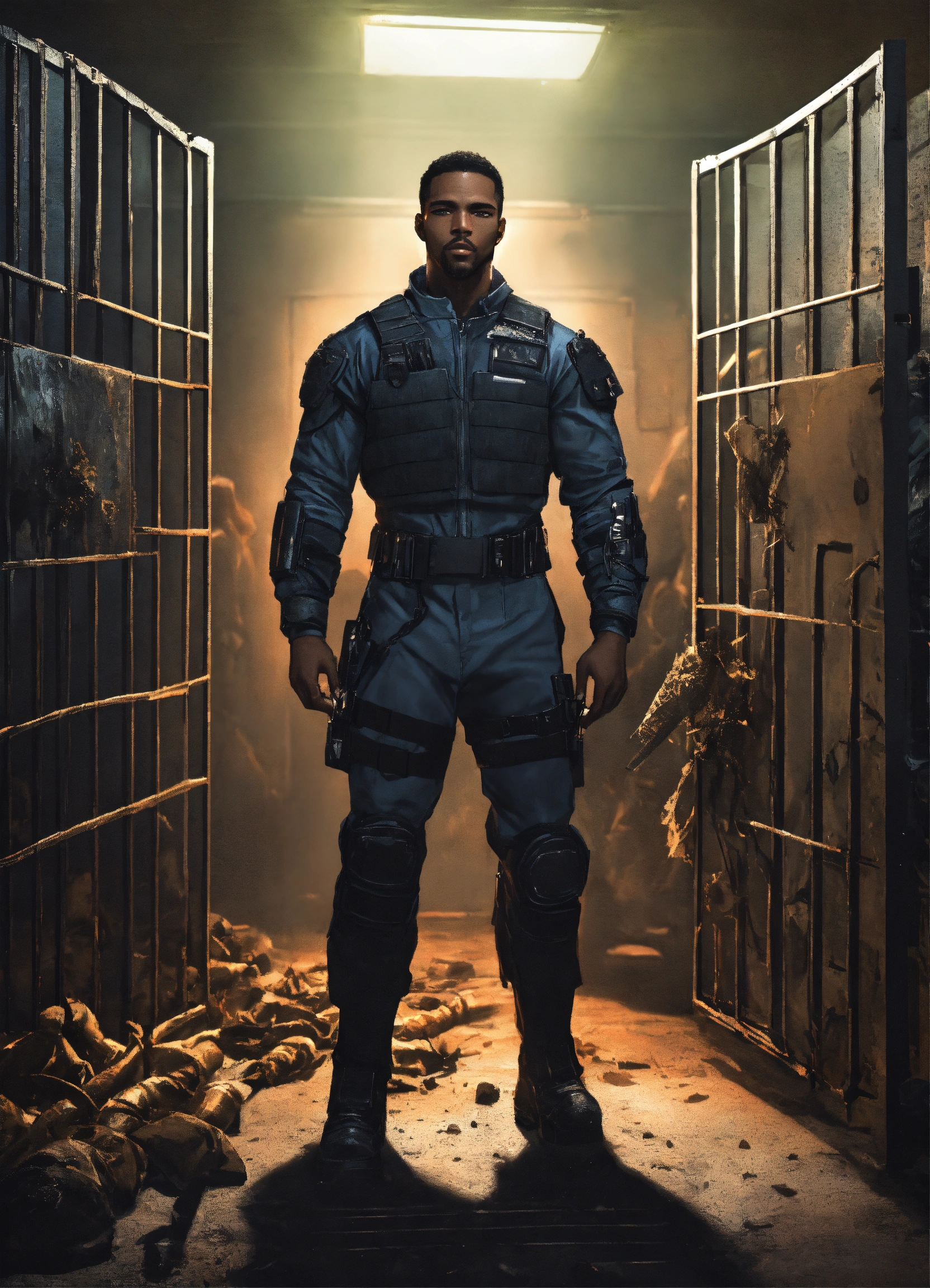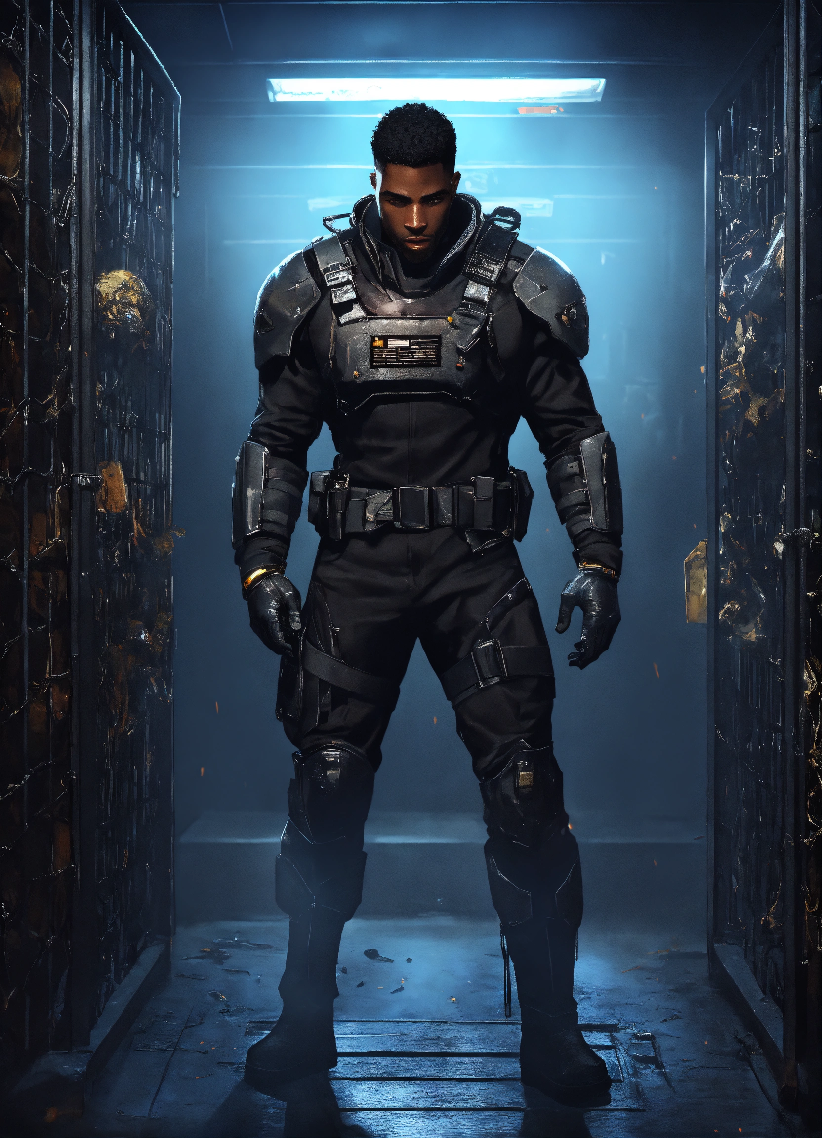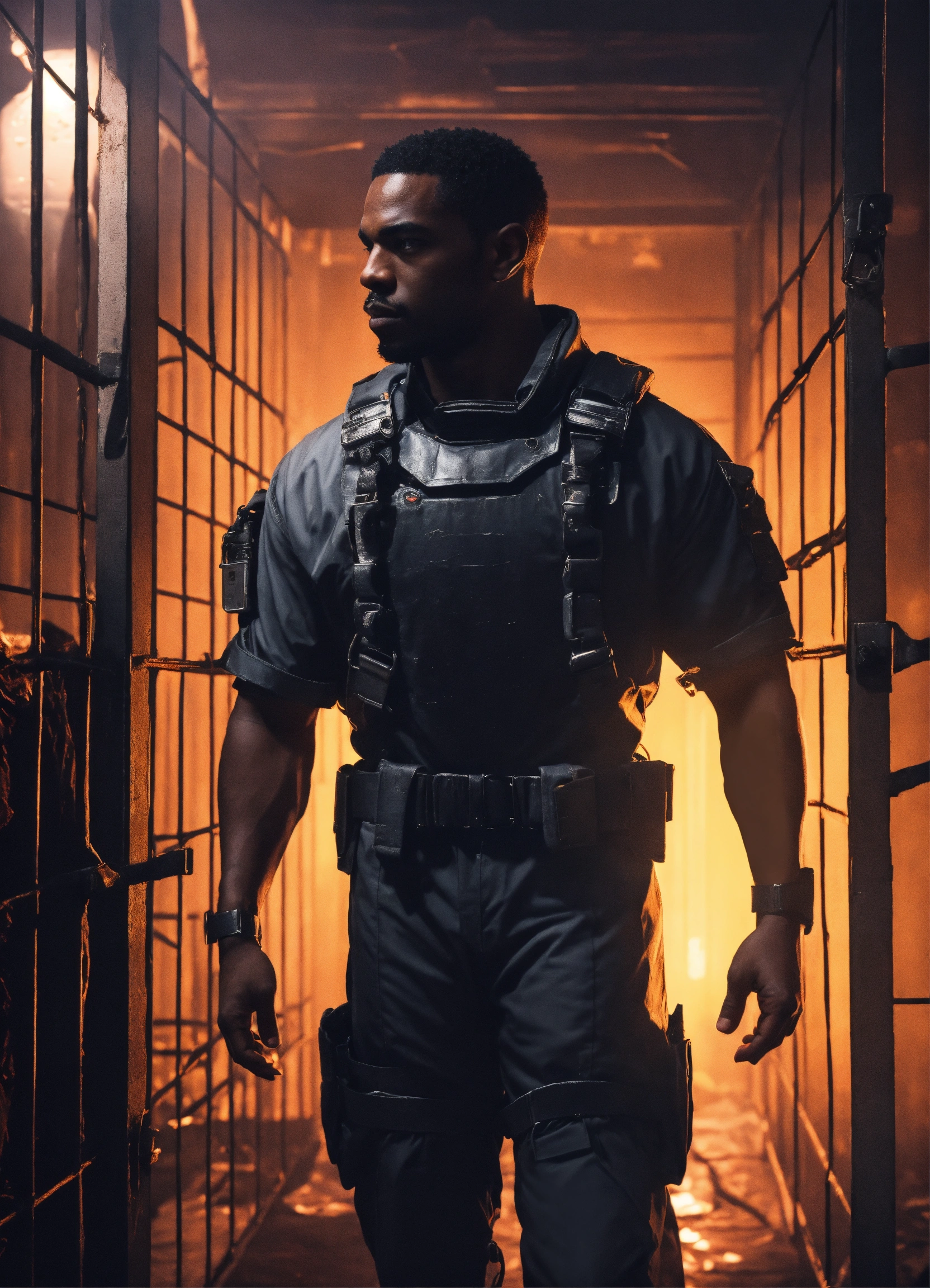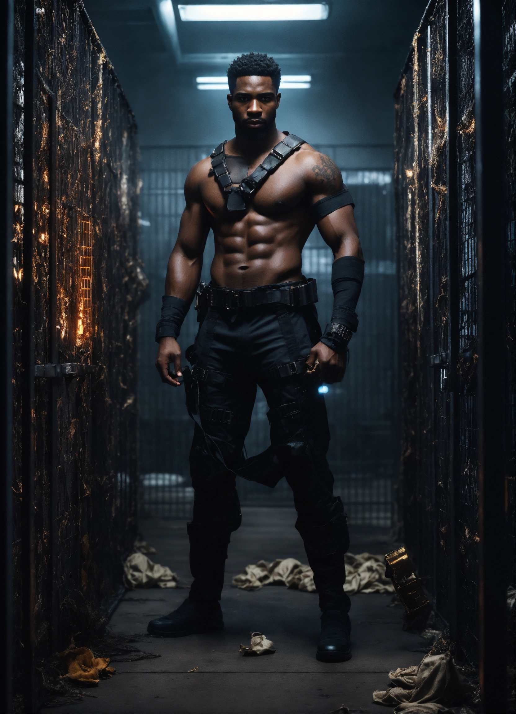 Handcuffed, a handsome black male god, a strong prisoner with short dark hair, wearing the remains of tattered super spy stealth suit, held captive in a spooky dark cell with monstrous guards in the backgroundl, resolution 8k, insanely detailed