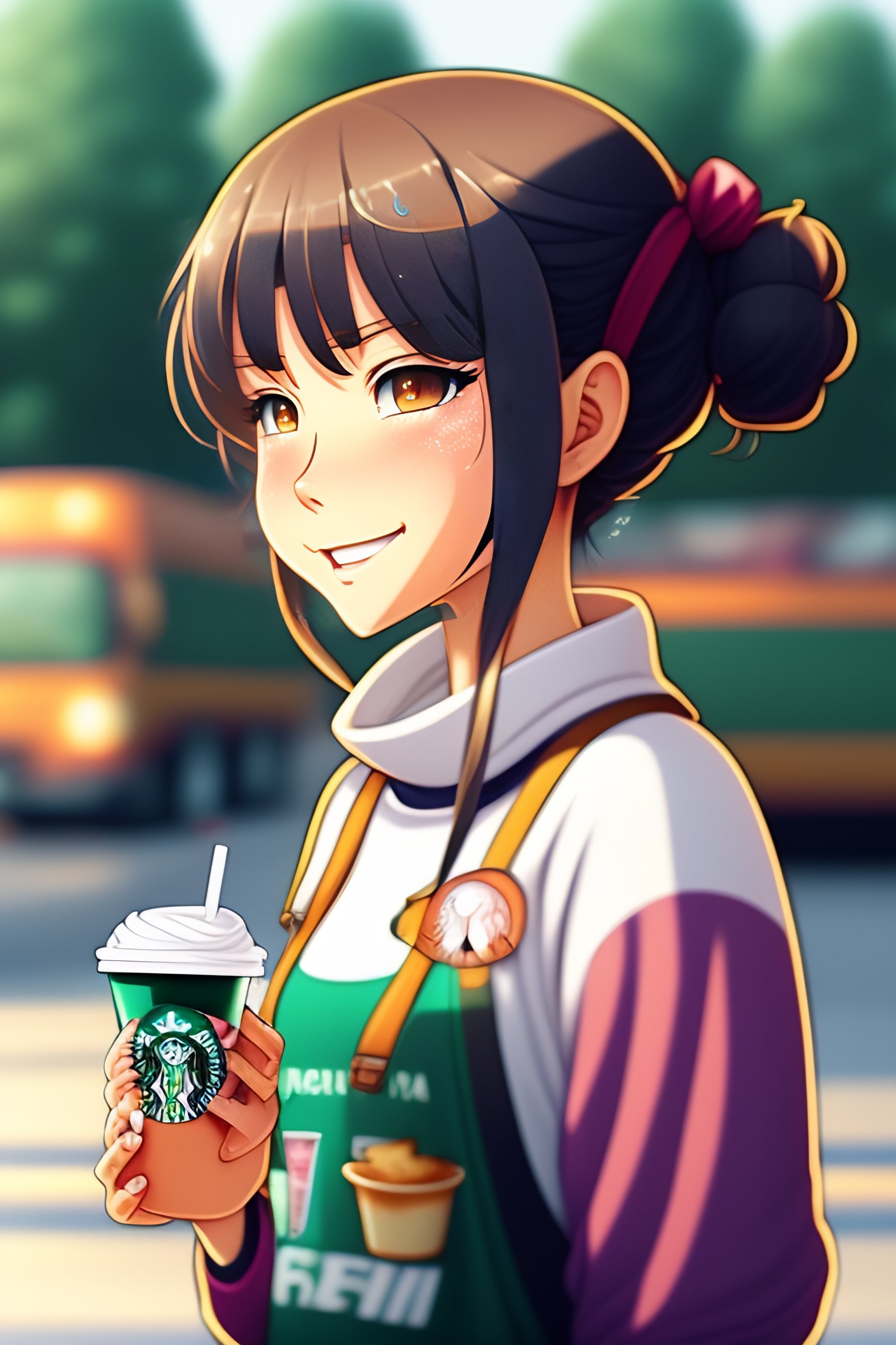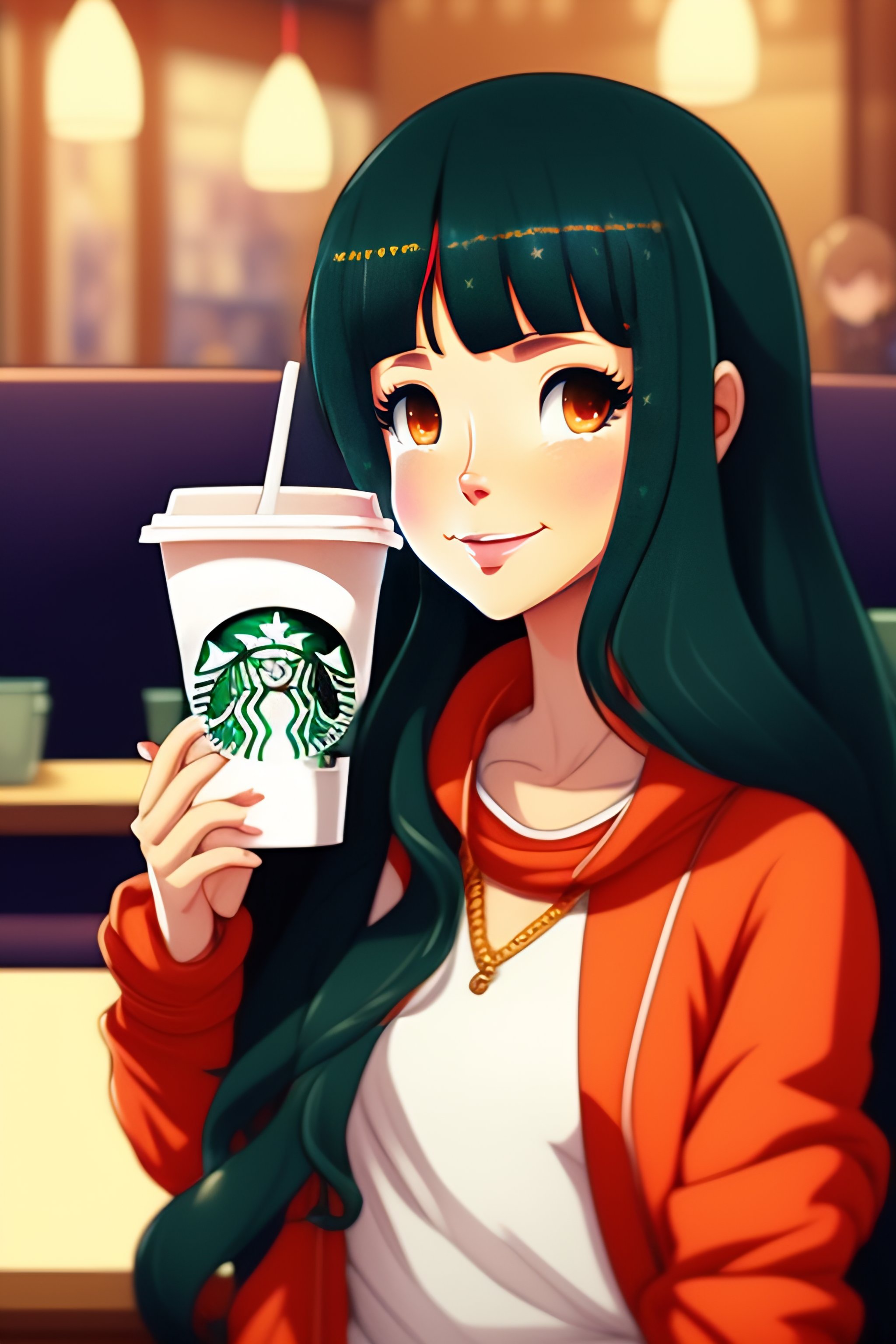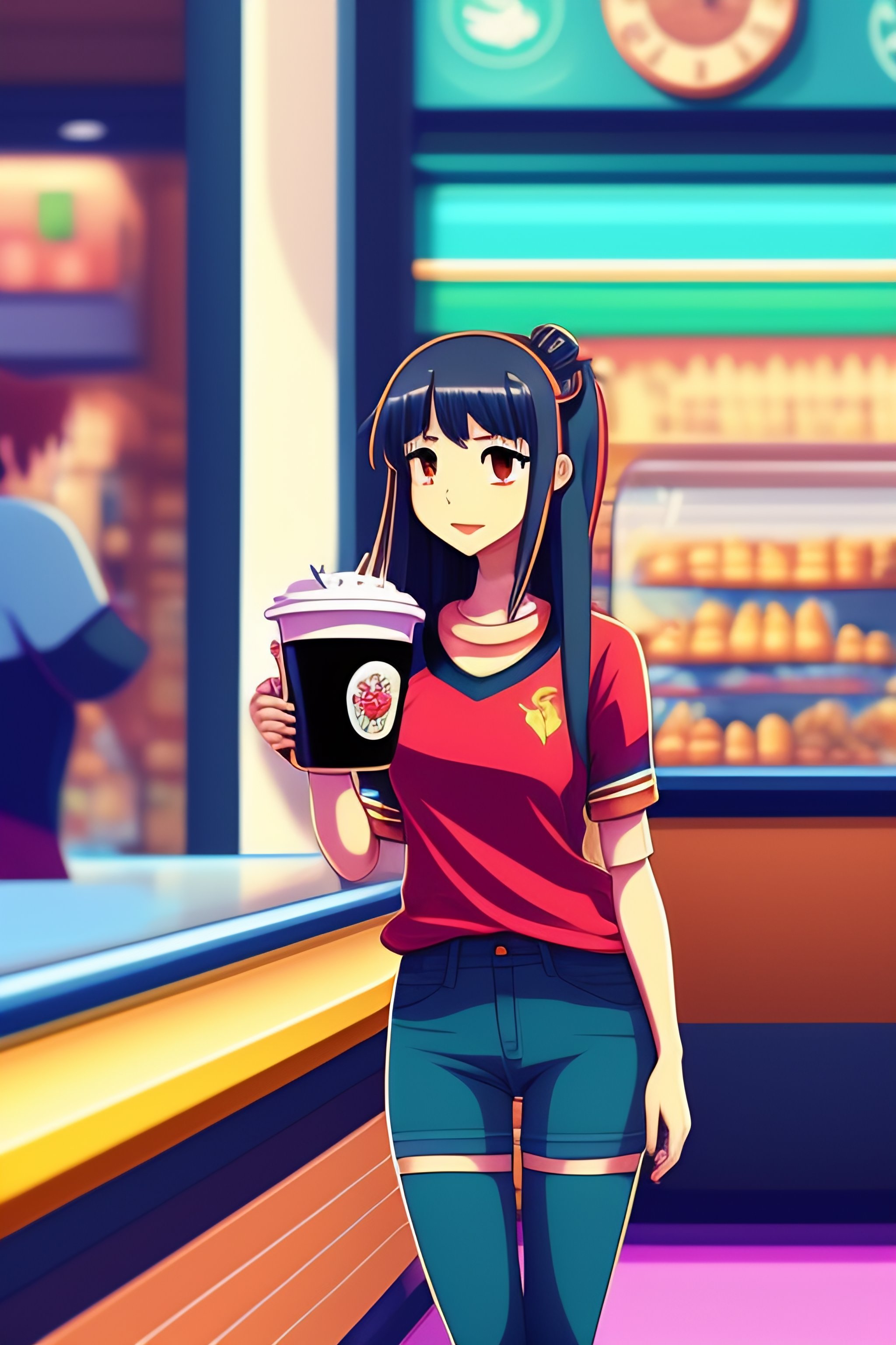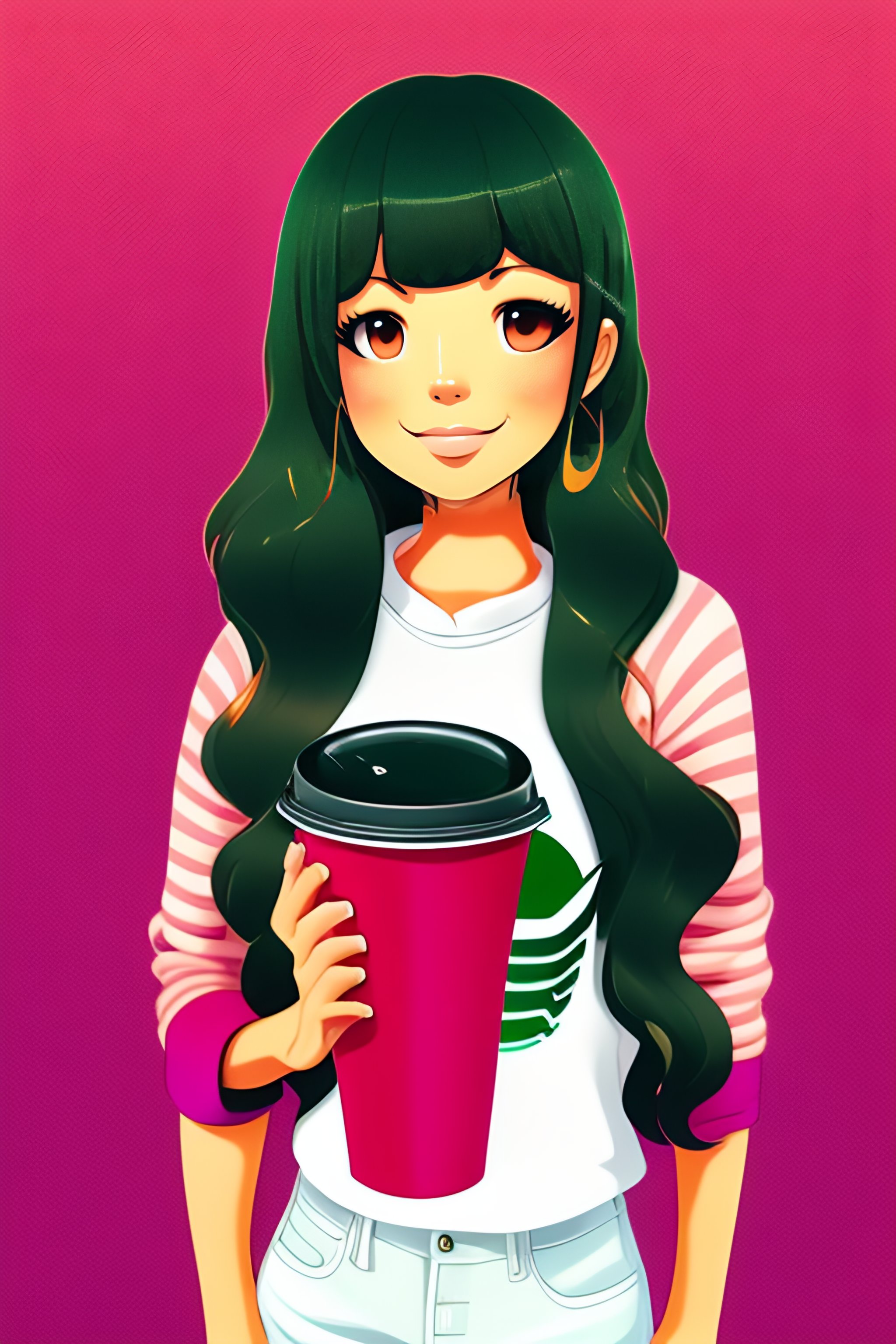 Cartoon of an anime girl in jeans and jumper drinking starbucks