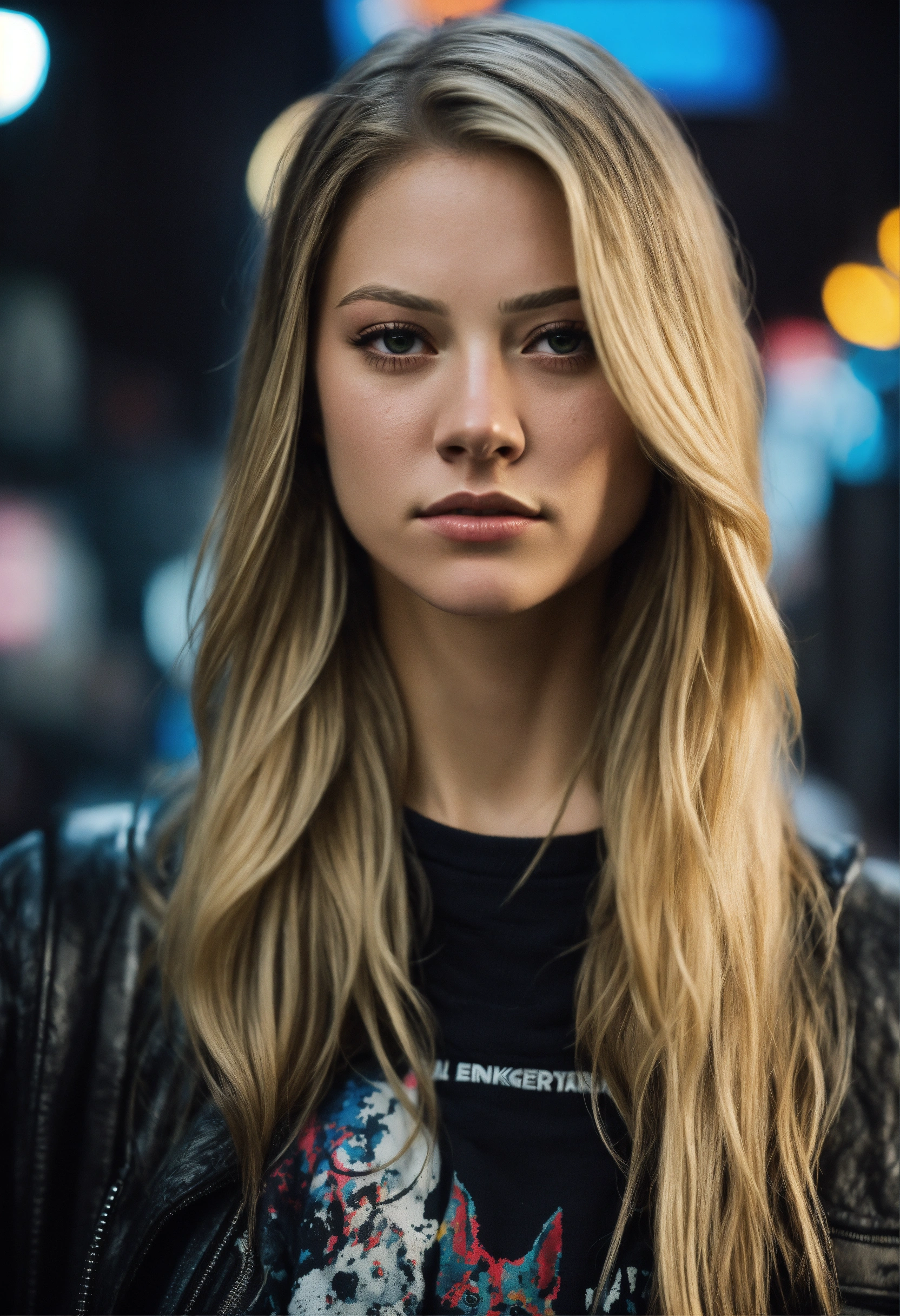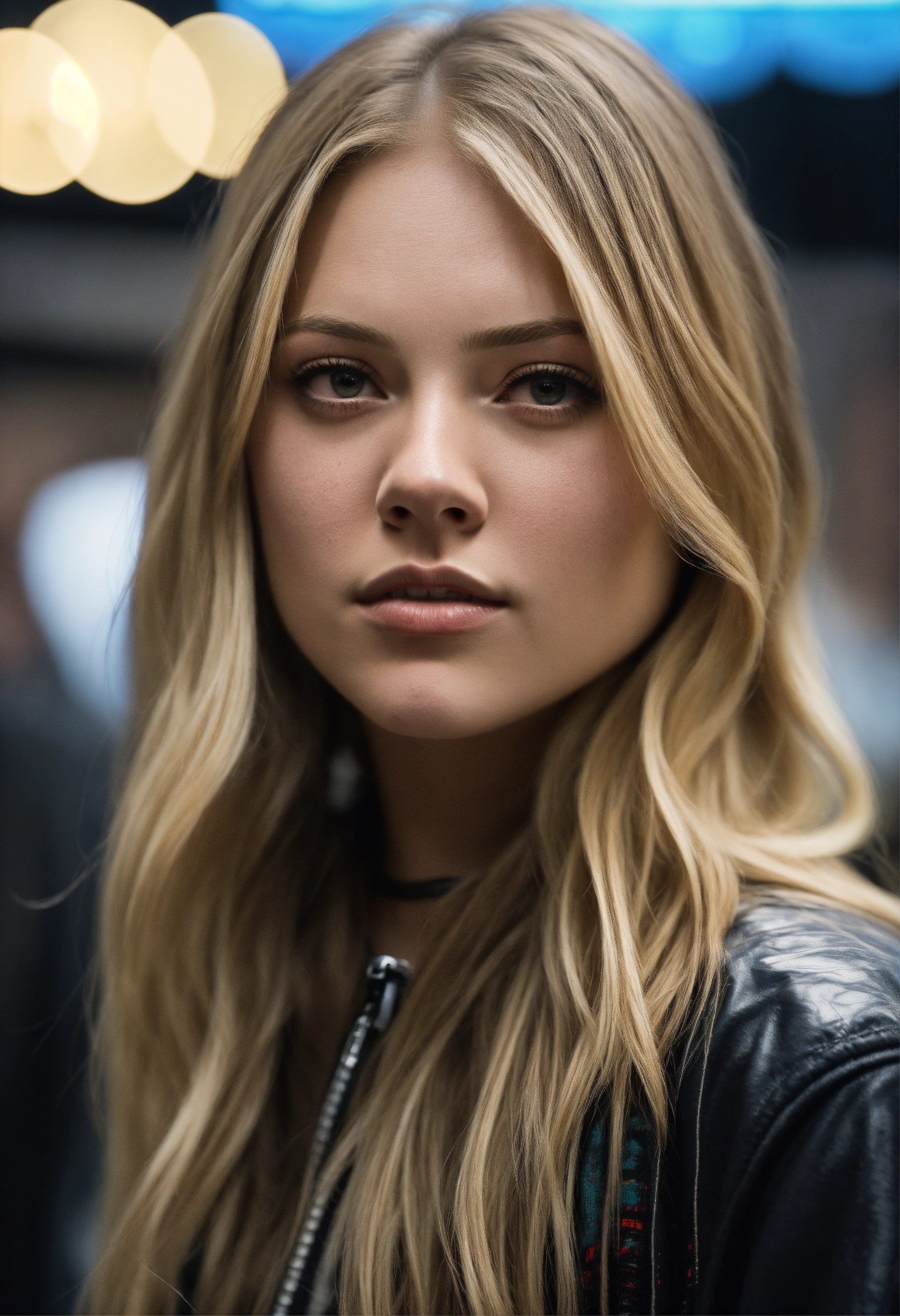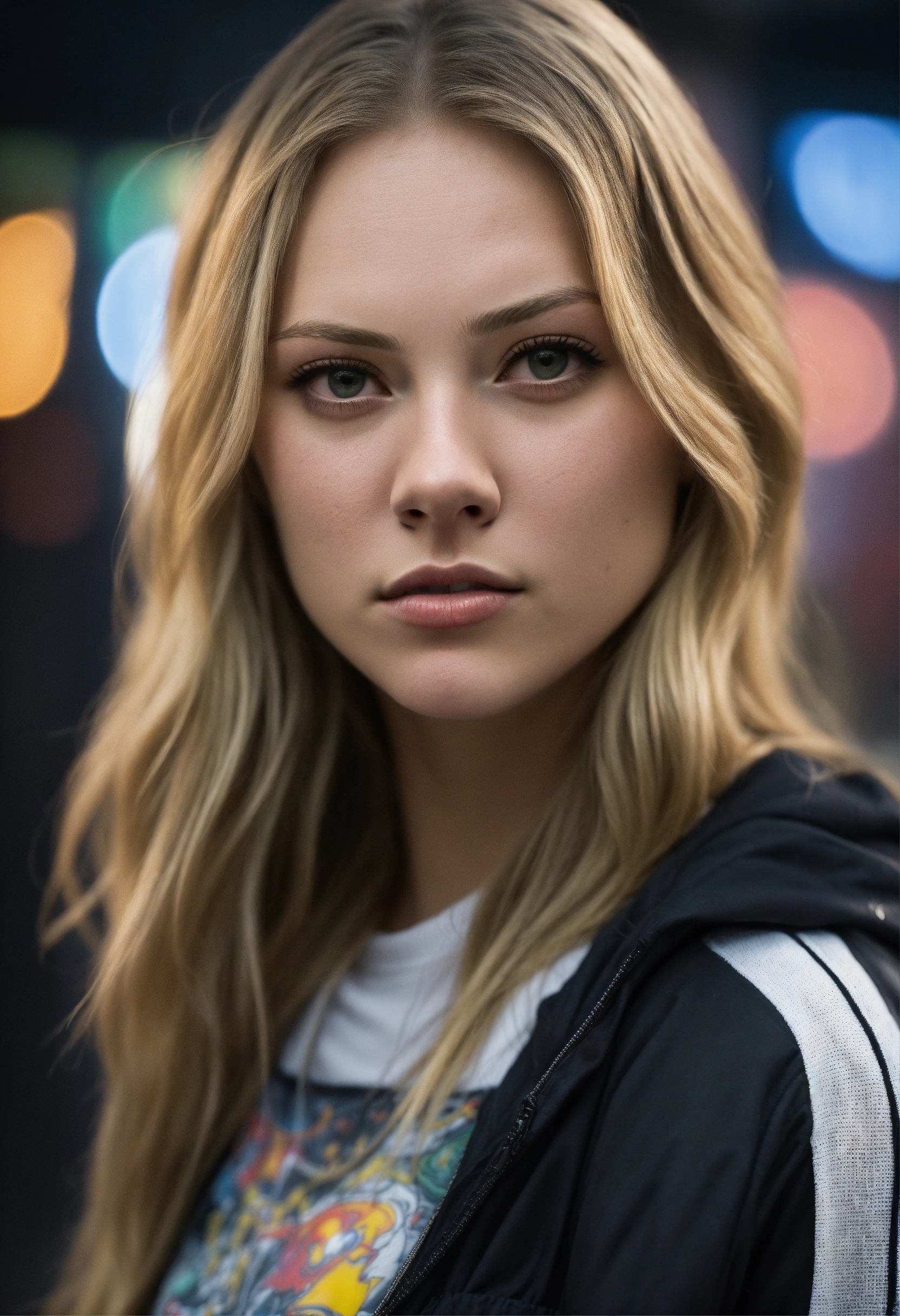 Highly detailed portrait of melissa benoist, long blonde hair, serious face, cyberpunk, wearing black and white streetwear, cartoon realism, black, grunge aesthetic!!! bokeh