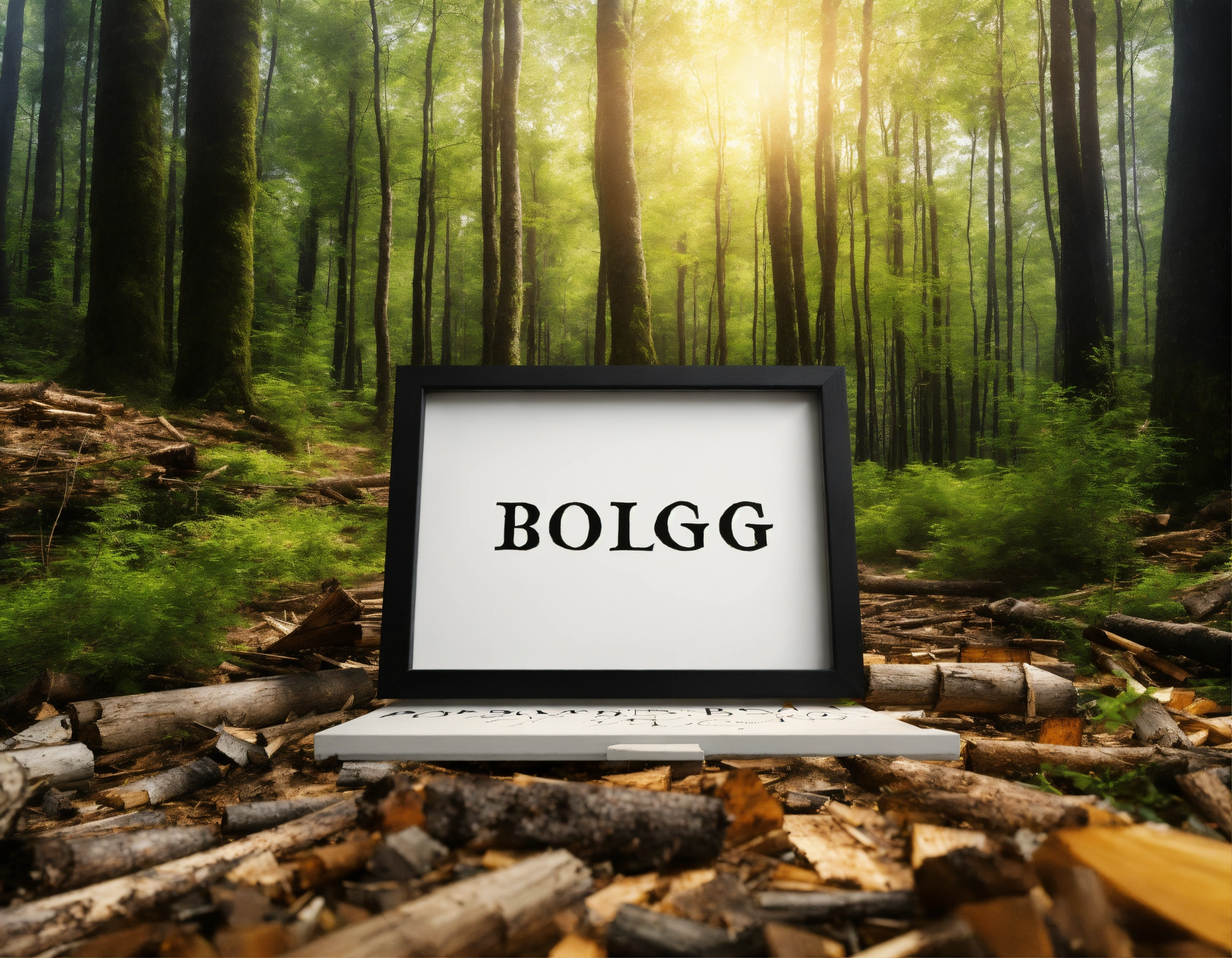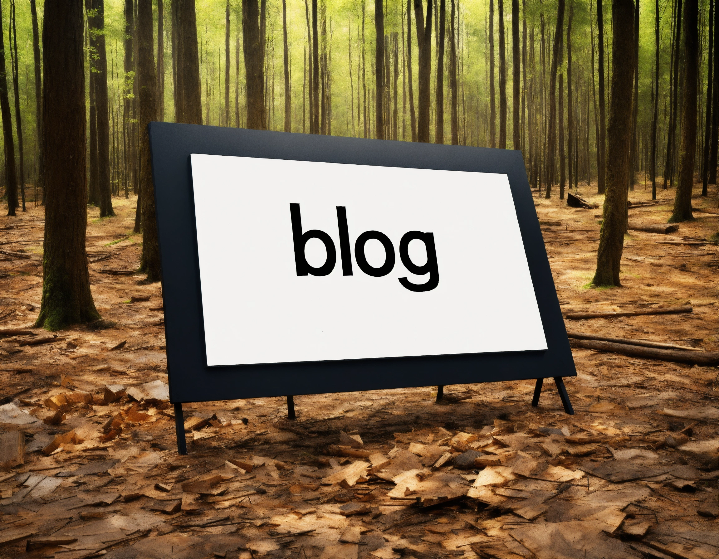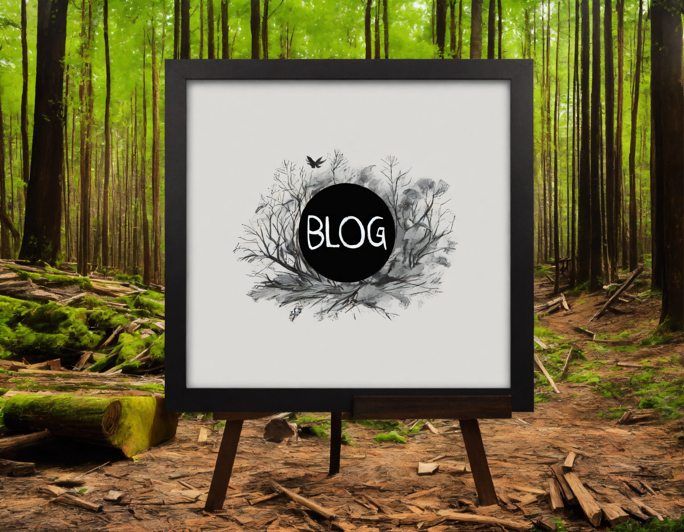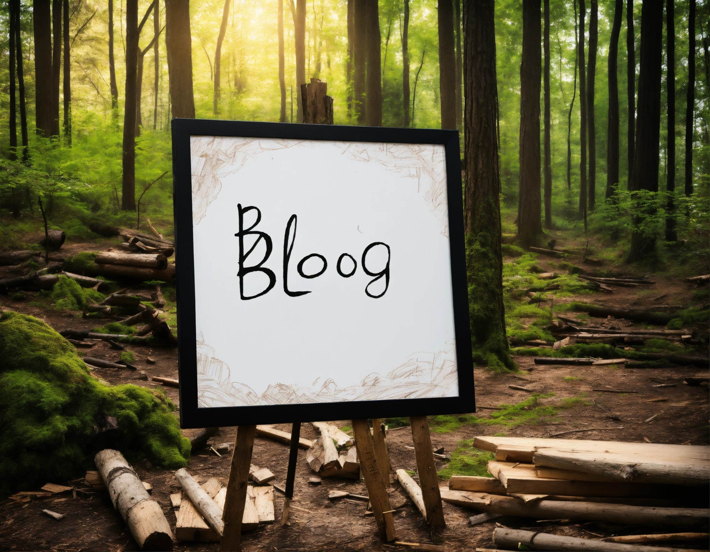 Presentation of a simple white canvas, black frame, "blog" text on canvas, in a forest, pile of wood on the ground, recycled products, non-realistic style, synthetic imagery, wood, sketch, pencil strokes, fantasy