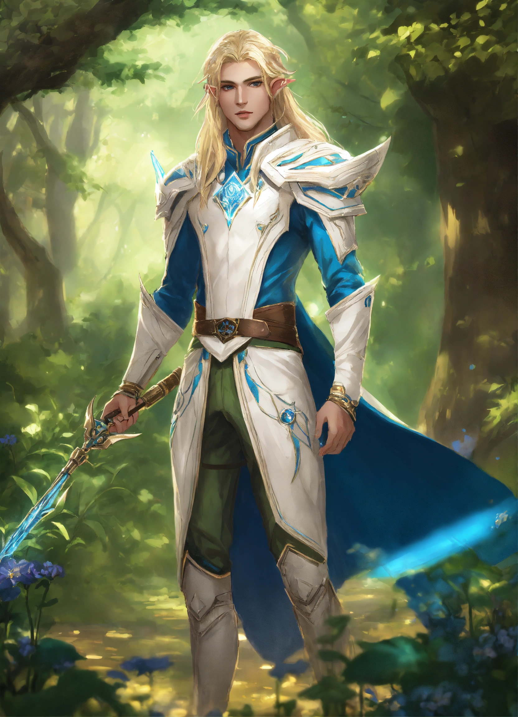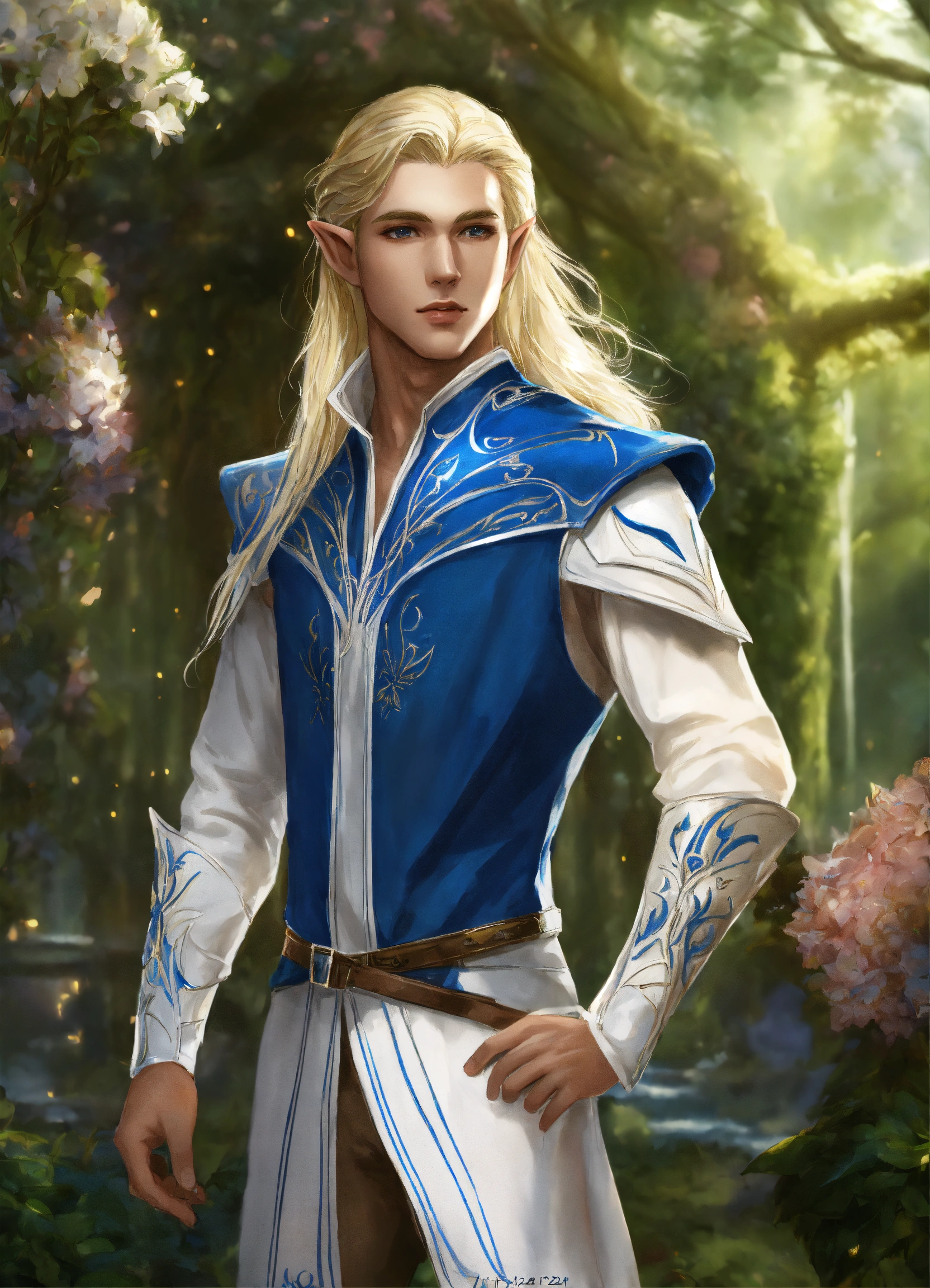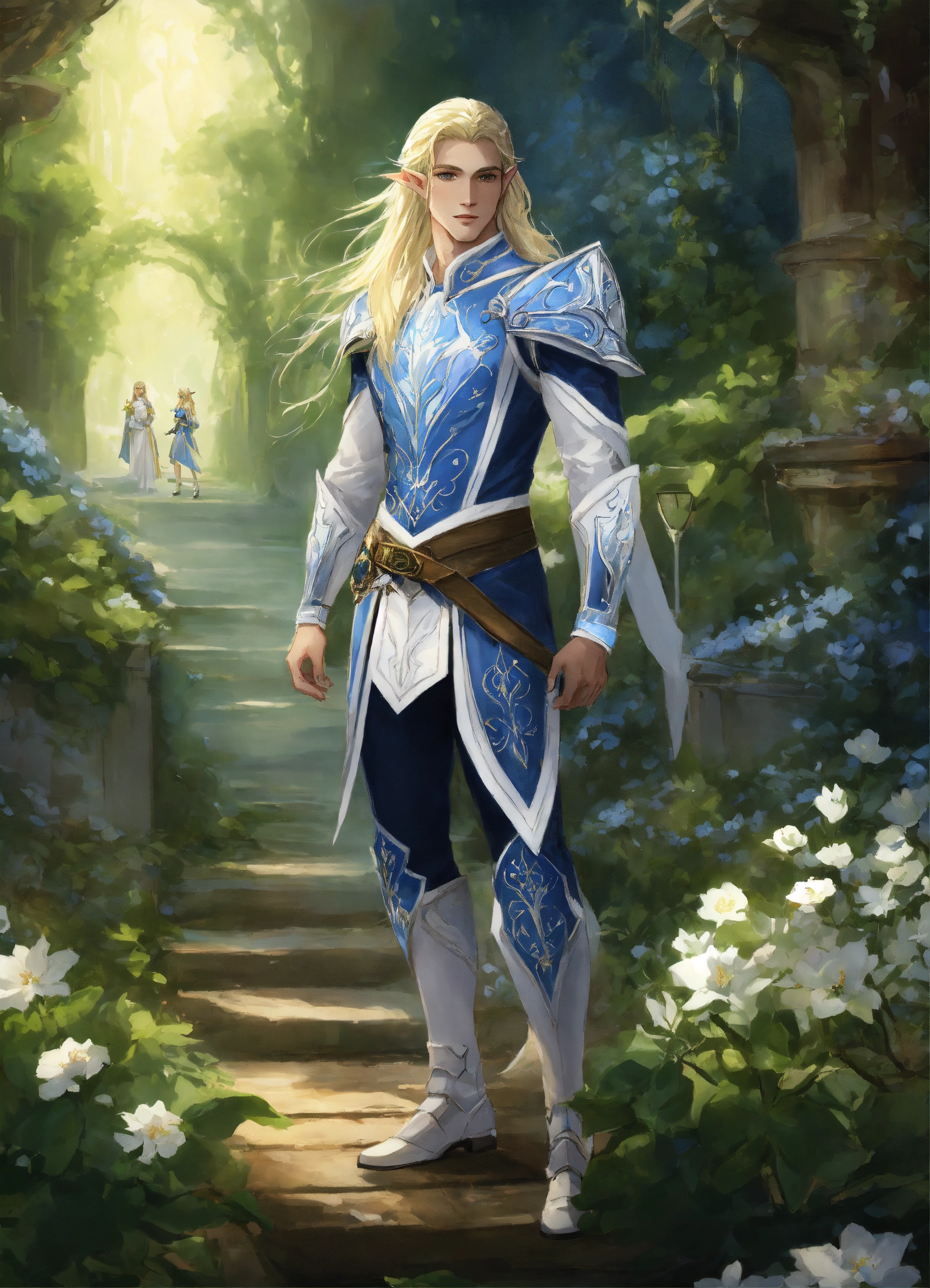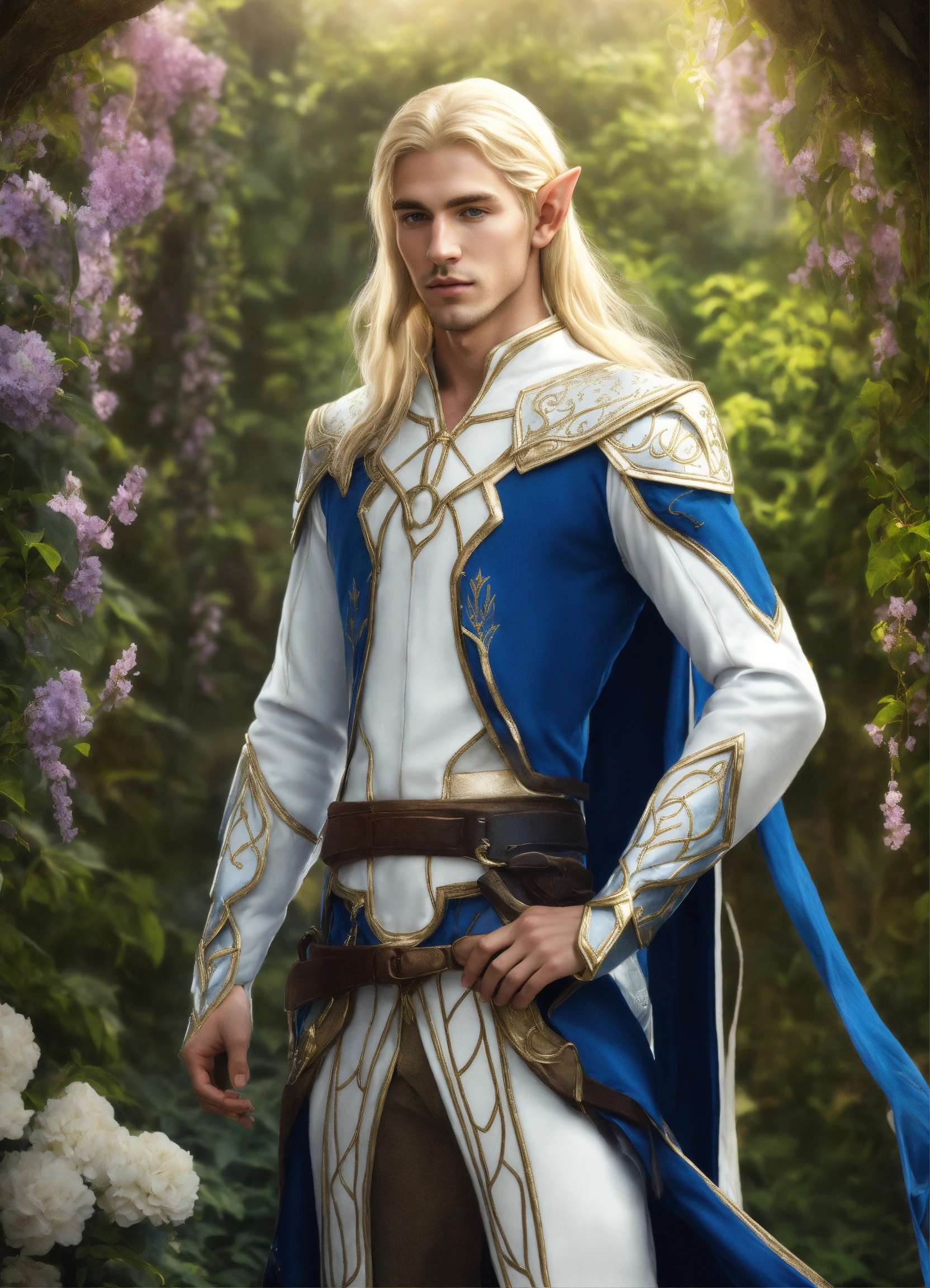 Drawing of an elf, royalty, sci fi, cybernetic, white and blue sci fi outfit, long blonde hair, standing in an elegant elven garden, handsome, male high elf, 22 years old, full body