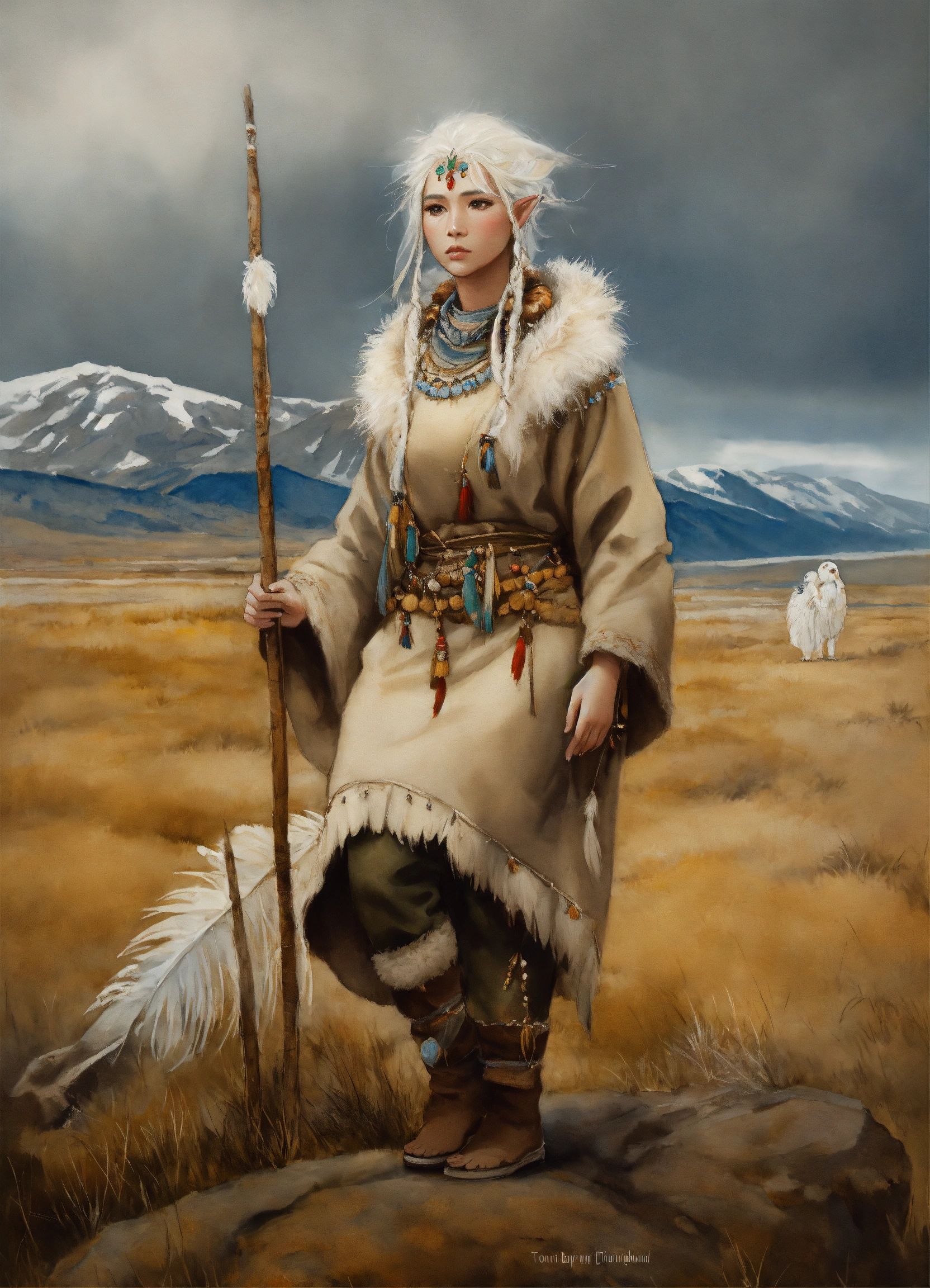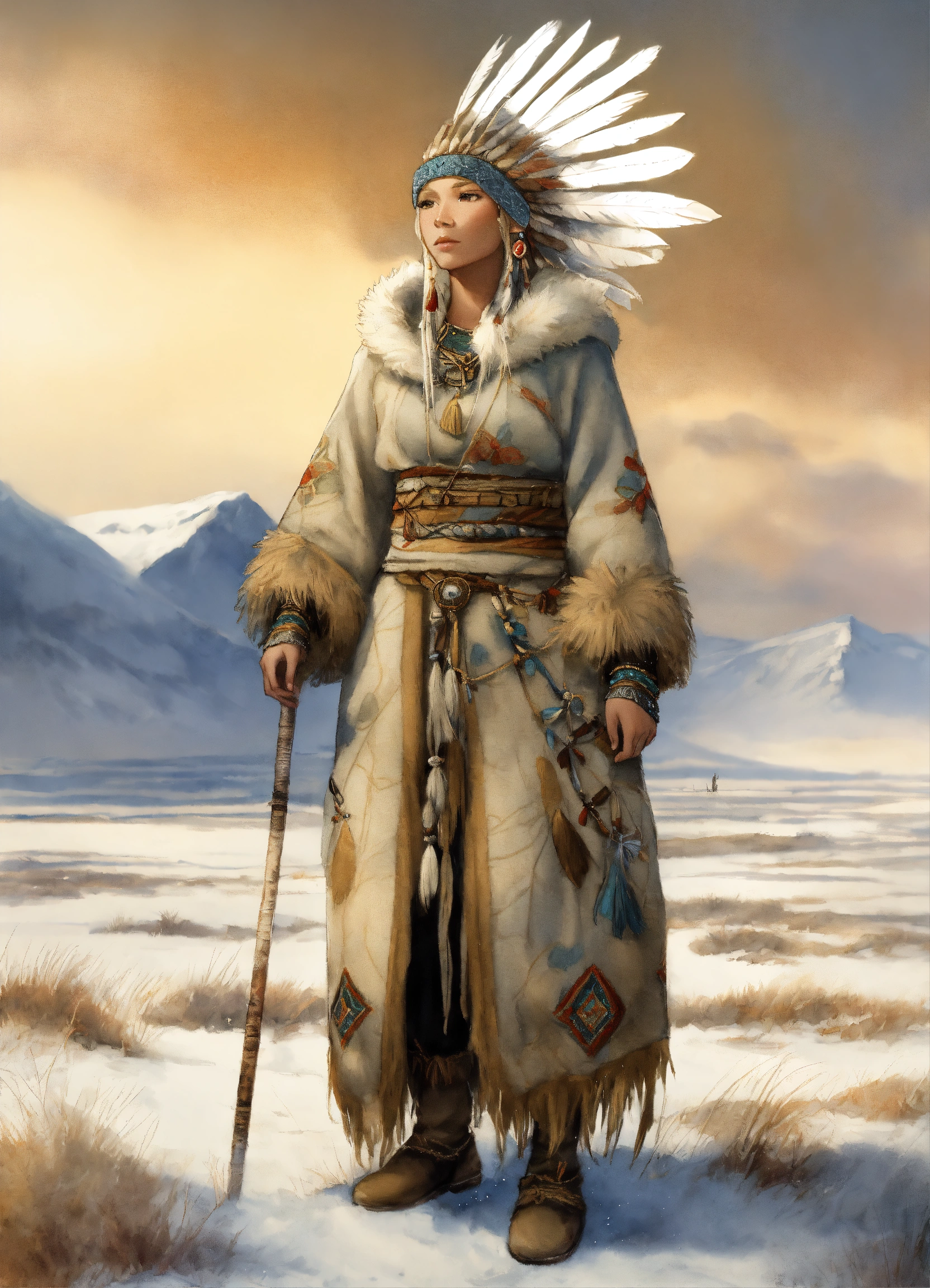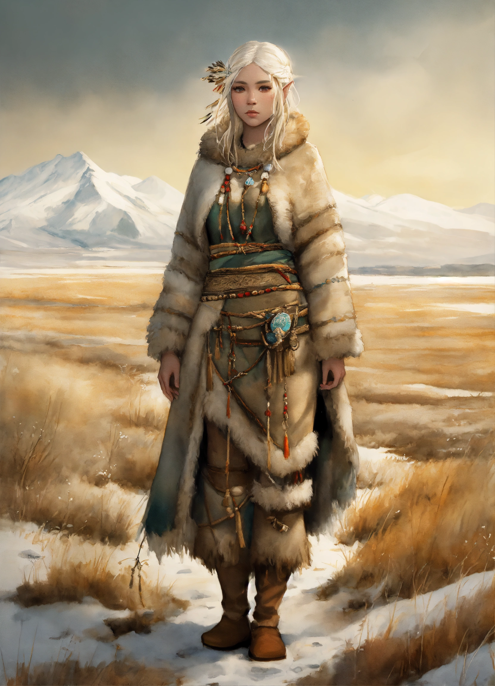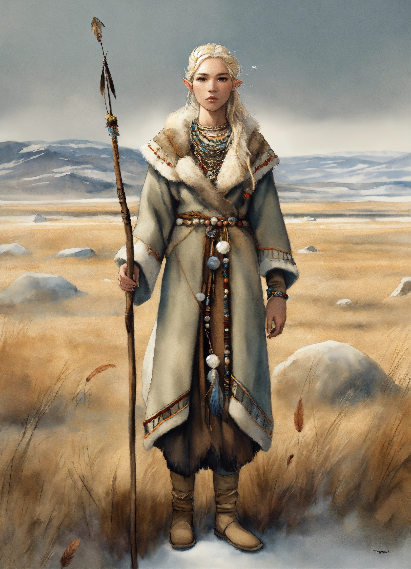 Full body illustration of an elf inuit woman, beautiful, native american phenotype with blonde hair and albino skin, wearing stone age warm clothing made from natural fabrics like linen, cotton, or furs, adorned with feathers, beads and shells, standing on the steppe tundra landscape, watercolors, gloomy and depressing ambient, artwork by tom björklund, detailed face, detailed skin, highest detail quality