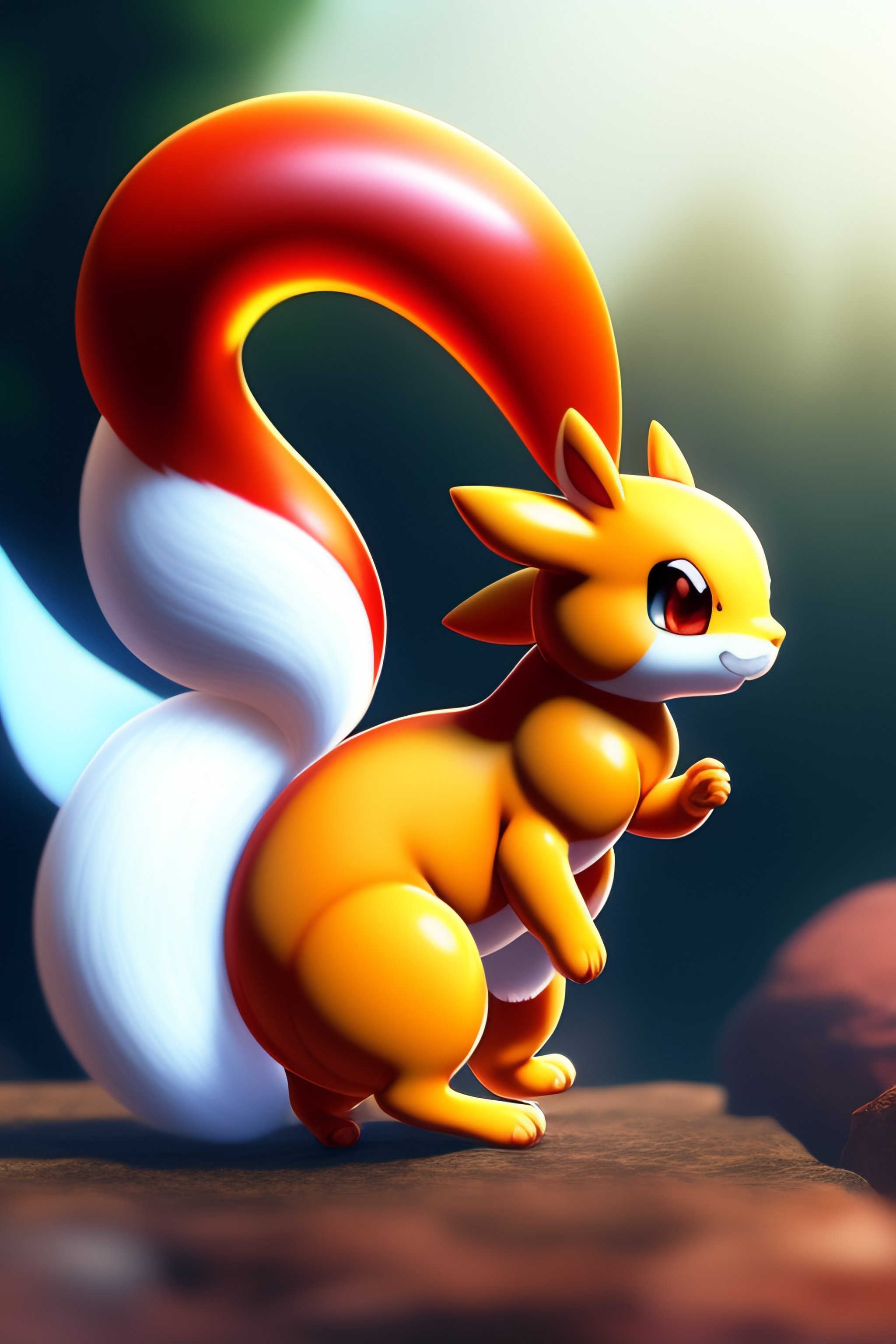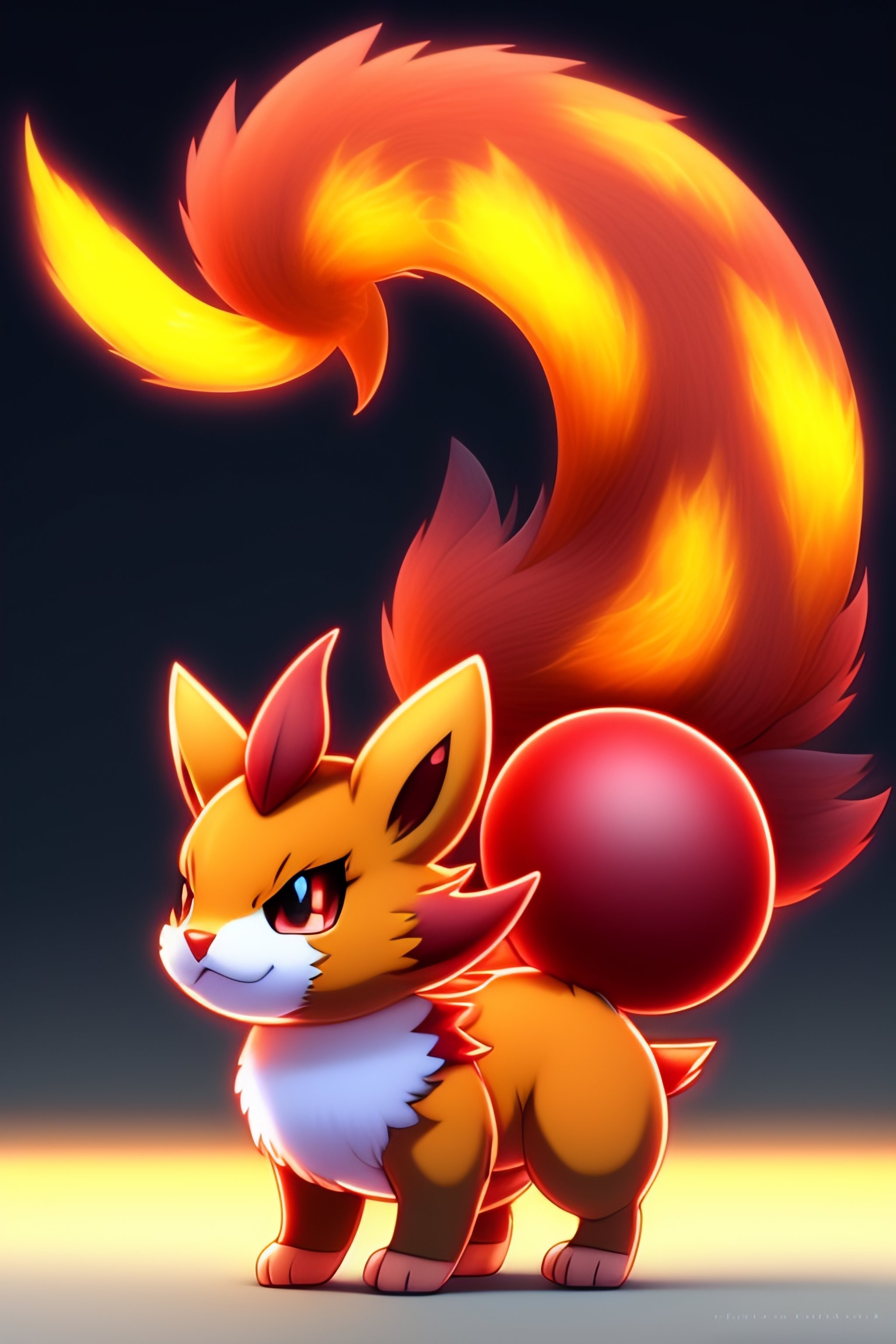 A cute fire type pokémon that resembles a four legged egg with a cloudy tail, in the style of pokémon award winning manga