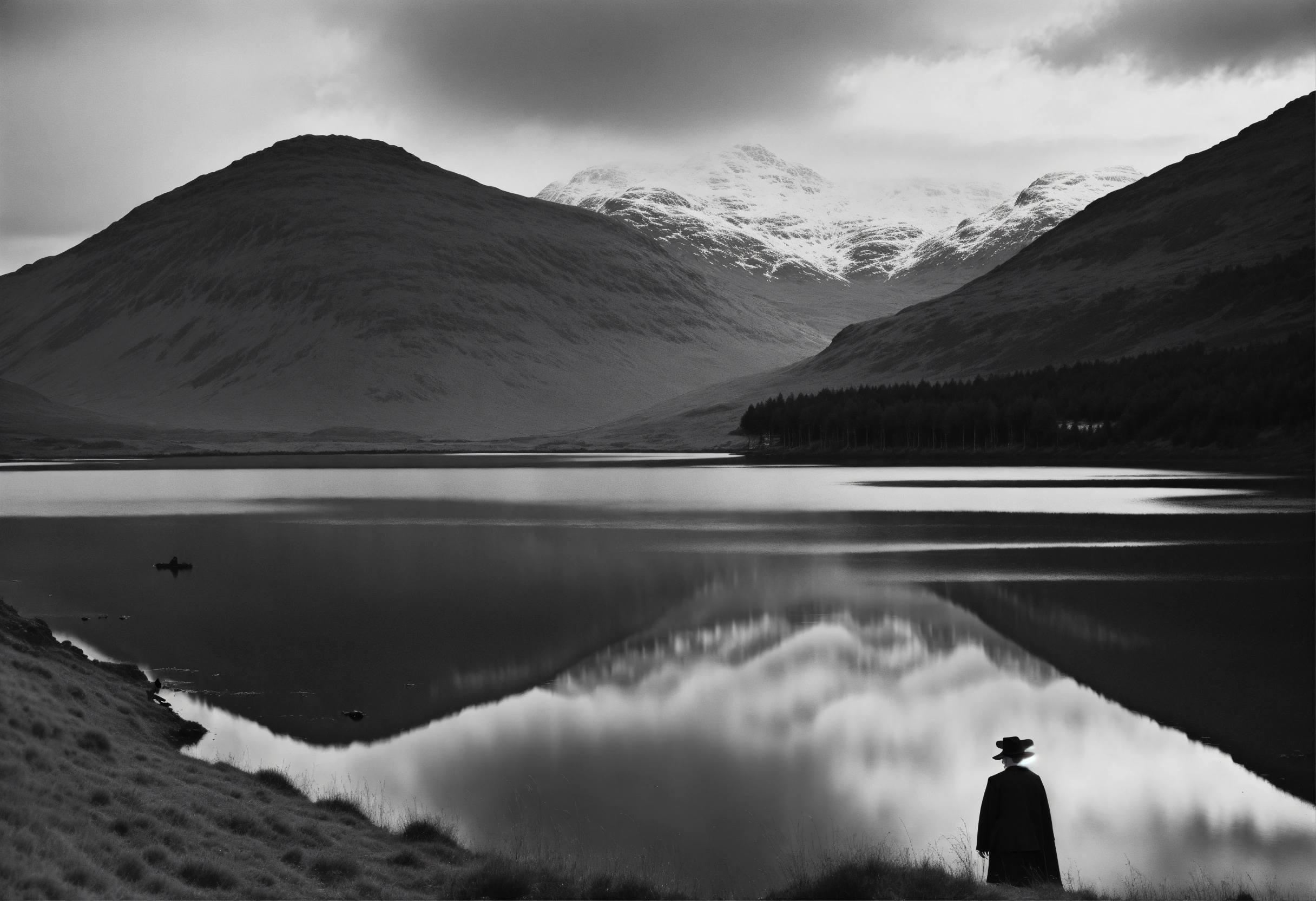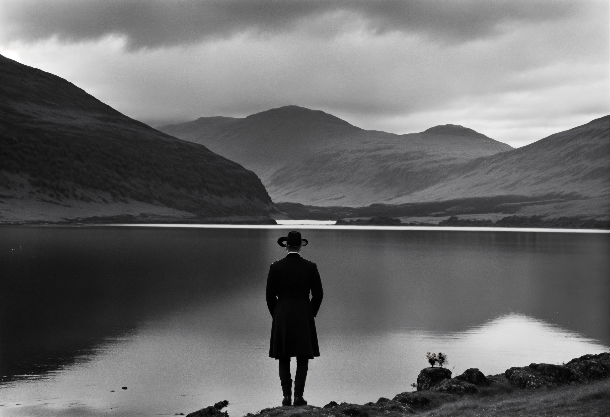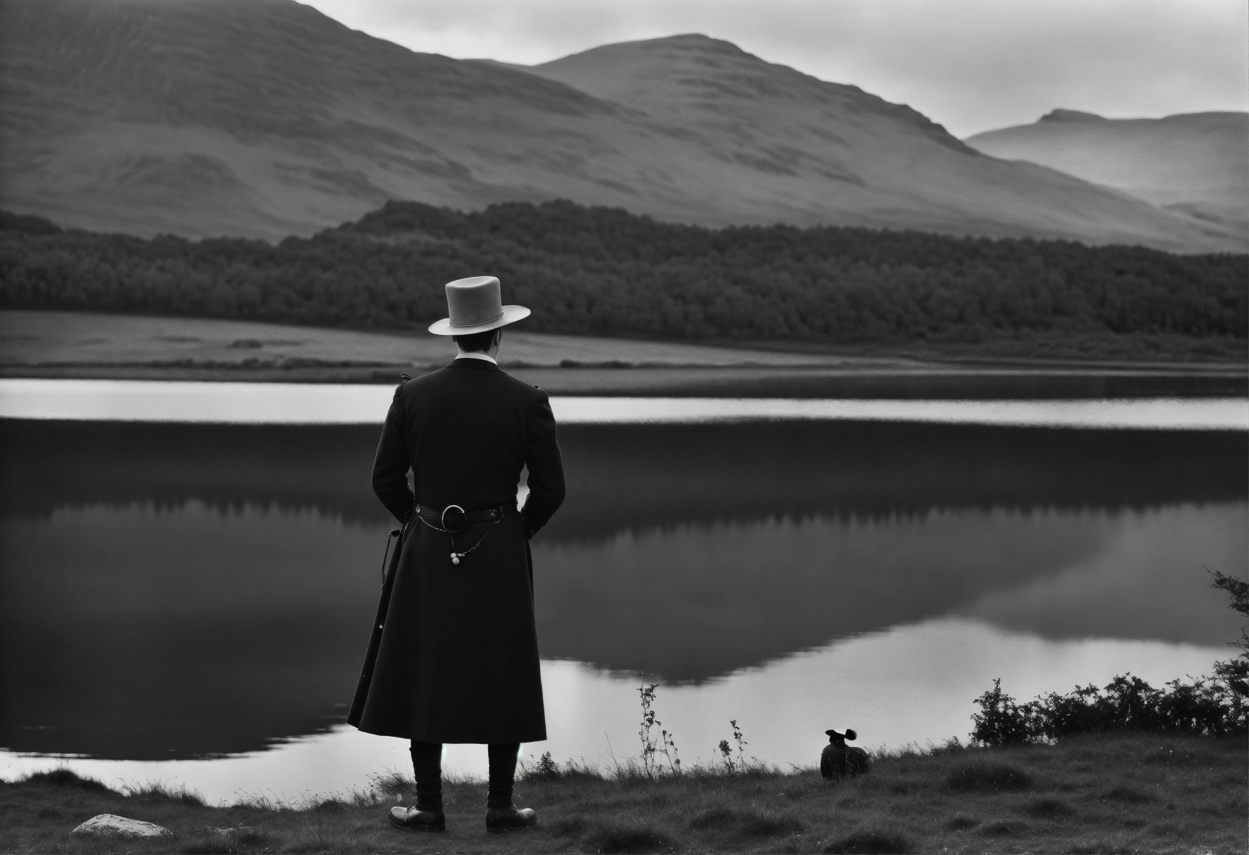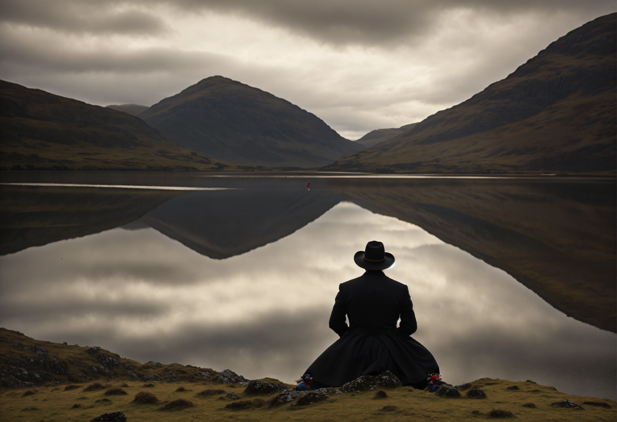 An extra wide shot, scottish highlands, male clown wearing black, facing a loch, wearing a western hat by brassai