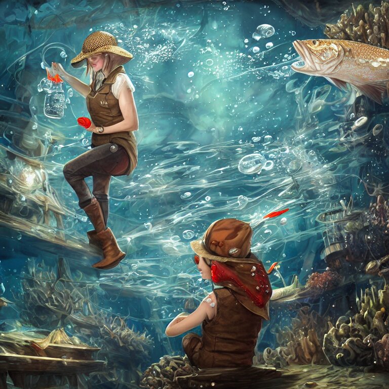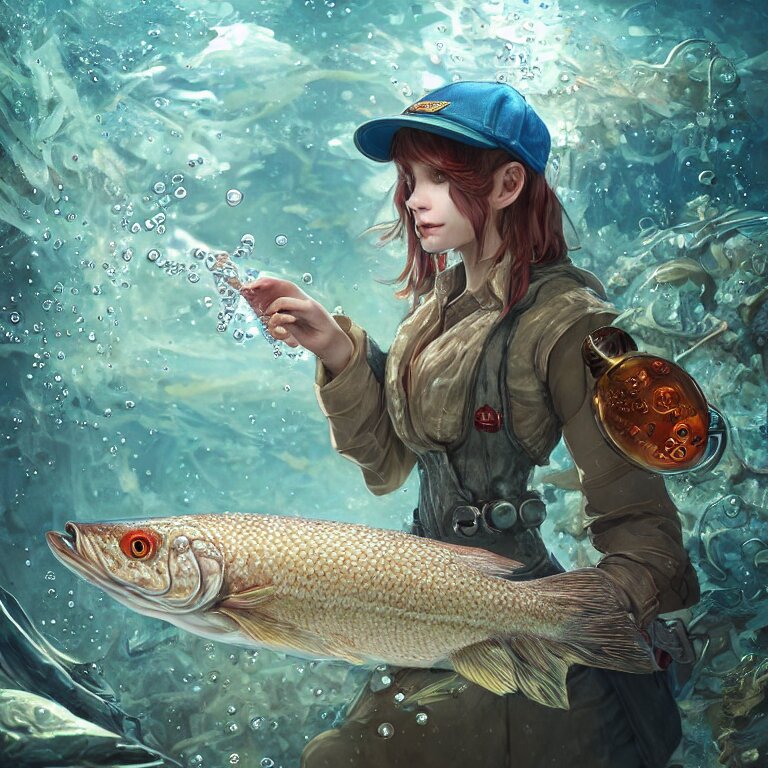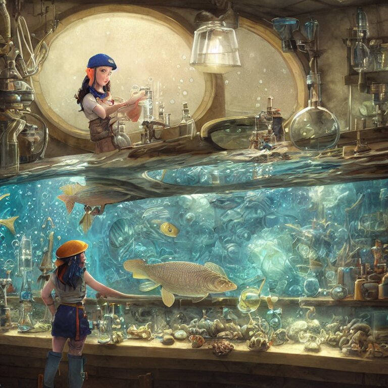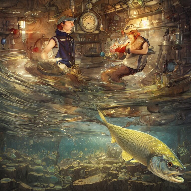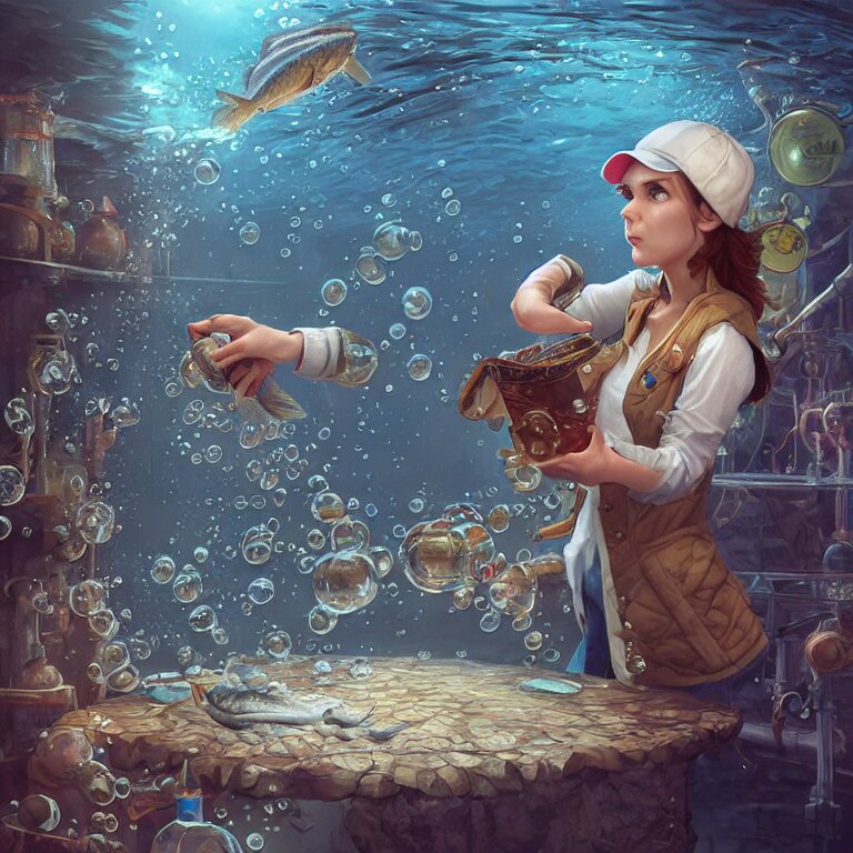 A pike fish wearing flat cap and gilet in an underwater alchemical laboratory. digital illustration. fantasy. detailed. waterbubbles. by artgerm, wlop, james jean, andrei riabovitchev, marc simonetti, yoshitaka amano