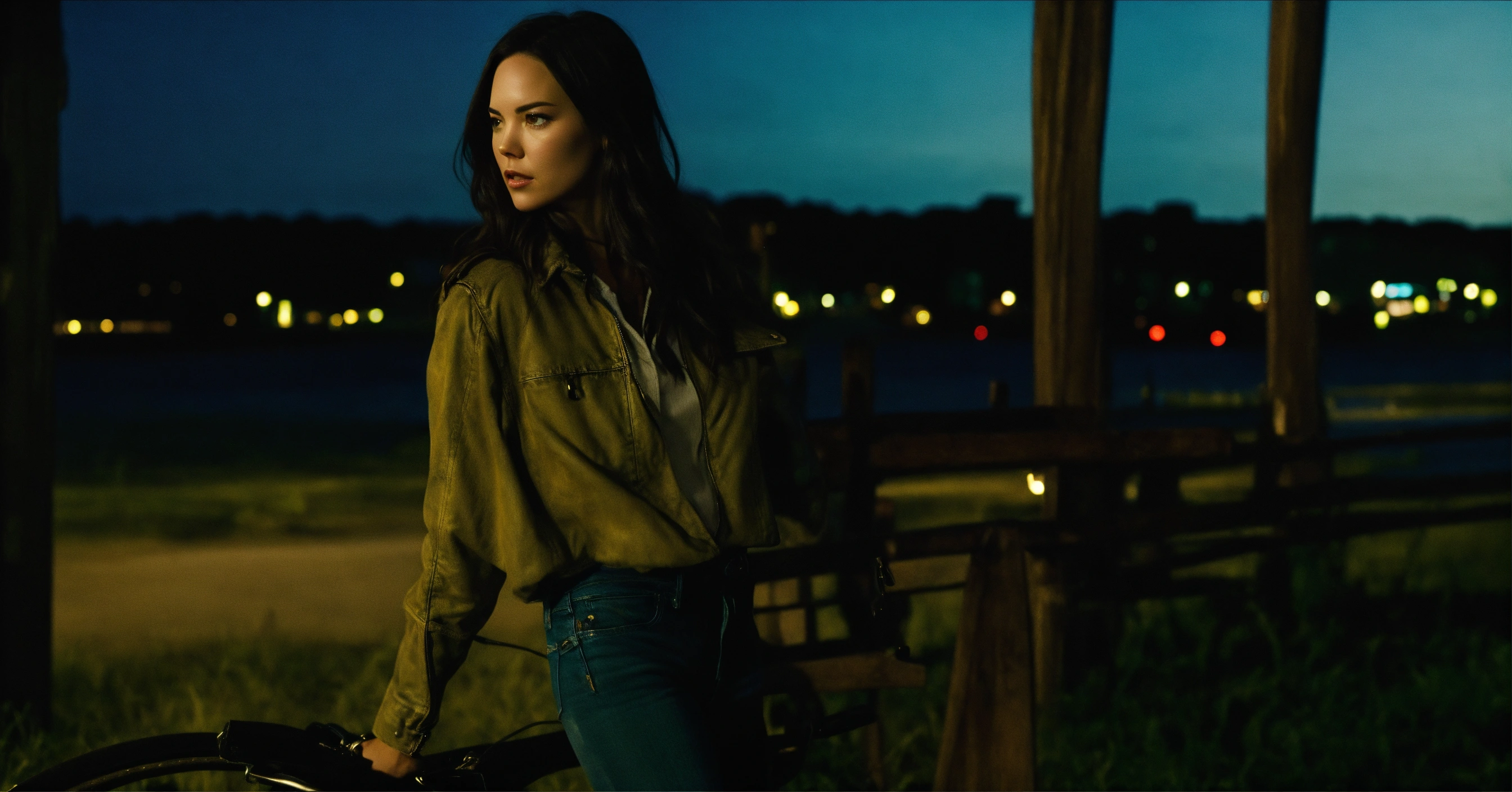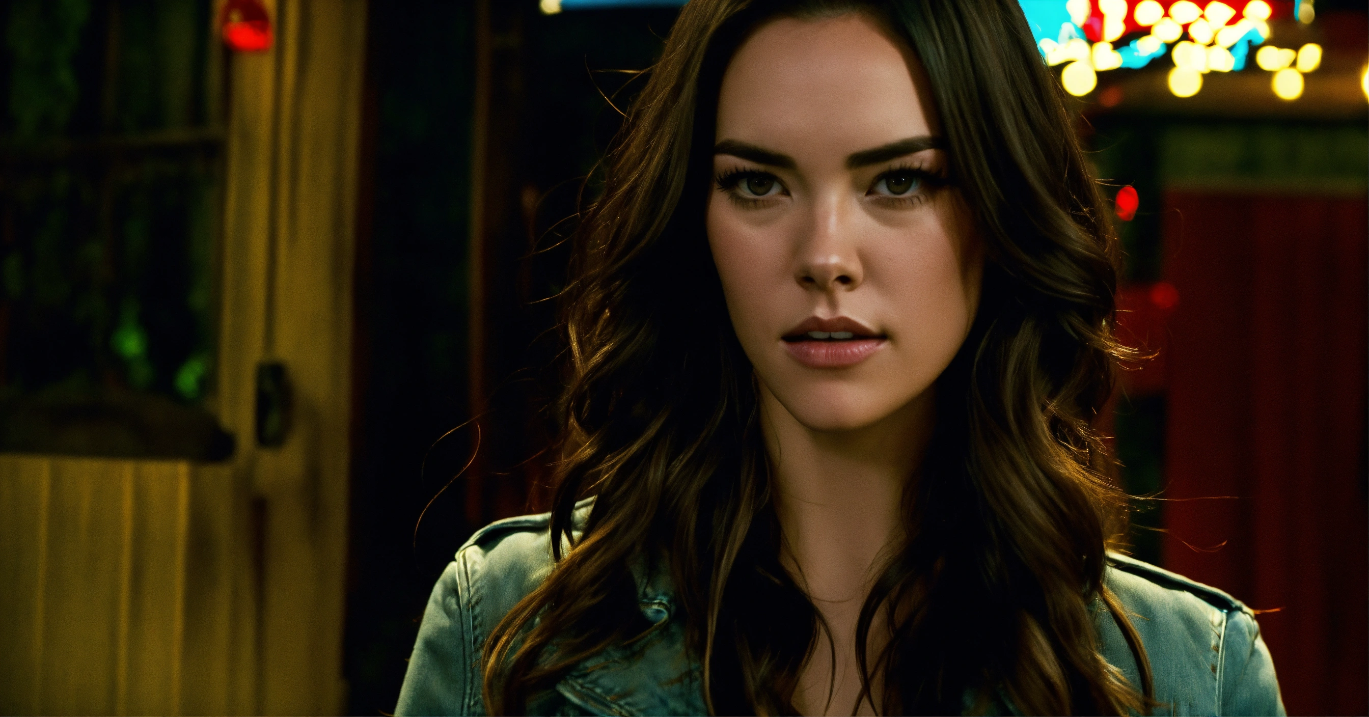 Beautiful cute 25 years old odette annable, big fox eyes, long dark hair, eyelashes, walks in a psychological thriller style. serial killer hunt, cinematic, night chicago, jeans, biker boots, dangerous situation, suspense, cinematic