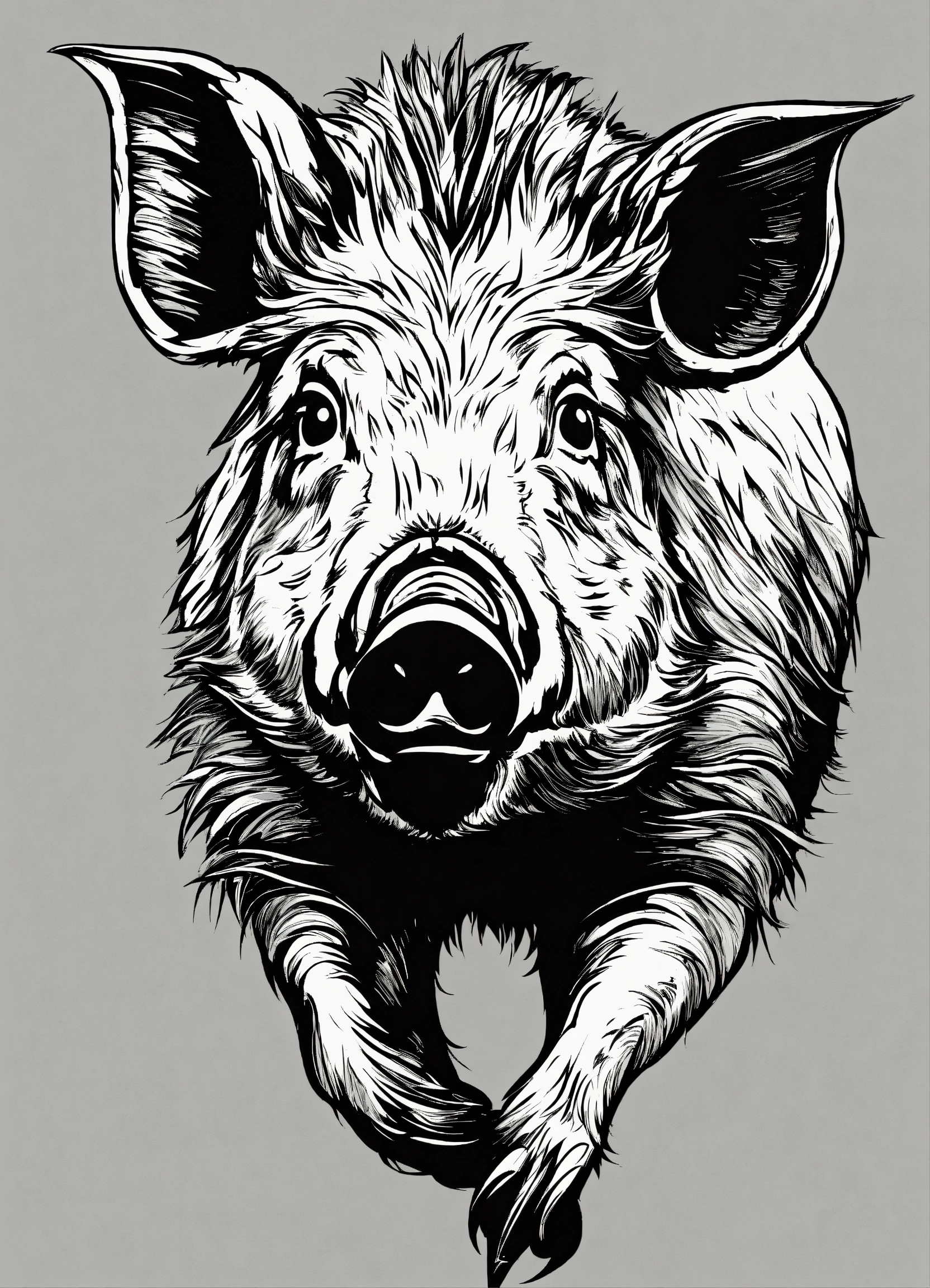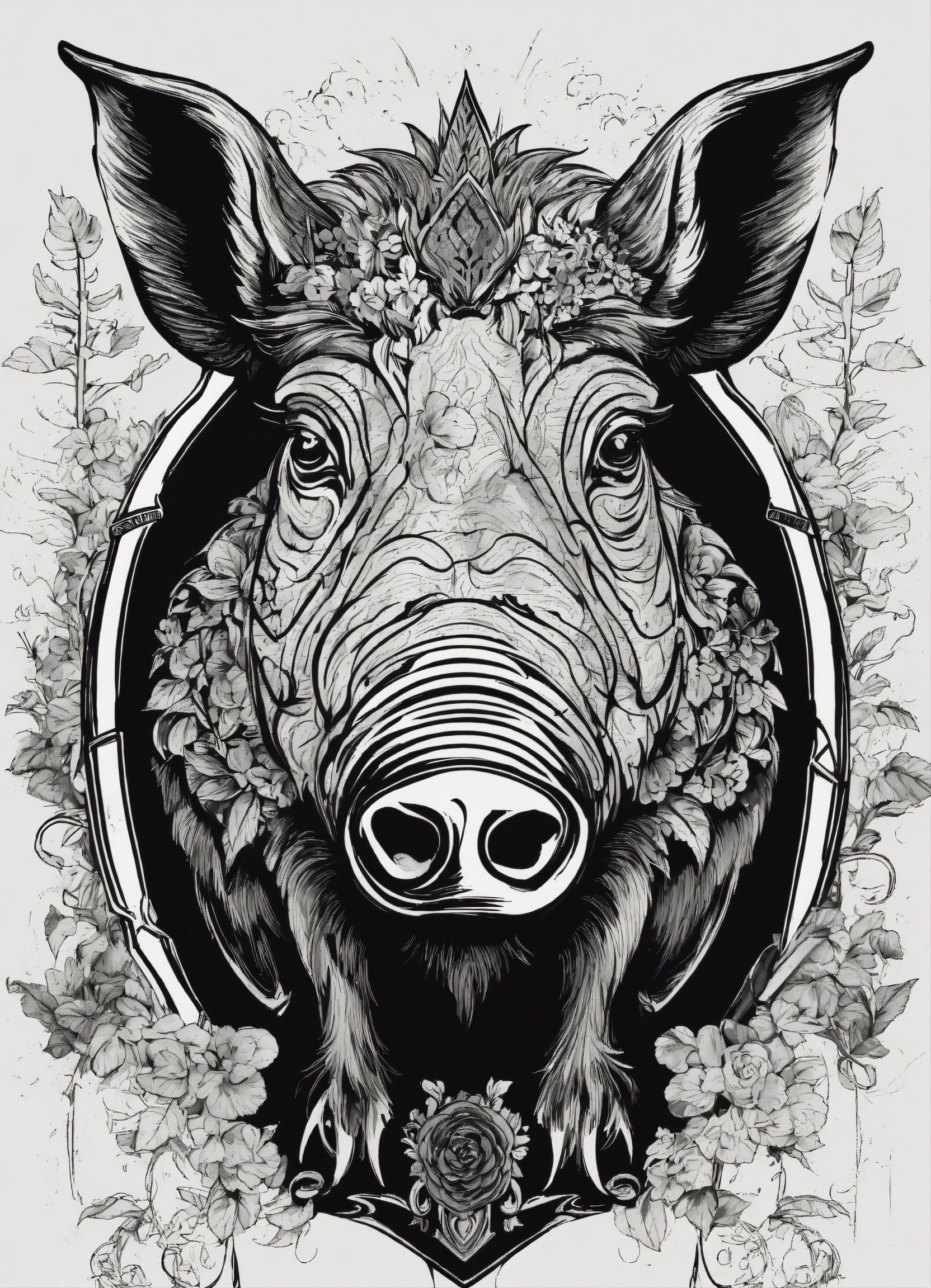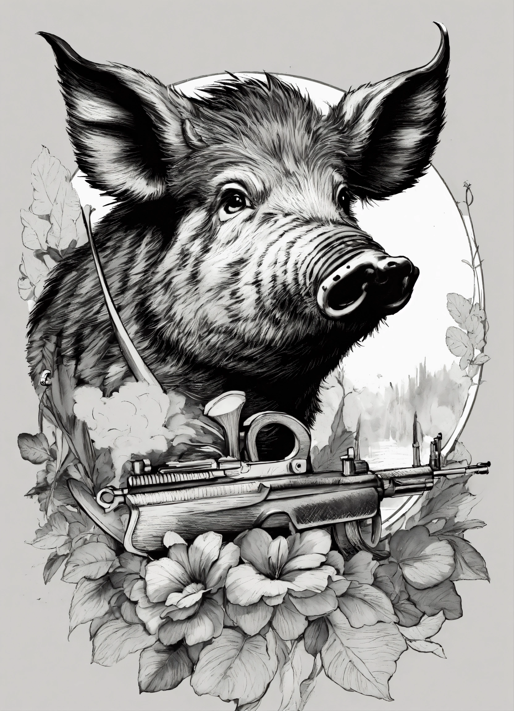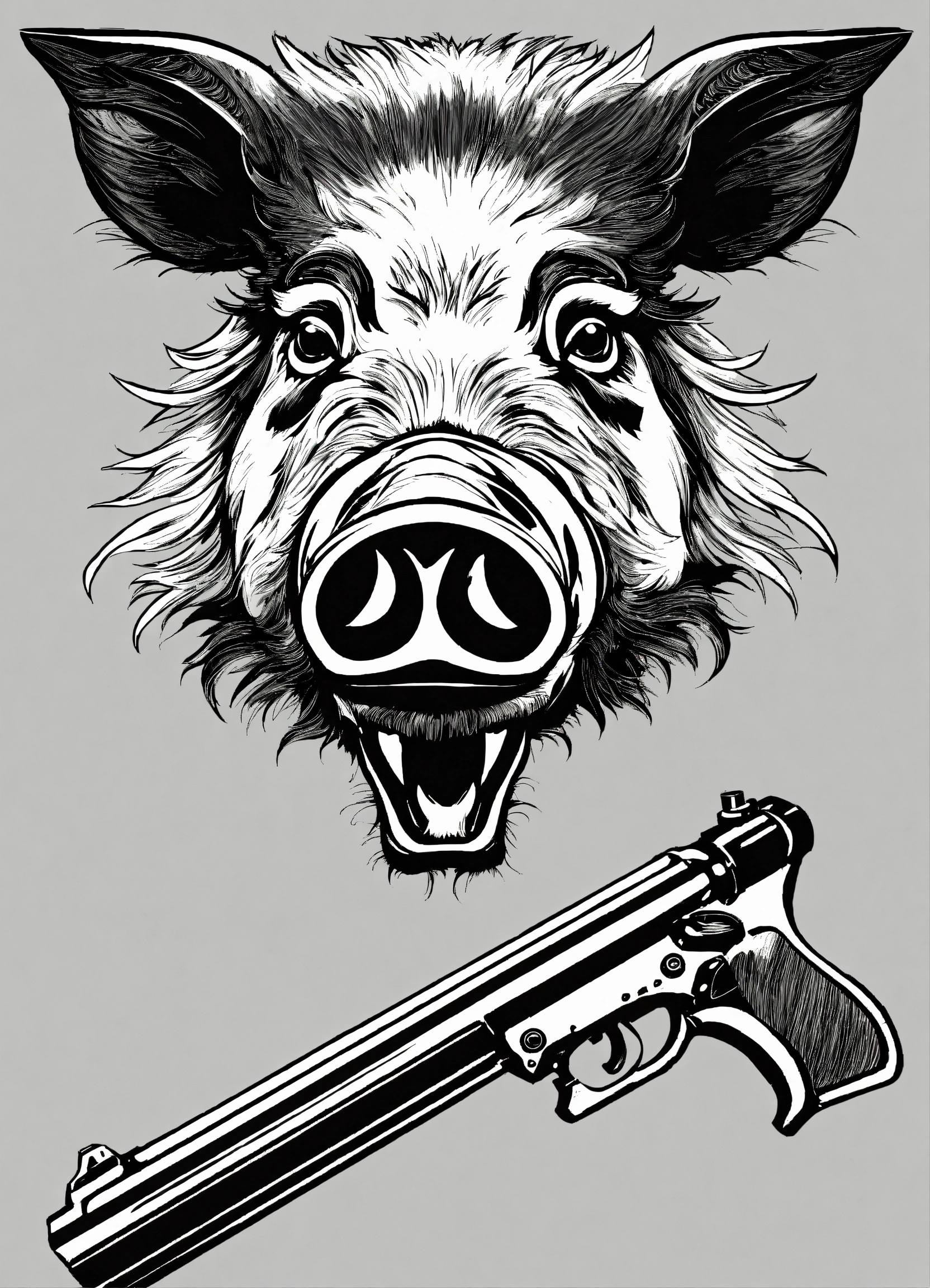 Wild boar gun, black and white, white background, no background, ink fine line art stylized, vector, design for tattoo, ignorant style