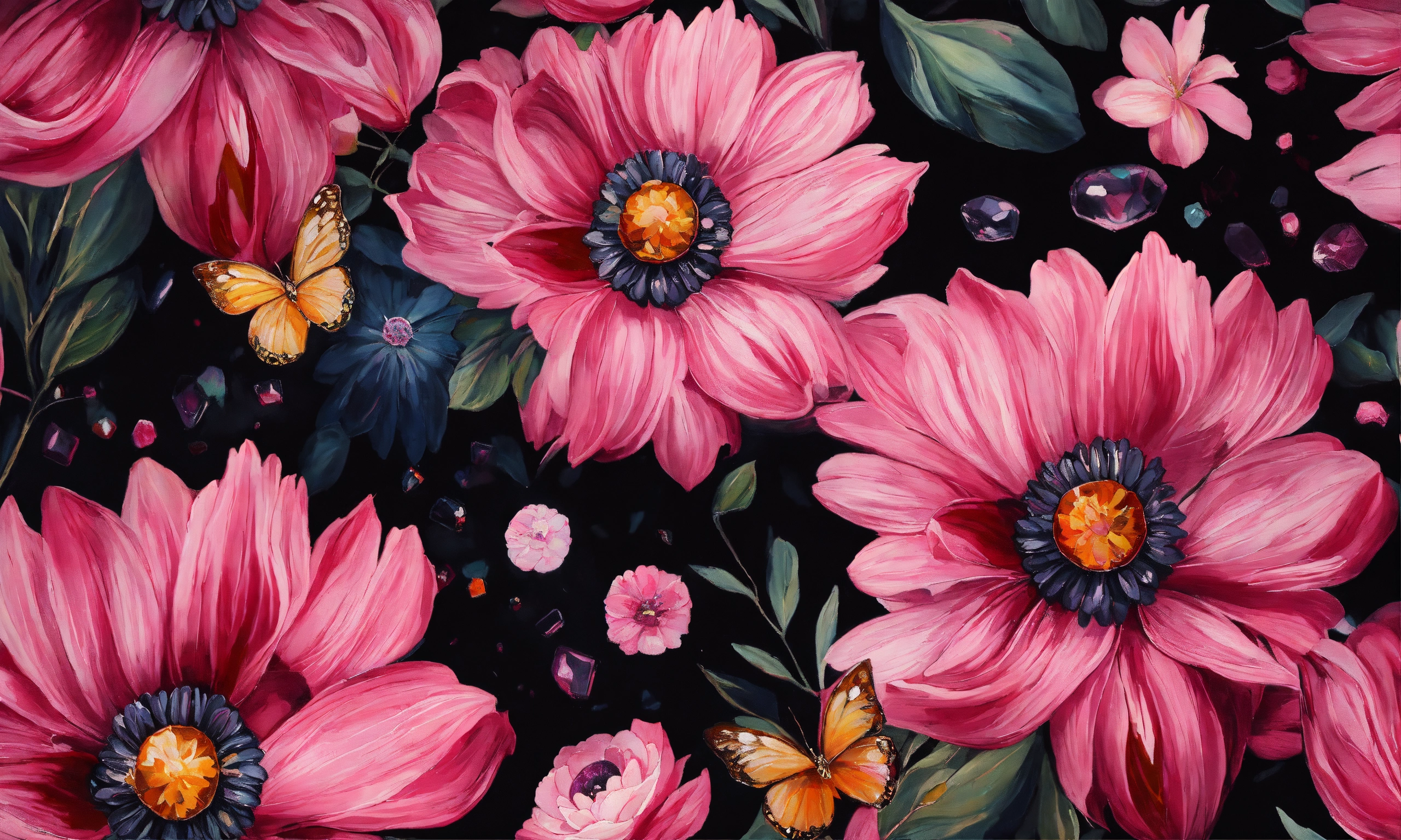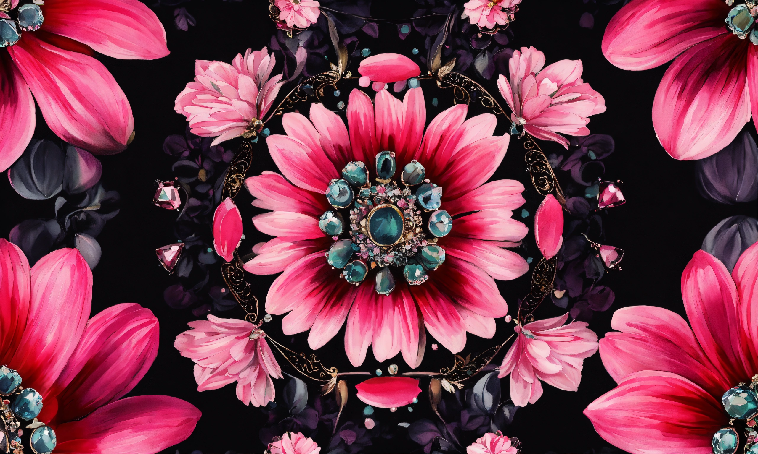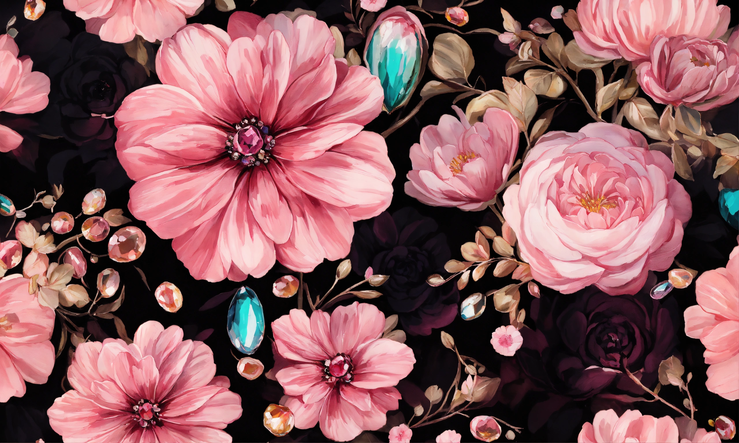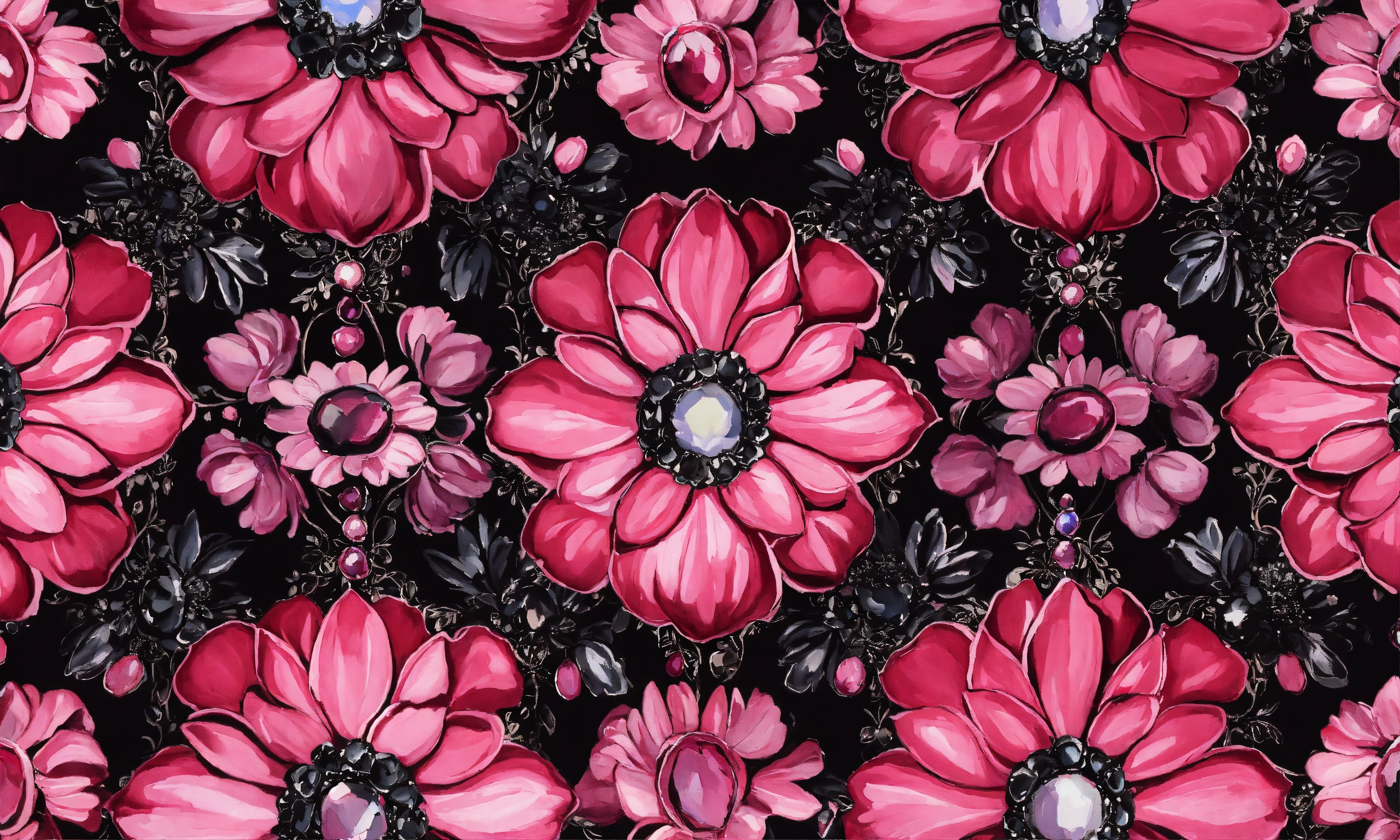 Pattern in pink and black flowers and gemstones oil painting style