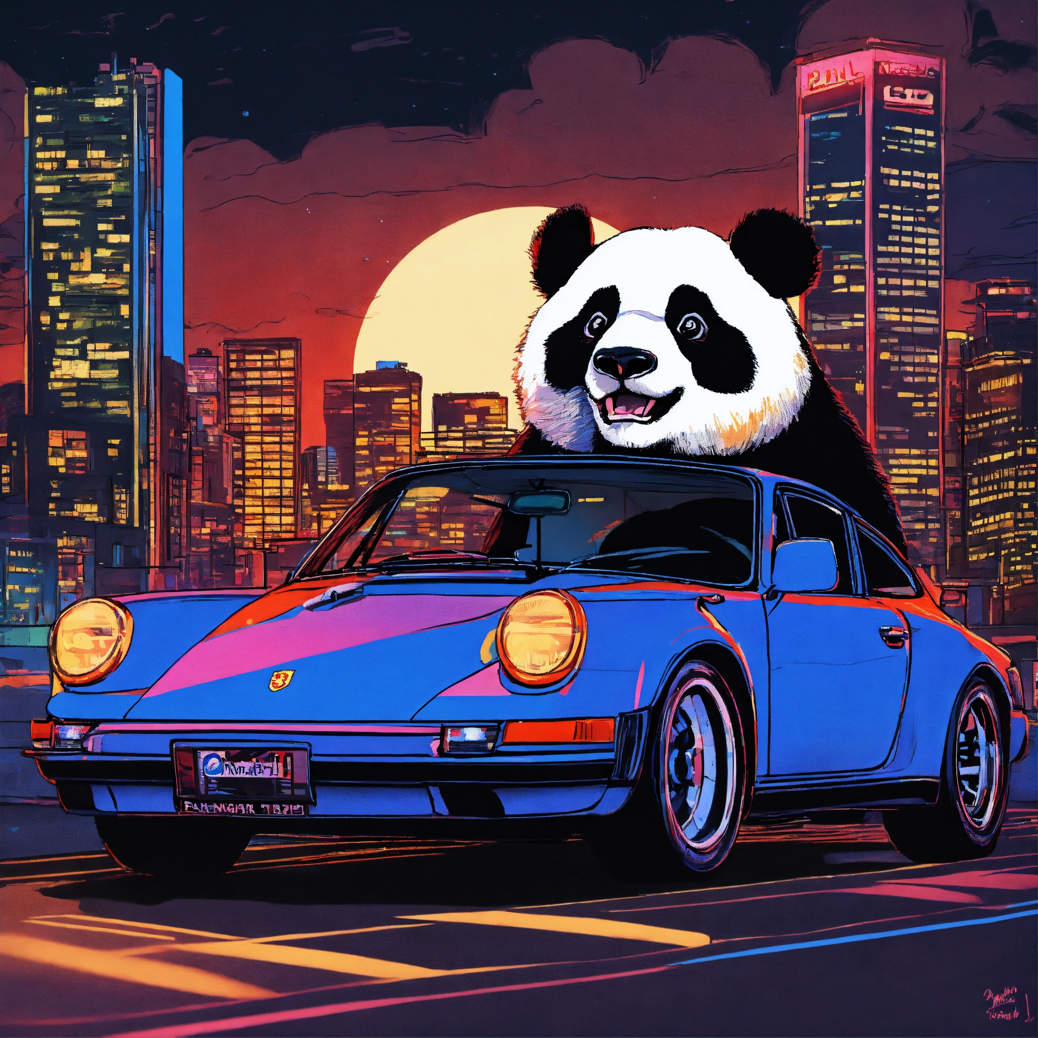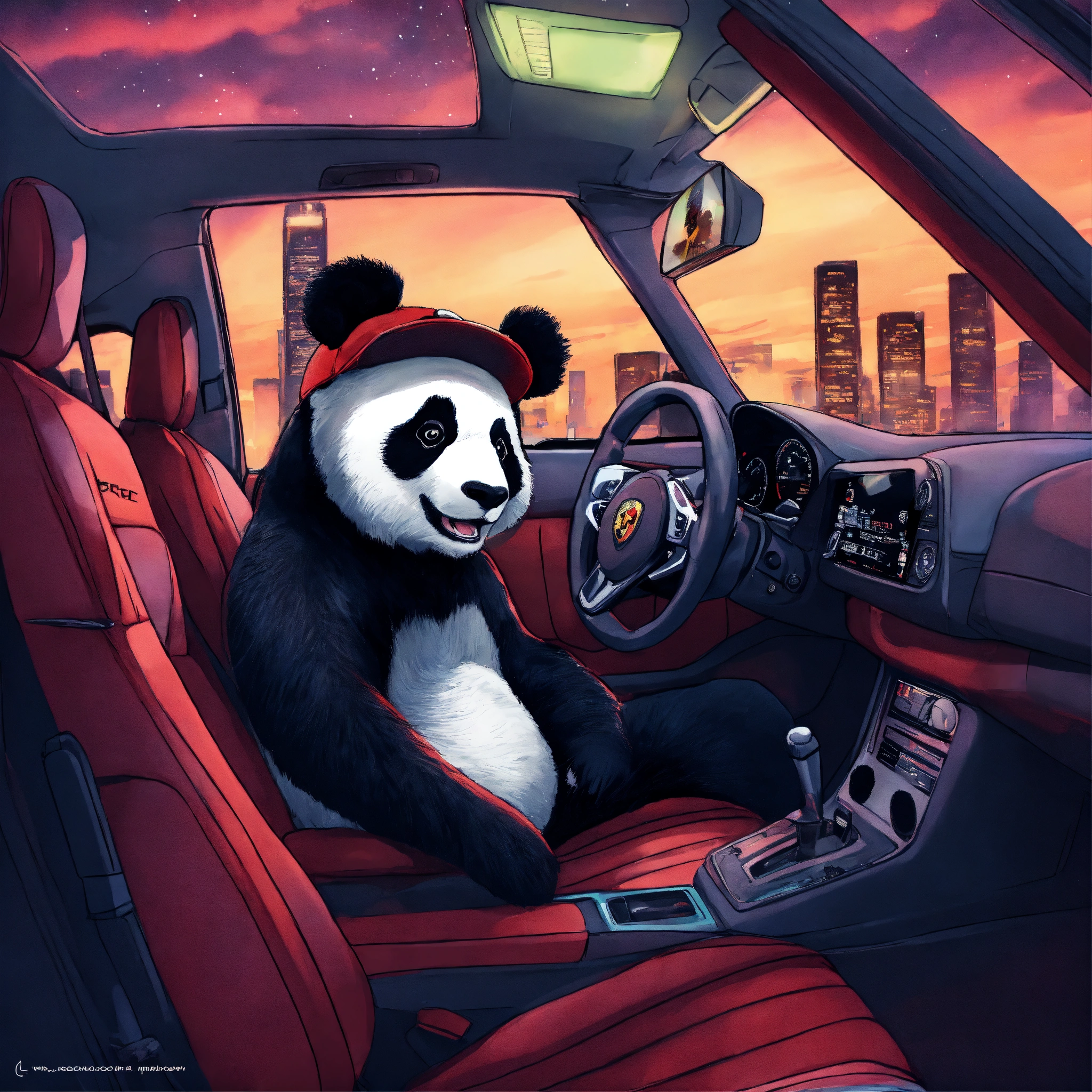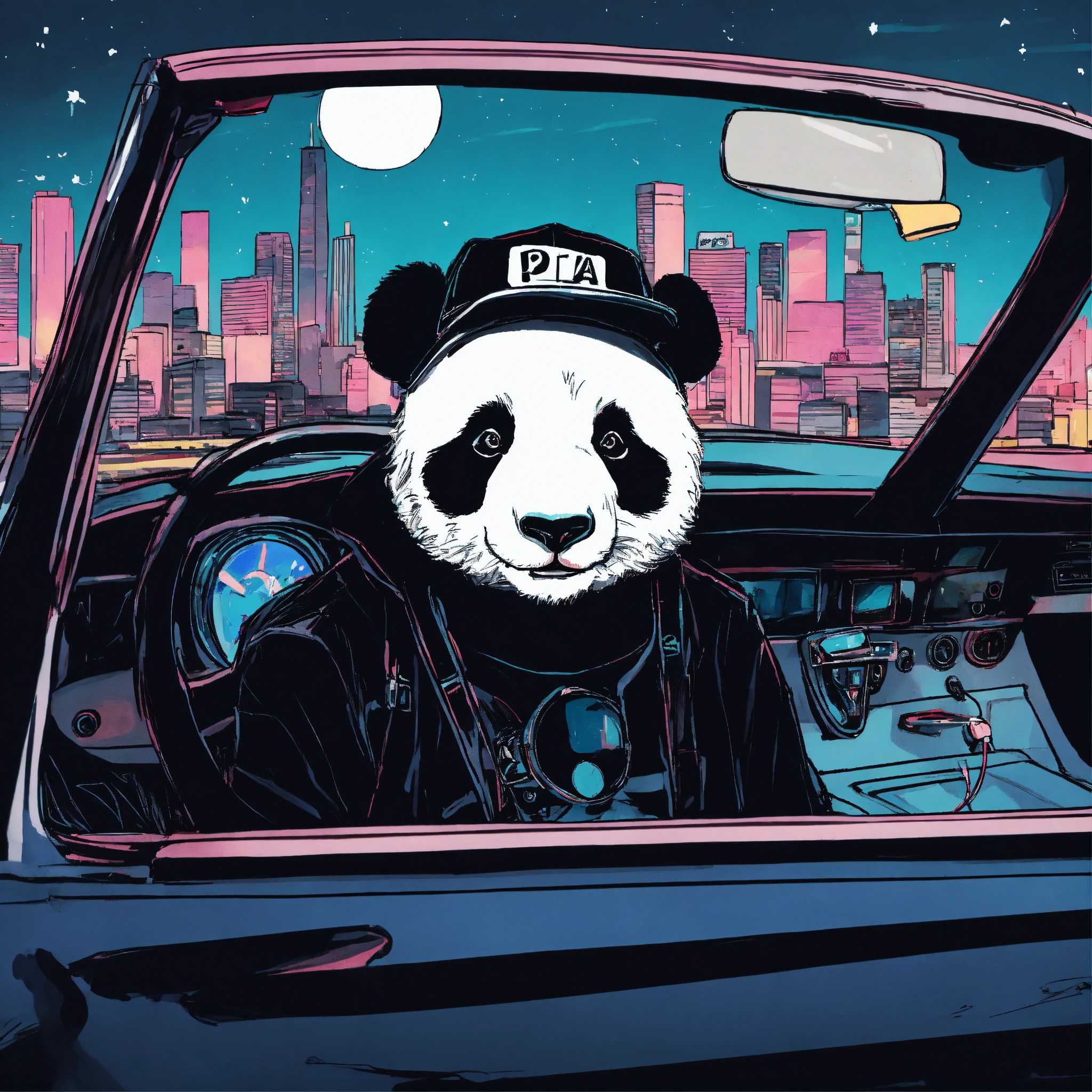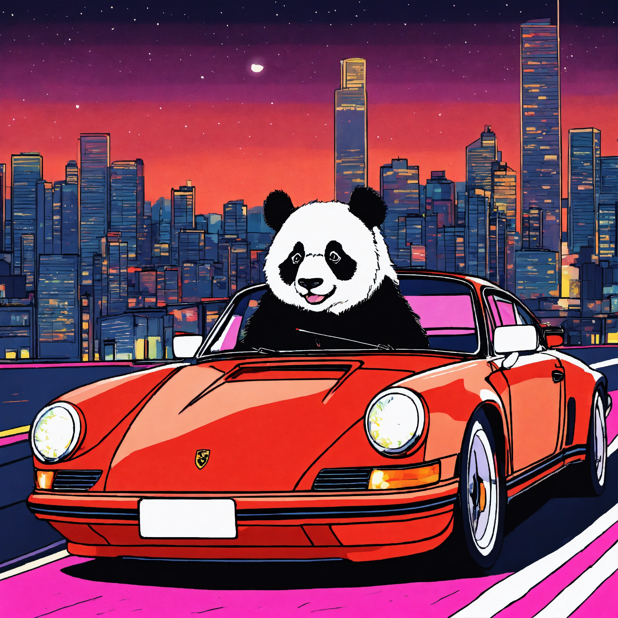 2d drawing of a panda with flow, wear a baseball cap, this one is in a porsche 911 listening to music and in love, midnight city