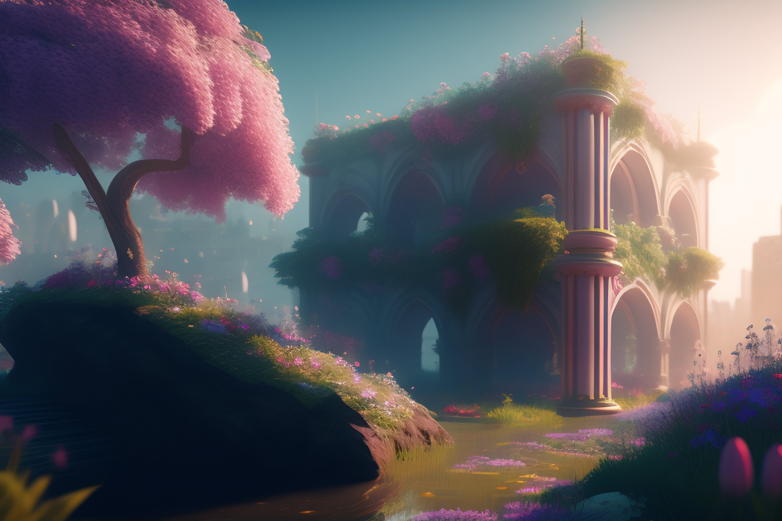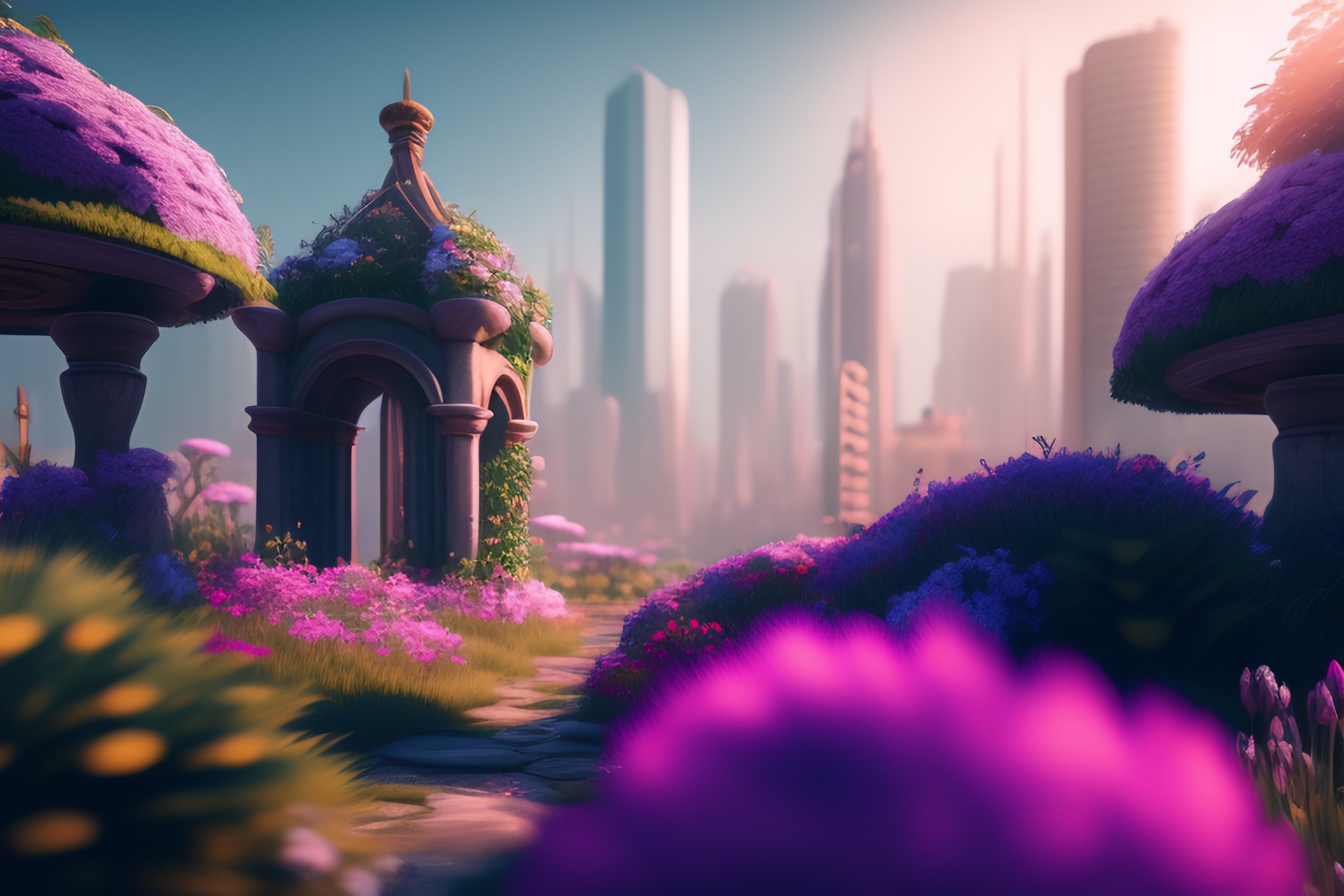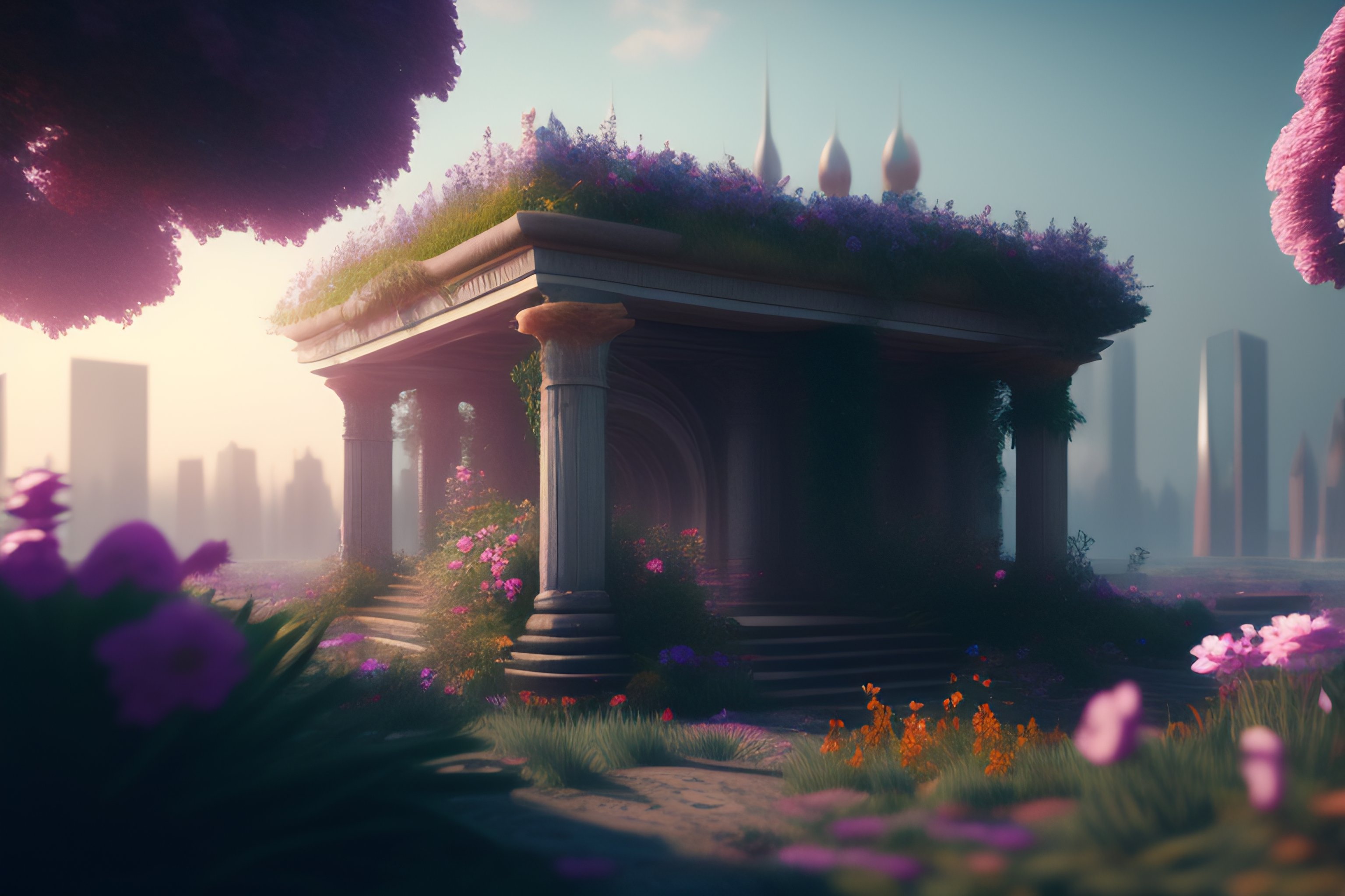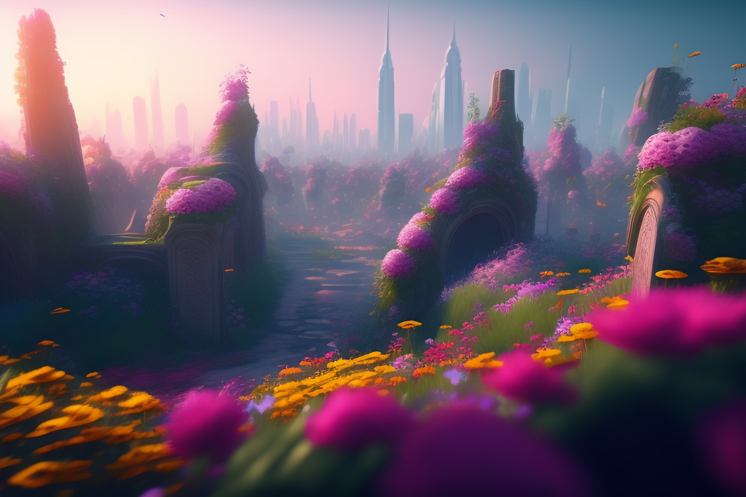 A ruined city overgrown by flowers
