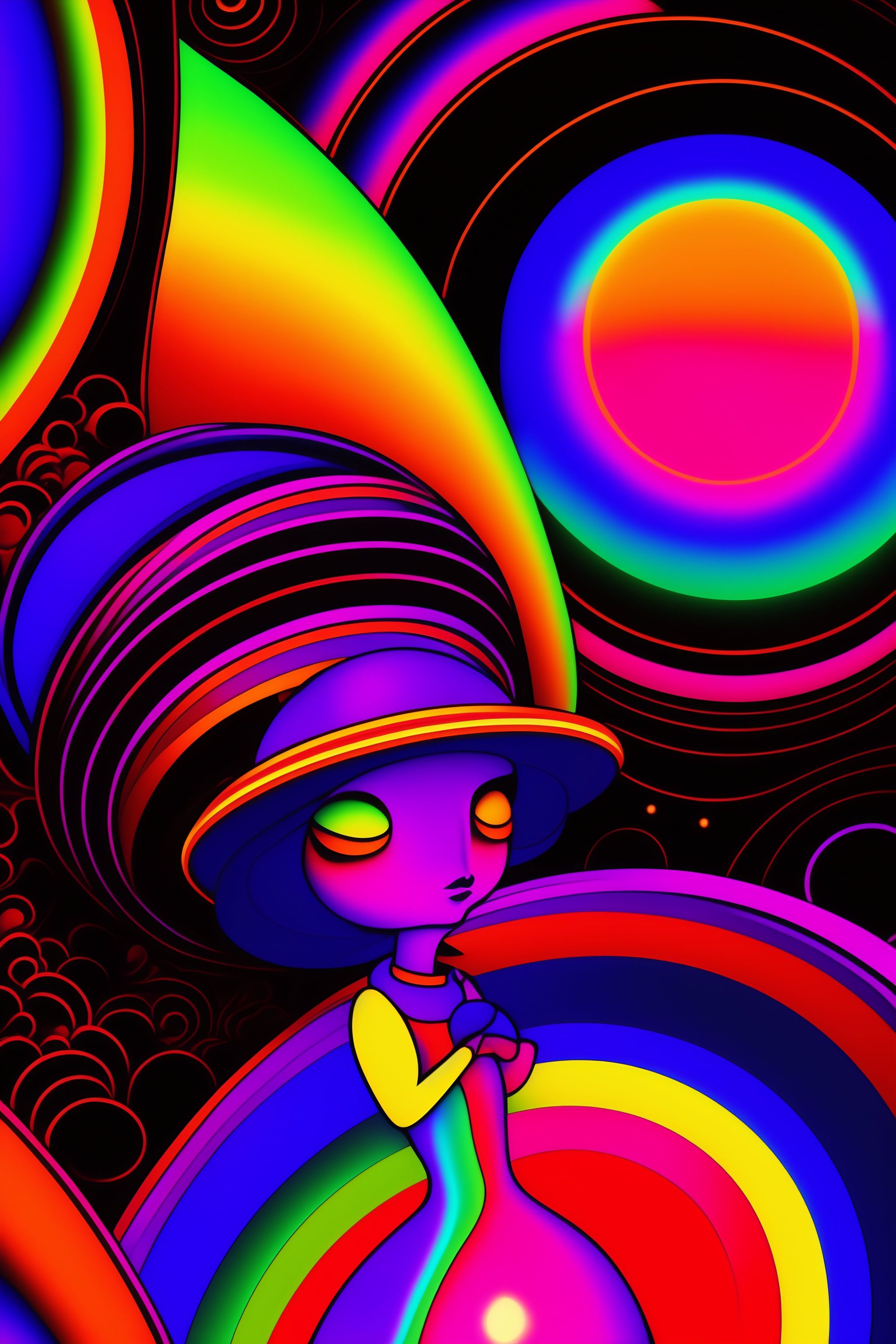 Psychedelic vintage full shot 1960's cartoon poster with alien hippy, ovni, tron, psychedelic alien hippy smoking marijuana, black in color, with a psychedelic steampunk space background, futuristic rainbow lighting, cinematic lighting, cozy lighting, 8k, cinematic poster vintage 1960's