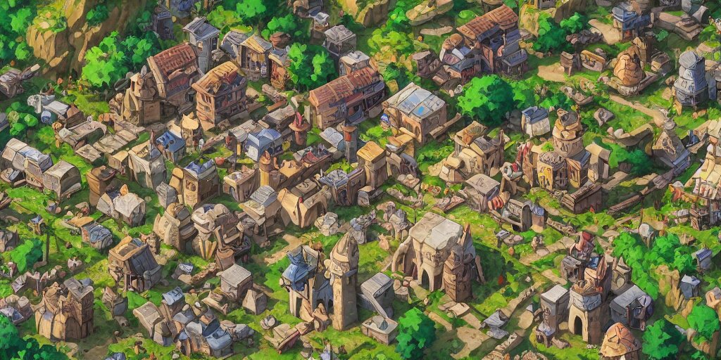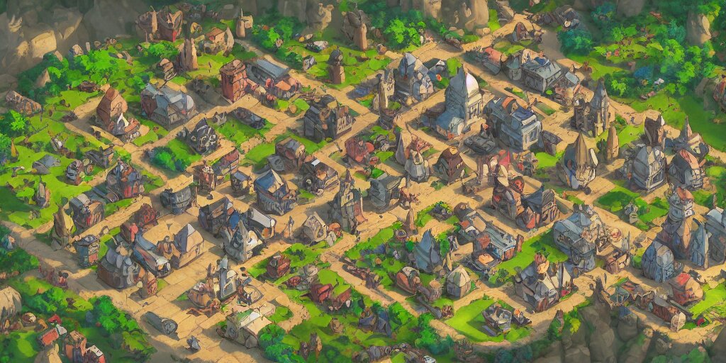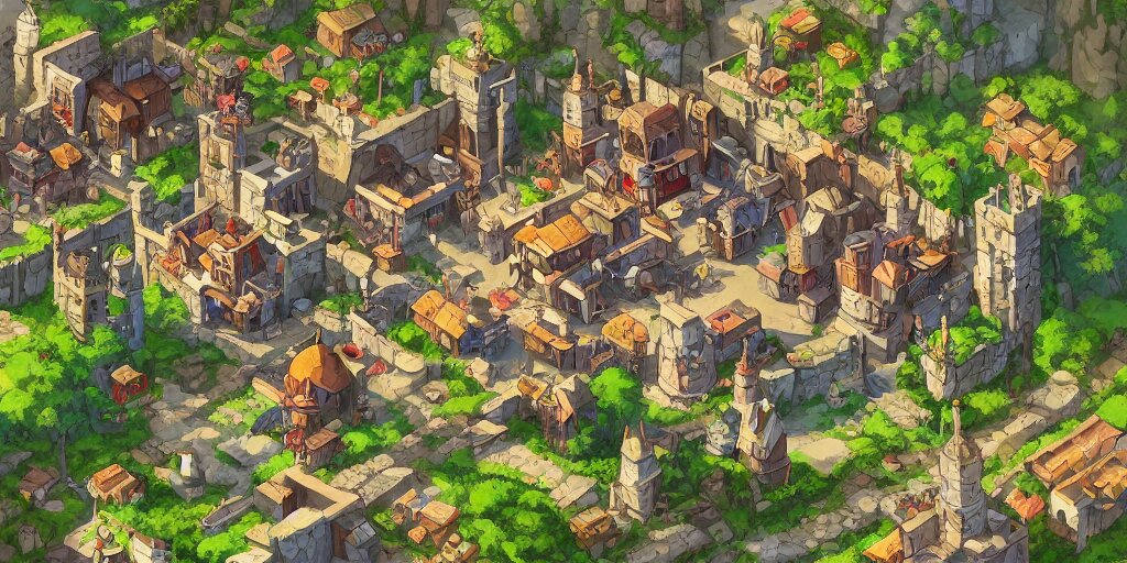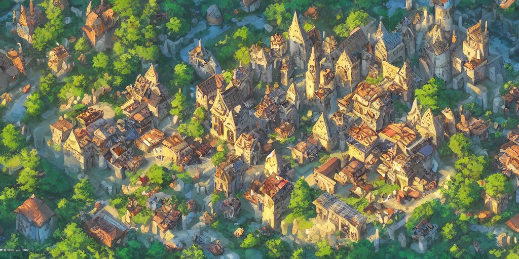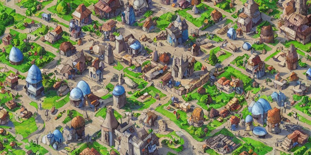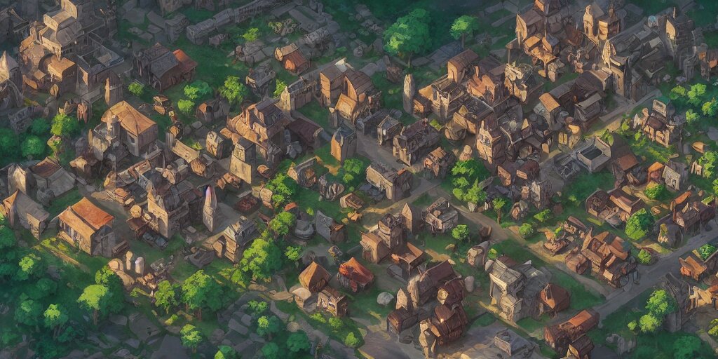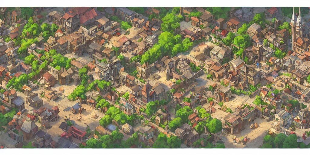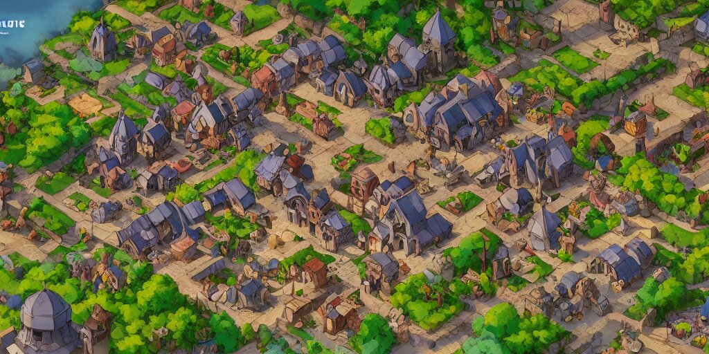 Rpg isometric top view of a lovely anime medieval fantasy village!! game asset!! cory loftis, james gilleard, atey ghailan, makoto shinkai, goro fujita, studio ghibli, rim light, exquisite lighting, clear focus, very coherent, plain background, soft painting