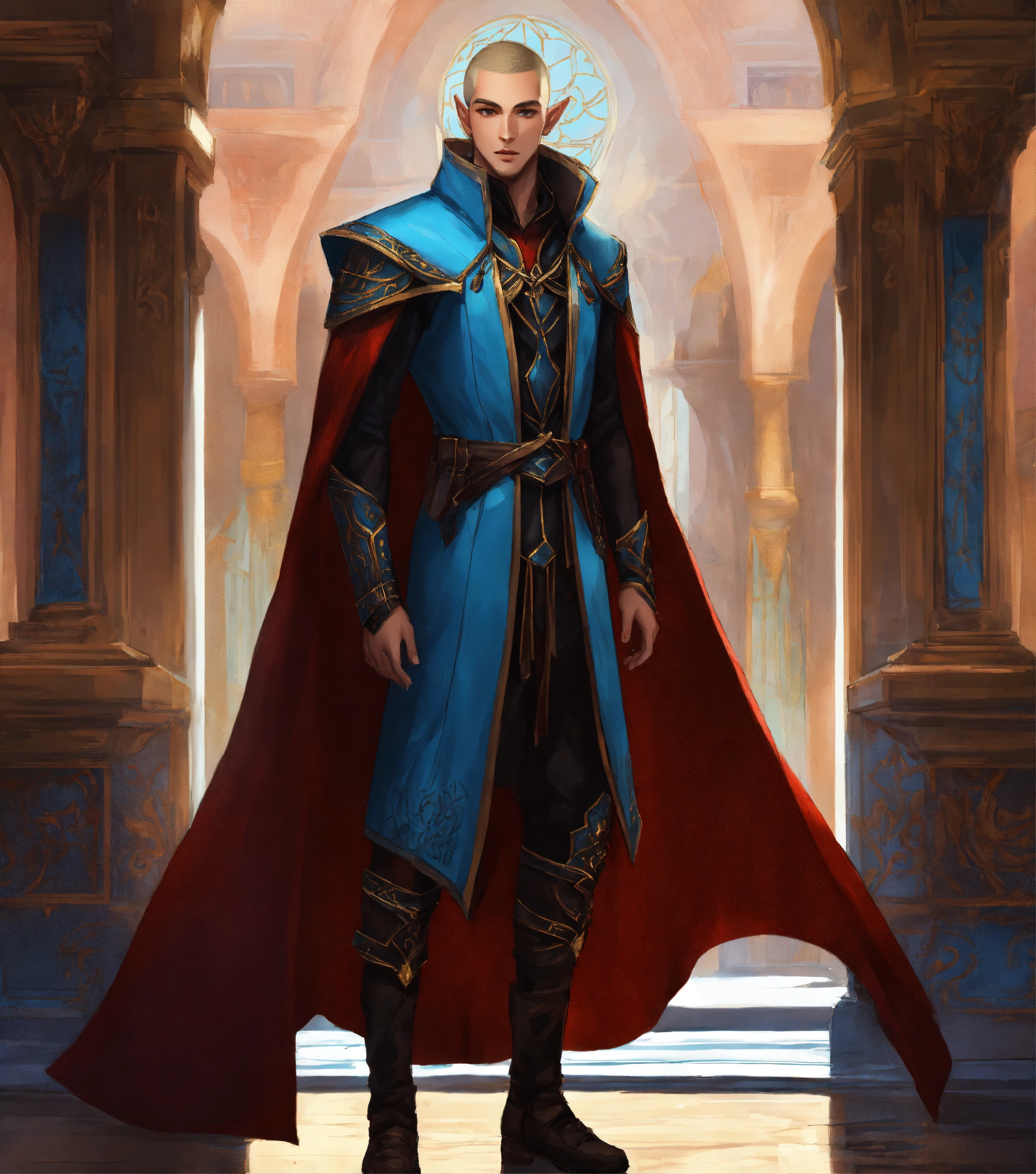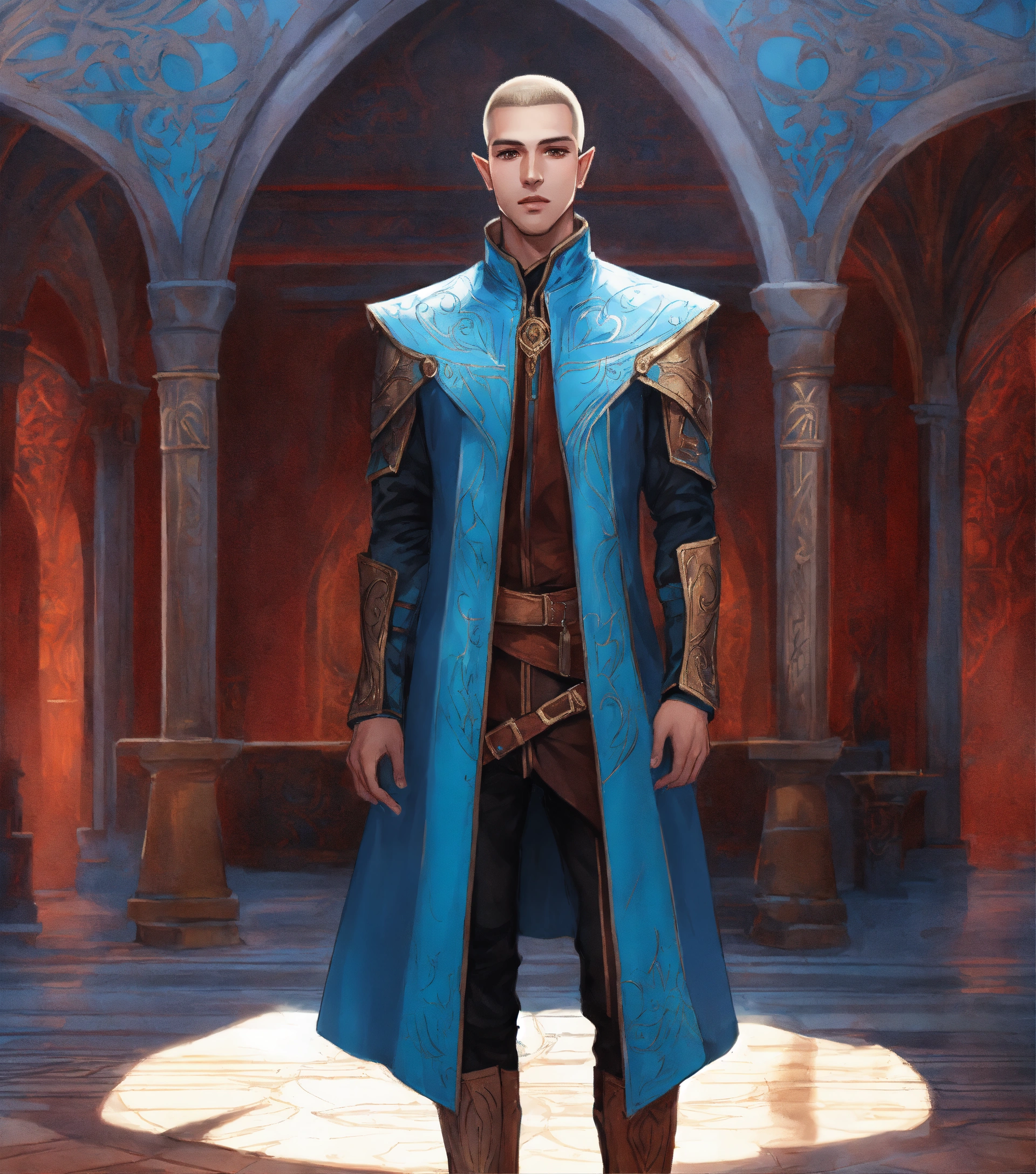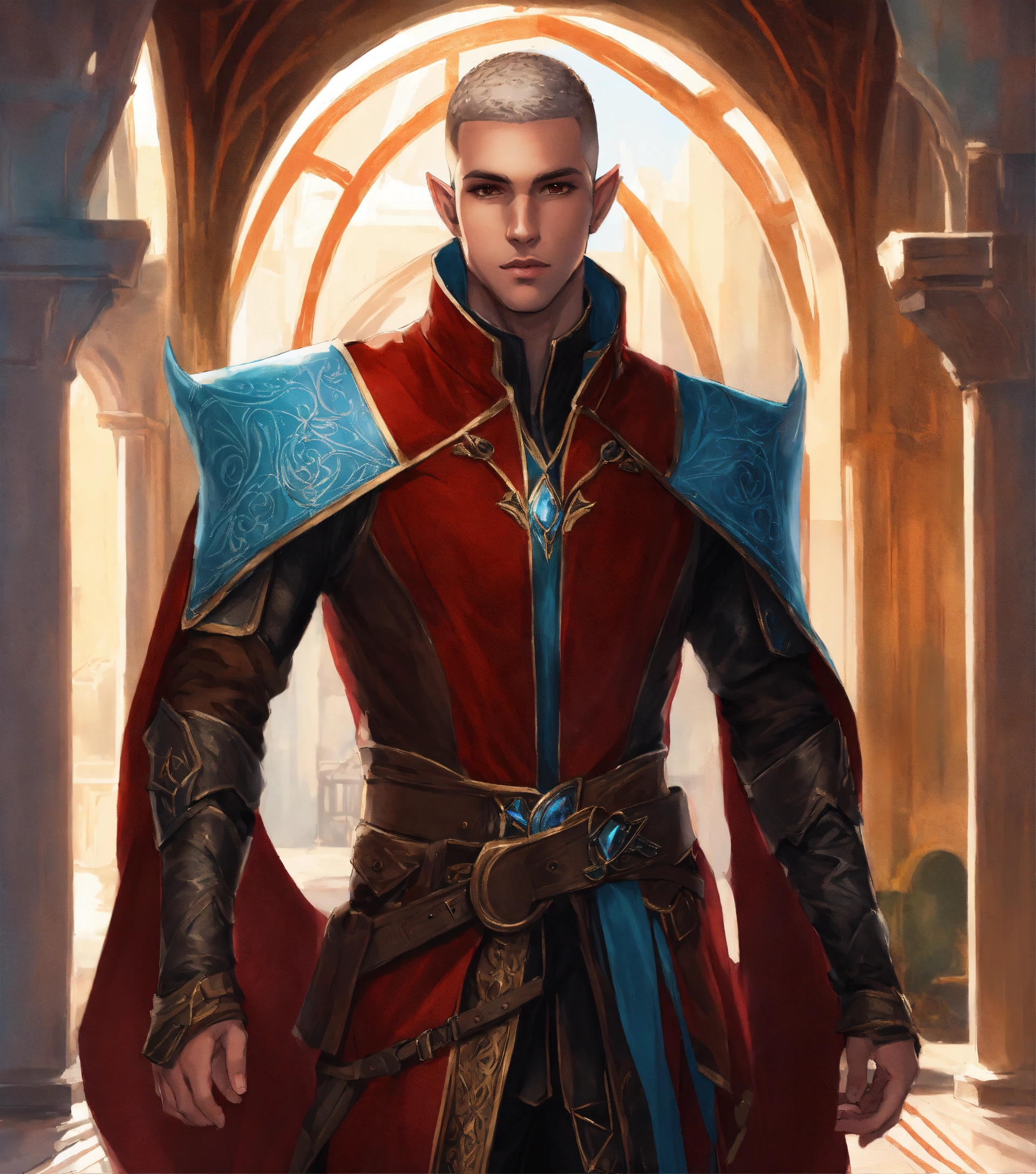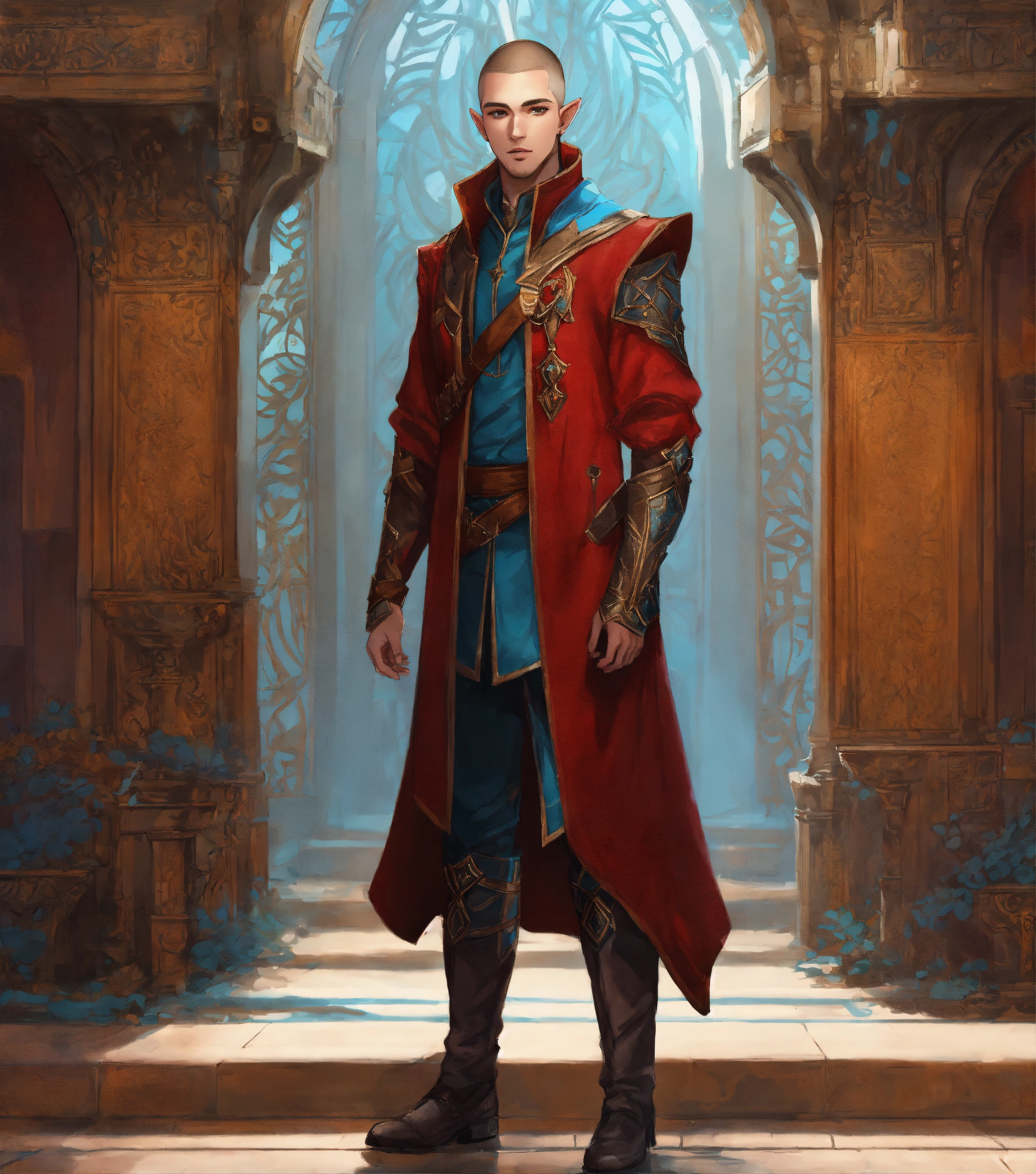 Full body drawing of a high elf, royalty, futuristic, black and hot crimson and light blue sci fi coat, male, handsome, brown buzz cut, 25 years old, standing in an elven palace courtyard