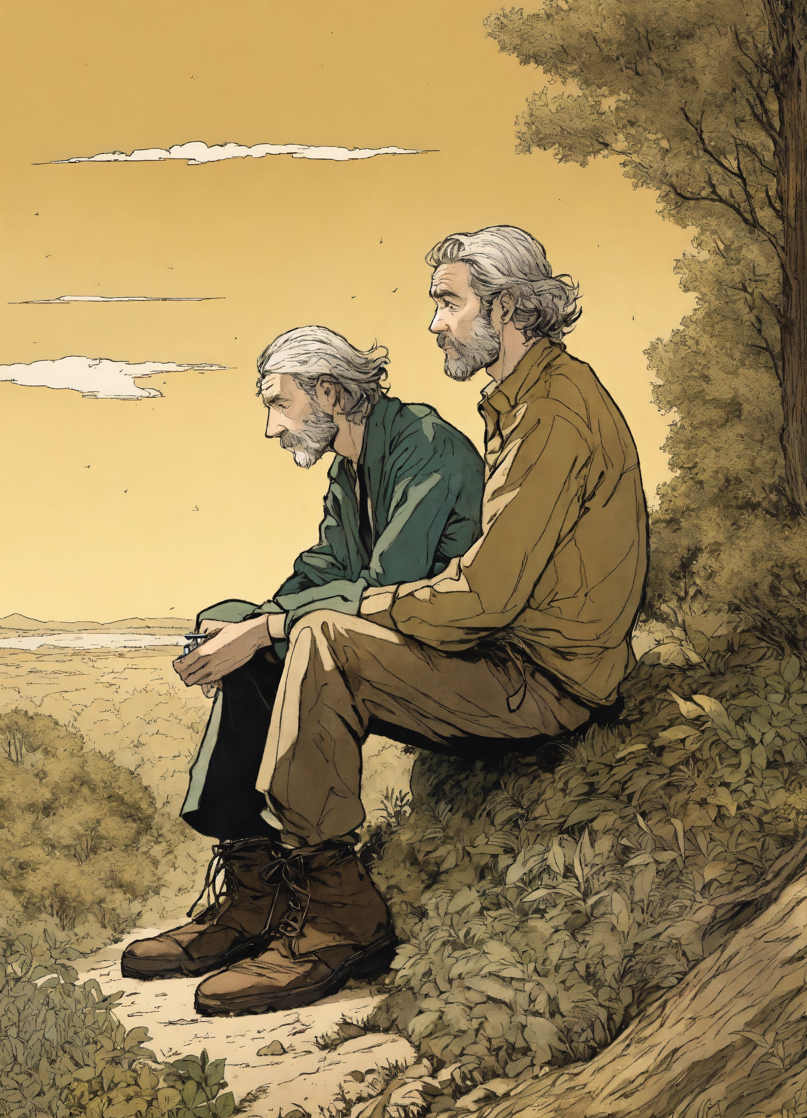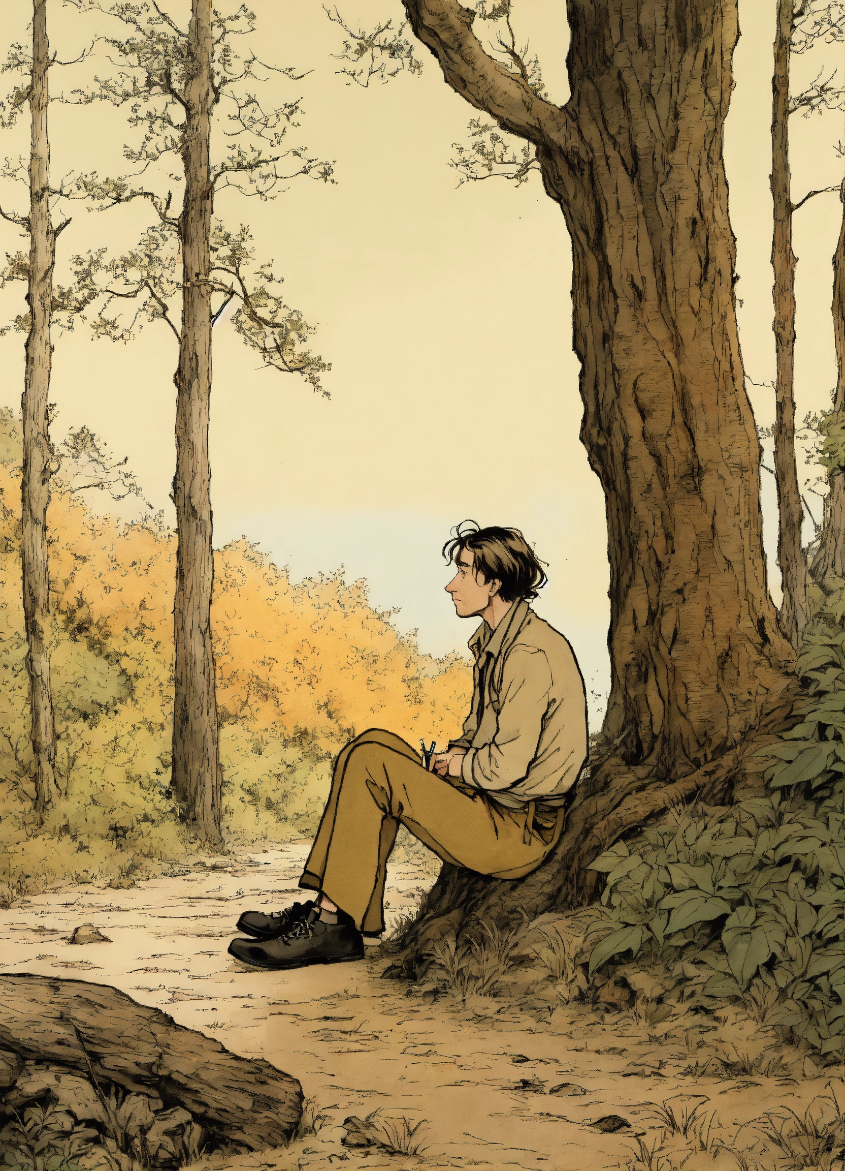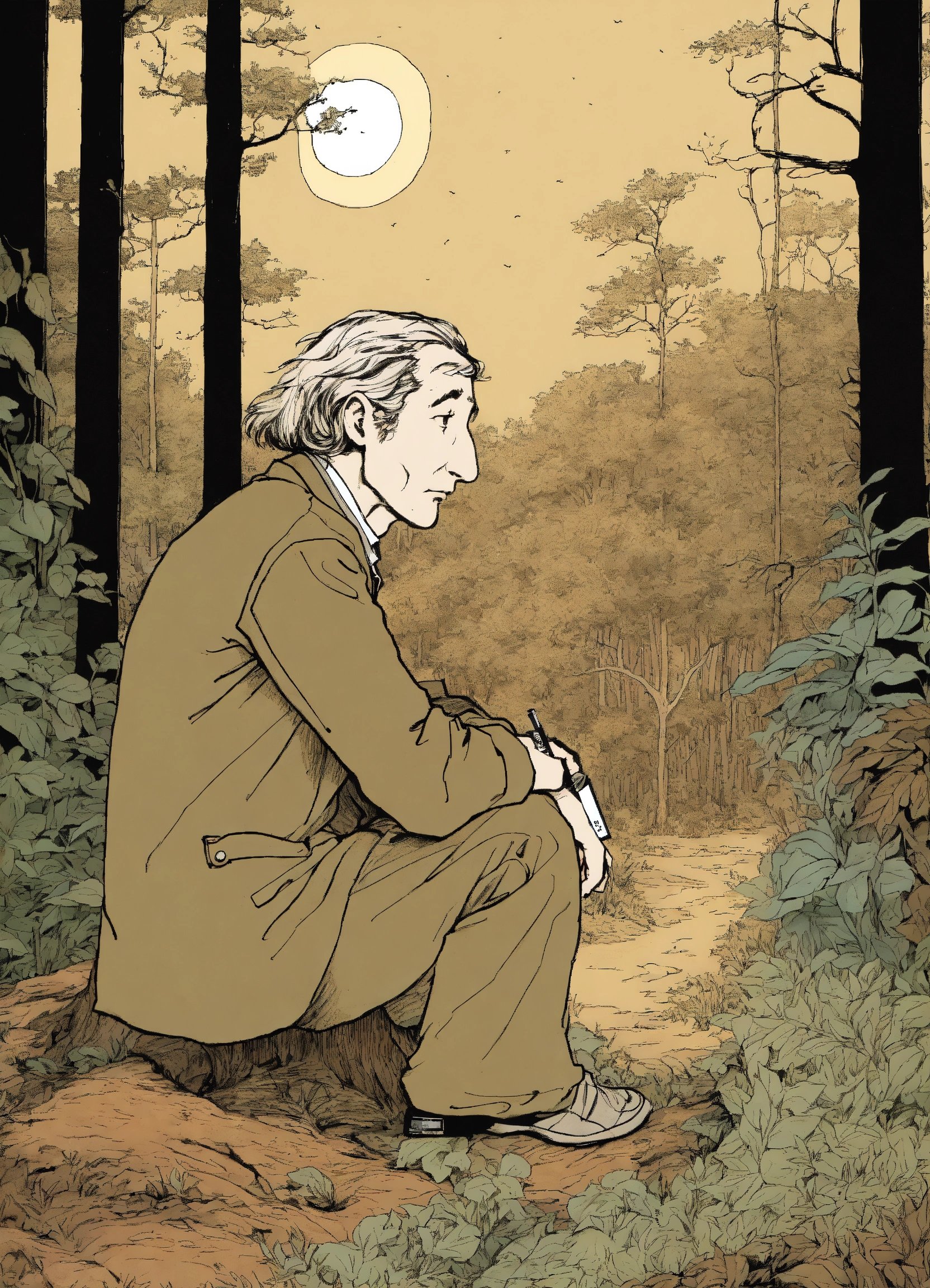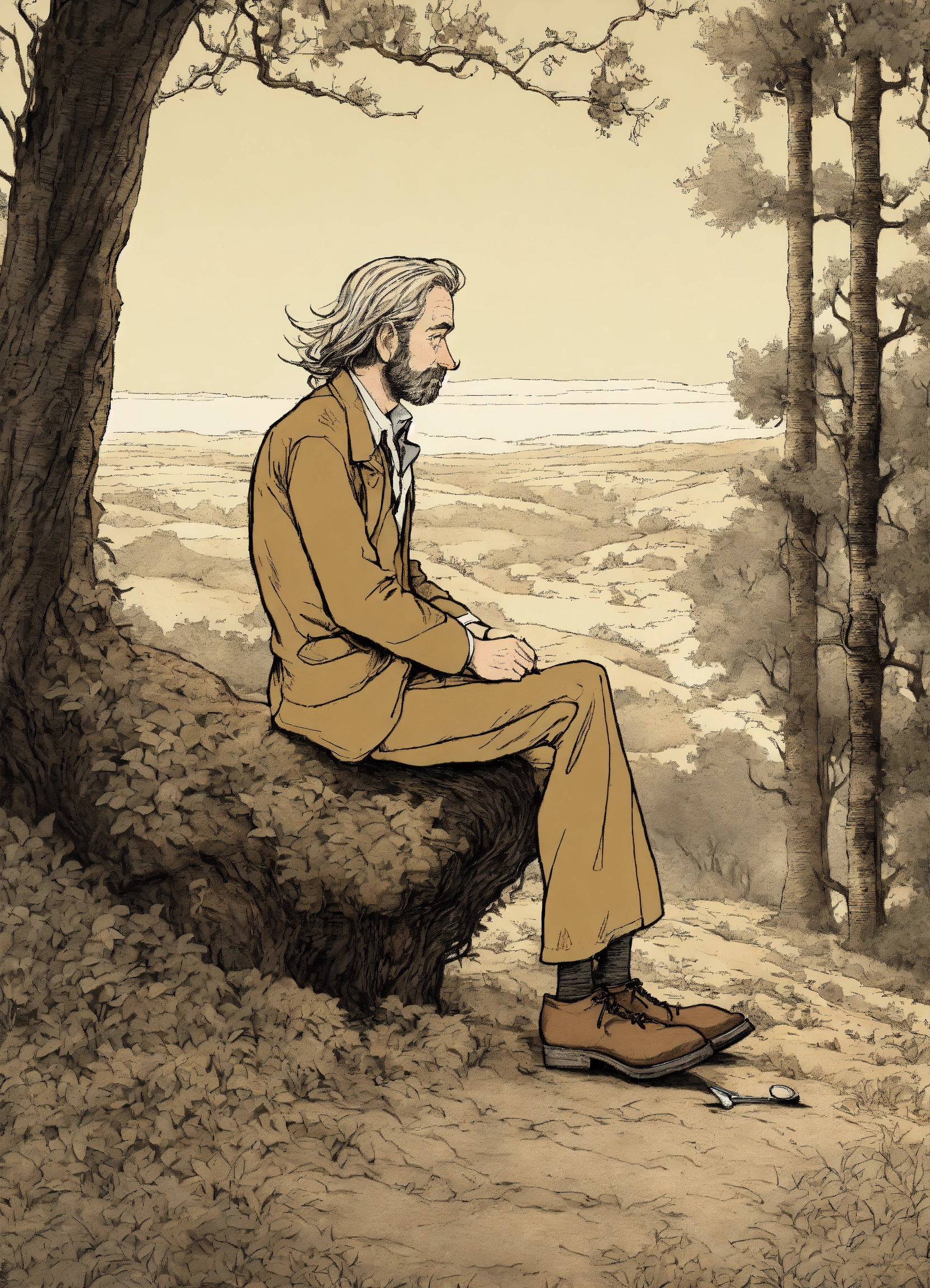 Pen and ink, illustrated by hergé, a lonely man wearing a dirt and transparent trunk, sitting at the forest with very long hair that turns into vegetation, sepia and sad colors, ultra detailed, tin-tin style