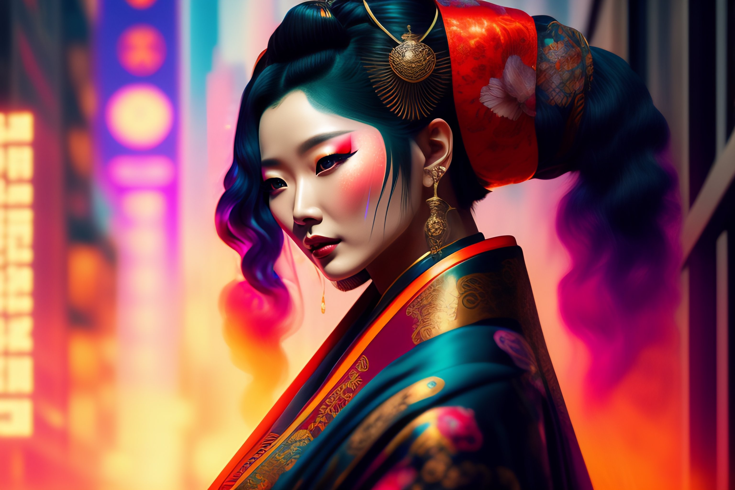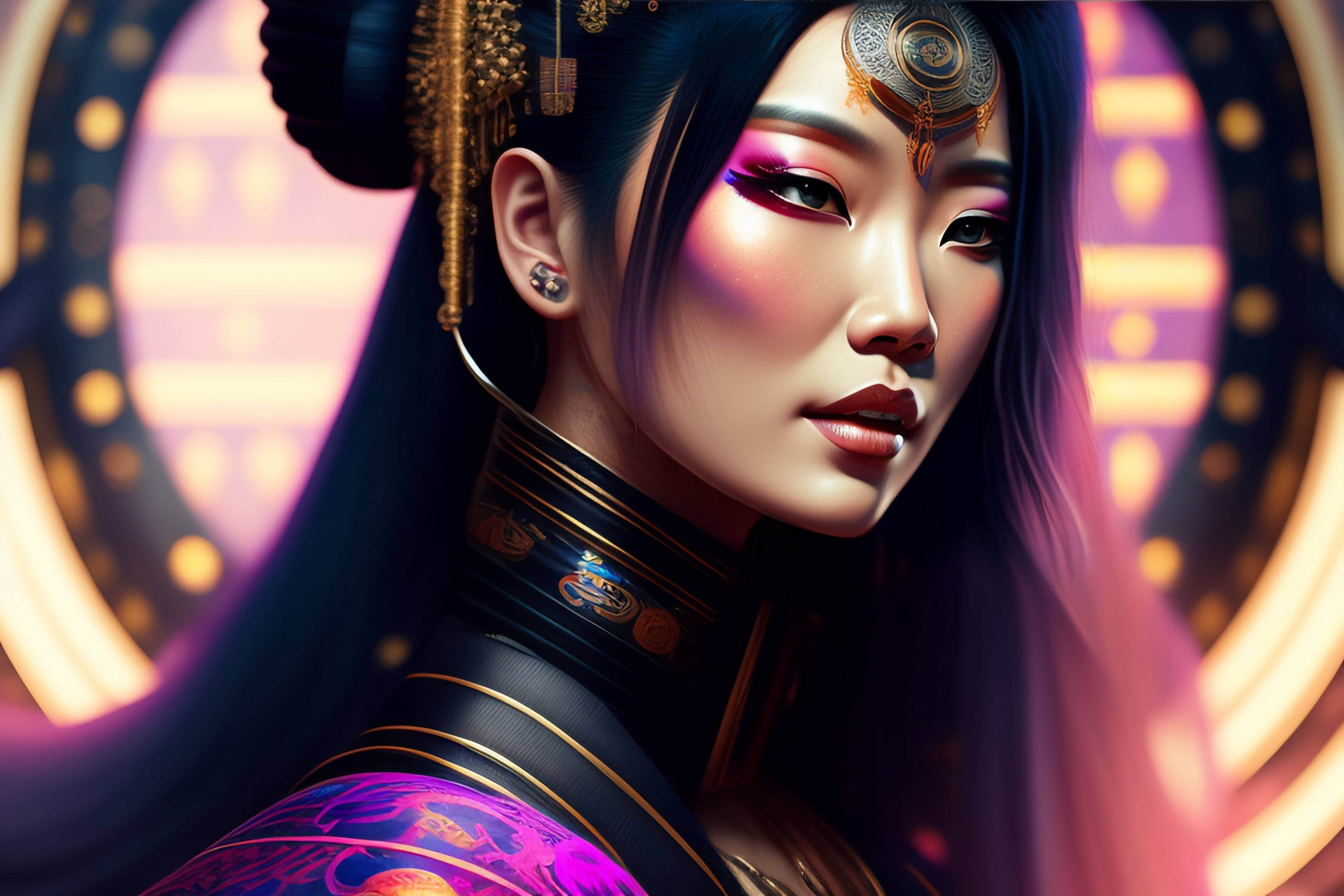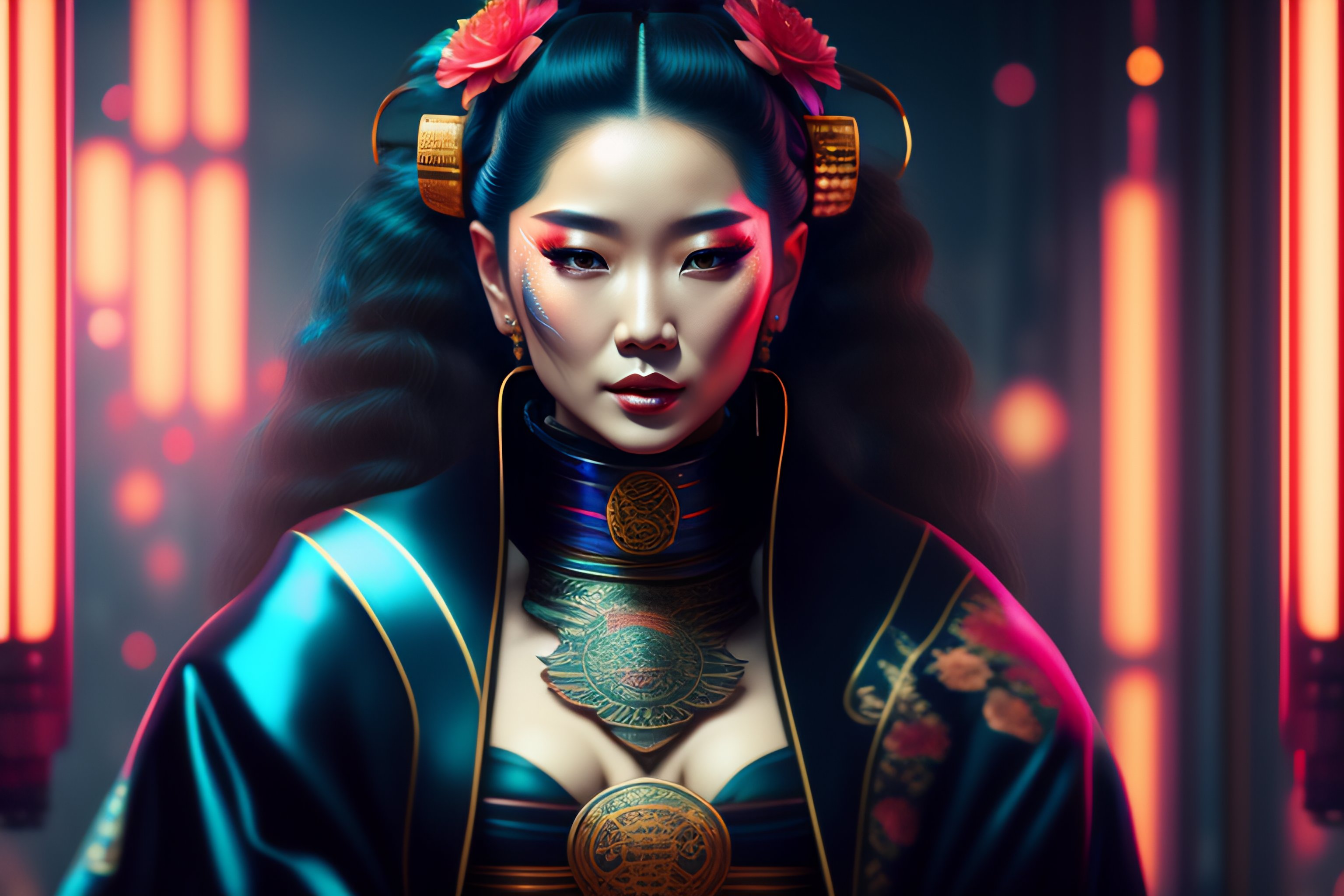 Ultra realistic cyberpunk geisha in a lotus position, wearing a flowing kimono and tattoos, 8 k wide angle shot, by tristan eaton, stanley artgermm, tom bagshaw, greg rutkowski, carne griffiths, ayami kojima, beksinski, giger, wlop, trending on deviantart, hyper detailed, cybernetic, full of colour, poster "