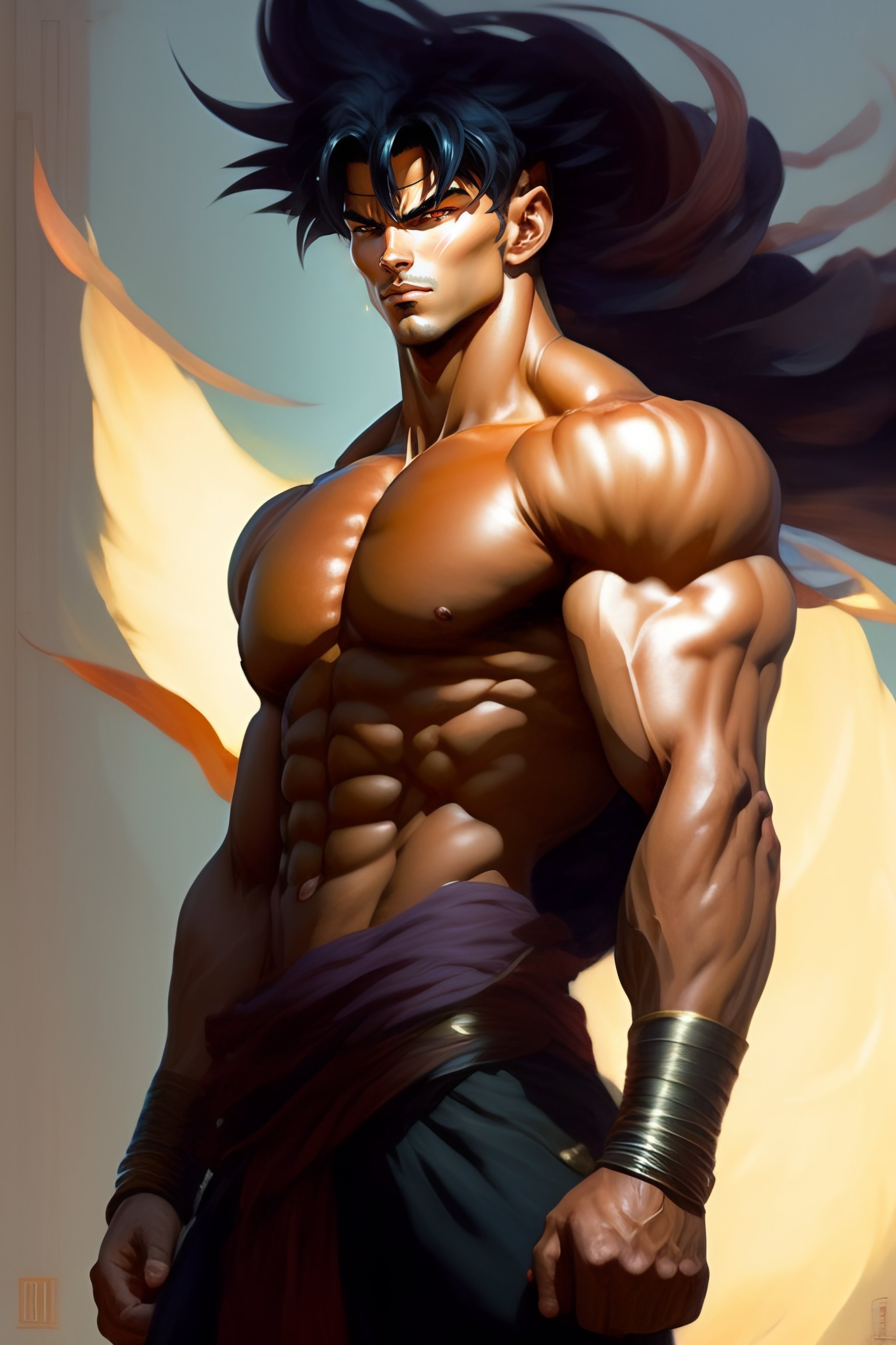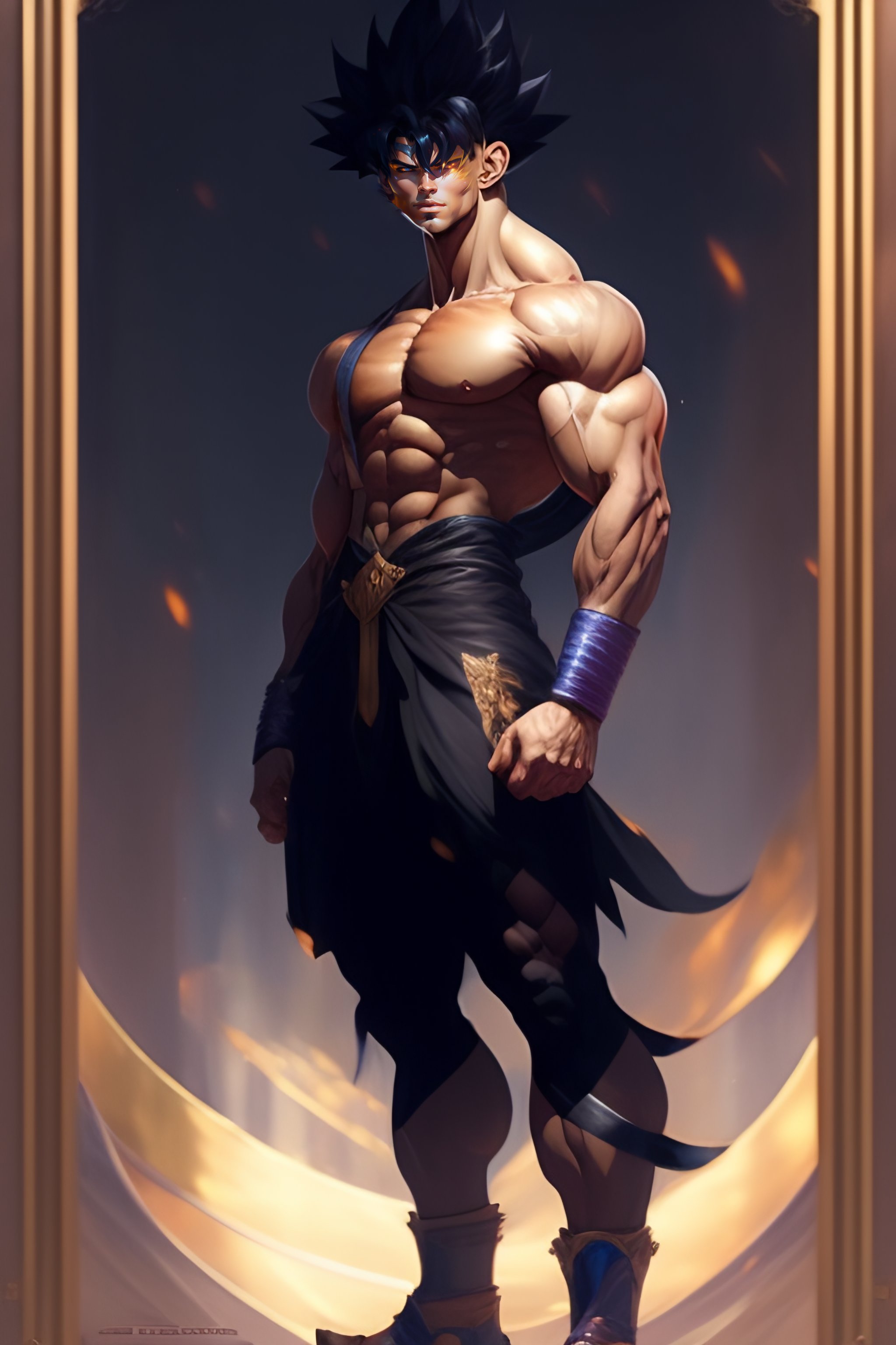 Full body potrait thin muscular goku standing with a confident, nonchalant expression on his face anime version, his unassuming appearance belying his incredible strength art by greg rutkowski and alphonse mucha