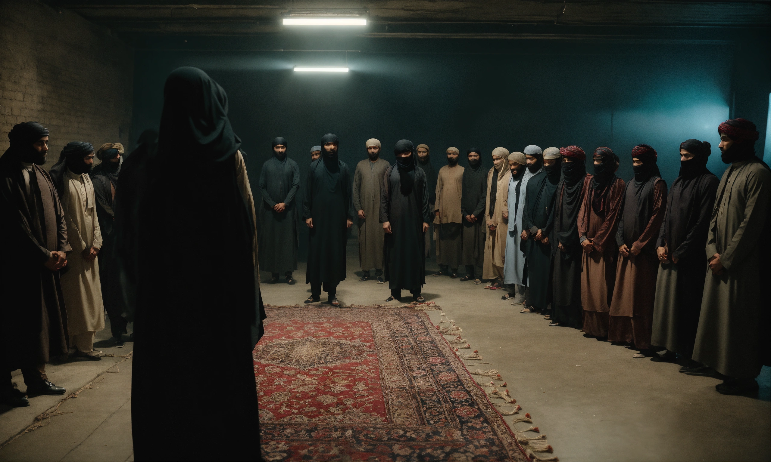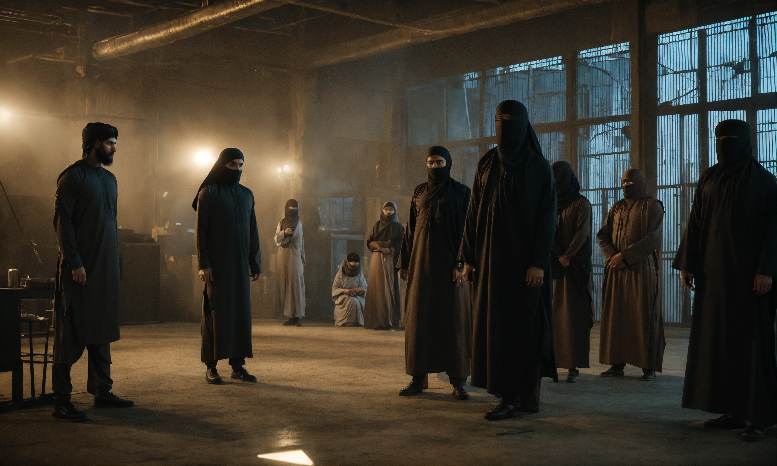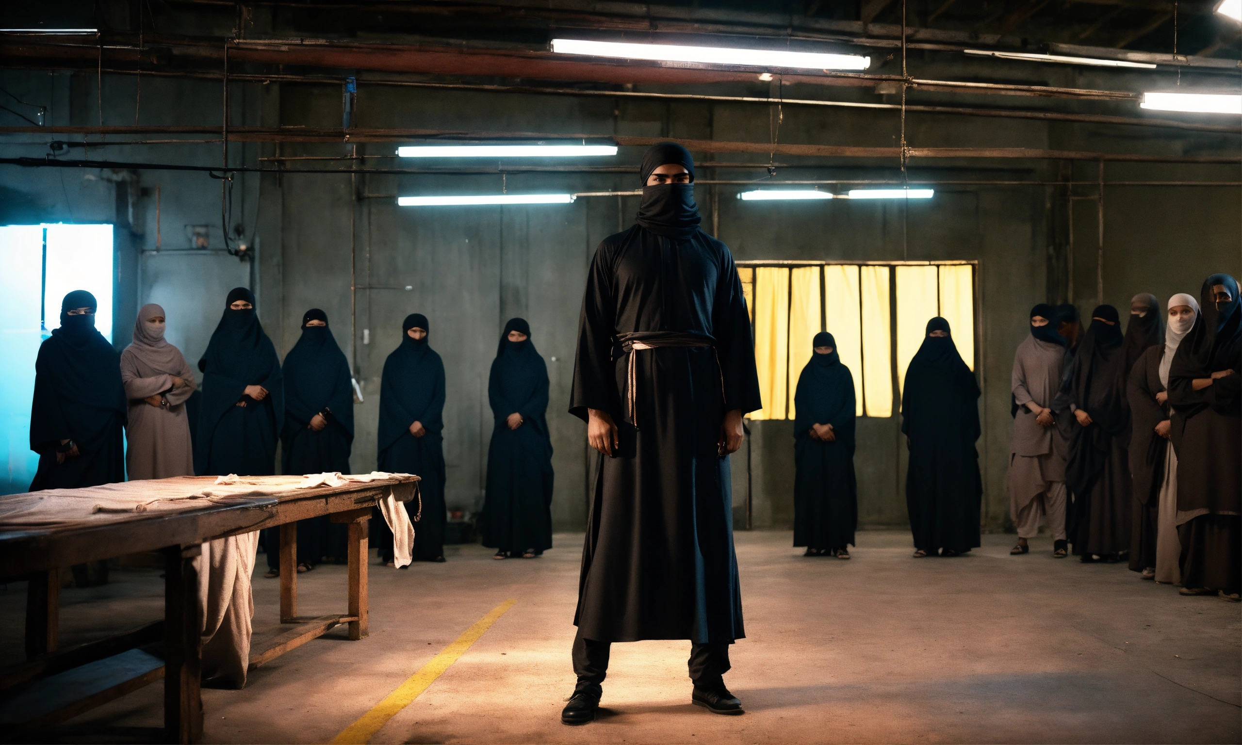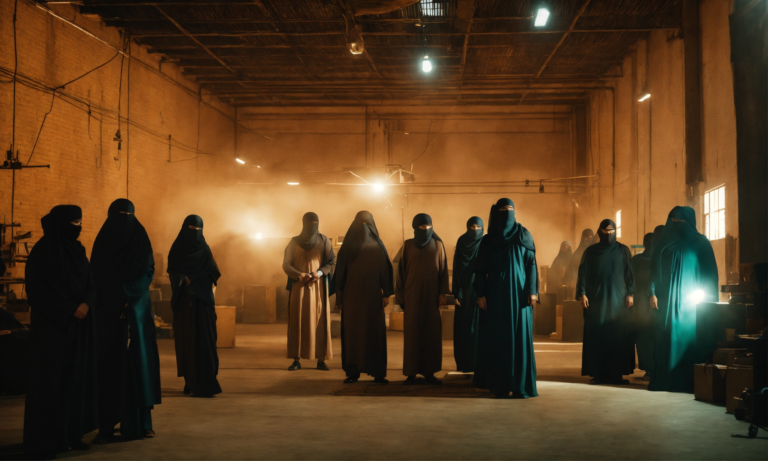 10 afghani male terrorists standing in front 10 ladies (in burkha), wide front shot, warehouse interior night time, 8k, luxcorerender, earthly colour, cinematic photography, real humans, real images, matte finish, shot on arri anamorphic, extreme wide shot, smooth, sharp focus, ornate, highly dynamic, particulate, hyperreal, wide shot.