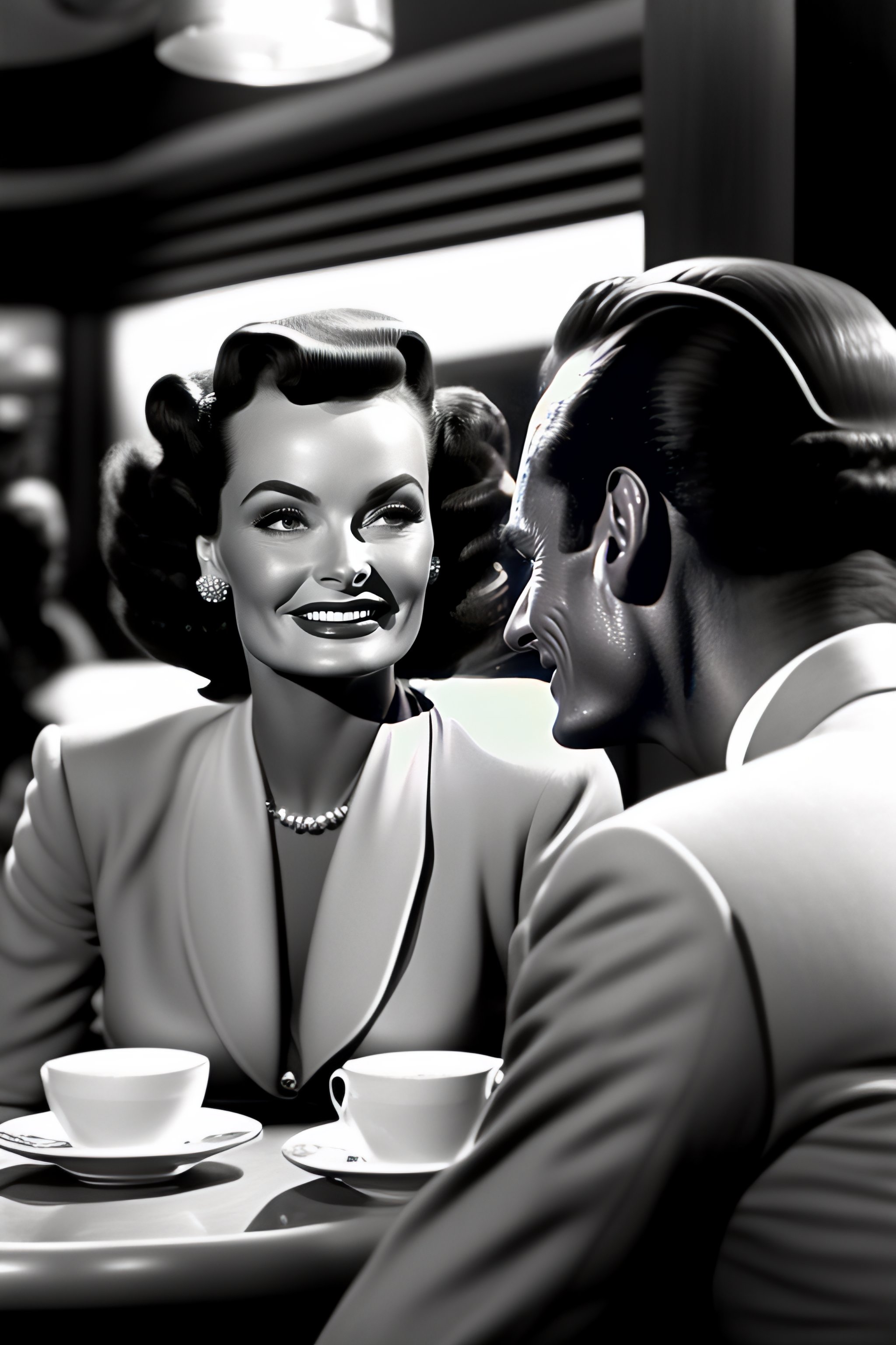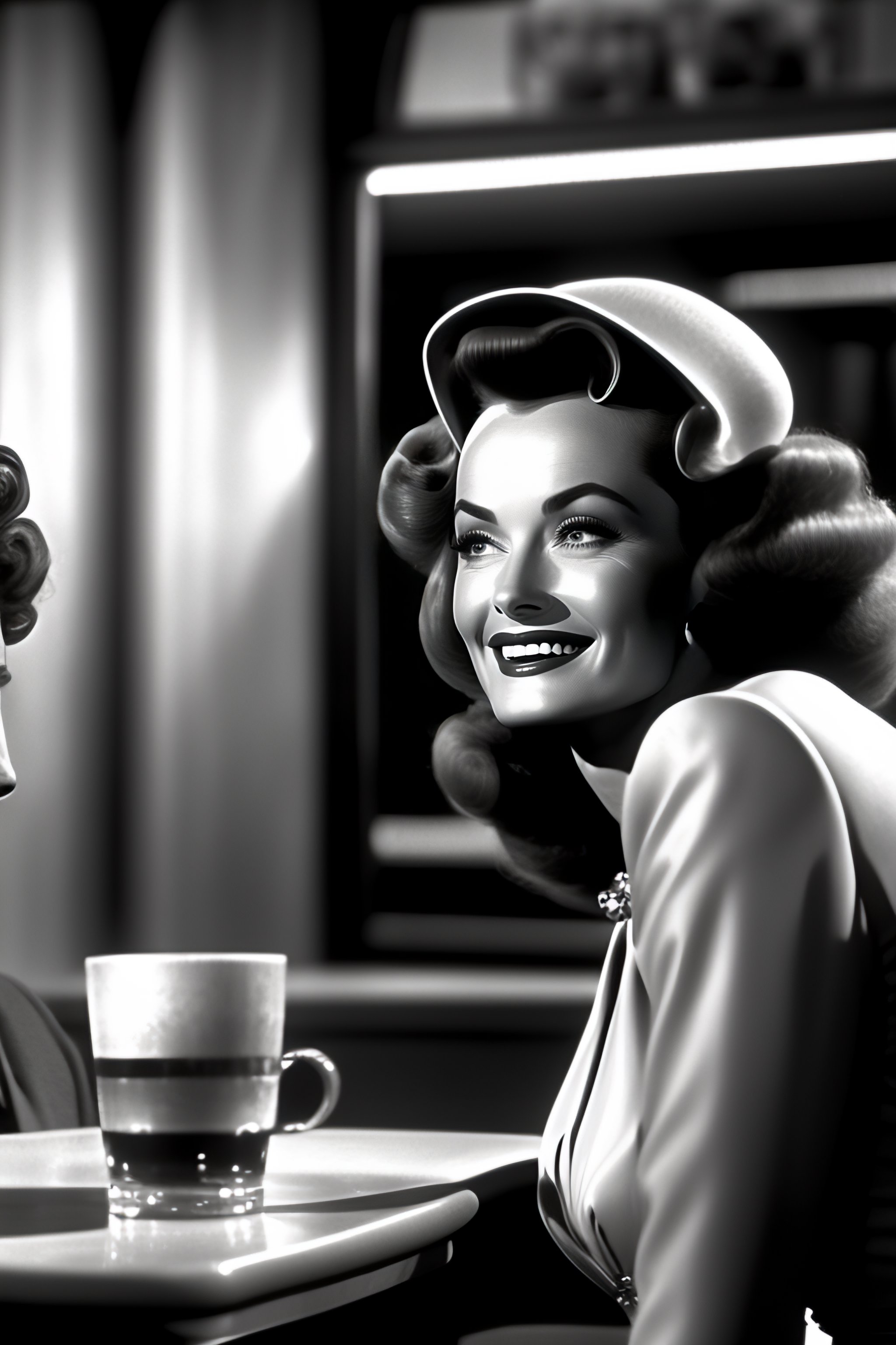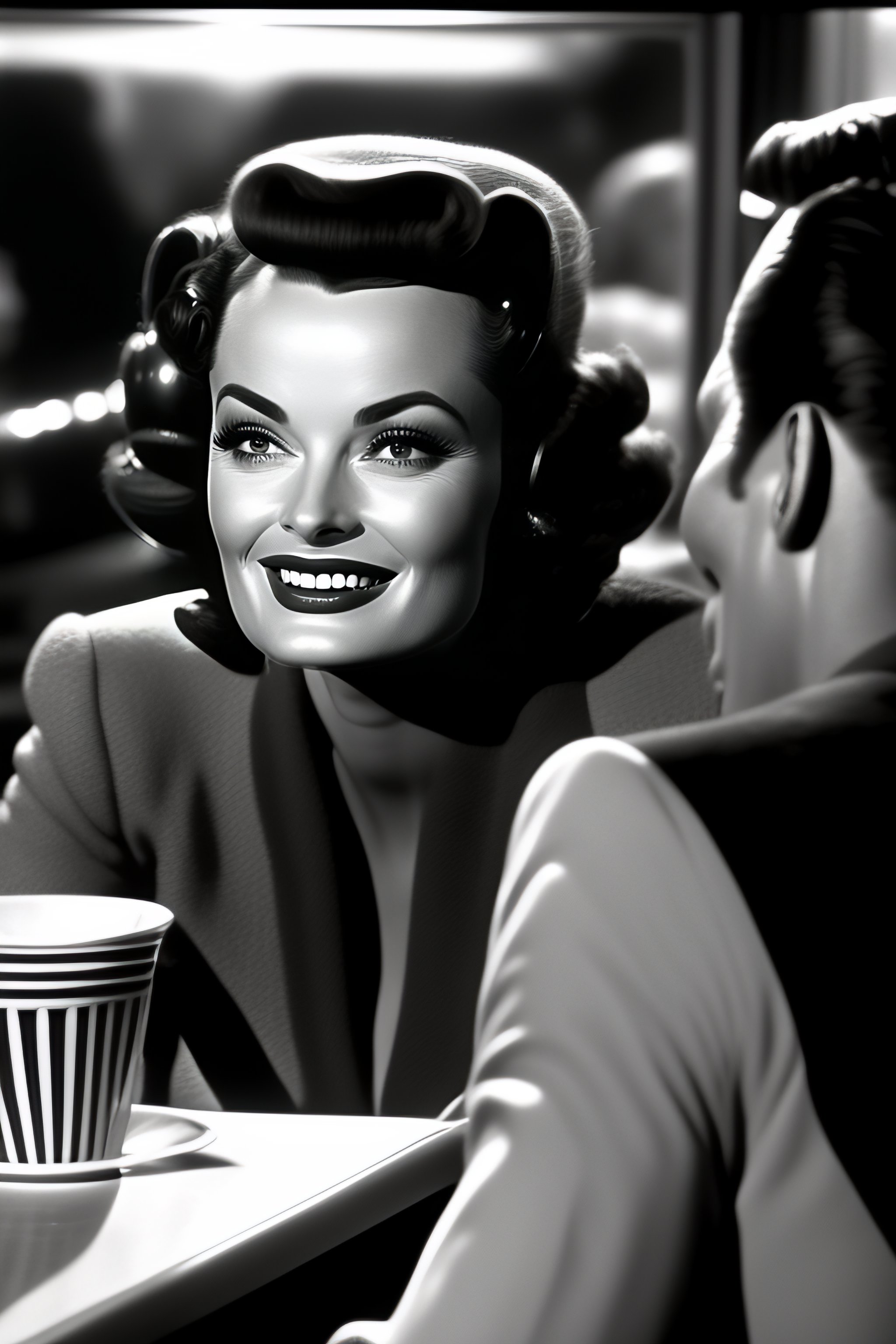 Photo of a space alien smiling at donna reed in a 1950s café