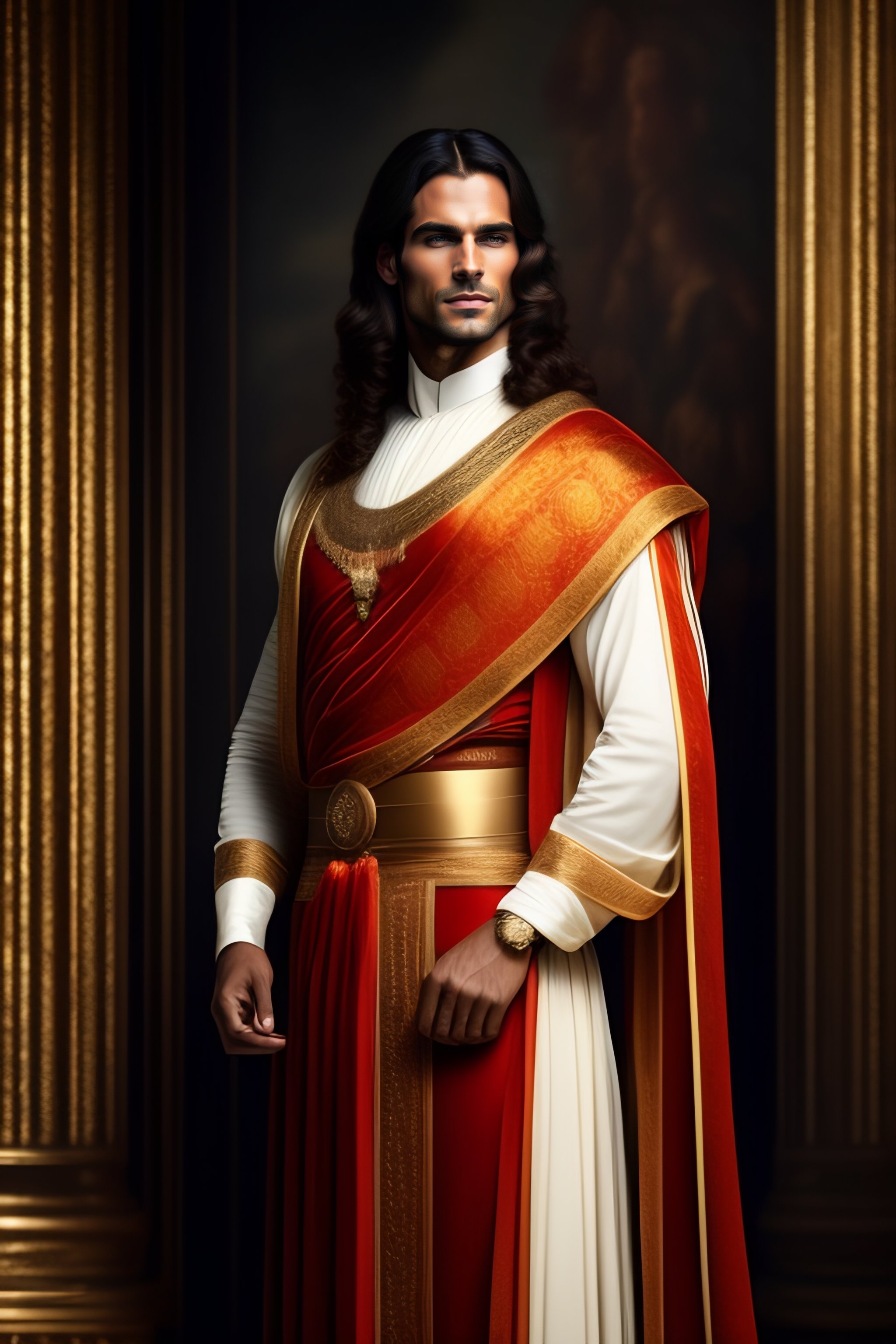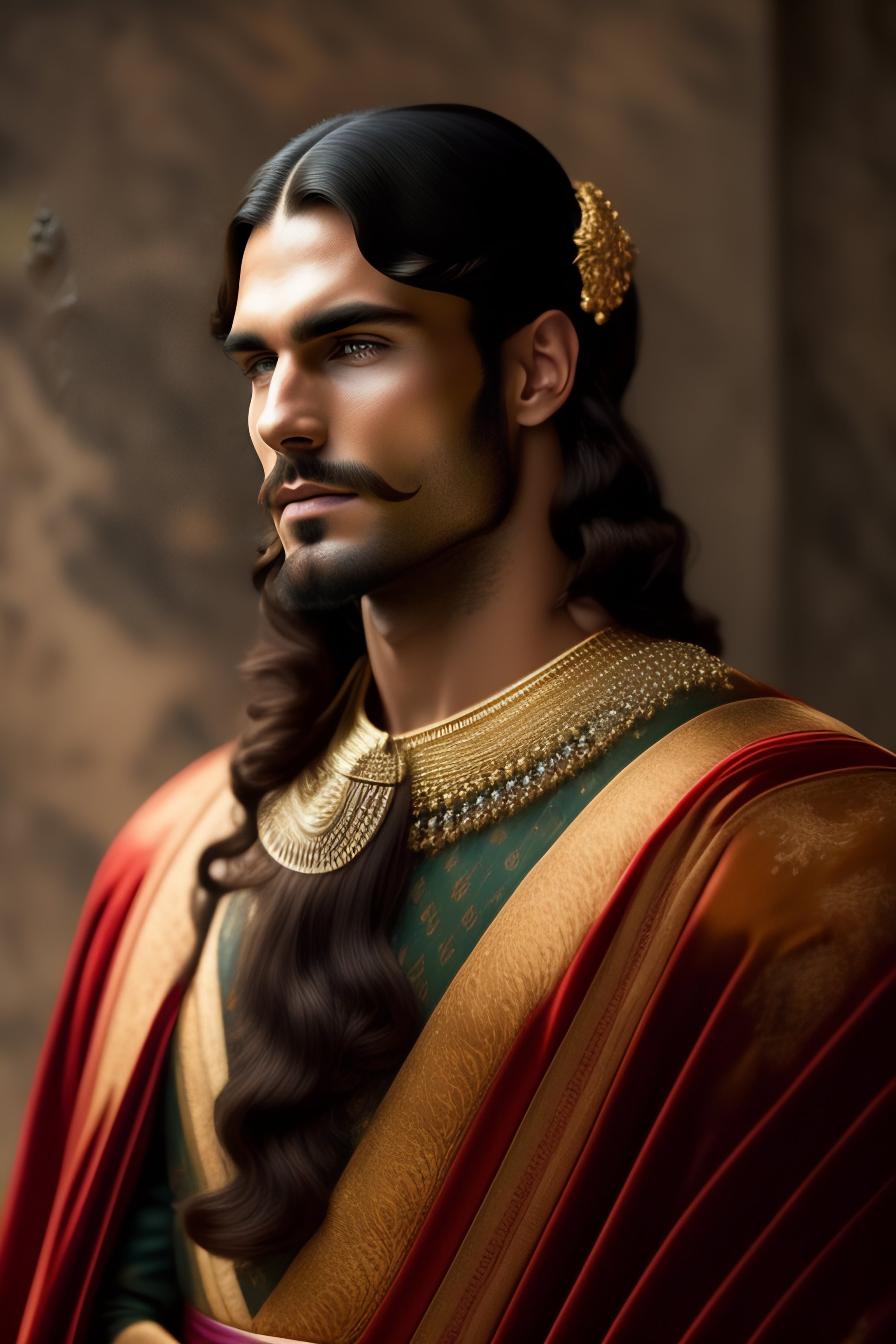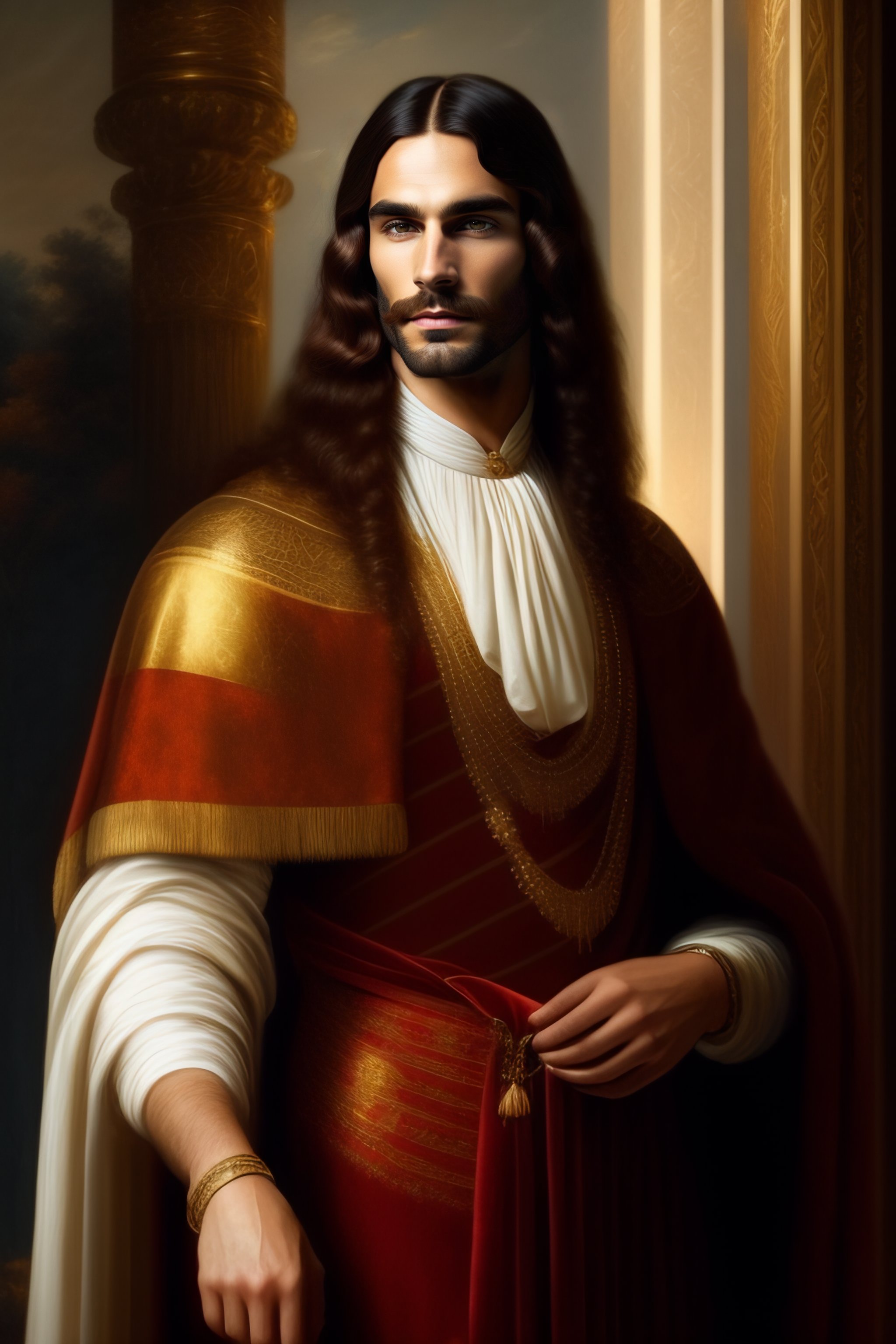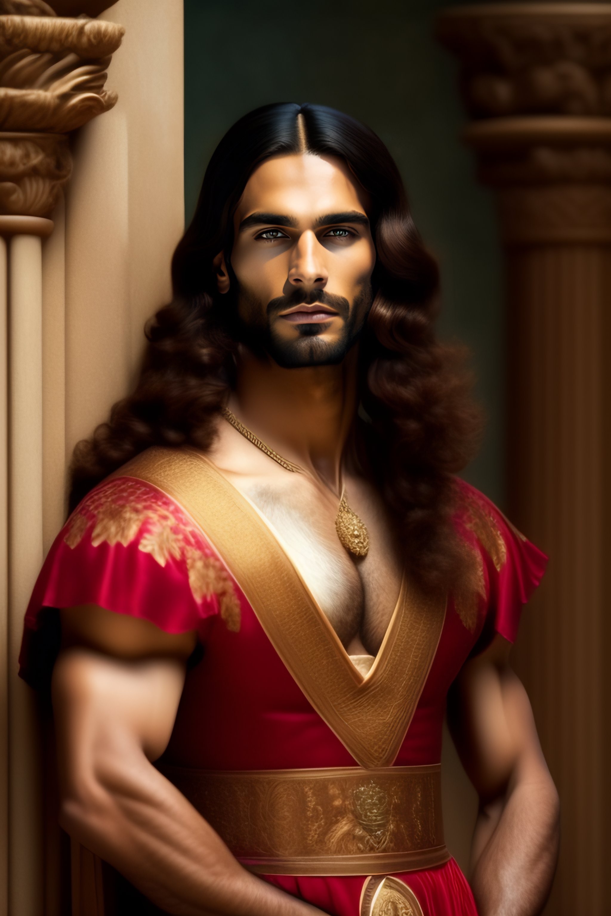 Delicate auspicious man with medium long hair brown in ancient roman dress elegant and beautiful