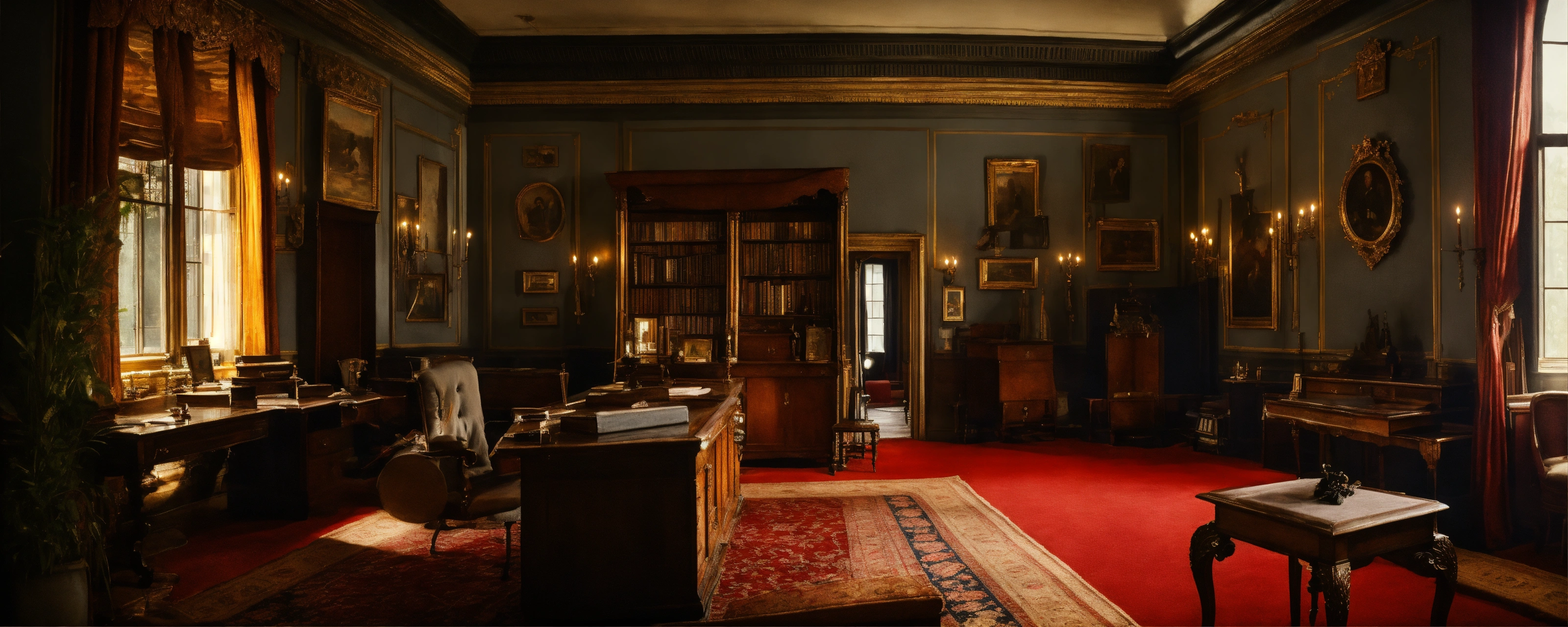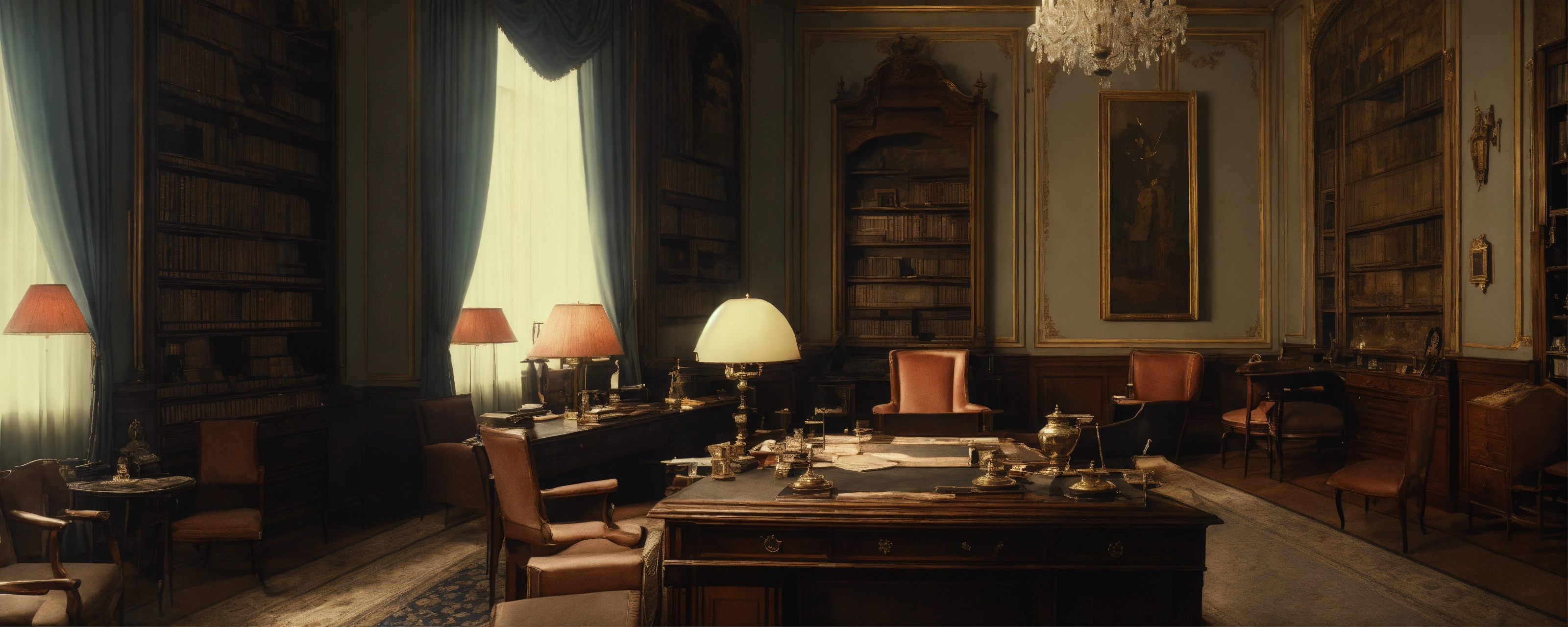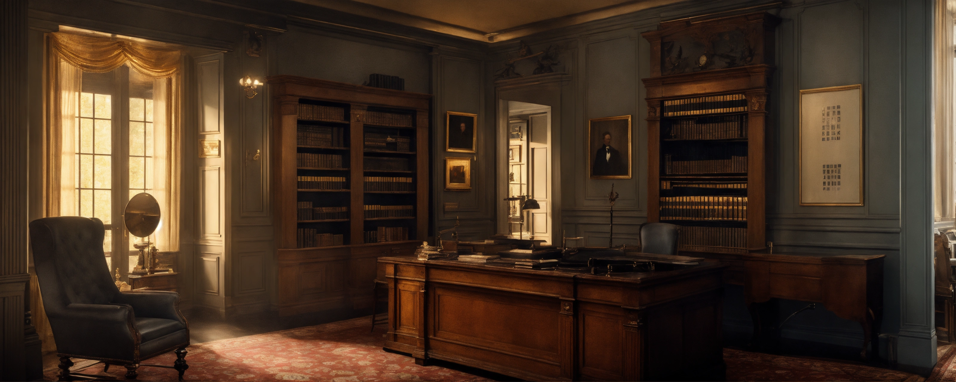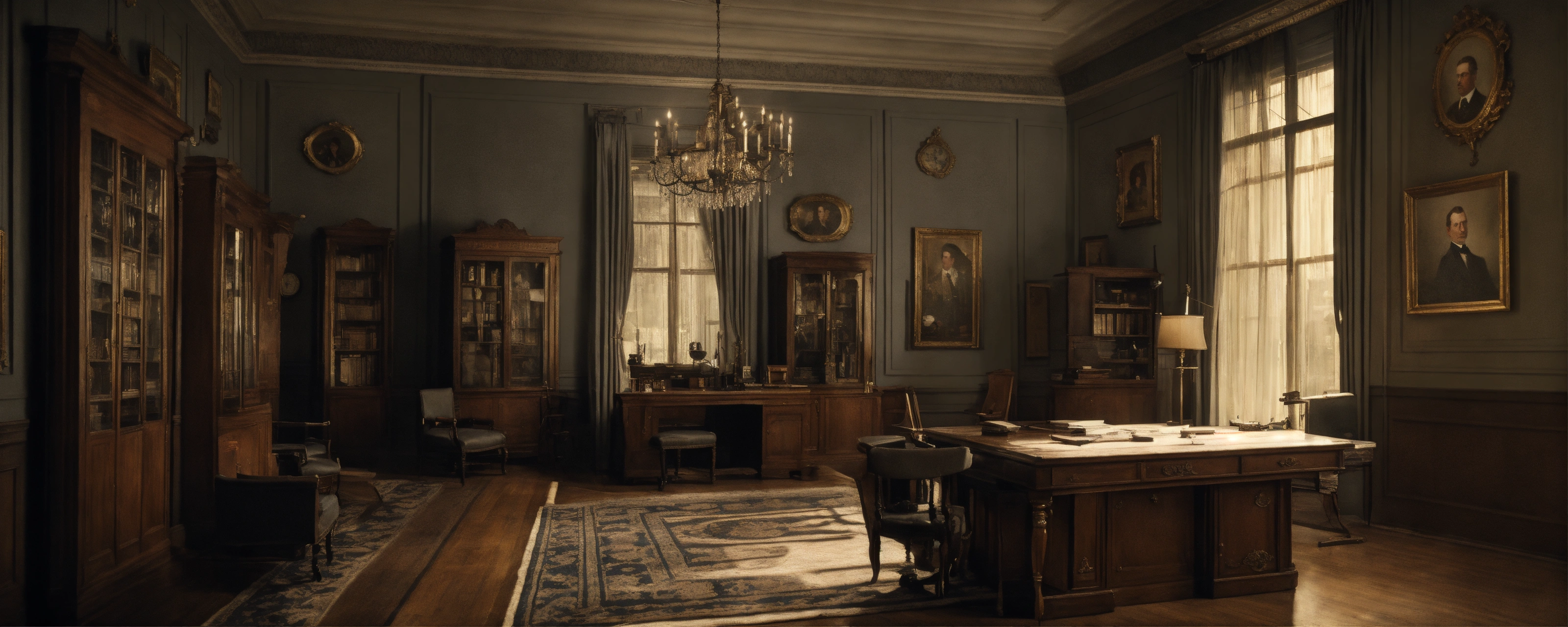 1870, a very beautiful study in the house of a rich government official, there are a lot of antique weapons hanging on the walls, early morning, there are no people, style is a beautiful modern photo chronicle, realism, noir, the color scheme is gray