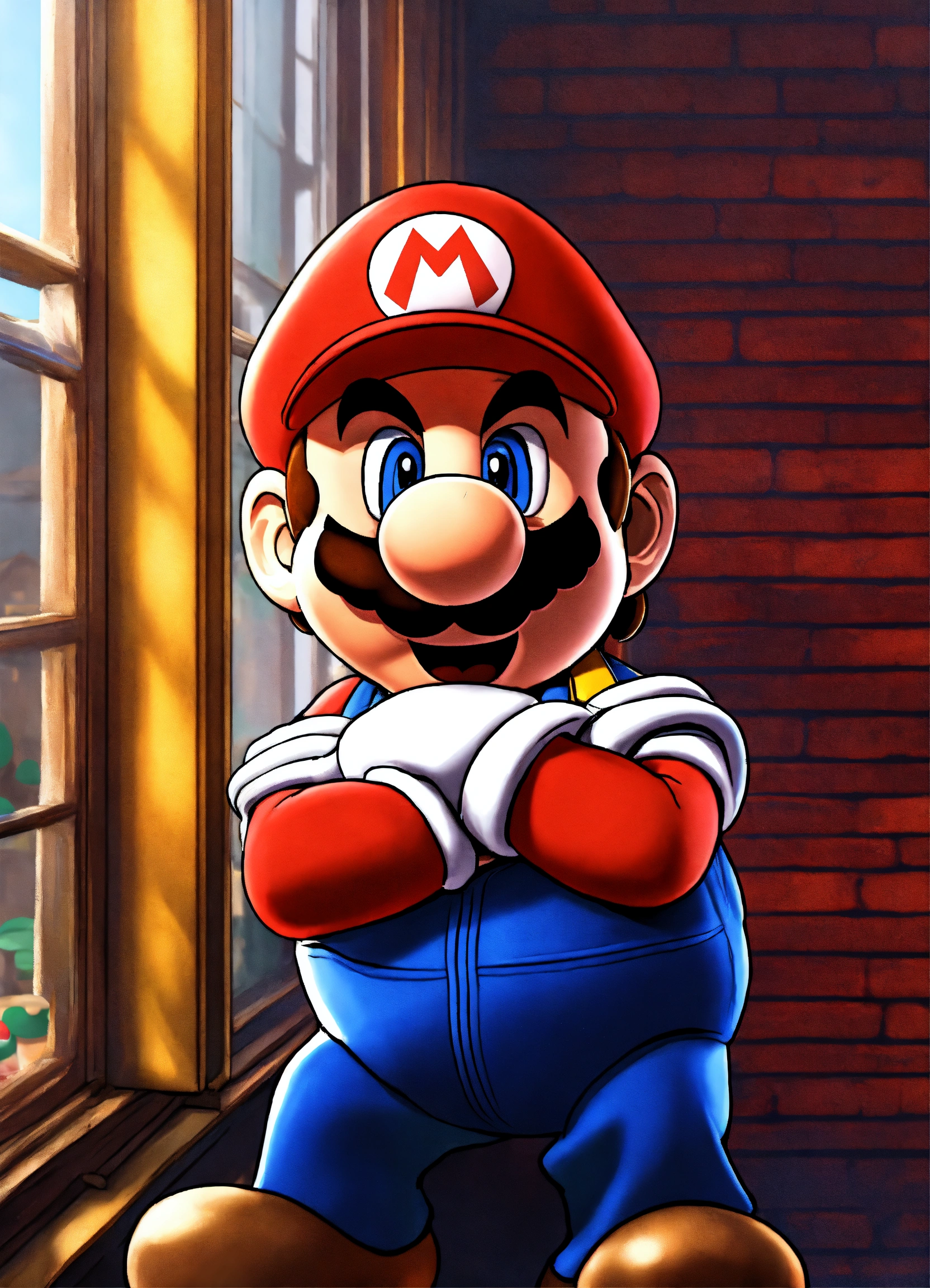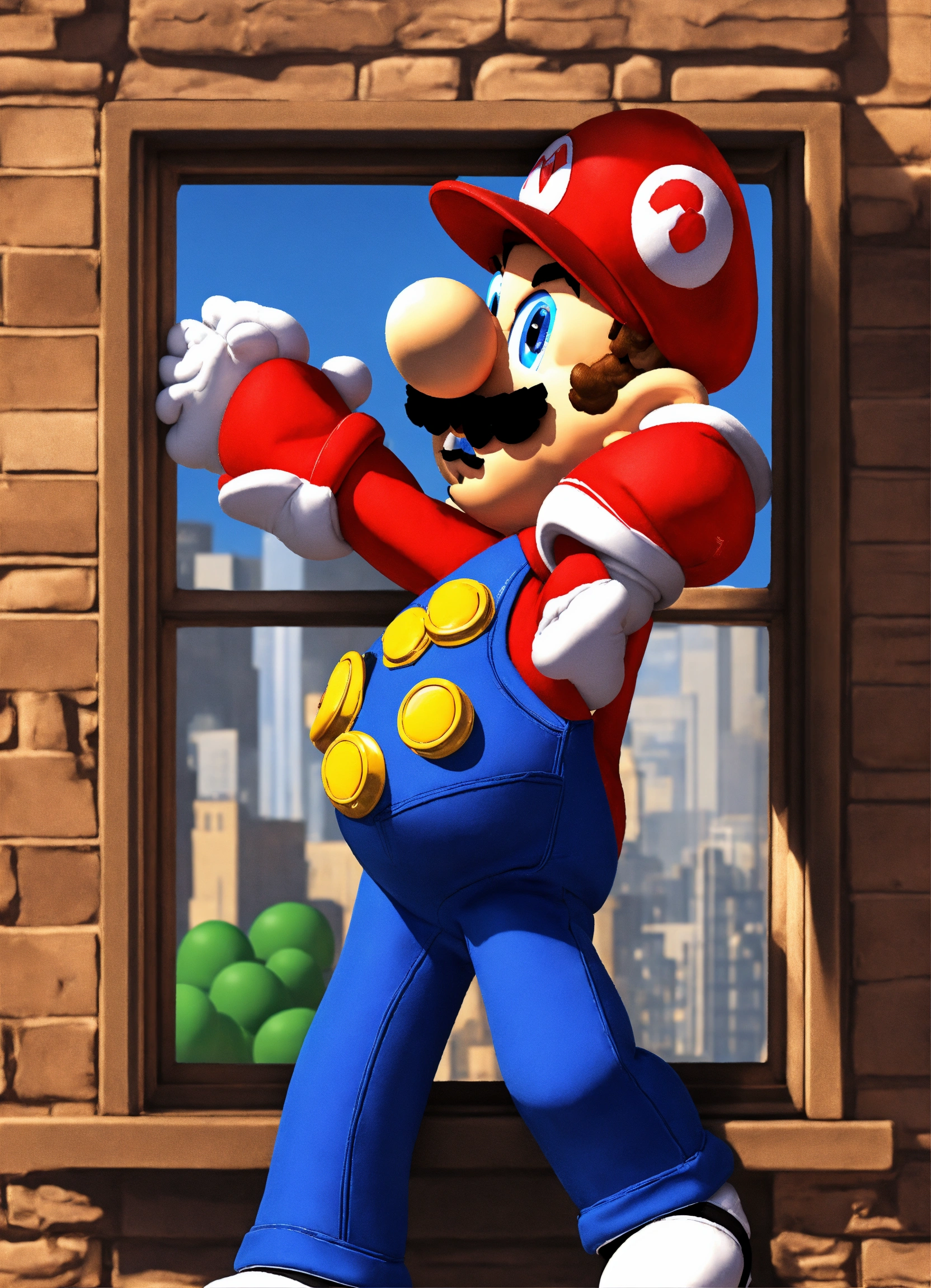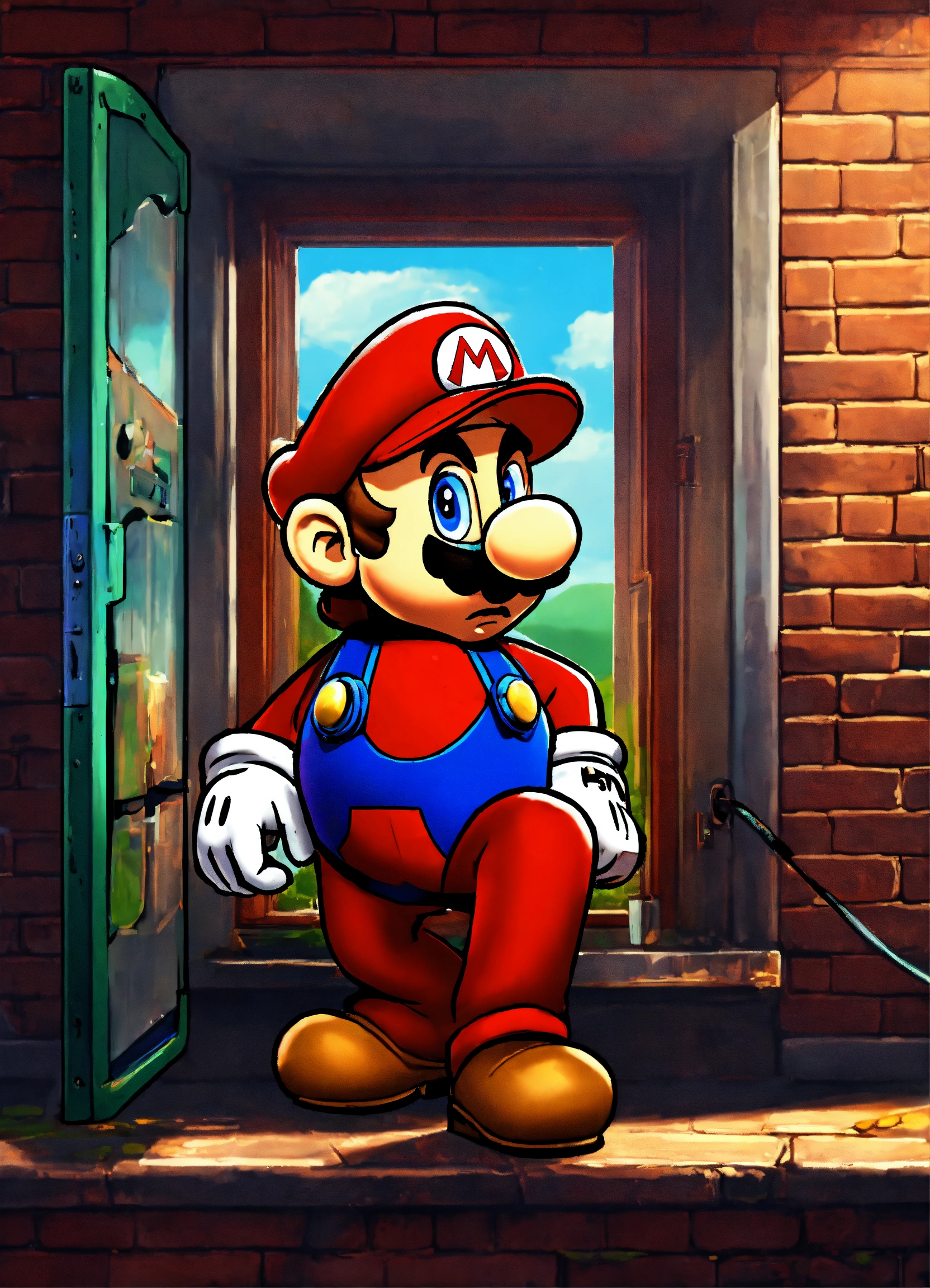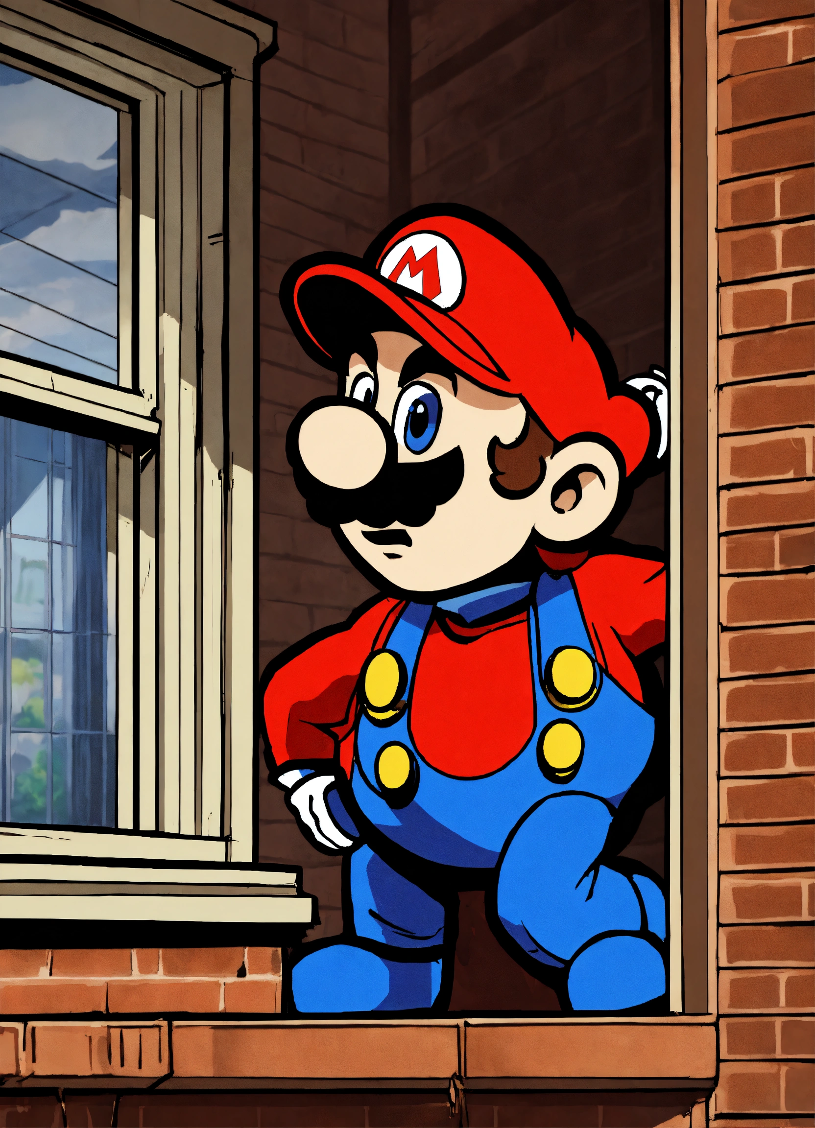 Mario from super mario dress in hip hop gear staring at a window disappointed