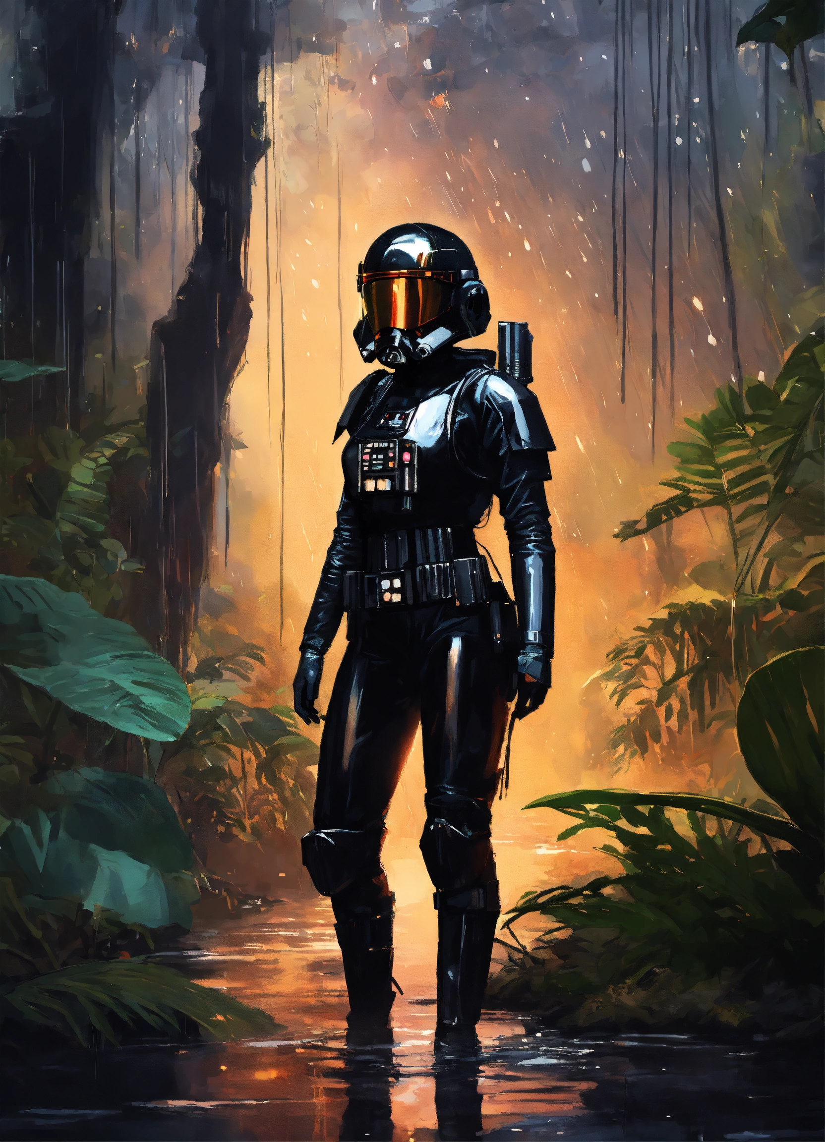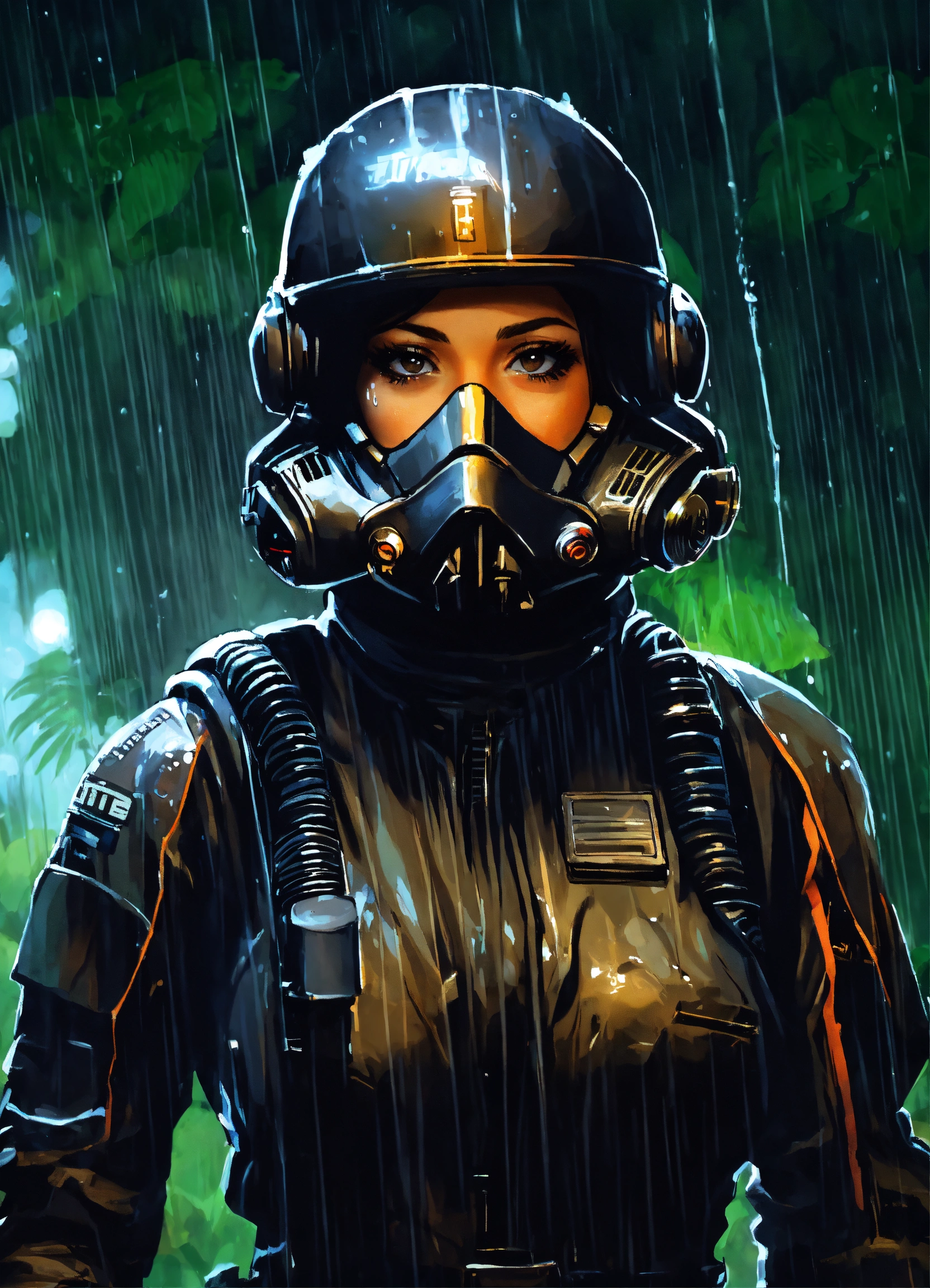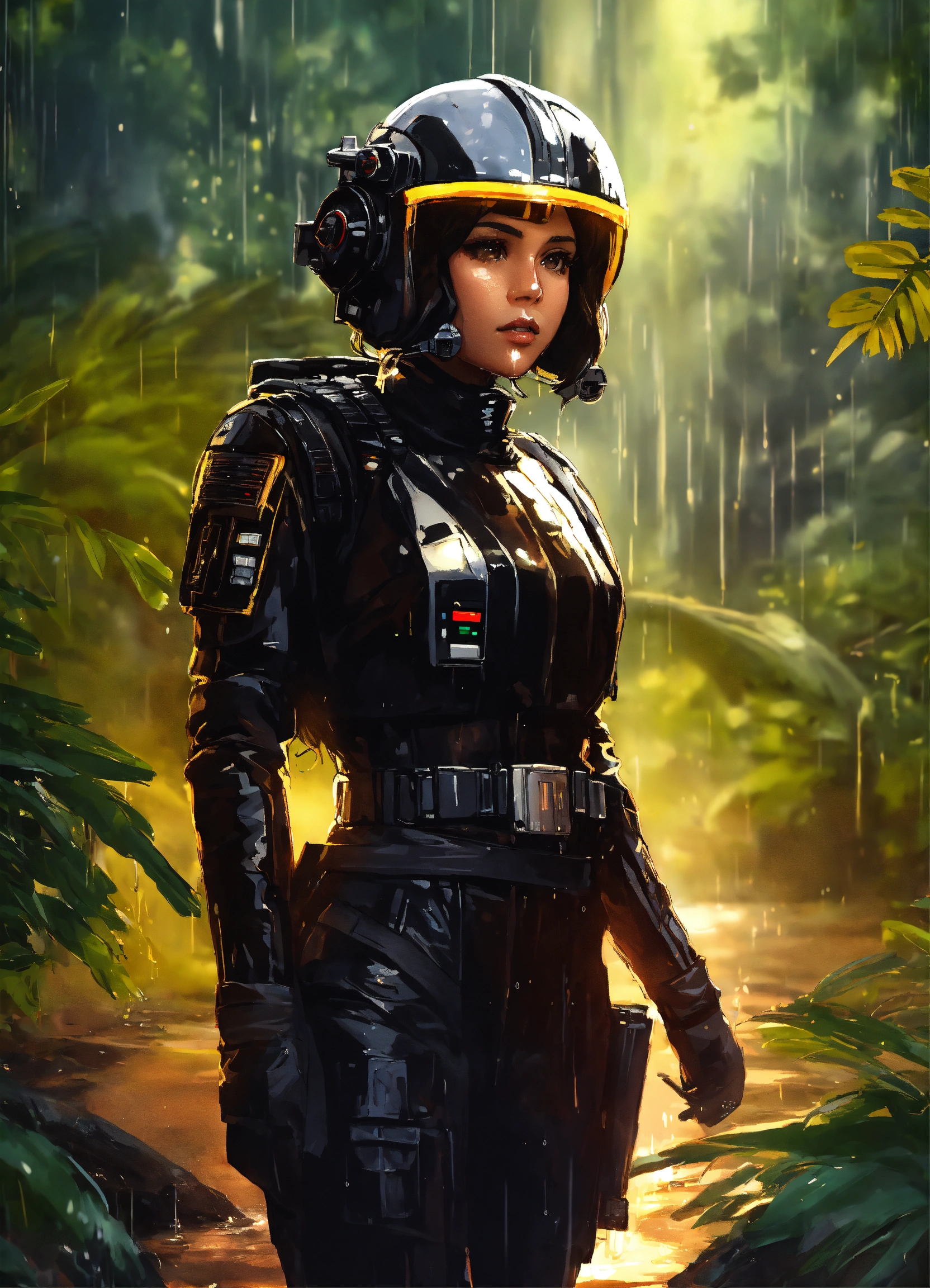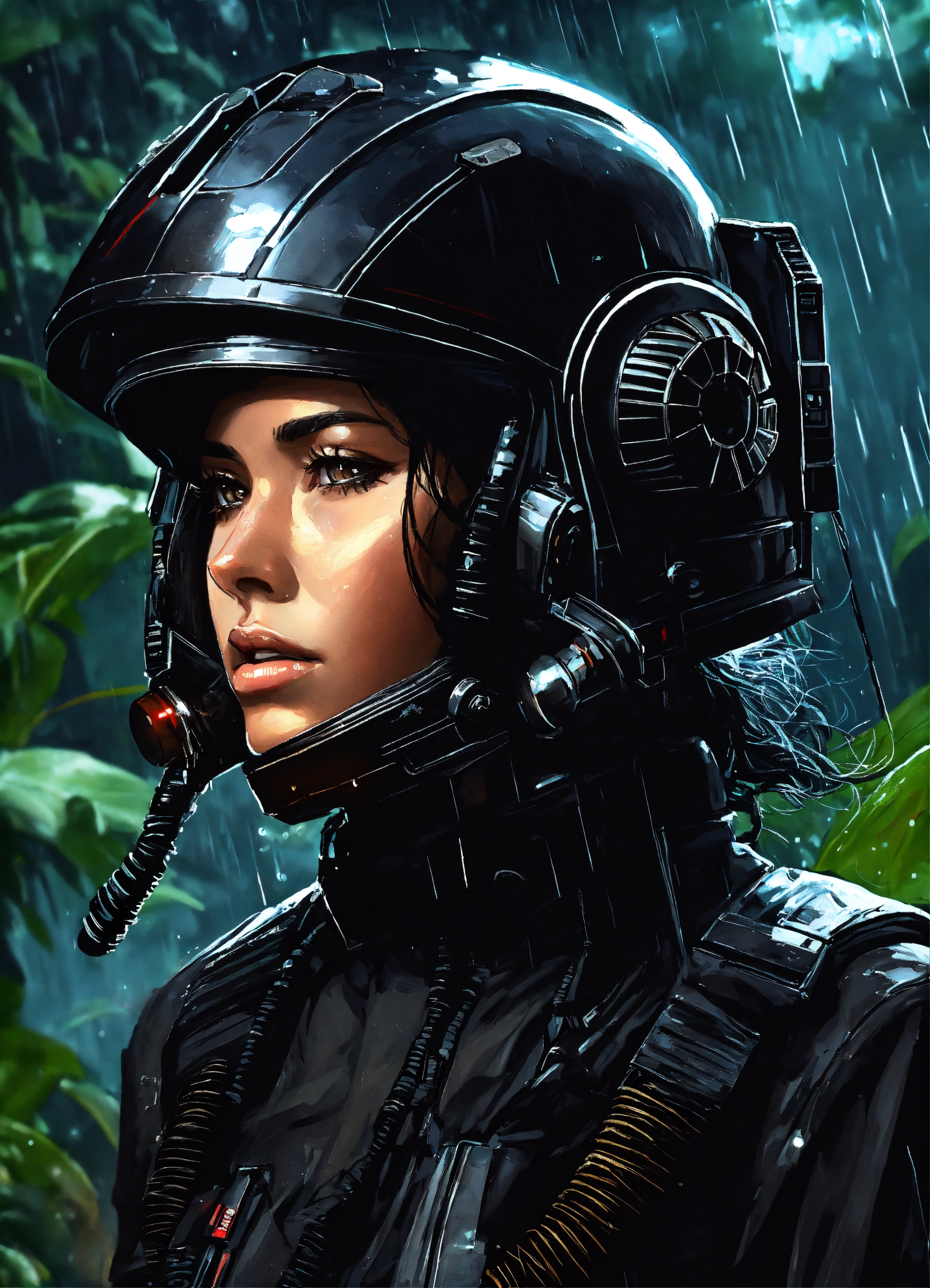 Digital art of a female star wars imperial tie pilot with long wet black hair, brown eyes, in a black flight suit, in the jungle mud and rain at night.