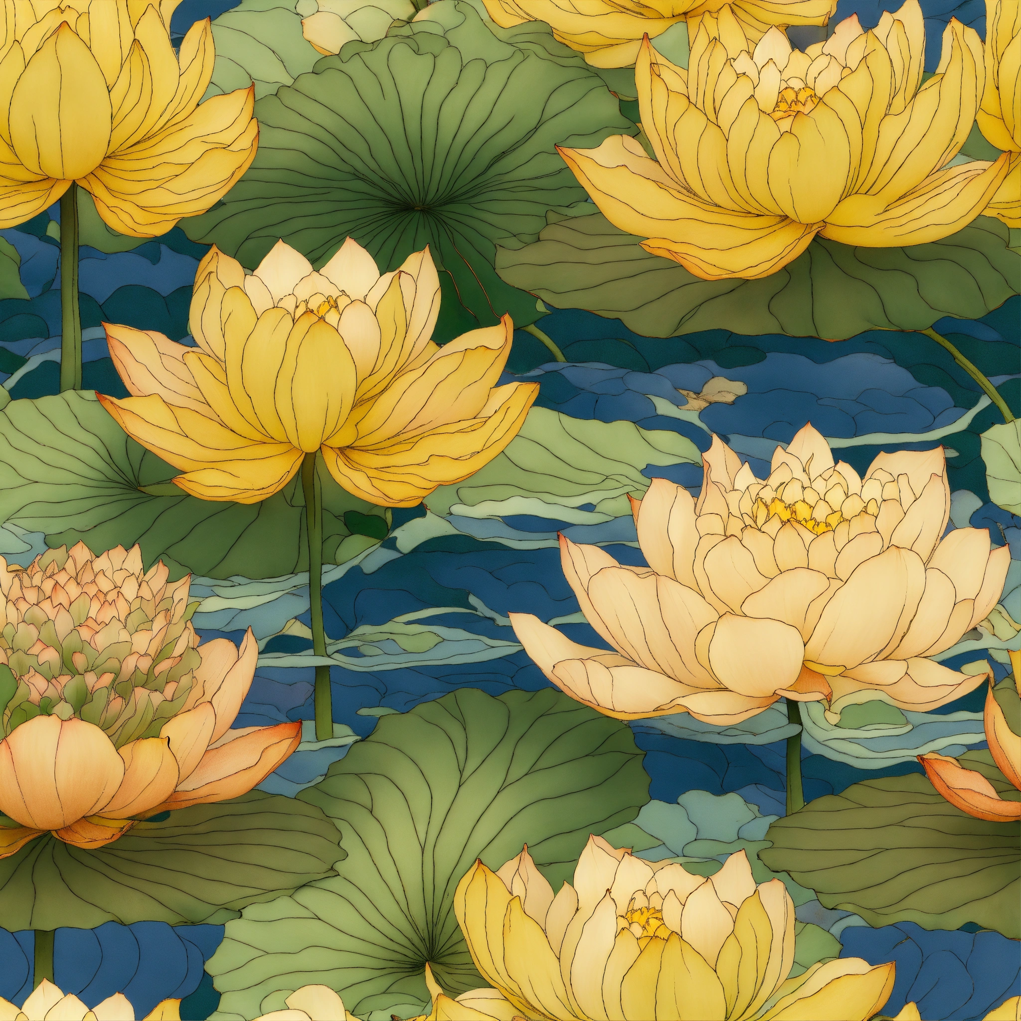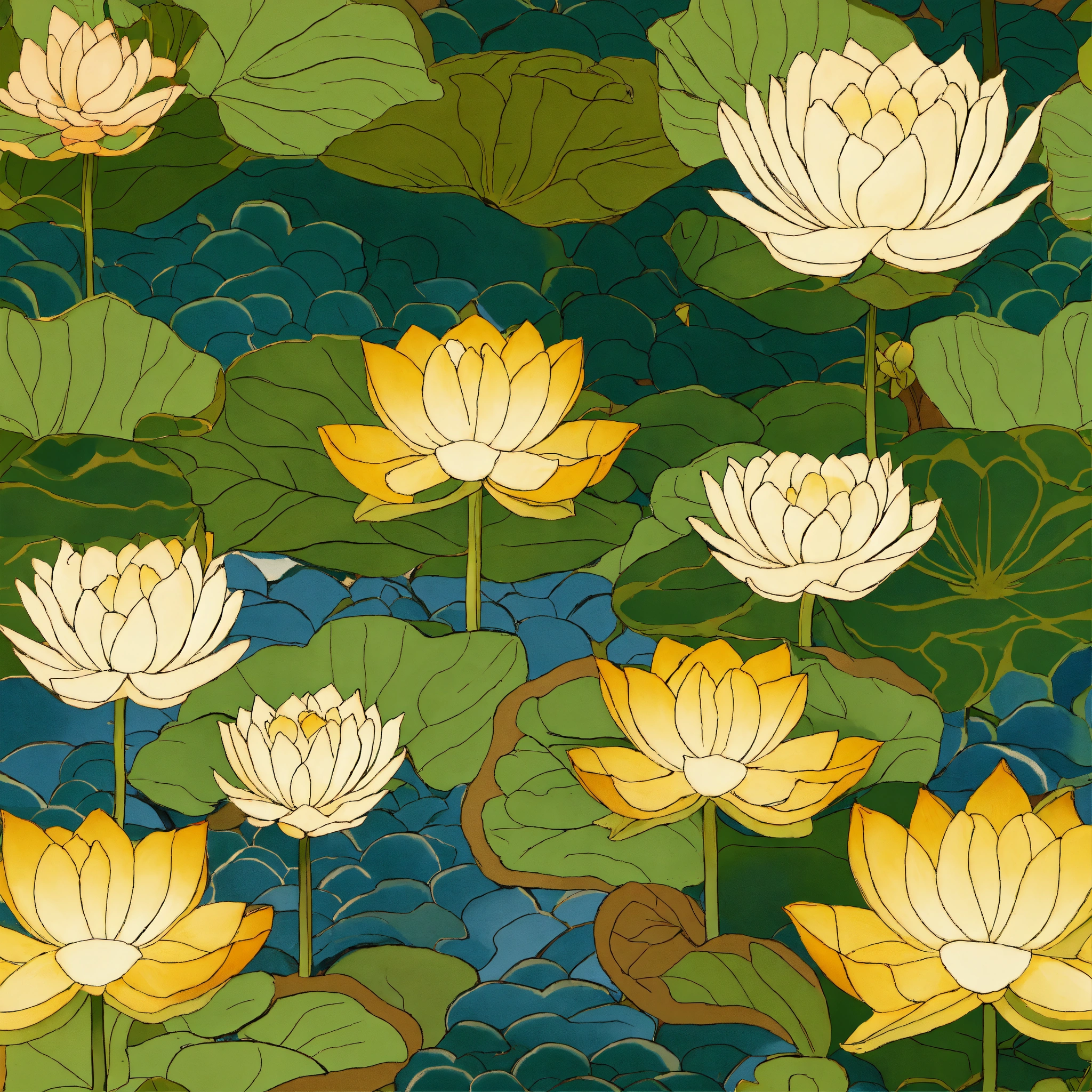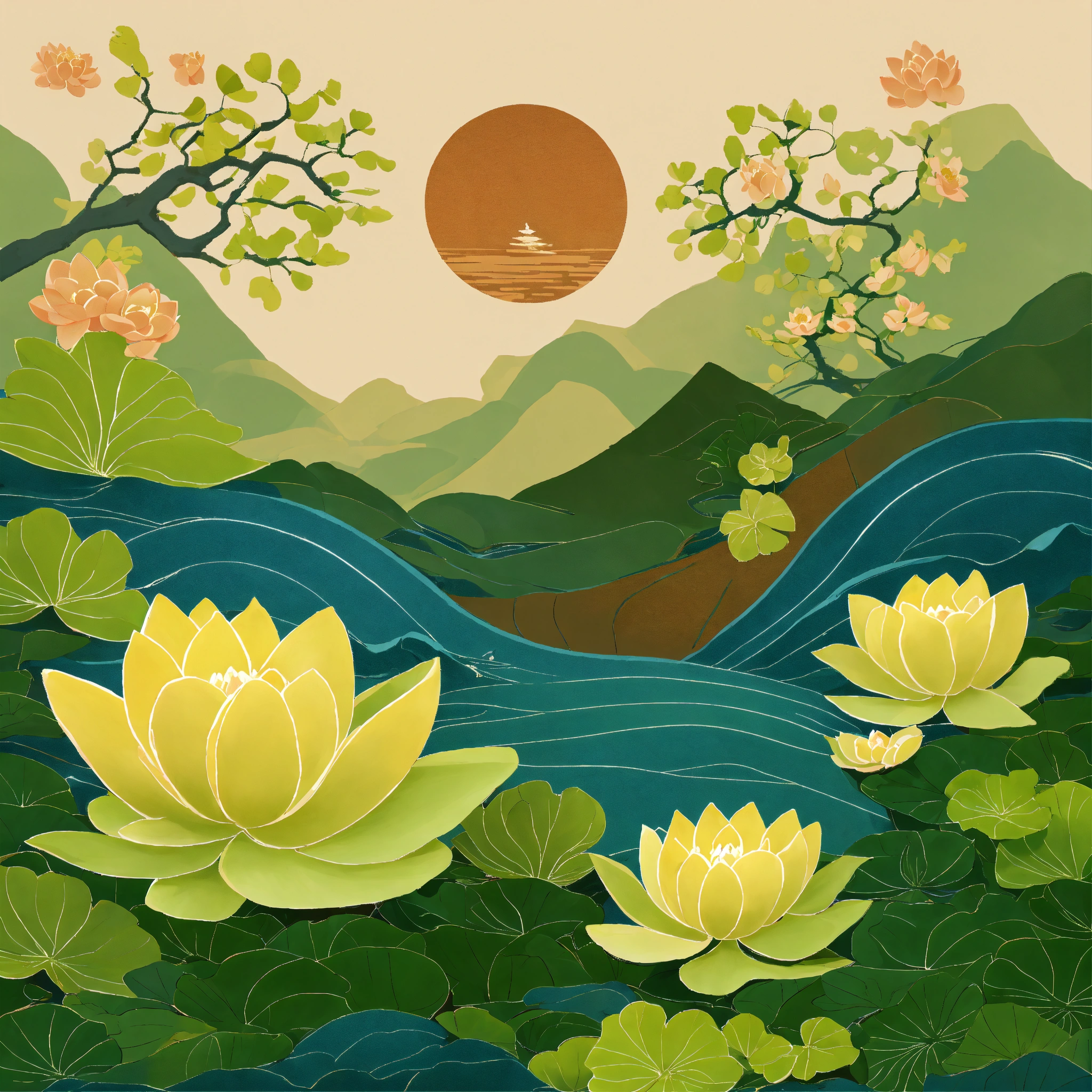 A japanese wave of zen with green vines with green heart shaped leaves in the background. use colours green colour #468c5c, yellow colour #f5c24f, cream colour #f2e5ba, blue colour #0894a7. i earthy autumnal colours. lots of lotus flowers