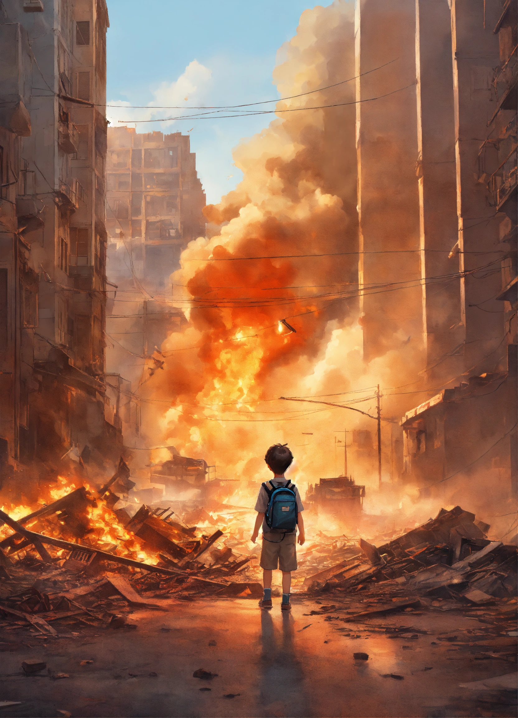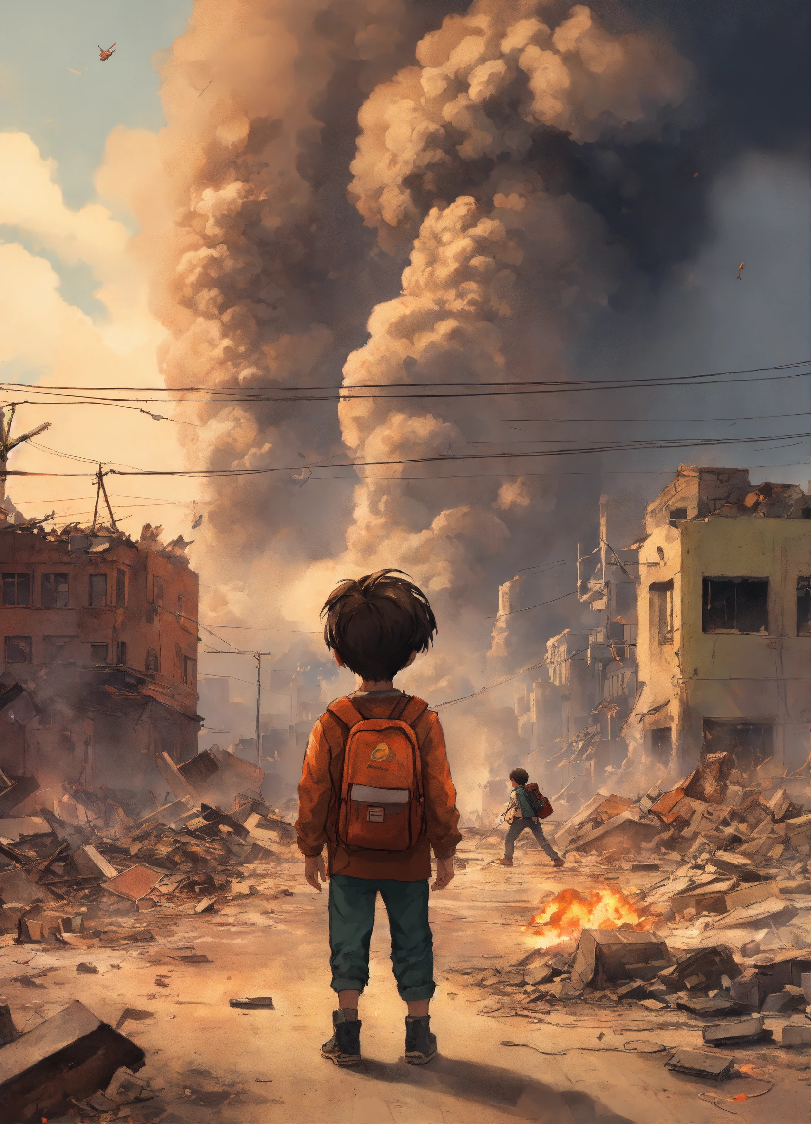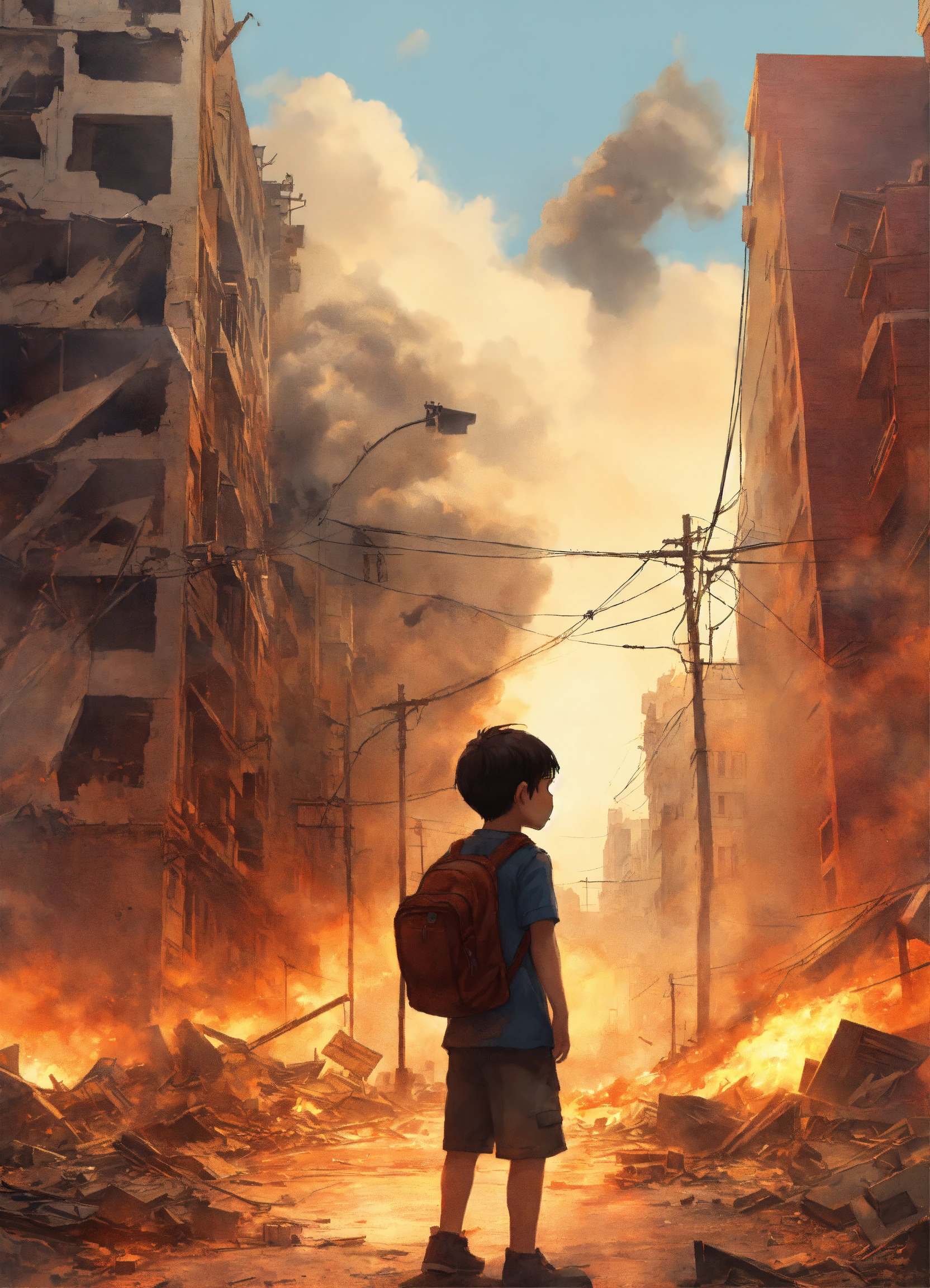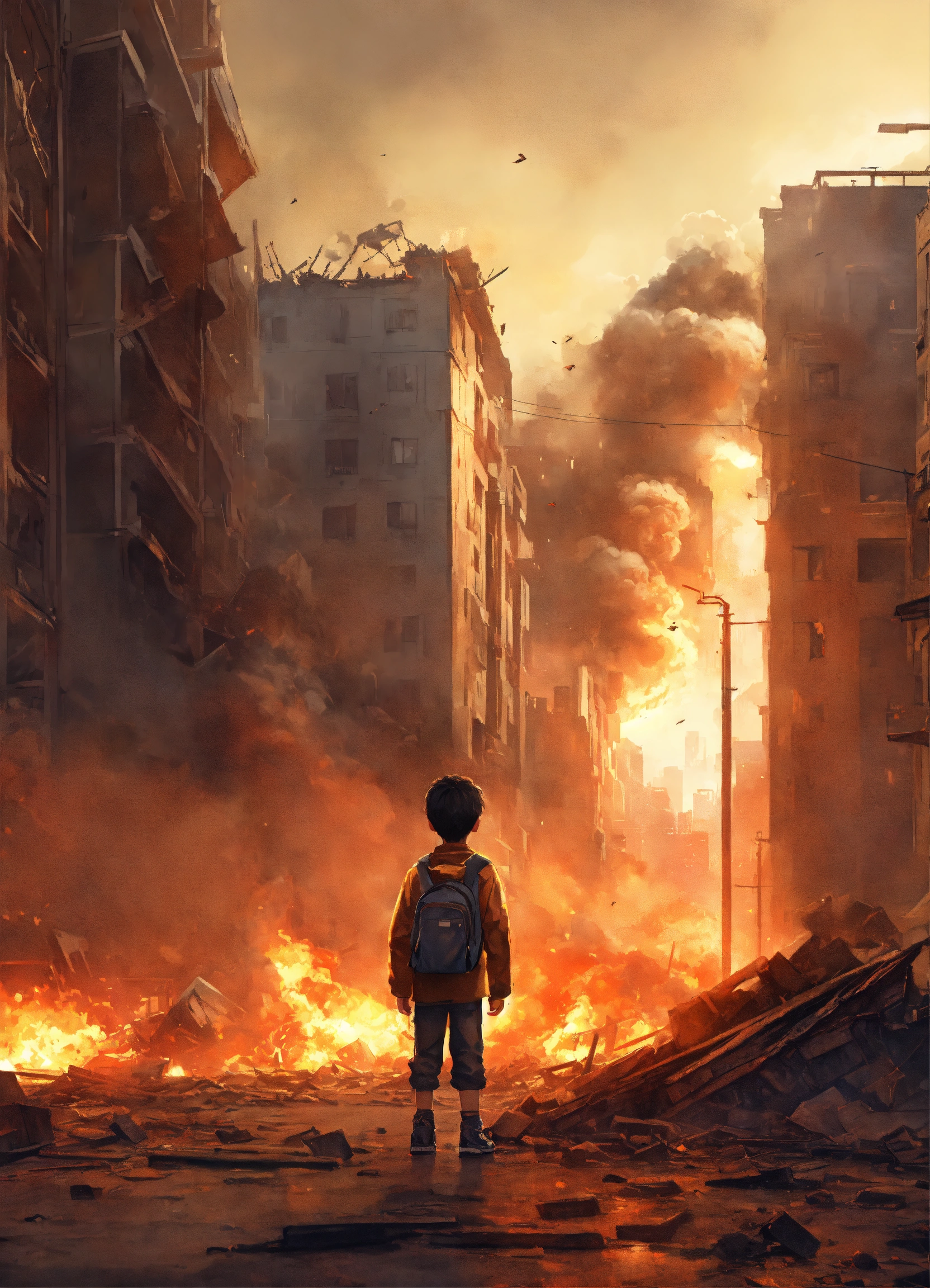 Illustration, concept art, kid, set down on the ground, a lot of buildings destroyed،smoke, destruction around the boy, --ar 916