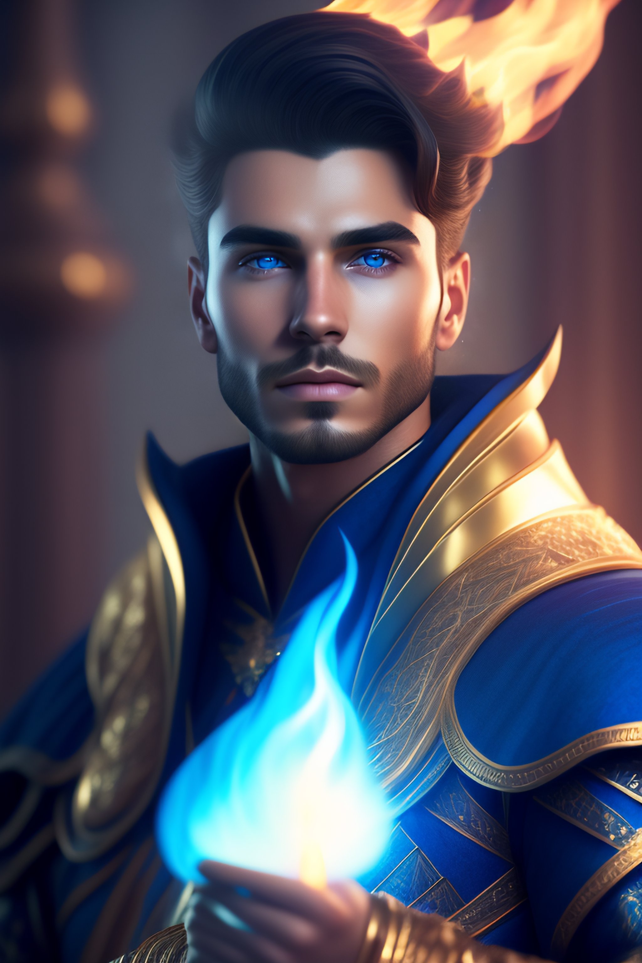 Beautiful portrait of a young male wizard wearing a fancy blue tunic casting fire magic, detailed deep gold eyes, sharp focus, illustration, octane render, 4 k, radiant light