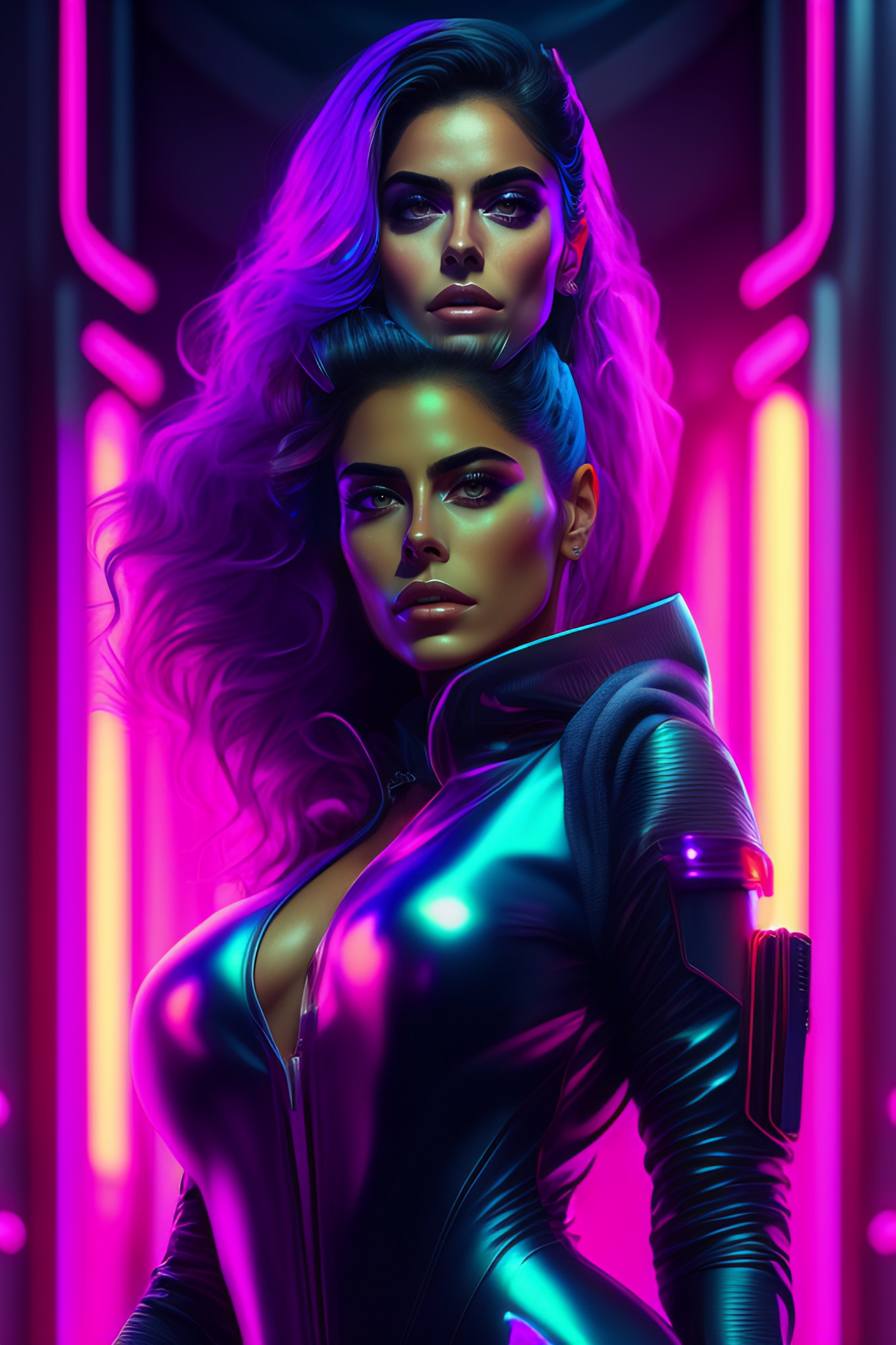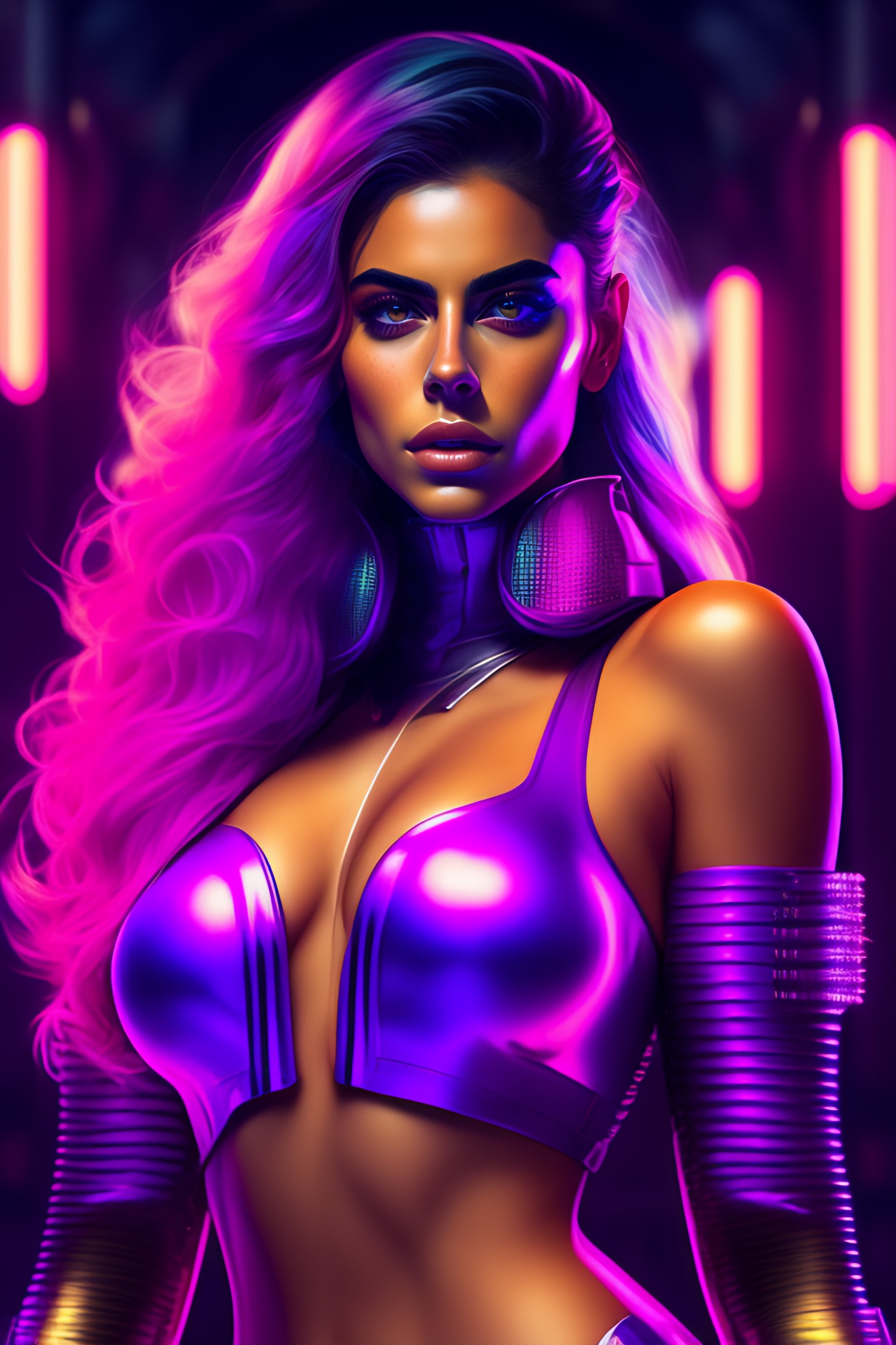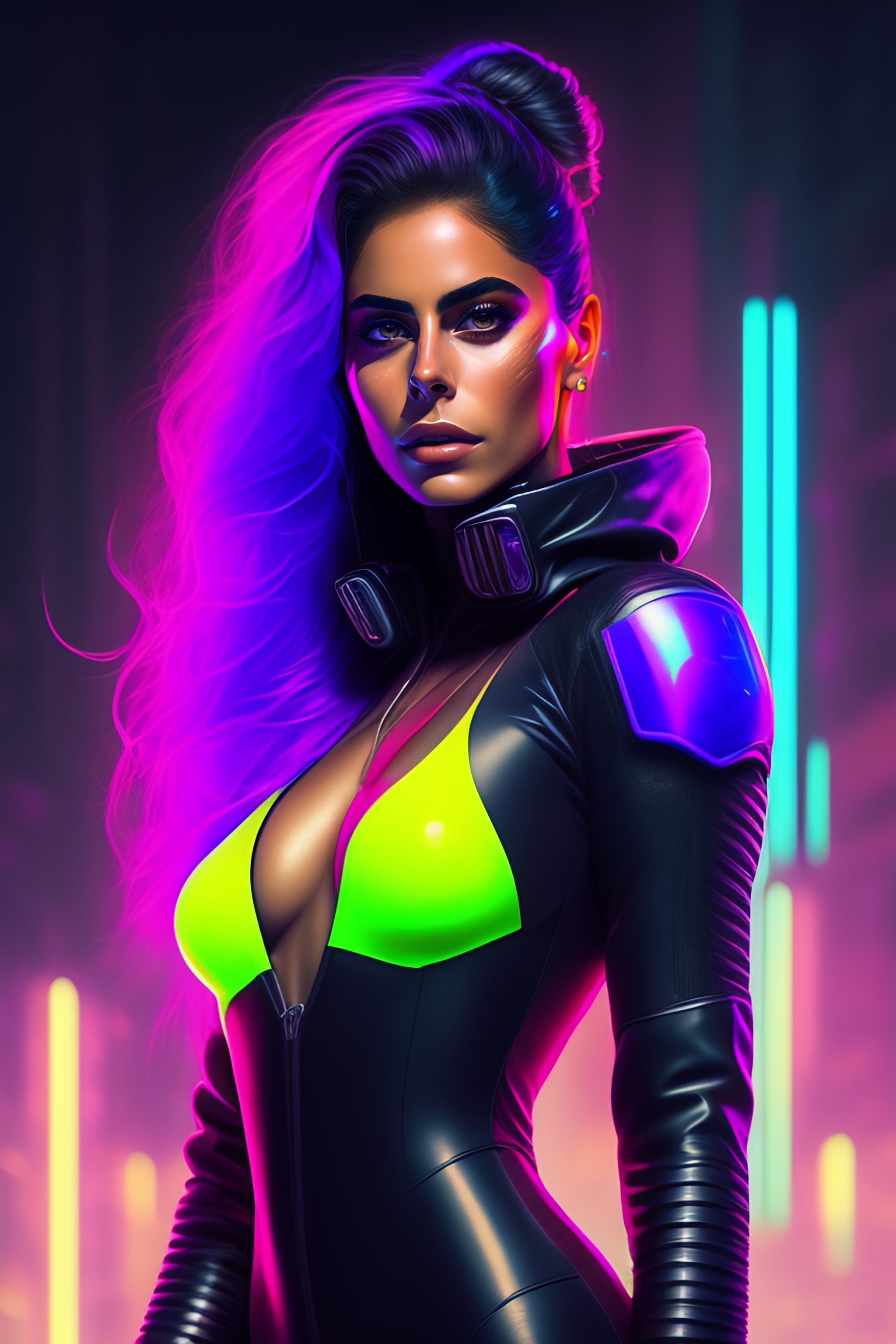 Lorenza izzo, detailed full body portrait neon operator girl, cyberpunk futuristic neon, reflective bikini catsuit, by ismail inceoglu dragan bibin hans thoma greg rutkowski alexandros pyromallis nekro rene maritte illustrated, perfect face, fine details, realistic shaded, fine-face, pretty face, purple aqua gradient hair