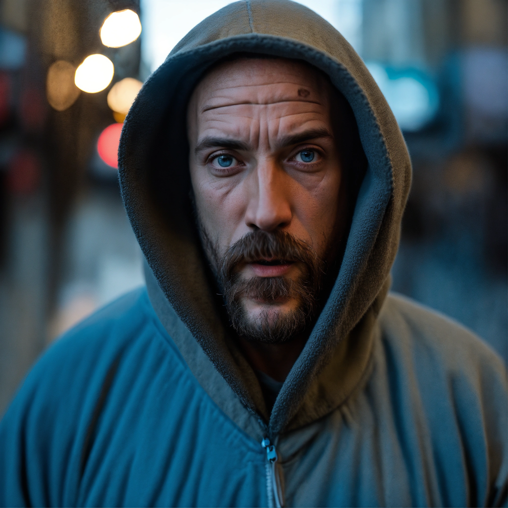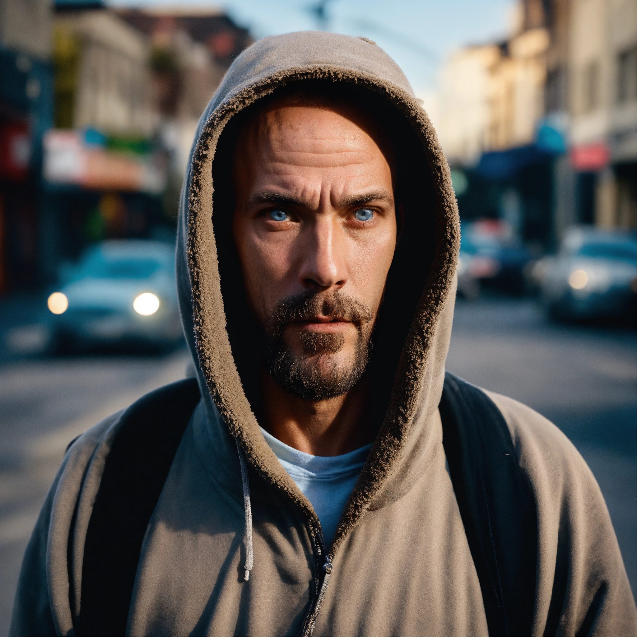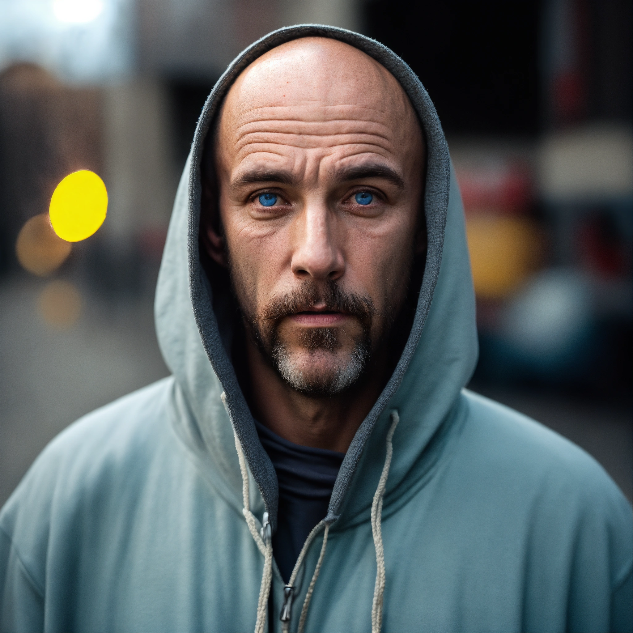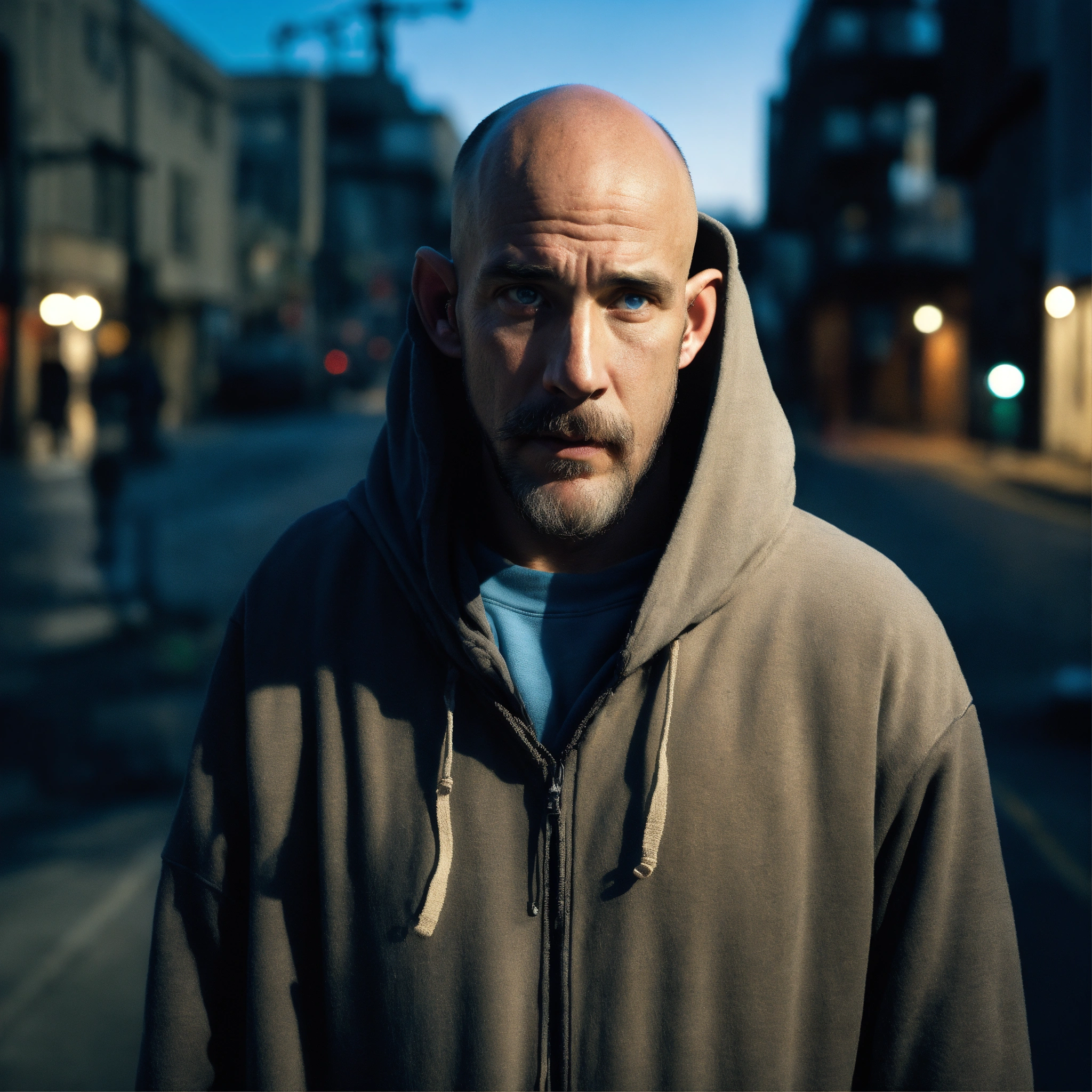 A huge homeless man with a huge lumpy bald head, a tiny goatee, no mustache, protruding forehead, sunken light grayish-blue eyes, crooked mouth, large ears, wearing a hoodie up over his head, standing at a distance out in the street