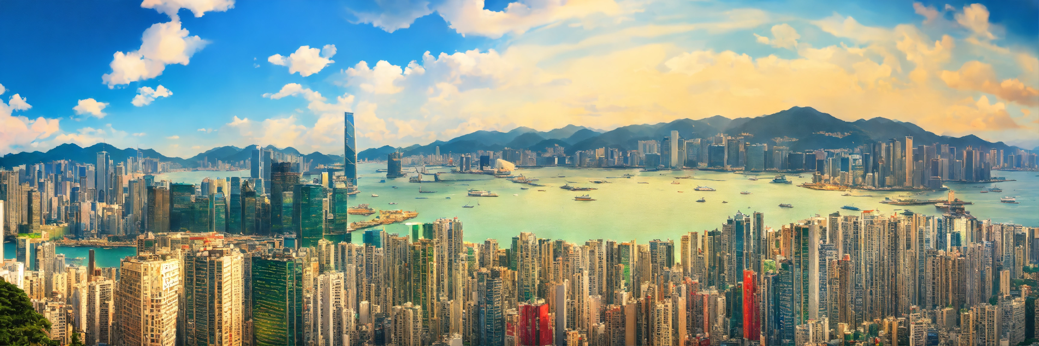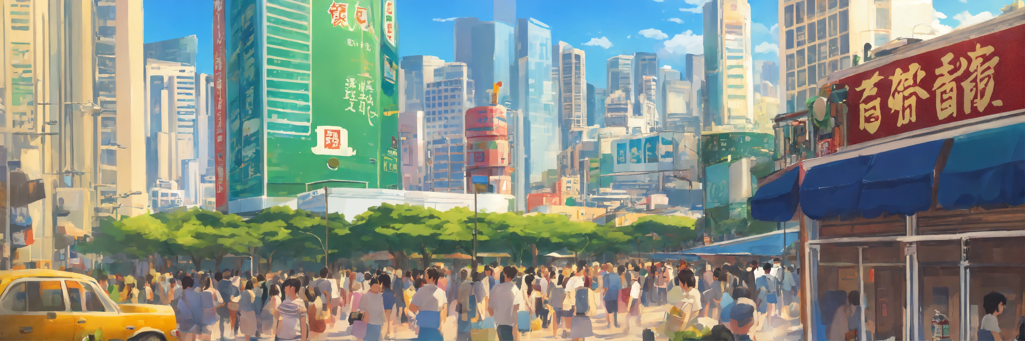 One soft drink can foreground, tsim sha tsui background, cityscape, ghibli style, crowded, prosperous, sunny day, sunshine