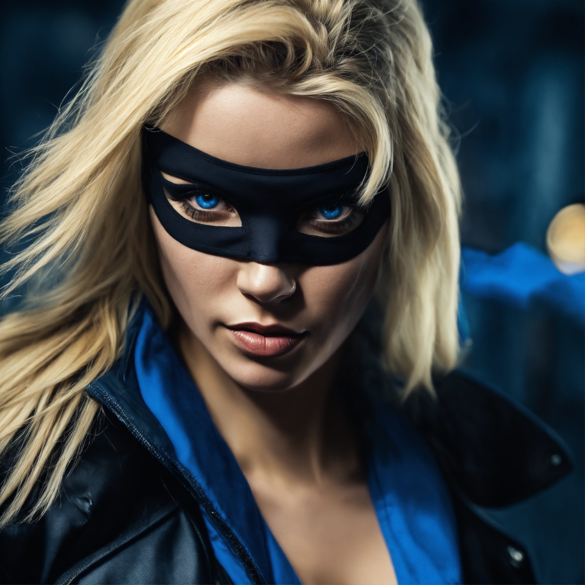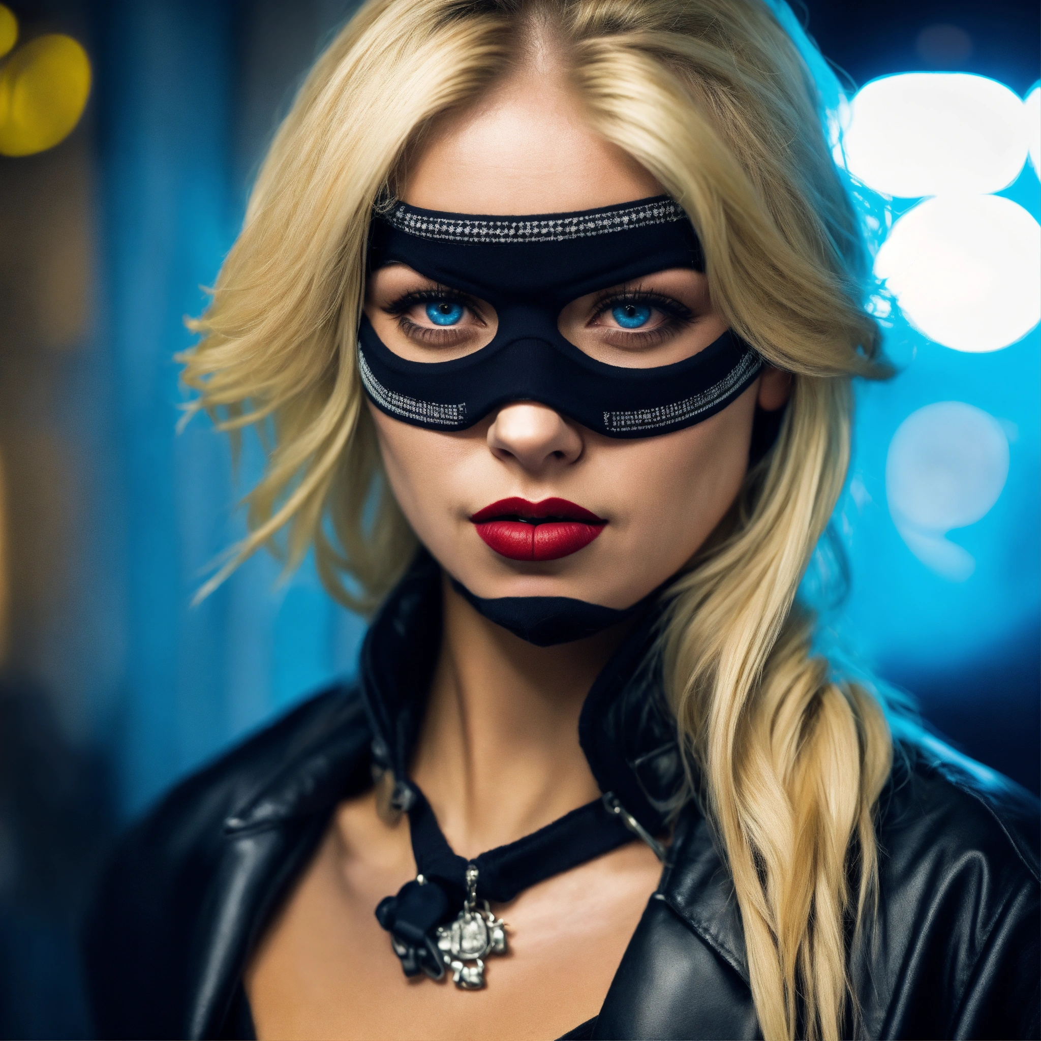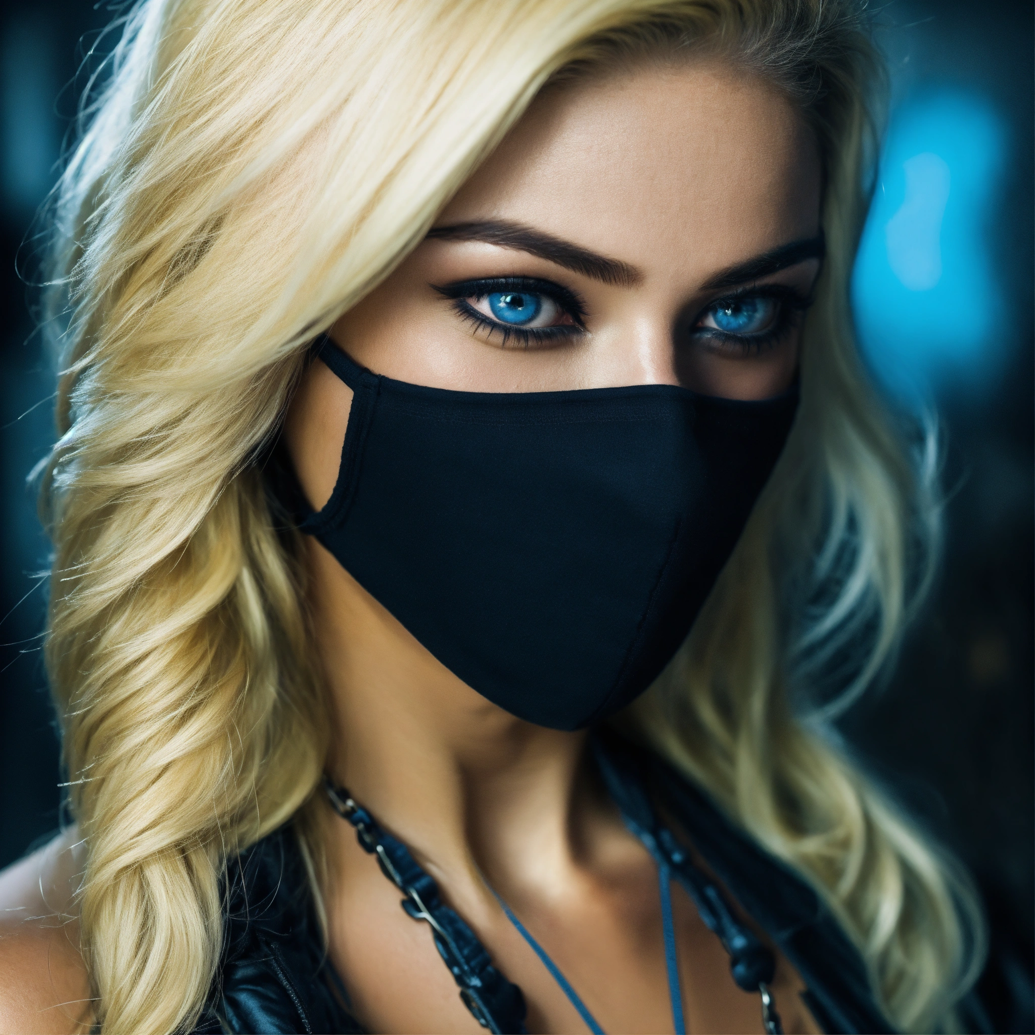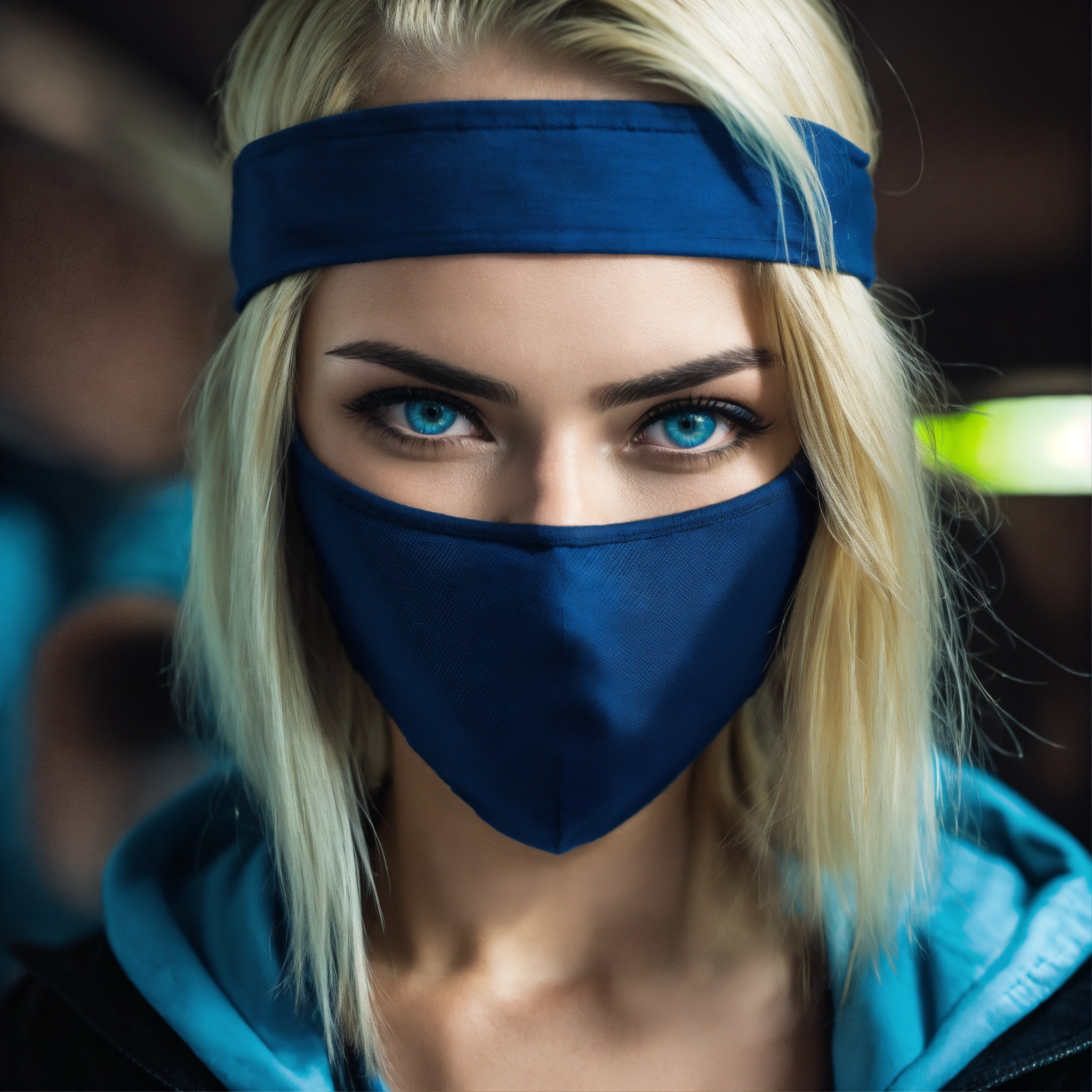 Criminal gangster woman with blue eyes a skimask and blonde haire