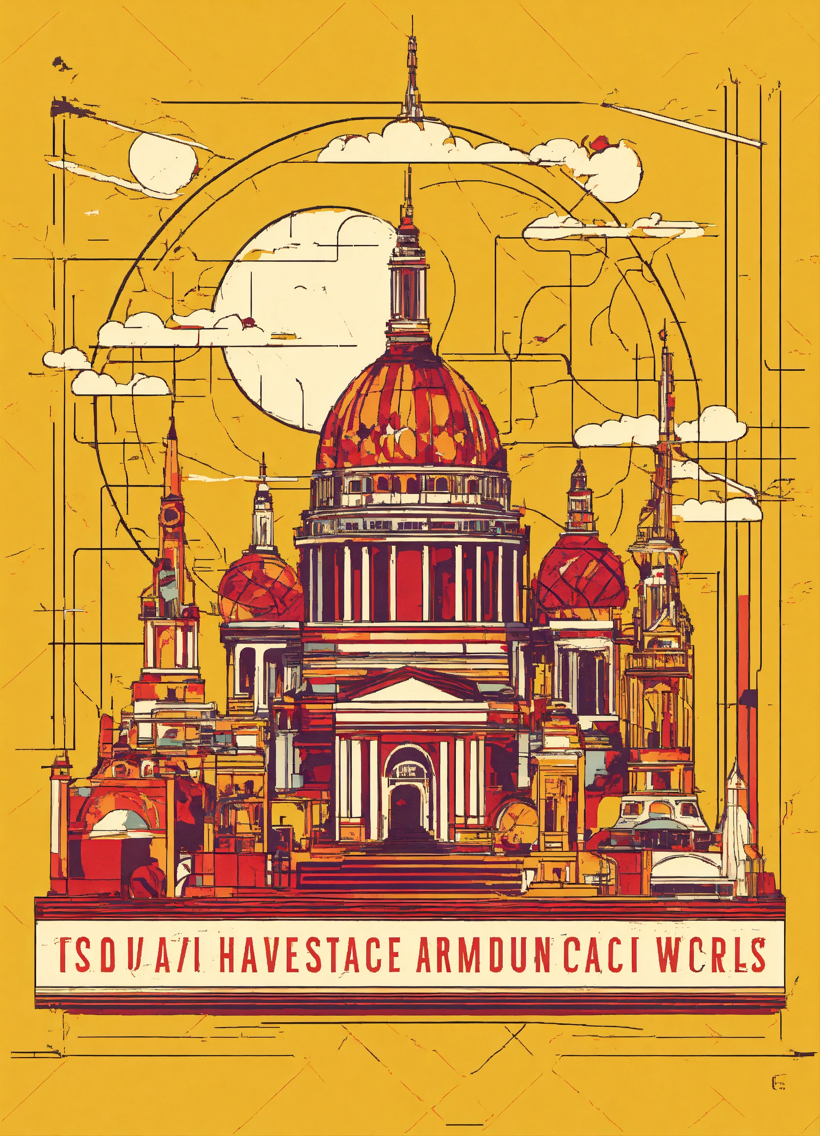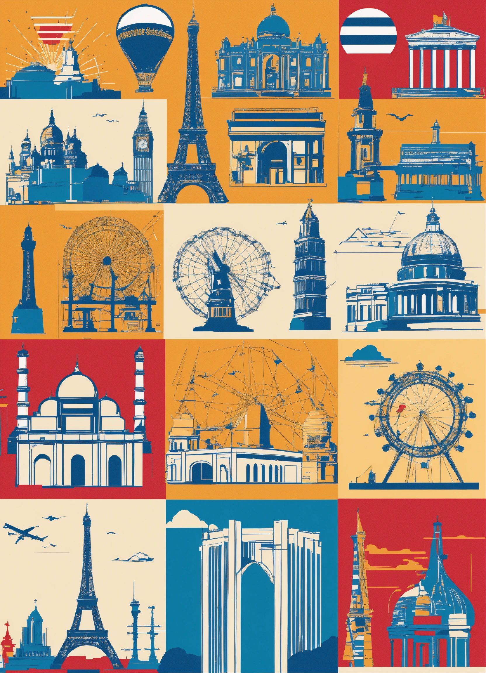 T shirt vector, famouse landmarks from around the world inteconnected with lines, pop art style, clean, simple, white