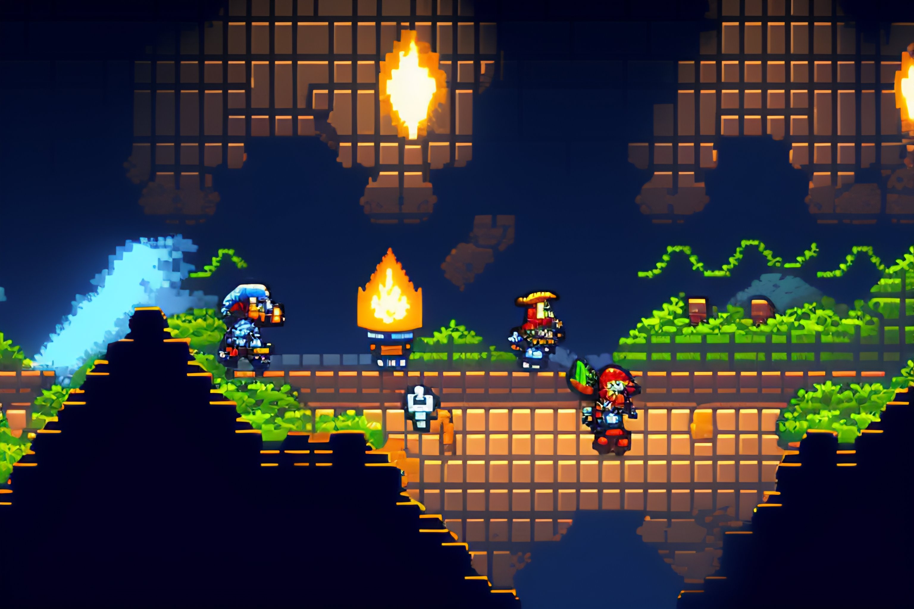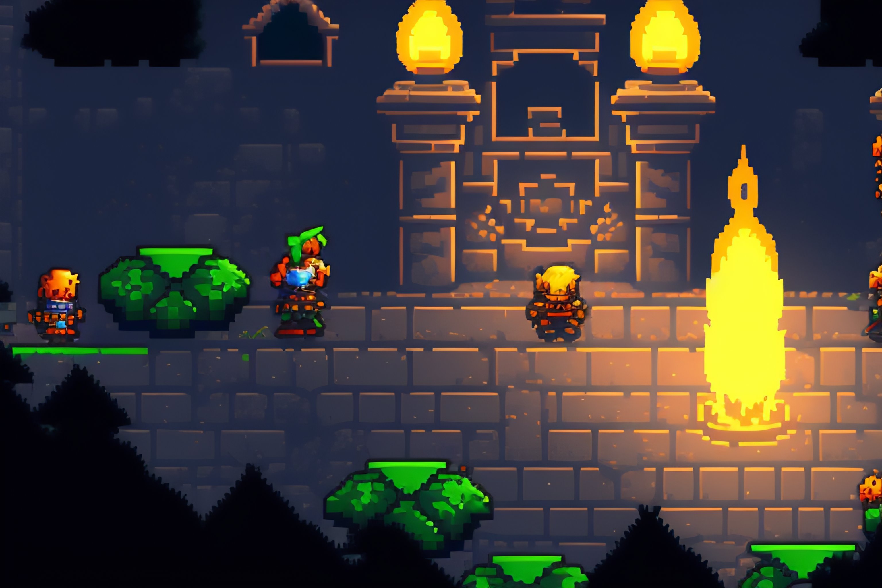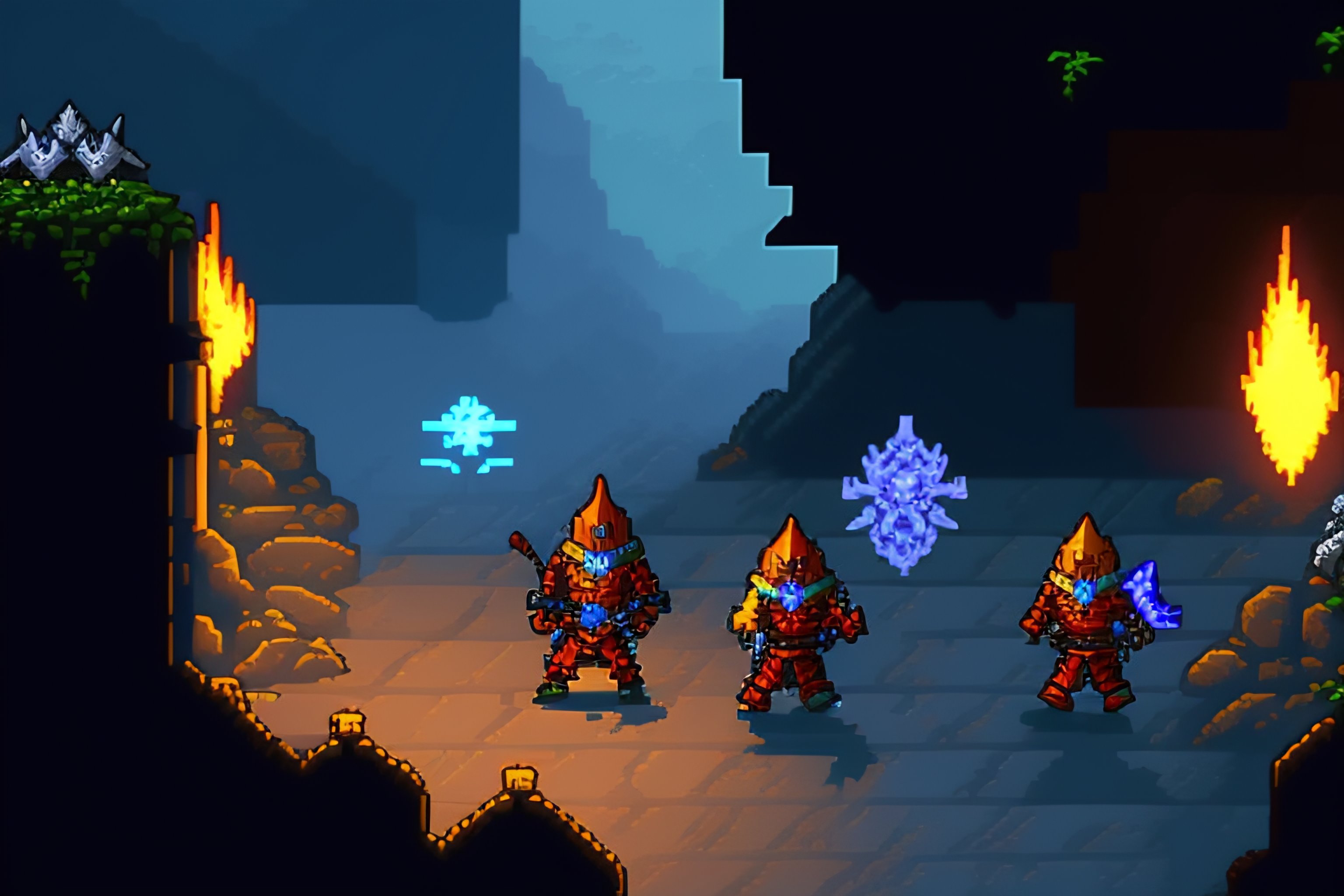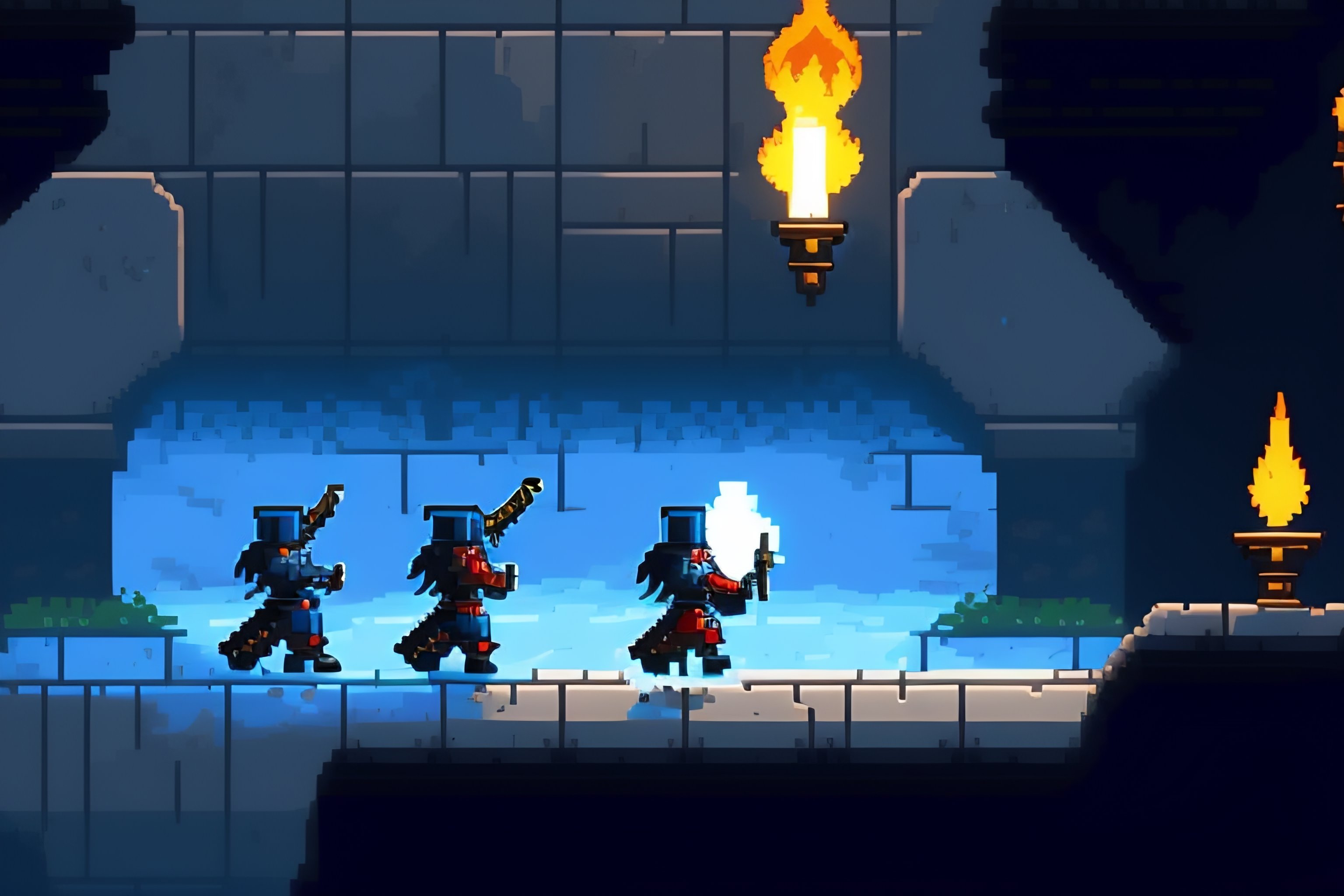 Pixel art top down video game screenshot knight fighting goblins in a stone dungeon lit with torches in mostly black, white, gray, and blue colors