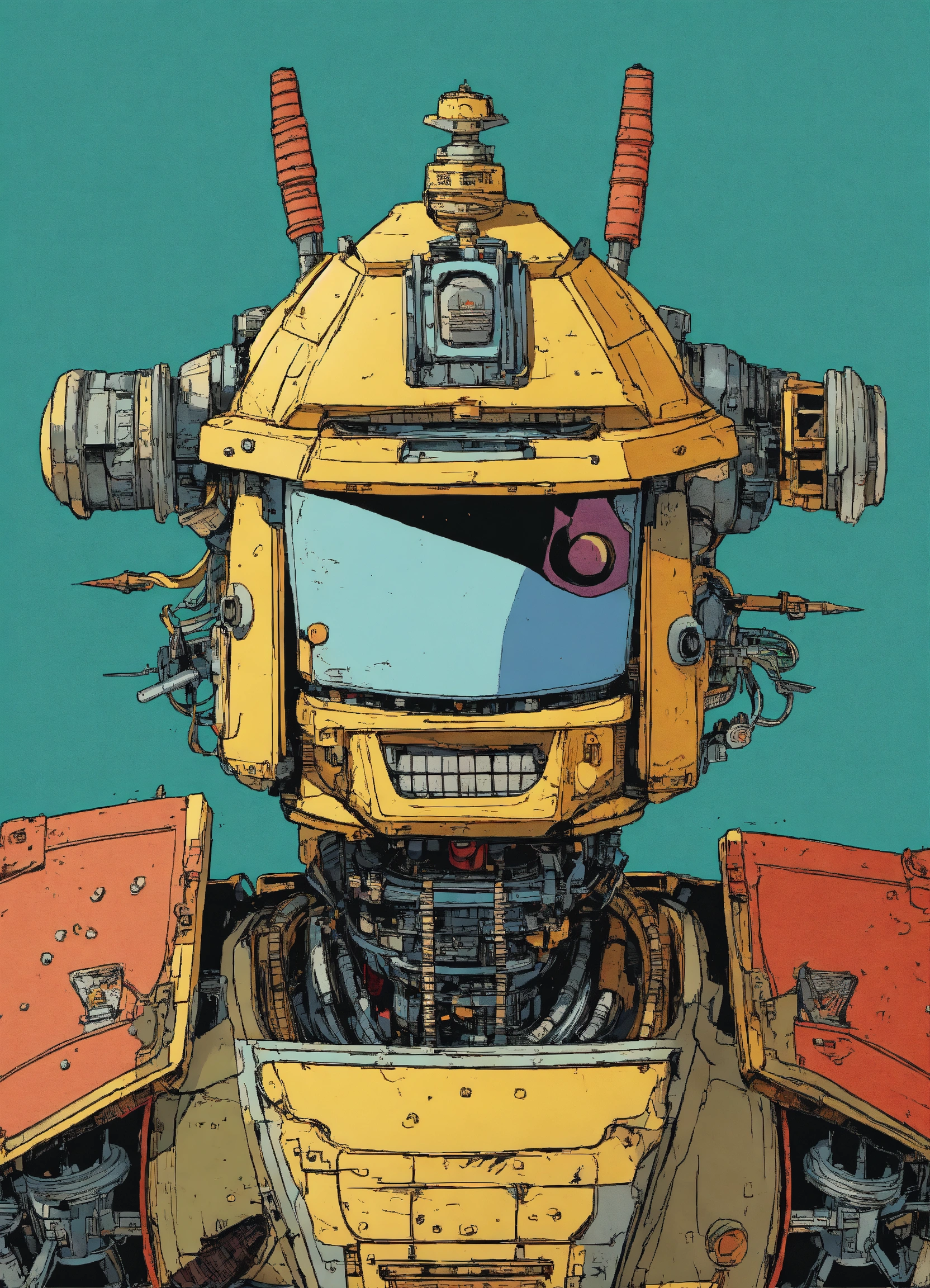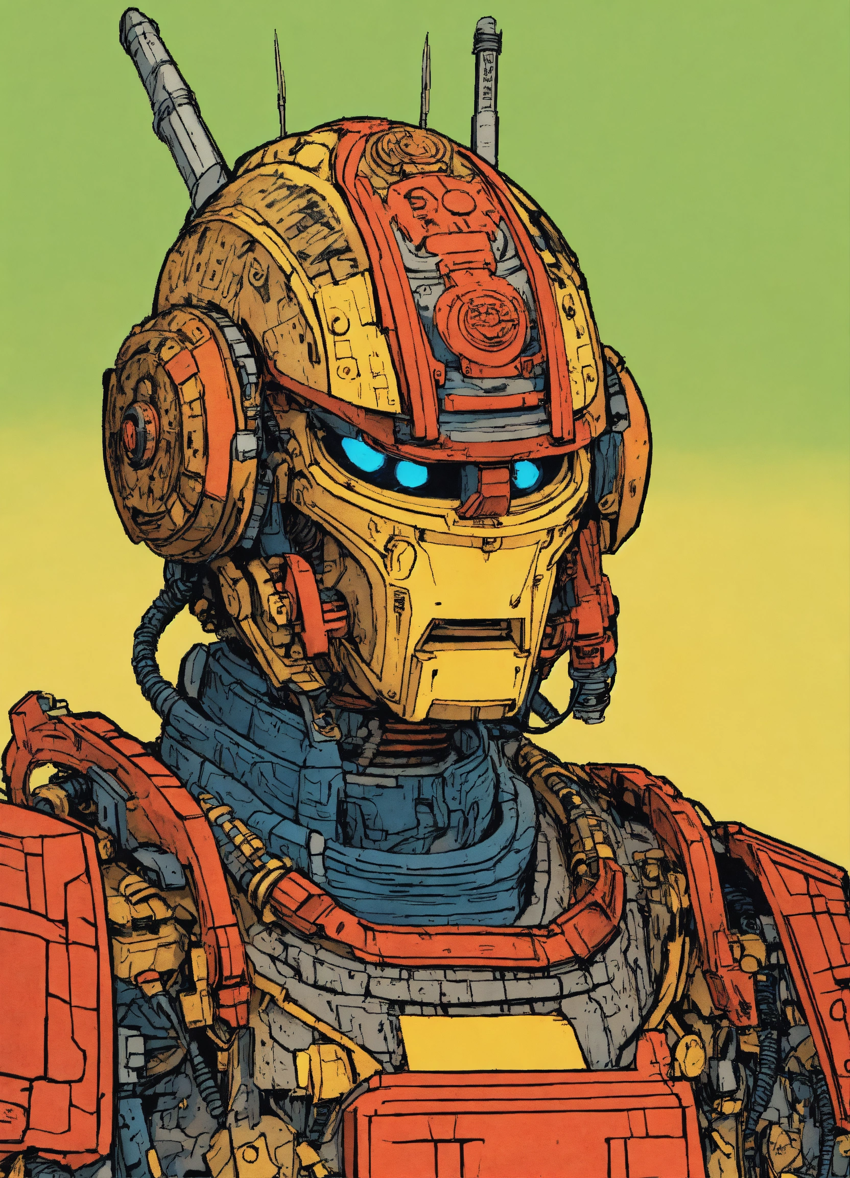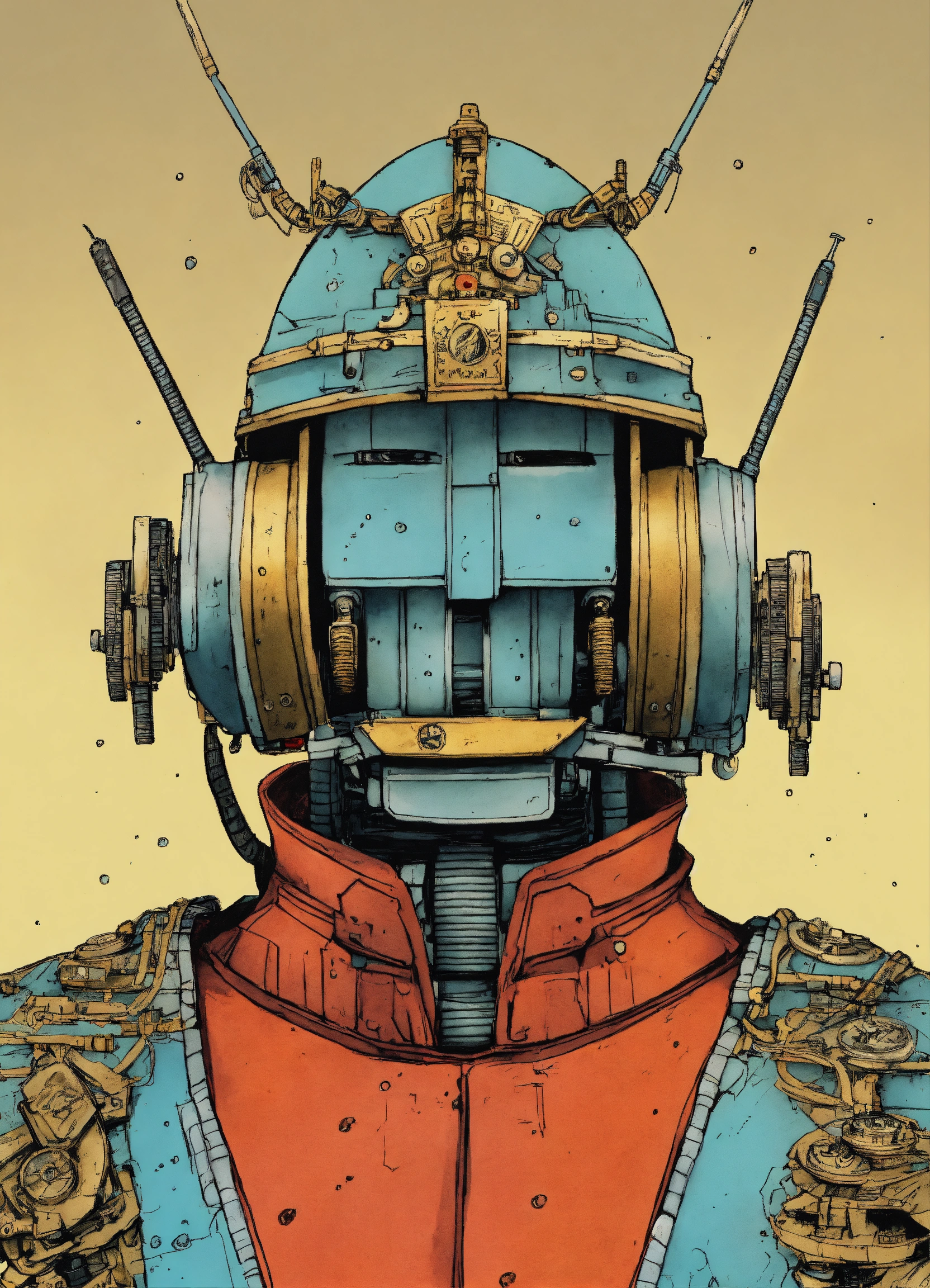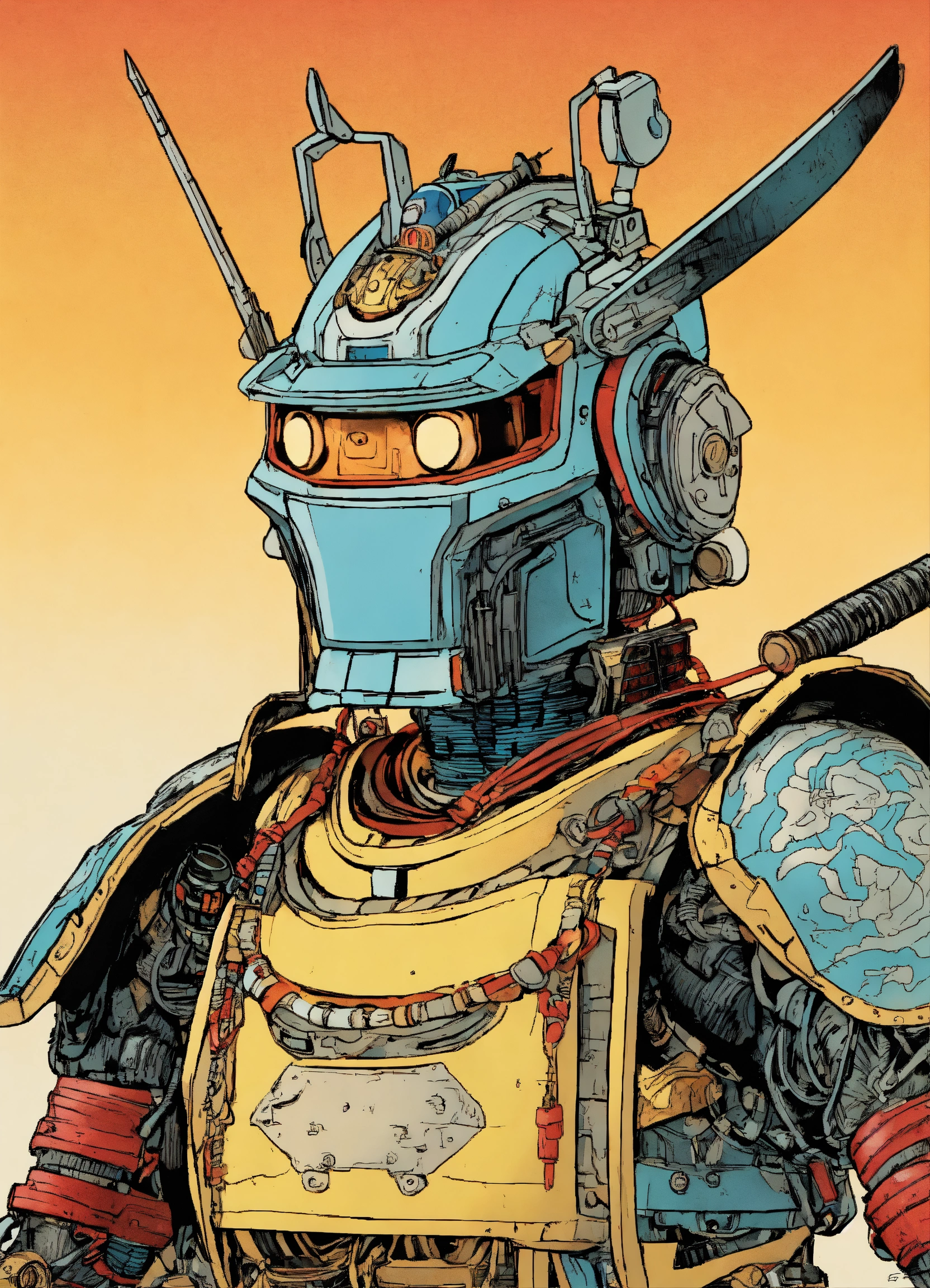 Detailed pen and ink illustration of a samurai robot cyborg, head only, detailed anthropology, minimalist background, by herge, in the style of tin-tin comics, colorful, detailed, high quality, sweet
