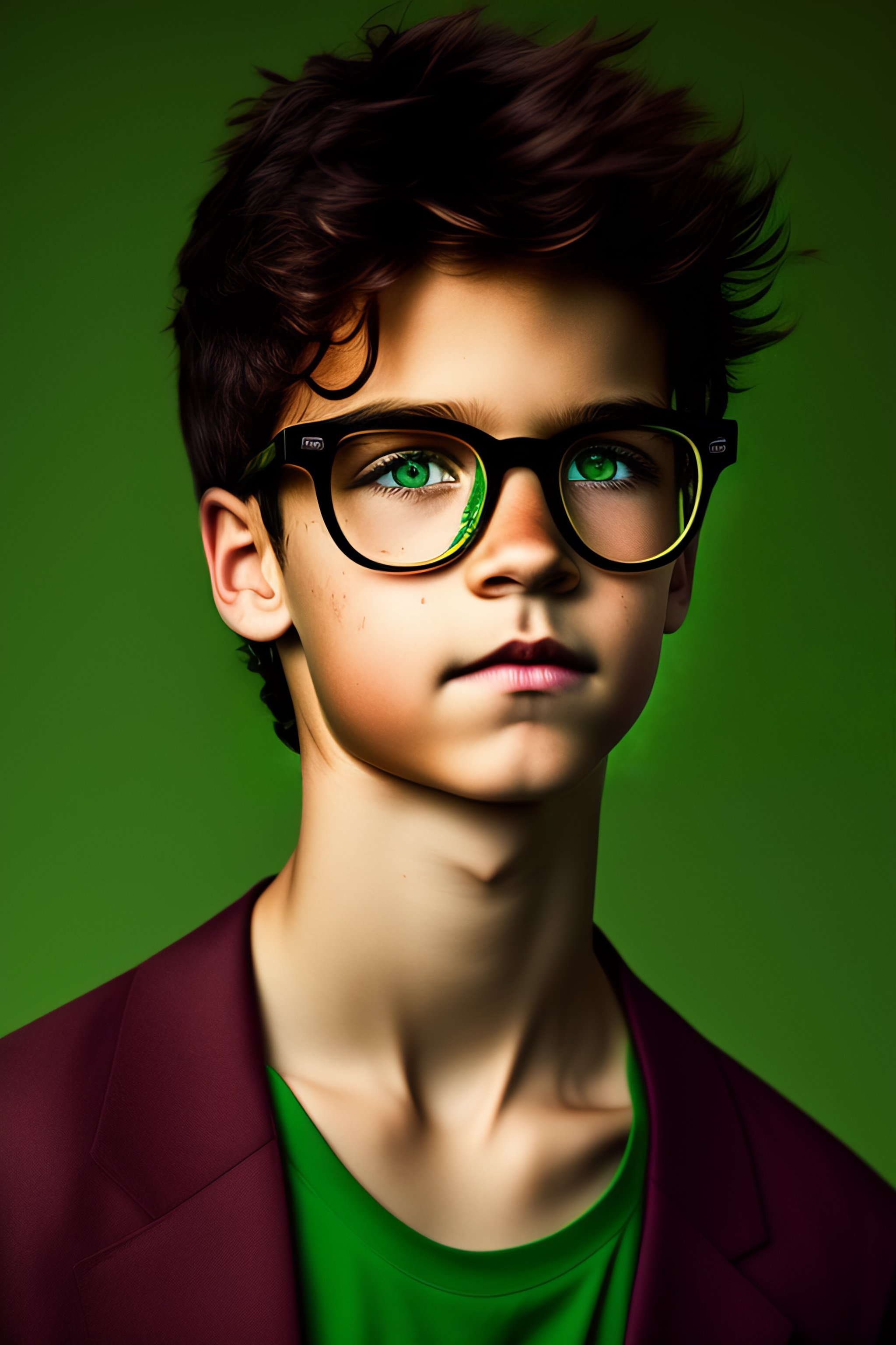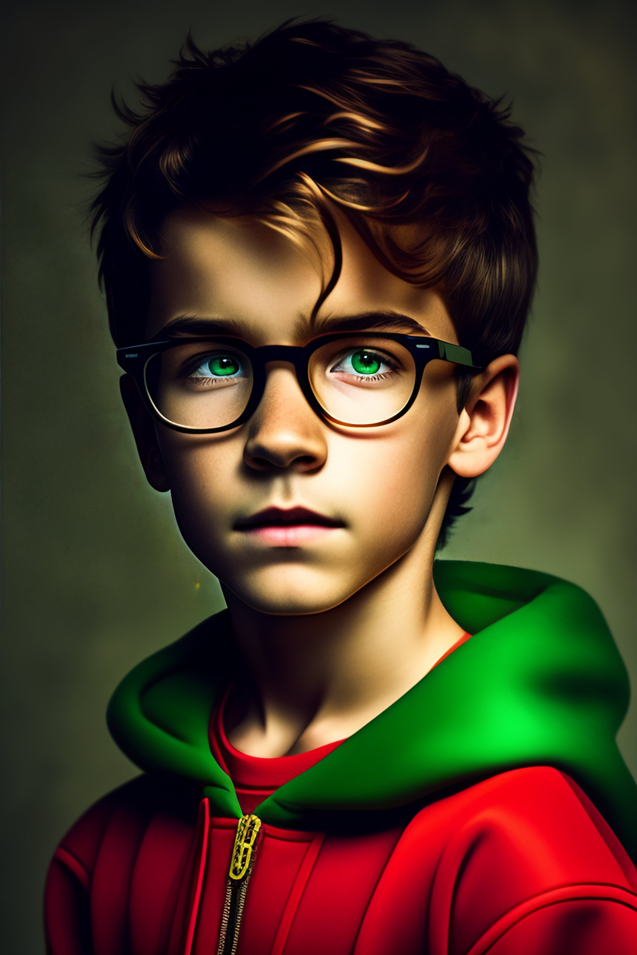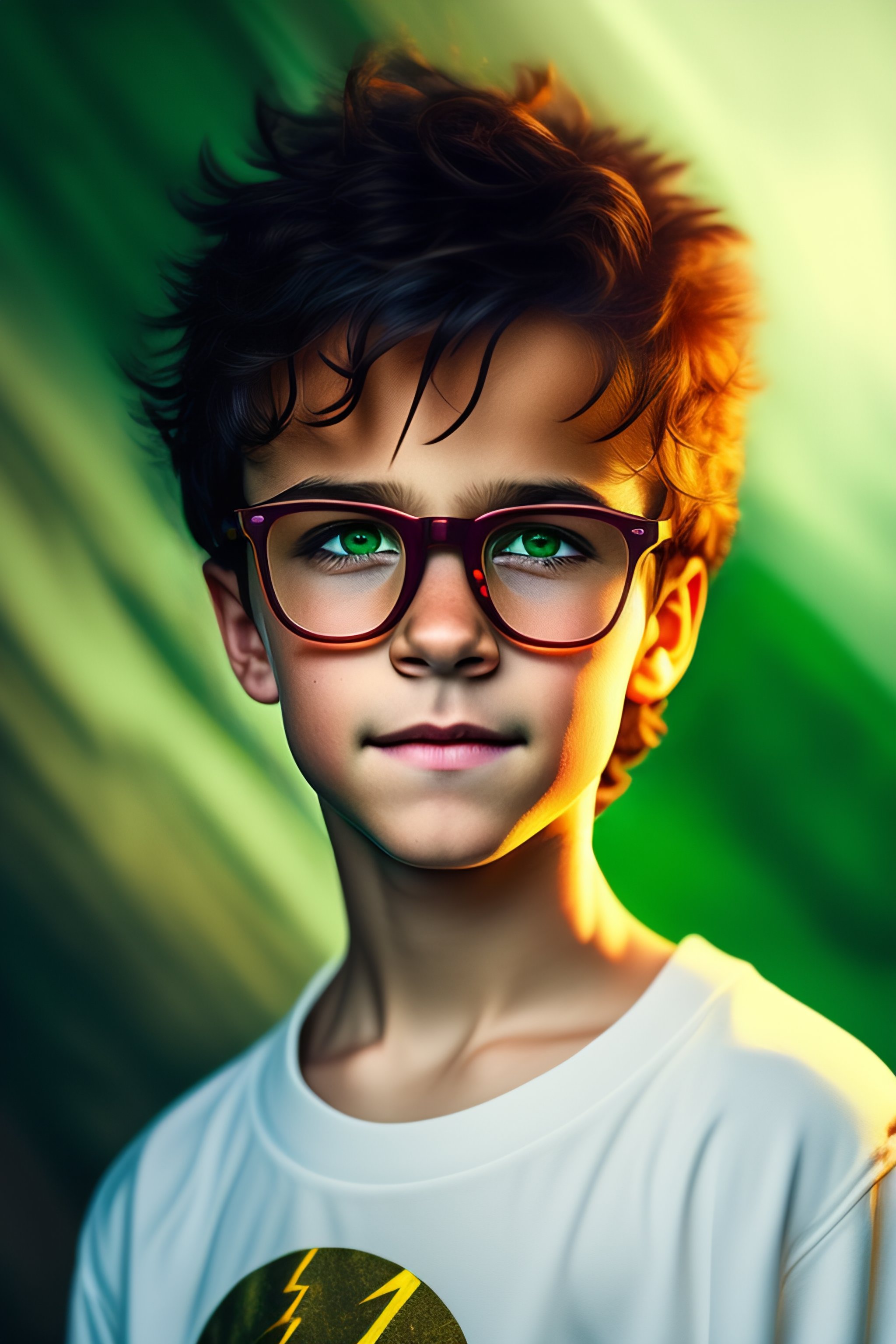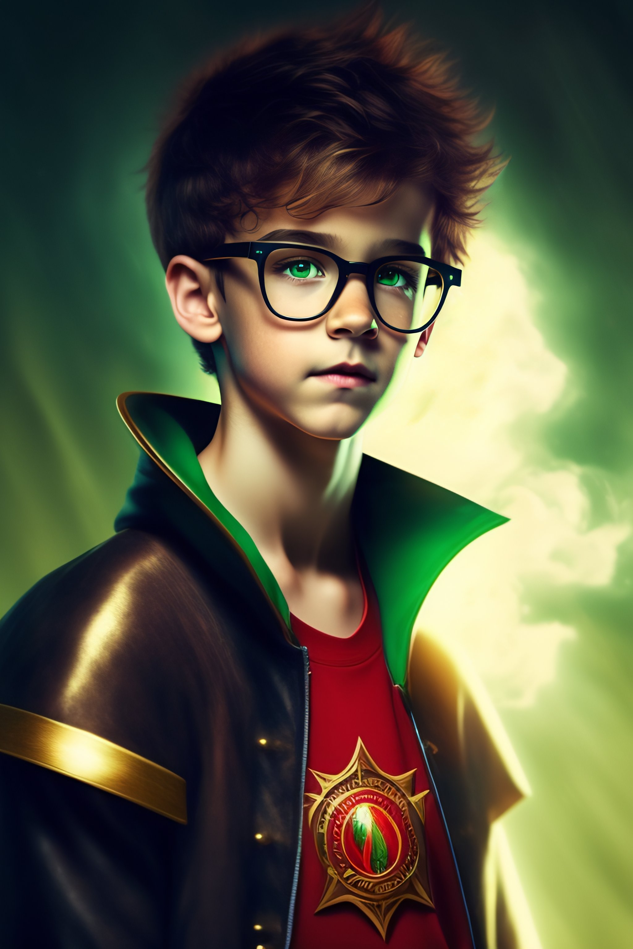 White boy, slim little boy, lightning bolt scar on forehead, black hair, messy hair, disheveled hair, green-eyes, round glasses, red, gold, wizard
