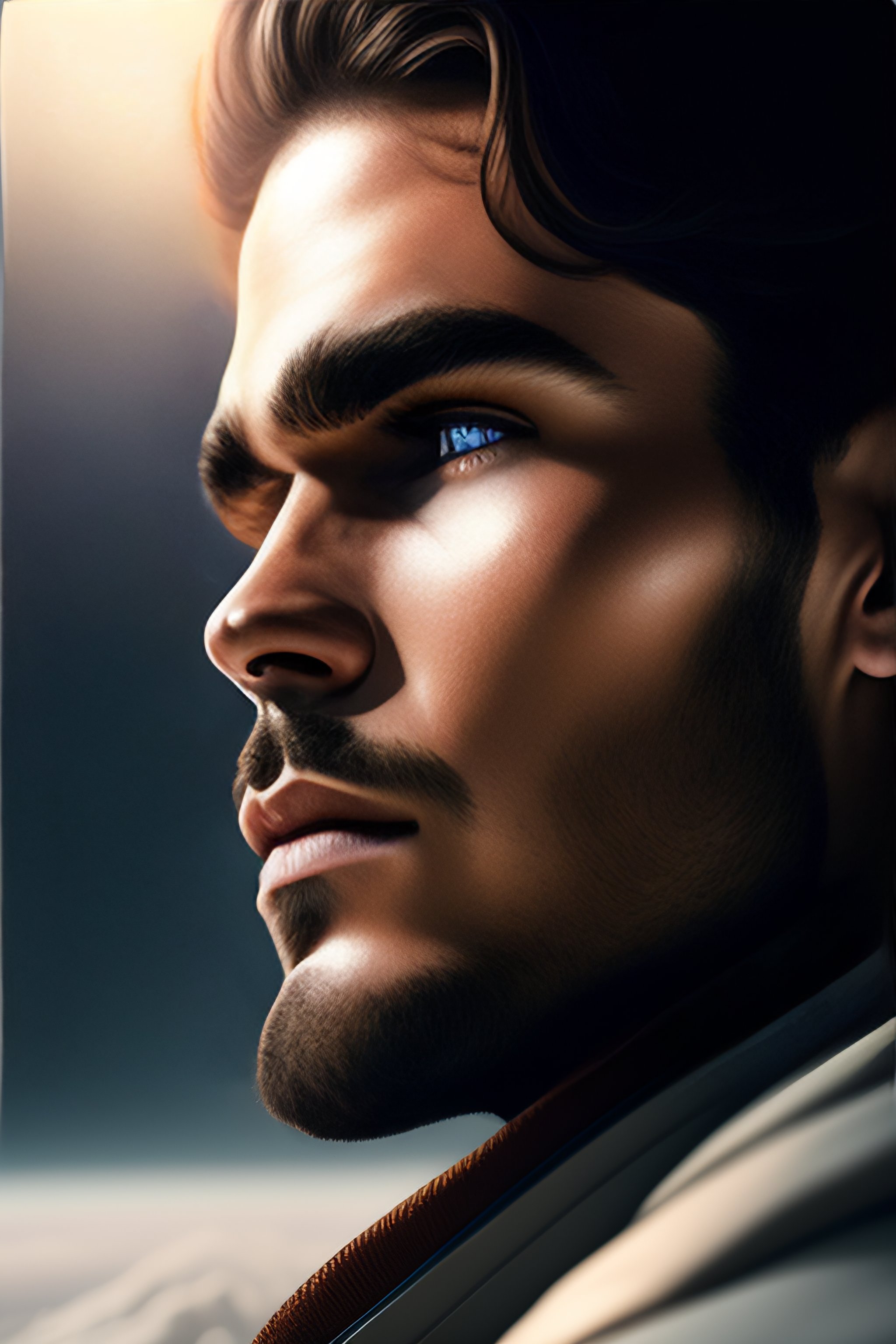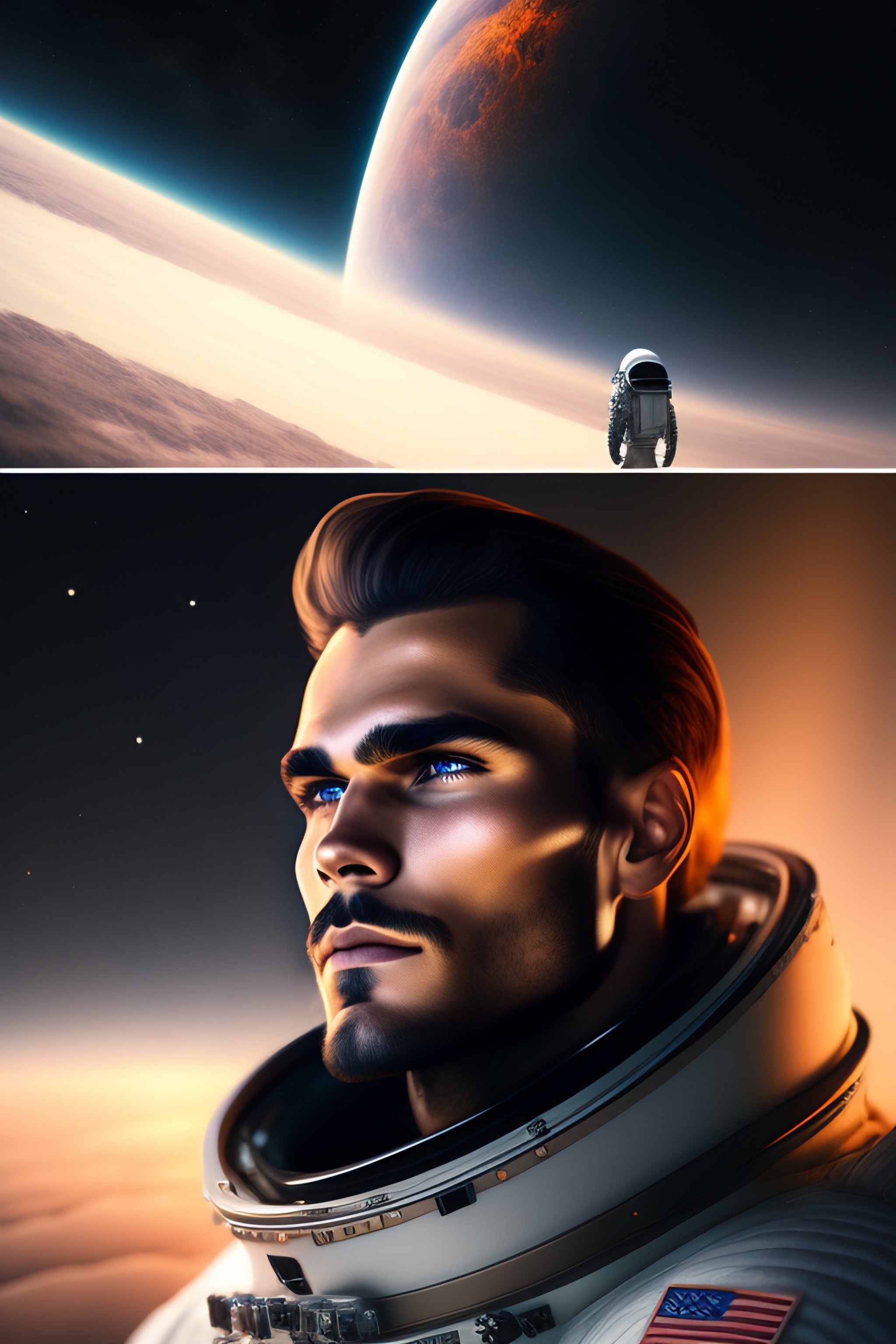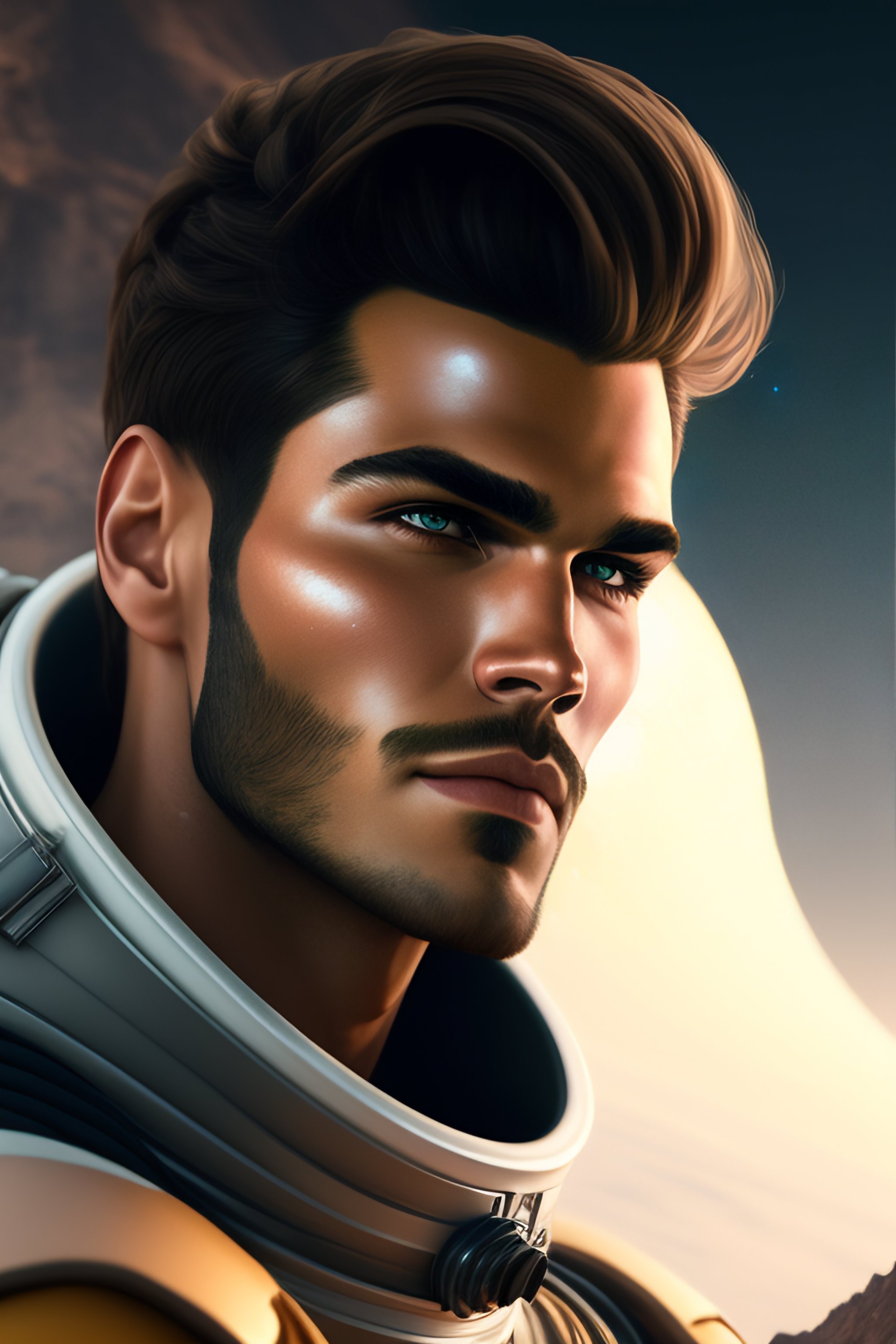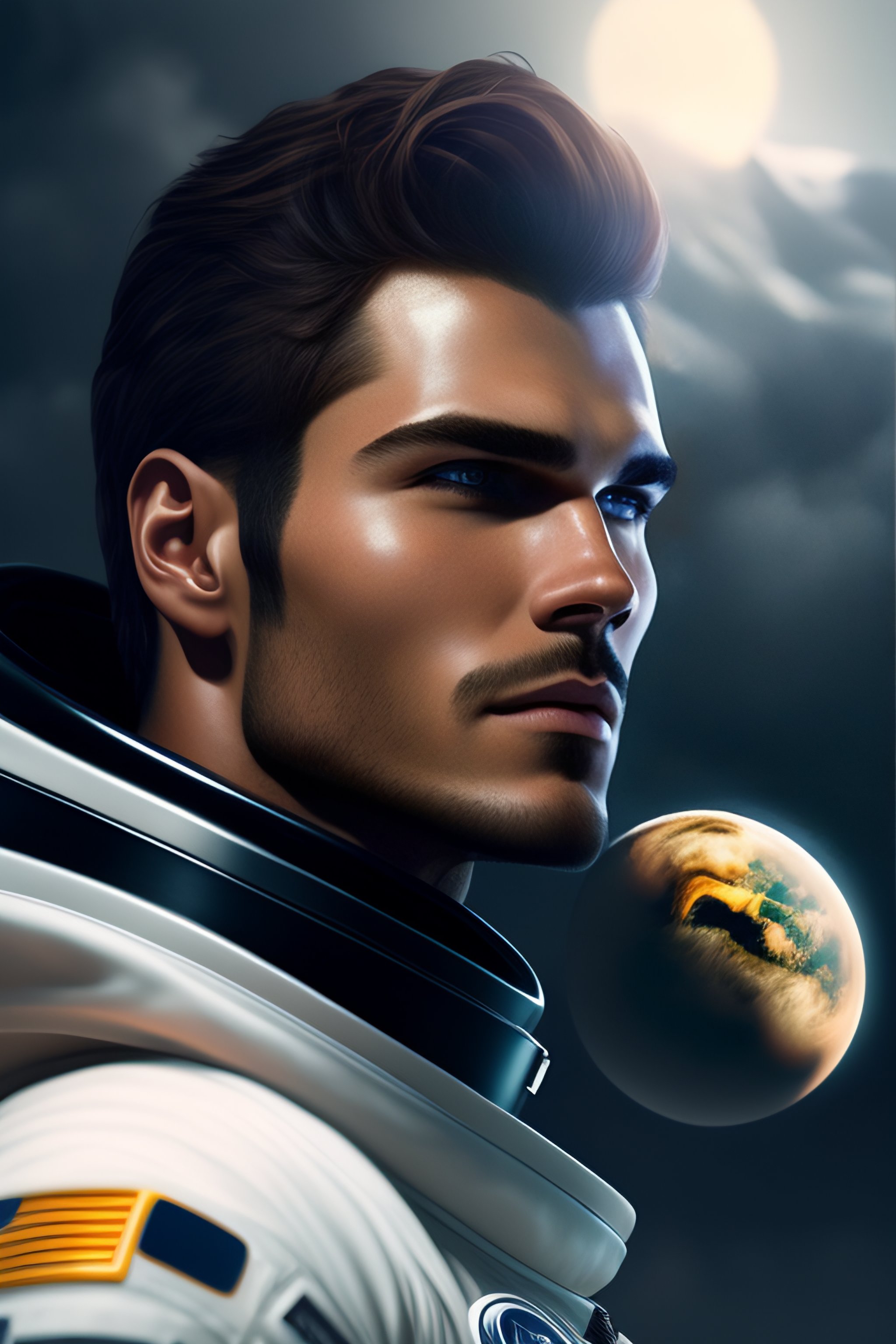 Portrait of a male brown hair astronaut with gray eyes and beard looks like chris zylka on moon looking at earth planet in space, unreal engine, headshot, highly detailed, digital painting, artstation, concept art, sharp focus, cinematic lighting, illustration, art by artgerm and greg rutkowski, cgsociety