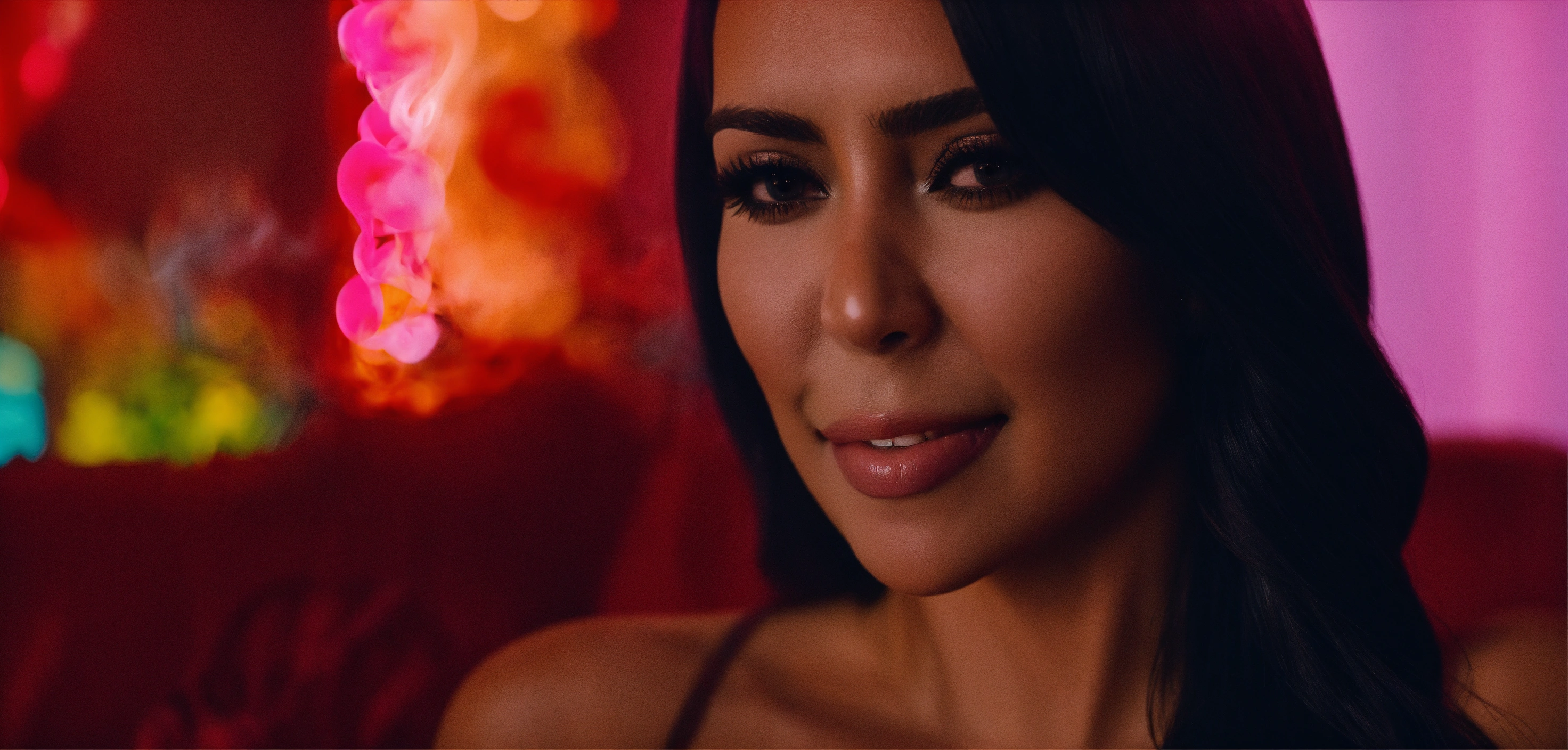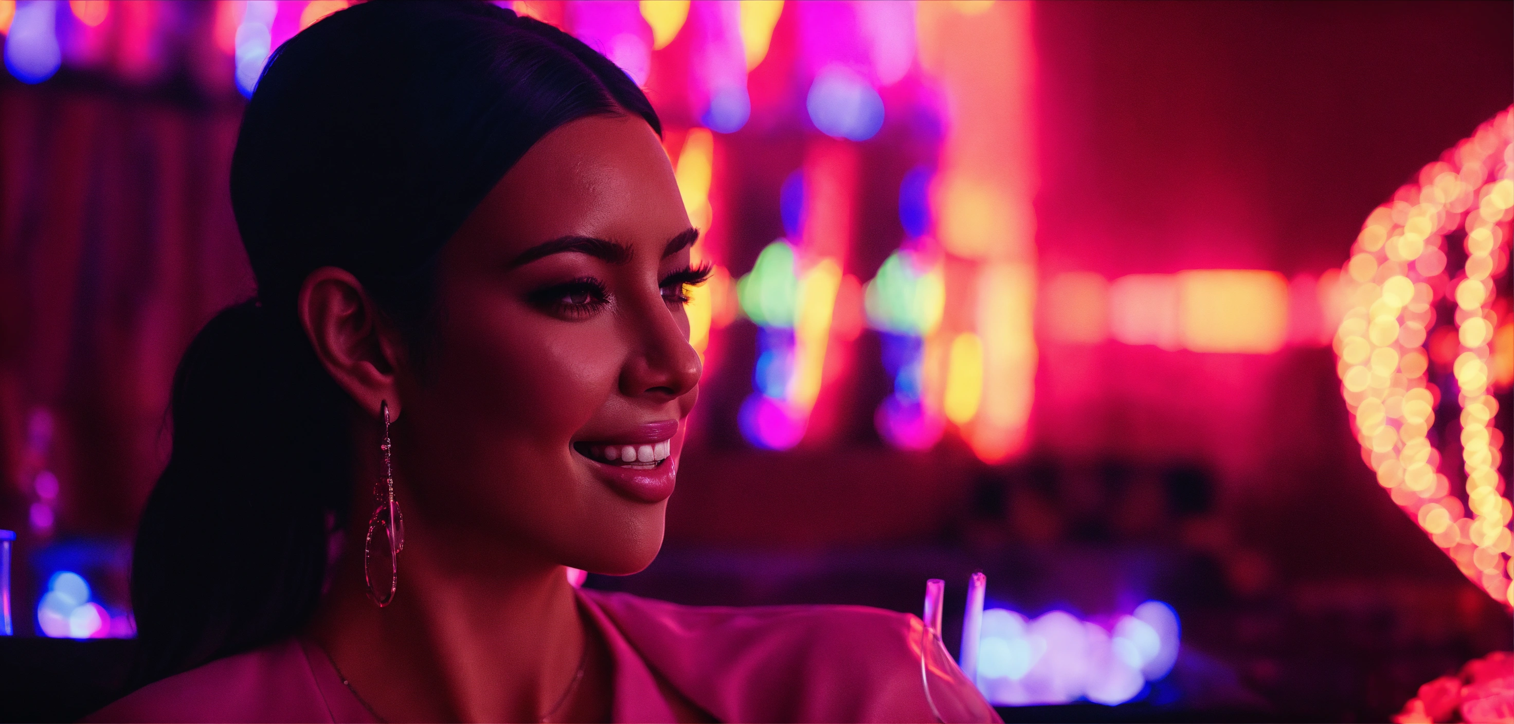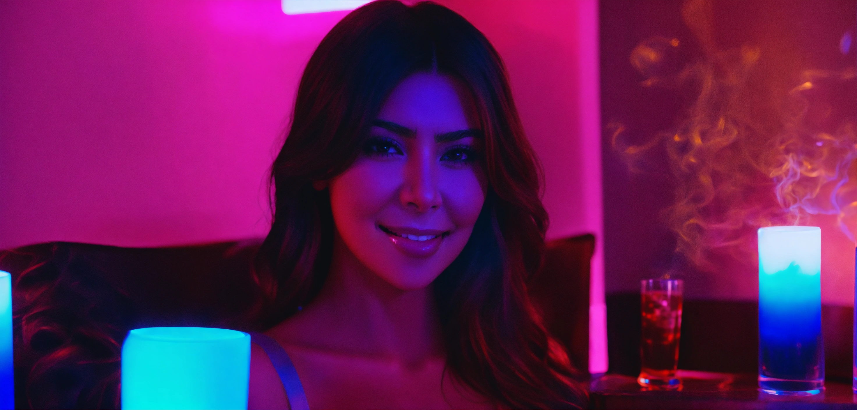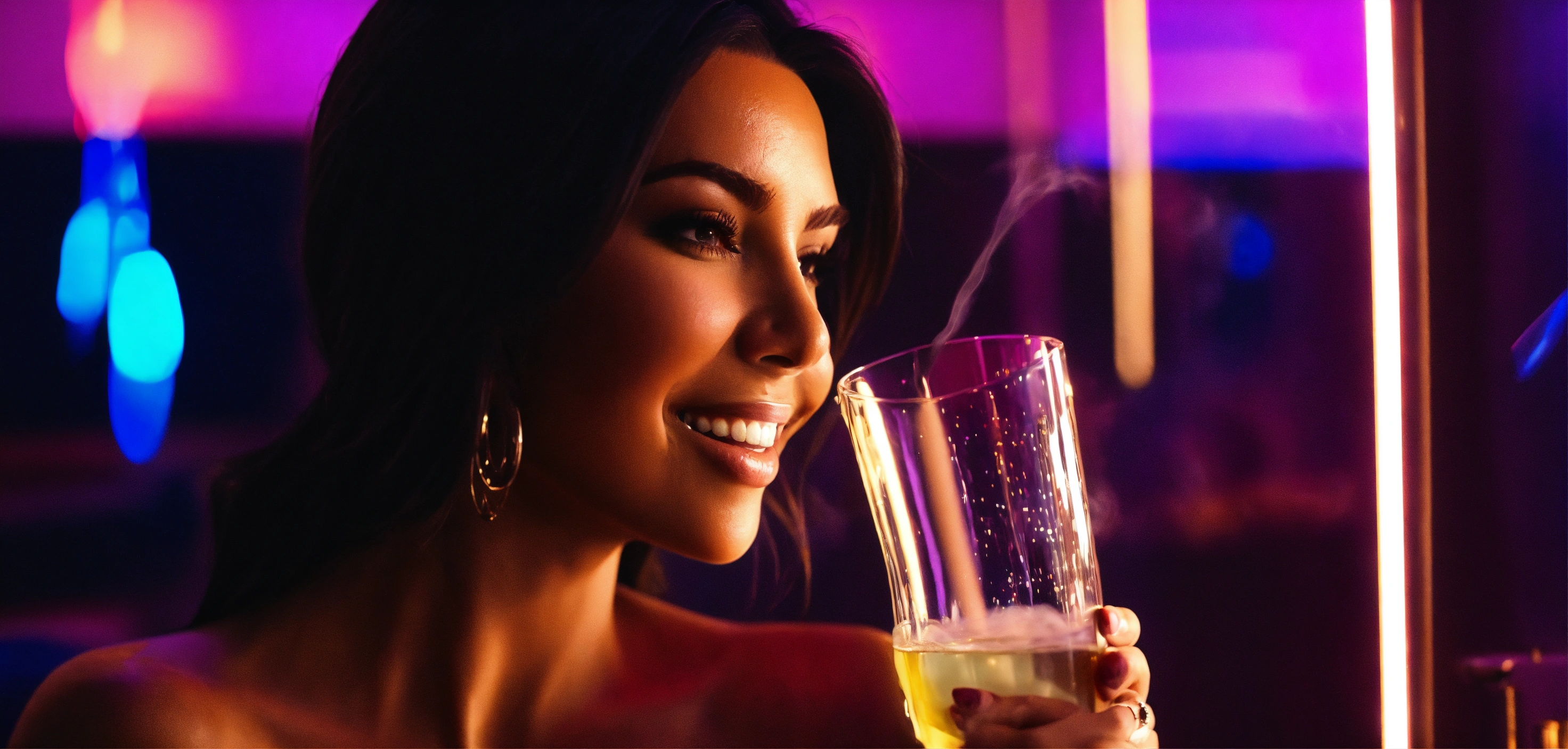 Kim kardashian smiling, while drinking from a long glass mishroom filled with whine neone smoke, iredescent reflections, 8k 16k 32k very real lights