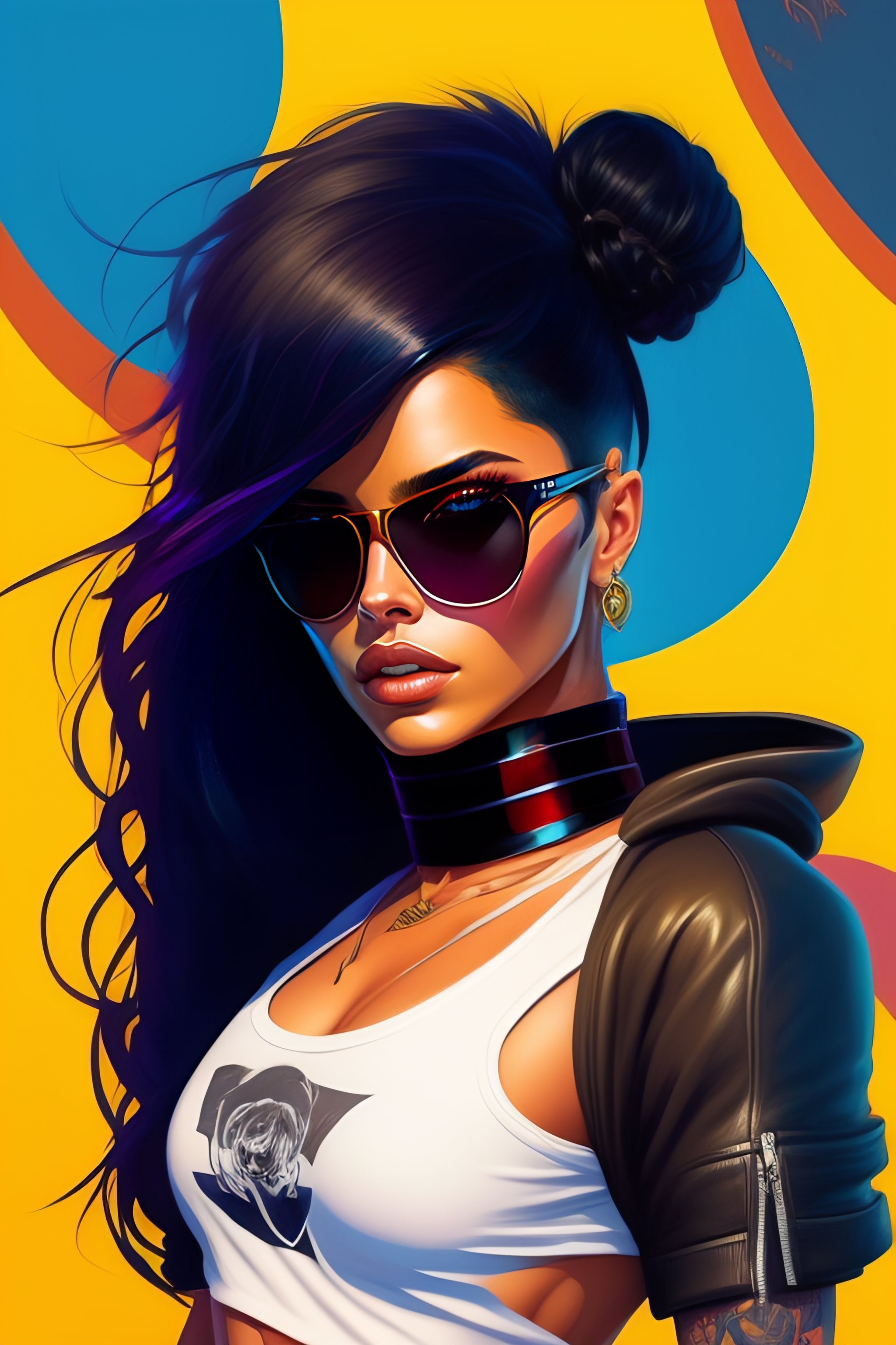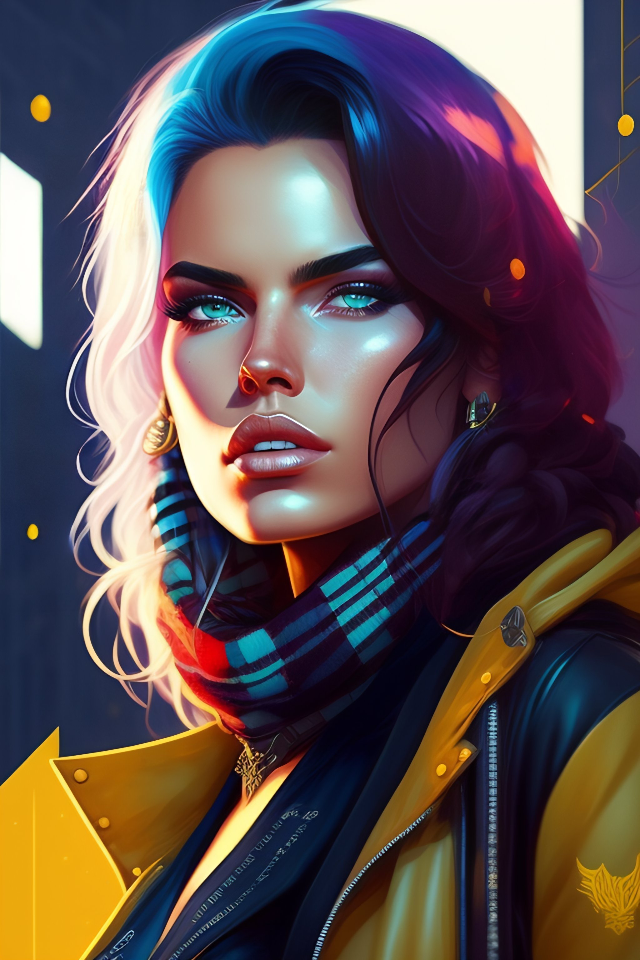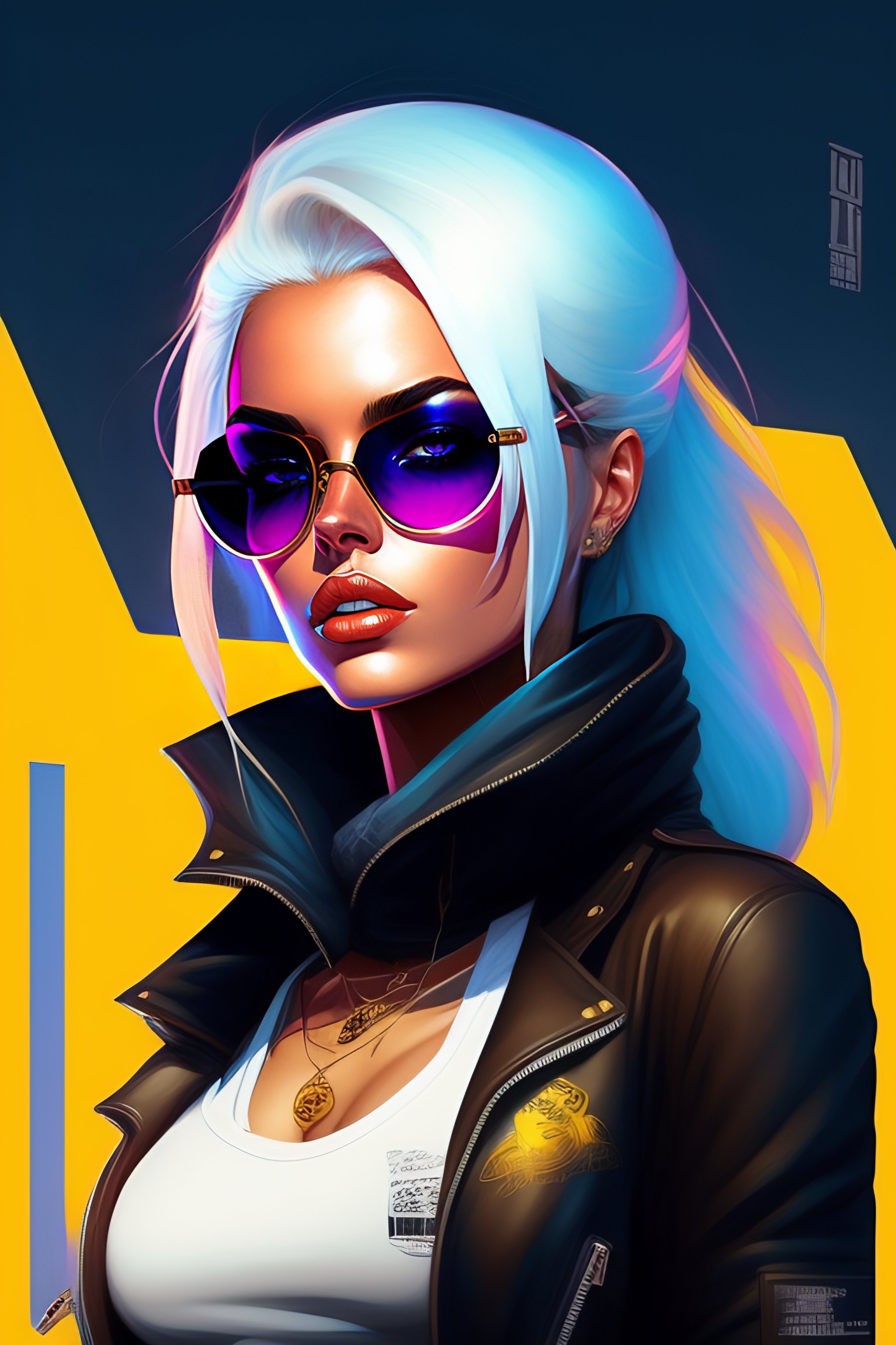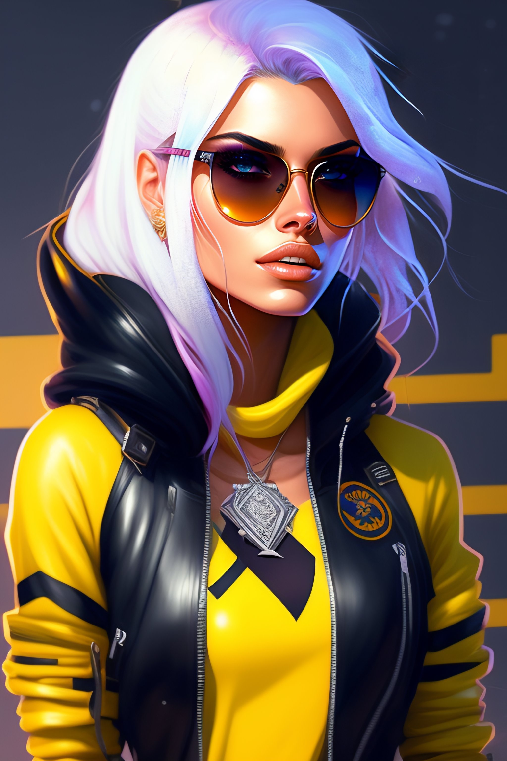 Full body highly detailed portrait of muscular adriana lima emo punk lady student, sunglasses, blue eyes, tartan scarf, white hair by atey ghailan, by greg rutkowski, by greg tocchini, by james gilleard, by joe fenton, by kaethe butcher, gradient yellow, black, brown and magenta color scheme, grunge aesthetic!!! graffiti tag wall background