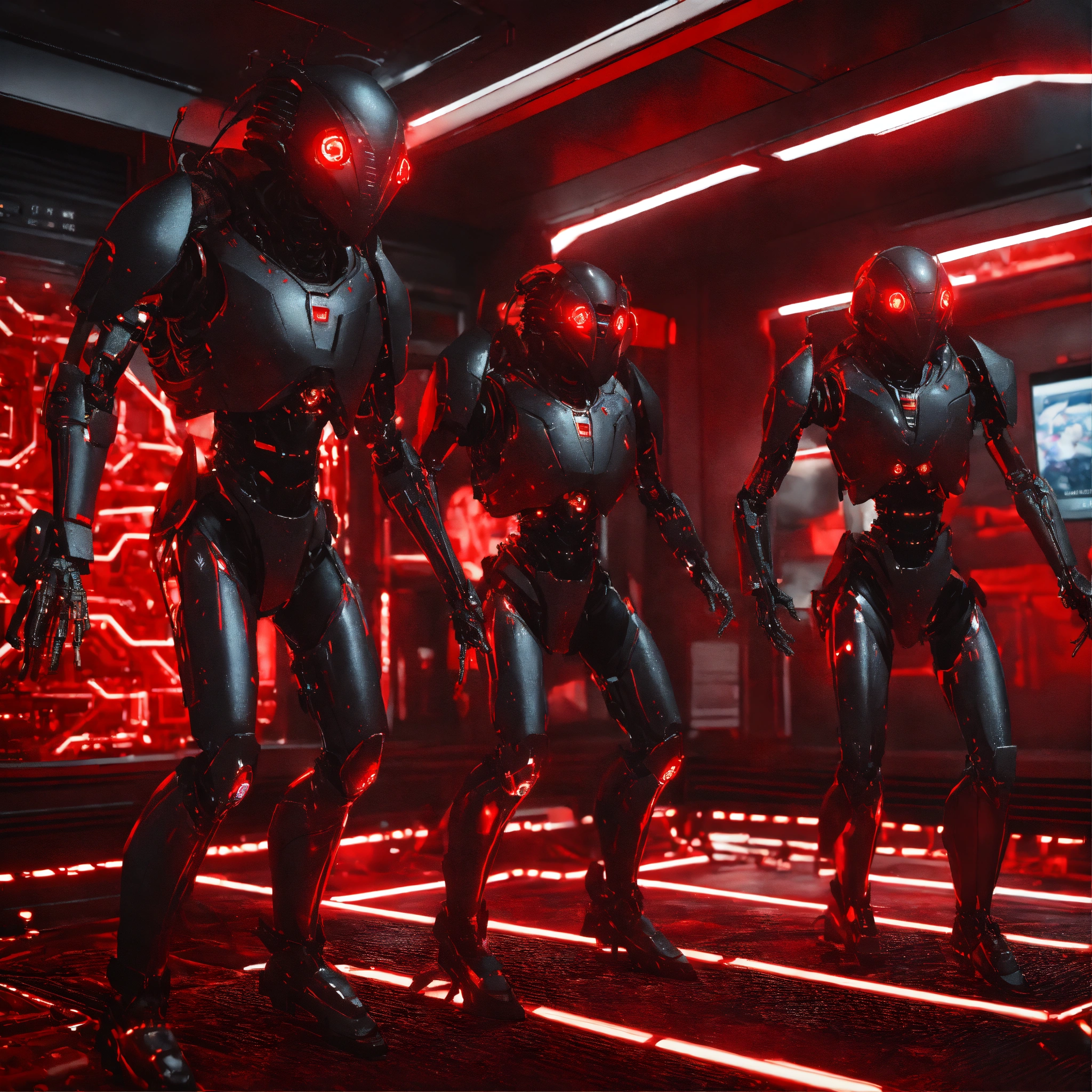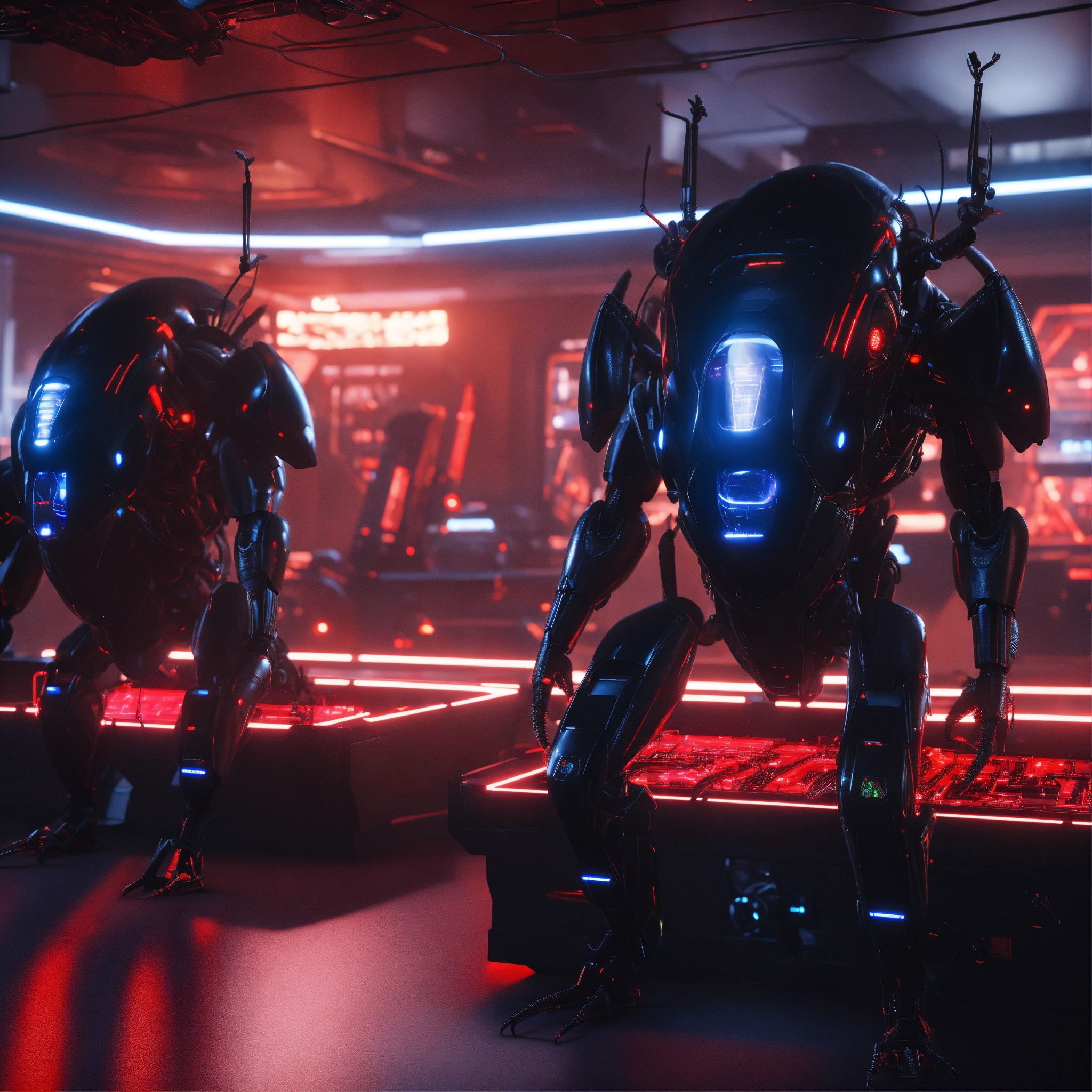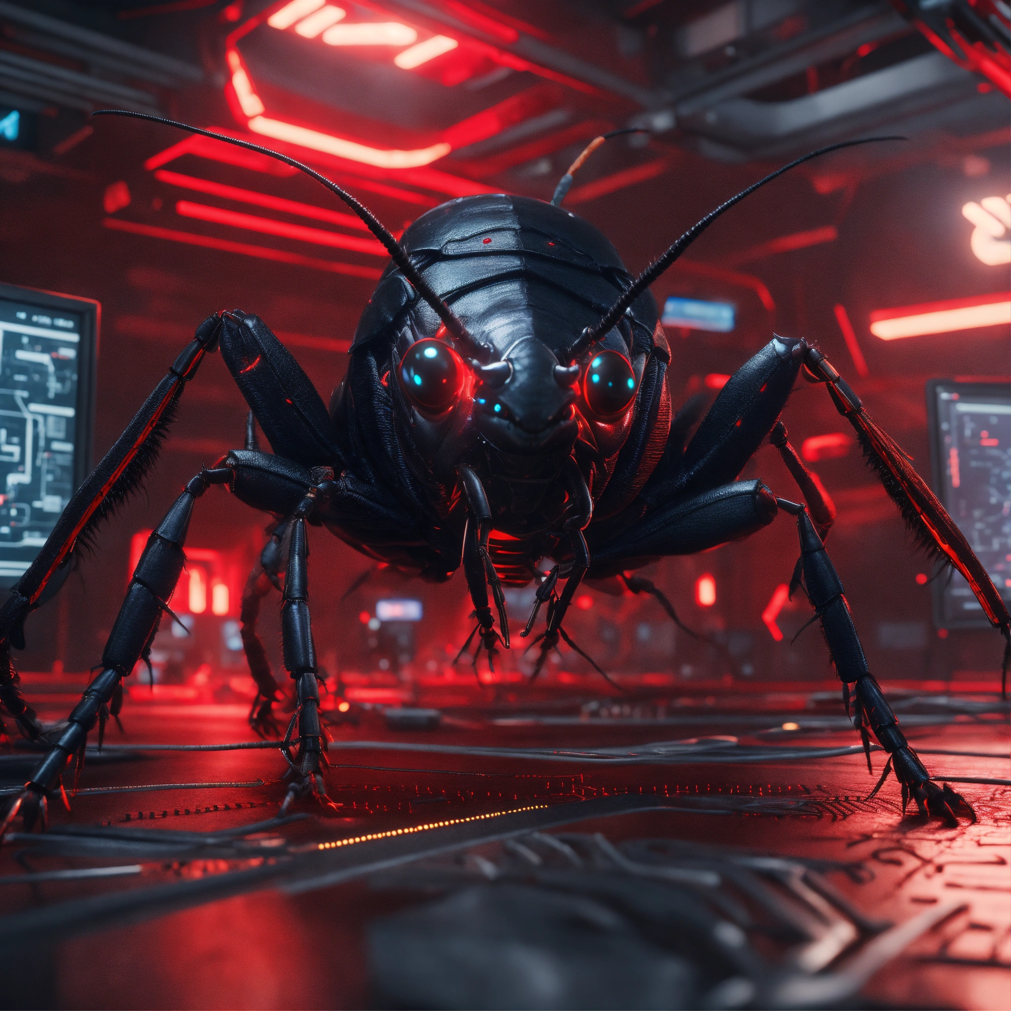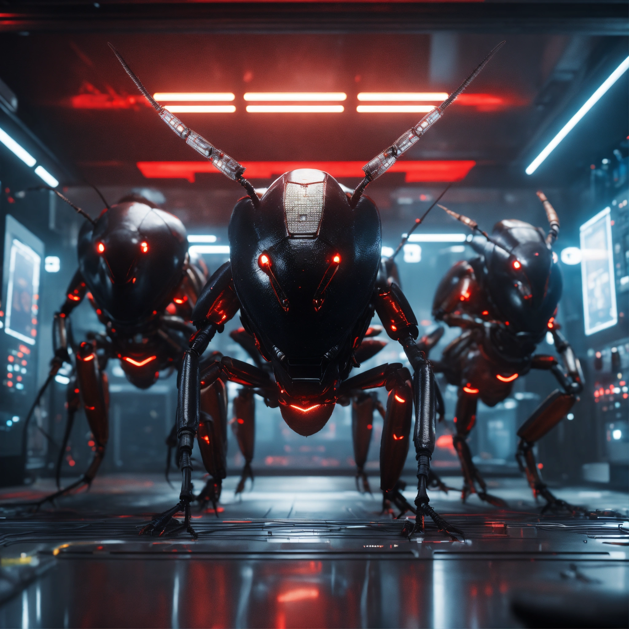 3 black cockroach faced humanoids with red eyes and detailed circuitry markings, attacking in a hi tech alien control room, realistic, 8k, unreal engine, pixar